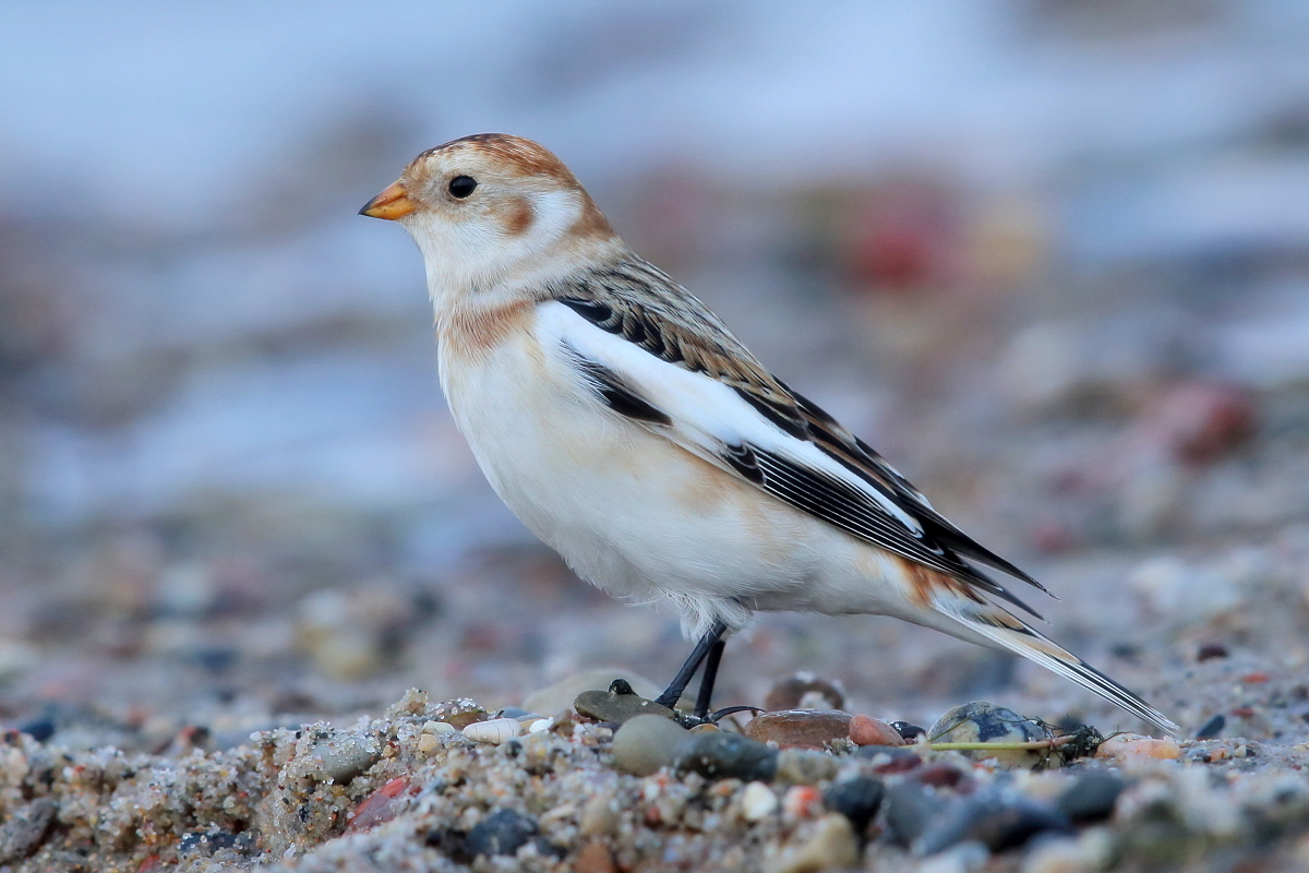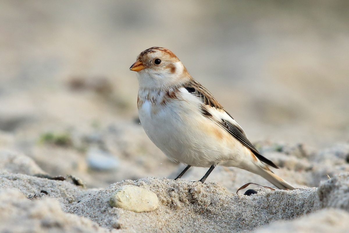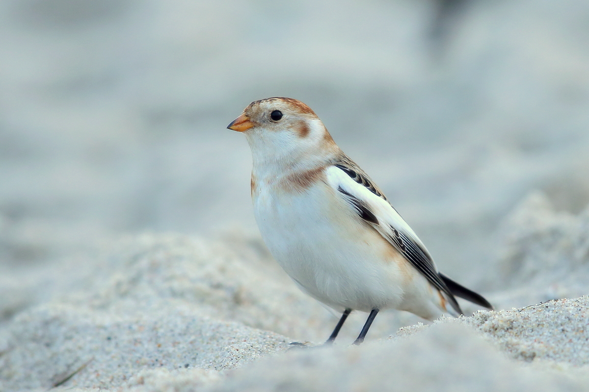 Wybierając się w okresie przelotów nad morze zawsze sporo jest emocji co tym razem uda się sfotografować, bo możliwości w tym okresie jest wiele. Ptaki, które żyją w mroźnej Arktyce, na Syberii trudno byłoby je sfotografować bez koszto- i czasochłonnej wyprawy. A tu proszę na polskiej plaży można je zobaczyć. Jadąc nad morze nastawiałem się na wykonanie zdjęć biegusów i być może na sfotografowanie jakiegoś nowego gatunku tych ptaków. Wychodzę na plażę i na początek bez entuzjazmu, bo nawet niewiele mew przebywało na plaży, z jednym „odmieńcem” wśród nich. Było dość ciepłe, październikowe popołudnie. Ze światłem było już tak sobie, ale idąc spokojnie po plaży nagle prawie z pod nóg zauważyłem jakiś ruch. Zatrzymałem się i obserwują okolicę. I nic nie widzę. To coś, pewnie też zatrzymało się i obserwuje mnie, z tą różnicą, że on mnie widzi, a ja próbuję go zlokalizować. No nic, trzeba się ruszyć i zdemaskować obserwatora. Jest ! Na szczęście nie odleciał, ale szybko przebierając nogami oddalił się na kilka metrów i zamarł w bezruchu. Na szczęście w bezruchu, bo tak szybko się przemieszczającemu ptakowi trudno byłoby wykonać zdjęcia, zwłaszcza, że światła coraz mniej. Są pierwsze zdjęcia. Patrzę i od razu rozpoznałem, że to śnieguła. Pierwsze moje zdjęcia tego ptaka, a właściwie ptaszka. Śnieguła wielkością przypomina wróbla, ziębę. Rozpiętość skrzydeł to około 30cm przy wadze około 35 gram. Więc nie ma co nawet z 600 milimetrowym obiektywem, trzeba mieć ją na kilka metrów, nie więcej jak 10, aby zdjęcia zapadły w pamięci. Śniegułę można zaobserwować w Polsce podczas przelotów, a więc pomiędzy październikiem a kwietniem, a spotkanie z nią nie należy do częstych. Trzeba więc zrobić wszystko, by sesja trwała. Powolne i bardzo spokojne ruchy spowodowały, że śnieguła mając mnie na oku, zaczęła żerować dając sobie wykonać serię zdjęć. Niestety czasu nie było za wiele, a i ten był podzielony na berniklę obrożną i nią. Tak skończyła się pierwsza sesja śnieguły i nadzieja, że w dniu jutrzejszym nie będzie gorzej.