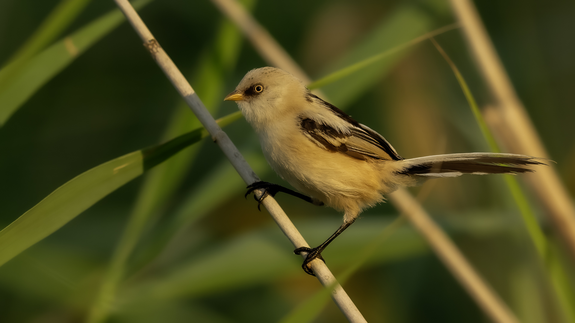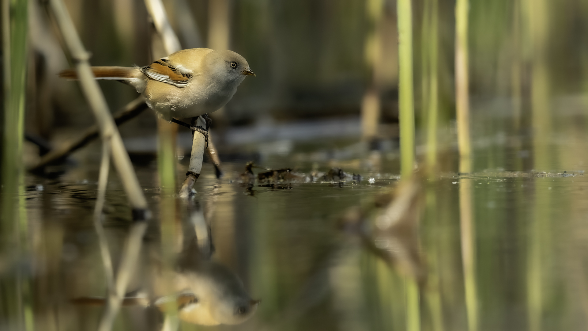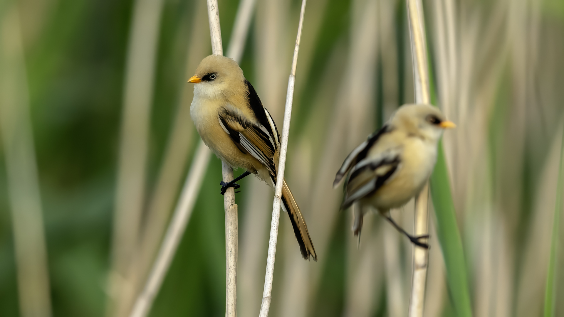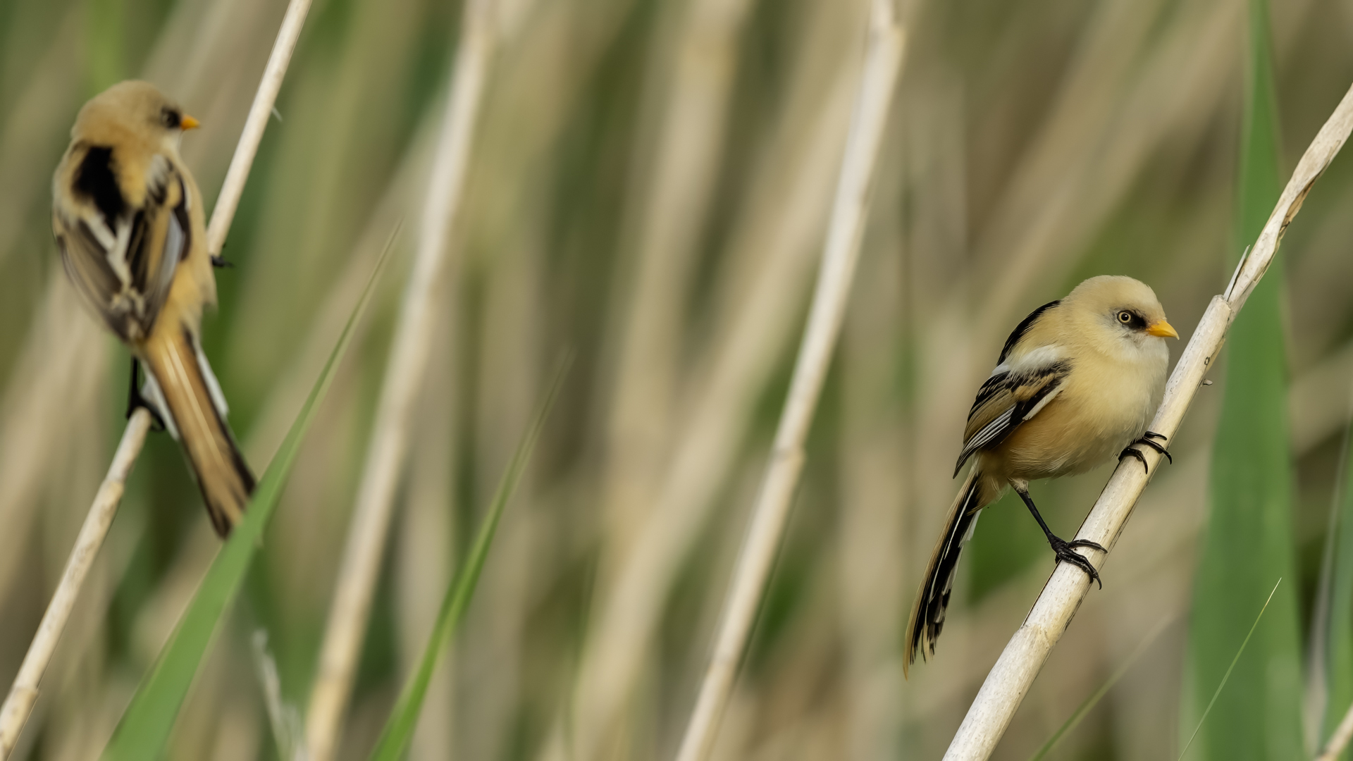 Niesamowita sesja zdjęciowa z młodymi wąsatkami. Było ich kilkadziesiąt i idąc spokojnie za nimi można było wykonywać całe serie zdjęć i mieć ich po kilka w kadrze. W dniu tym tak naprawdę byłem pochłonięty pierwszymi zdjęciami naszych remizów, i wyczekiwaniem na nie, ale nie sposób przerwać tego, jak słyszy się wręcz rwetes jaki robi dość duże stado wąsatek. Bliższe zapoznanie się z nim pokazało, że są to wyłącznie młode osobniki. Tak, więc udało się sfotografować pierwsze młode osobniki wąsatek i to na tle zielonych trzcin, wprowadzając duże urozmaicenie w dotychczasowej złotej kolorystyce wyschniętych trzcin poprzedniej sesji. Mimo dość długiego spotkania z wąsatkami w tym dniu, nie dało się zaobserwować dorosłych osobników. Tak, więc podobnie jak remizy zajęte są wysiadywaniem jaj drugiego lęgu. Jeżeli byłoby tak udane jak pierwsze i nic wąsatkom nie zagrozi, w mroźnej zimowej scenerii powstaną kolejne ciekawe zdjęcia.