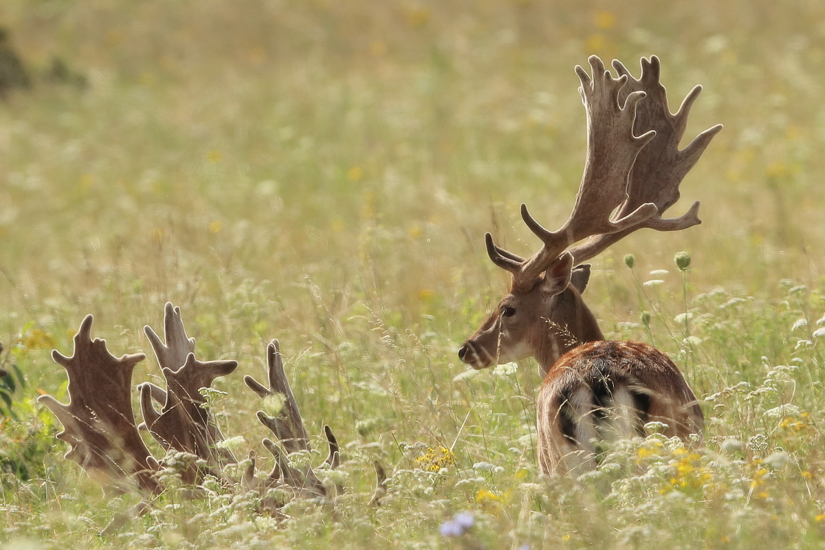 Chyba będzie trzeba poczekać do bekowiska, za dobrymi zdjęciami danieli. Te dołączone w maju, wprawdzie nie oddają w pełni jeszcze piękna tych zwierząt, ale w porównaniu ze skromnymi jak dotąd osiągnięciami, znacznie ja wzbogacają. I znów przypadek, jadąc w miejsce występowania jarzębatki z oddali widać było sielsko siedzące, pod lasem, stado danieli. Szkoda, że nie był to jesienny plener, bo poroża dorodnych samców, znakomicie by się prezentowały. Tak, więc znów przypadek, podobnie jak podczas fotografowania jarzębatki, bezsprzecznie dało się usłyszeć derkacza. W jego przypadku, to jednak wysoko zawieszona poprzeczka dla chcącego jego sfotografować, bo rzadko wychodzi z trawy, a jeszcze rzadziej podrywa się do lotu.
