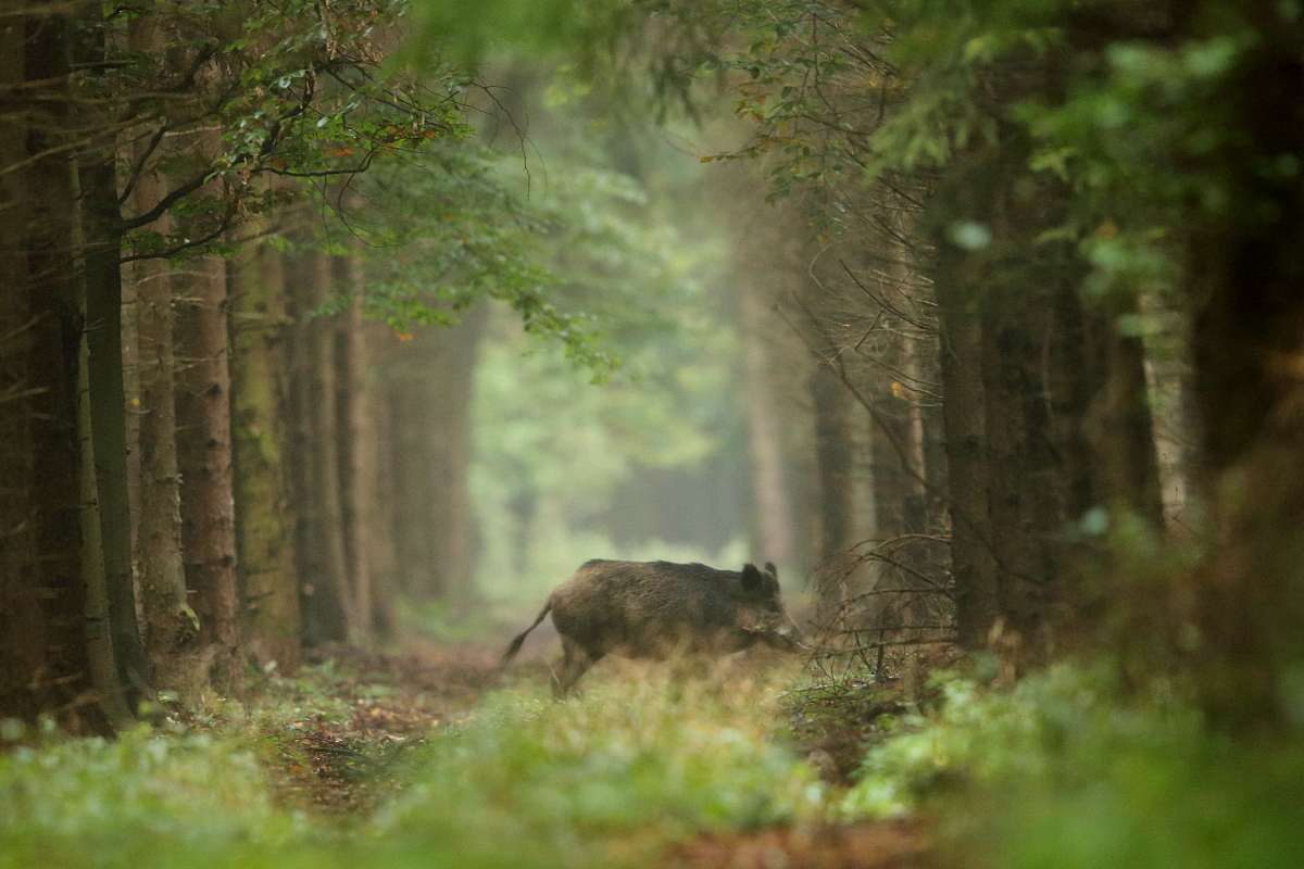 Dodane zdjęcia dzika powstały przy okazji nieudanych prób wykonania zdjęć podczas rykowiska. Też nie obyło się bez emocji. Godzinę przed świtem zatrzymałem samochód w lesie i czekam, aż odezwą się jelenie. Są pierwsze odgłosy i bardzo cicho zaczynam marsz w kierunku odgłosów. Trzeba uważać, bo najmniejszy hałas, nie mówiąc już o niesprzyjającym wietrze, może zakończyć fotografowanie. Tym razem jest bezwietrznie, ale niestety pochmurno z niewielkimi opadami. A więc dokładnie odwrotnie niż podawały to portale meteo. Przeszedłem już około 2 kilometrów i las stawał się coraz bardziej gęsty. Skręcając w prawo, w leśną przecinkę, początkowo bardzo zarośniętą, po lewej mojej stronie w odległości dosłownie kilku metrów stado dzików drzemało sobie o świcie. Na pewno były wśród nich tegoroczne, podrośnięte już młode. To z jakim impetem się poderwały trudno opisać, podobnie jak moje wrażenia. W sytuacji kiedy słychać odgłos łamiącej się pod stopą gałązki i odbierane jest to jako hałas, nagła intensywna wrzawa i kwik stada dzików to istna dźwiękowa kanonada. Chyba za cicho się poruszałem. No cóż postanowiłem pozostać w tym miejscu i obserwować nieco większą przecinkę leśną, mimo braku dostatecznego światła. Pomysł był dobry. Z jednej części lasu przechodziły jelenie, sarny i dziki. Niestety zdjęcia mają charakter dokumentacyjny, a właściwie dla mnie pamiątki z bliskiego kontaktu z dzikami. Niemniej jednak miejsce jest ciekawe i piękne, gdyby sprawdziły się prognozy to jakość wykonanych zdjęć byłaby diametralnie inna. Ale jak się nie ma co się lubi, to się lubi co się ma…