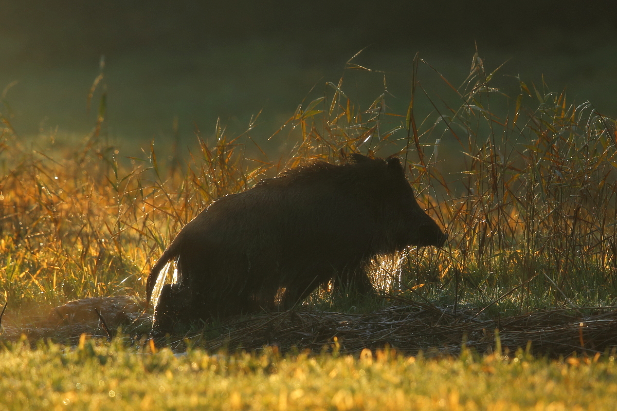 Oj ta galeria powstaje z wielkim trudem i w 100% tworzą ja przypadkowo wykonane zdjęcia. Tak też było i tym razem. Siedziałem w tym samym miejscu w którym kilka tygodni temu wykonałem zdjęcia bielika na świerku oraz myszołowy. Niestety tym razem w przygotowanym miejscu nie pojawiły się nawet kruki. Na szczęście, niejako na pociechę pojawił się na 25 sekund dzik. Przeszedł po lewej stronie od czatowni, po czym zniknął w lesie. Polanę w lesie przecinał dość głęboki rów. Dzik bez trudu się przeprawił przez niego, a zdjęcia, o wschodzie, pod słońce dzika ociekającego od wody wyszły co najmniej ciekawe. Tak, więc dodałem kilka zdjęć, które jak dotąd są chyba najciekawszymi zdjęciami dzika jakie wykonałem.