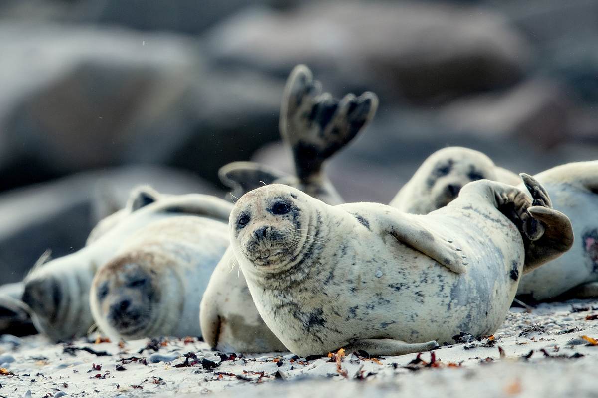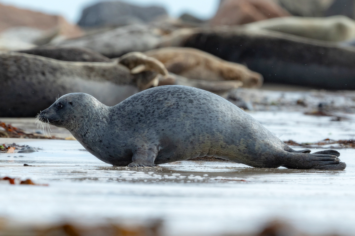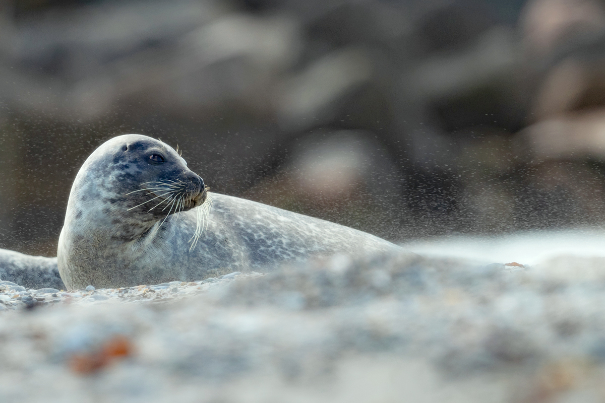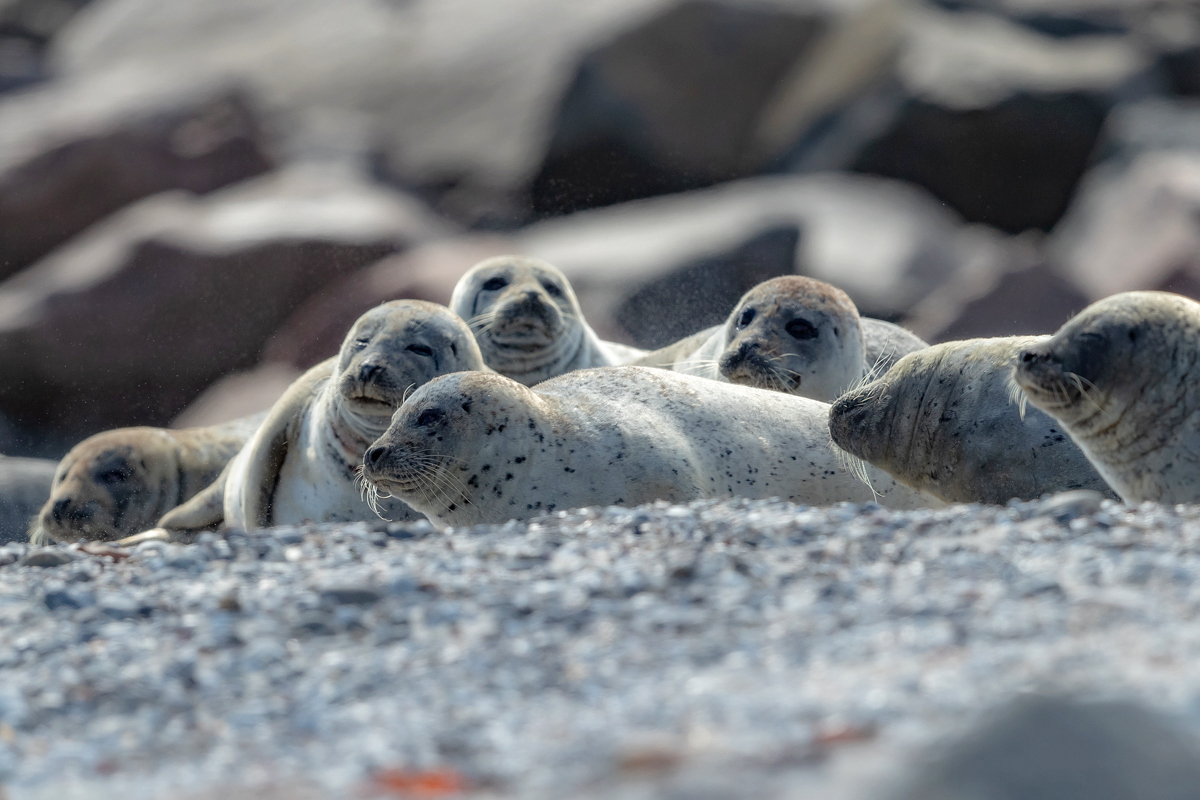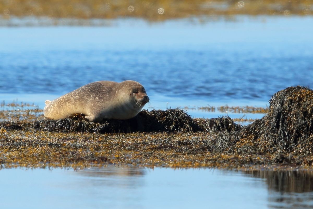 Dość zabawna historia z fotografowaniem prezentowanych zdjęć fok. Aby dojść jak najbliżej fok, trzeba było przejść dość kamienistą plażę, która okresowo była zalewana. Podejście było dość trudne i trwało kilkadziesiąt minut, ale największe zdziwienie nastąpiło po ponad godzinnej sesji fotograficznej z fokami, po której okazało się, że wszystkie drogi powrotu, zostały zalane przez przypływ. Szybka decyzja, bo będzie gorzej z każdą minutą. Buty w rękę i póki wody jeszcze nie ma więcej niż pół metra, da się jeszcze wrócić ze sprzętem bez zamoczenia. Dobrze, że foki zupełnie ignorowały moją obecność i w godzinę udało się wykonać dość dużą ilość zdjęć, w każdym bądź razie na tyle dużą, że pomyślałem o powrocie. W sytuacji jej przedłużenia o godzinę dwie byłoby trudniej wrócić bez pomocy z zewnątrz. Foki pospolite występują też nad Bałtykiem. Tam ich populacja liczy kilkaset sztuk. Foka pospolita dorasta do 180 cm długości ciała i może ważyć do 150 kilogramów.