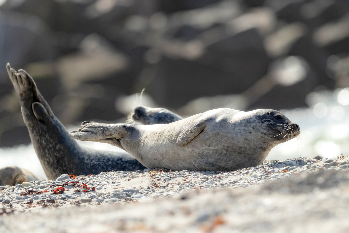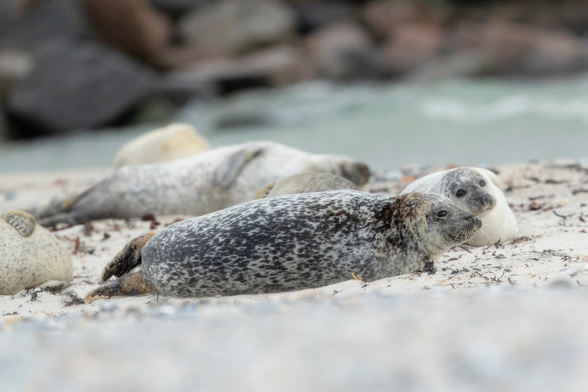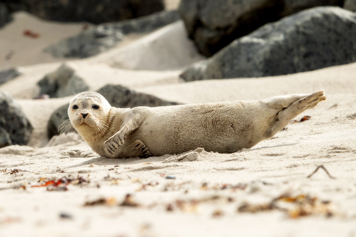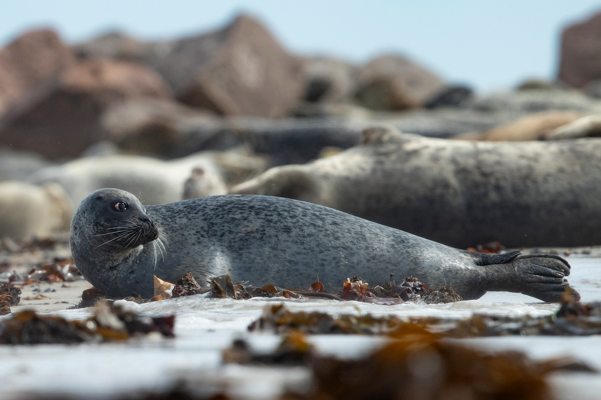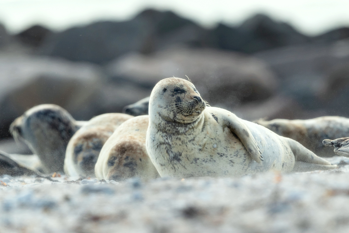 Dość zabawna historia z fotografowaniem prezentowanych zdjęć fok. Aby dojść jak najbliżej fok, trzeba było przejść dość kamienistą plażę, która okresowo była zalewana. Podejście było dość trudne i trwało kilkadziesiąt minut, ale największe zdziwienie nastąpiło po ponad godzinnej sesji fotograficznej z fokami, po której okazało się, że wszystkie drogi powrotu, zostały zalane przez przypływ. Szybka decyzja, bo będzie gorzej z każdą minutą. Buty w rękę i póki wody jeszcze nie ma więcej niż pół metra, da się jeszcze wrócić ze sprzętem bez zamoczenia. Dobrze, że foki zupełnie ignorowały moją obecność i w godzinę udało się wykonać dość dużą ilość zdjęć, w każdym bądź razie na tyle dużą, że pomyślałem o powrocie. W sytuacji jej przedłużenia o godzinę dwie byłoby trudniej wrócić bez pomocy z zewnątrz. Foki pospolite występują też nad Bałtykiem. Tam ich populacja liczy kilkaset sztuk. Foka pospolita dorasta do 180 cm długości ciała i może ważyć do 150 kilogramów.