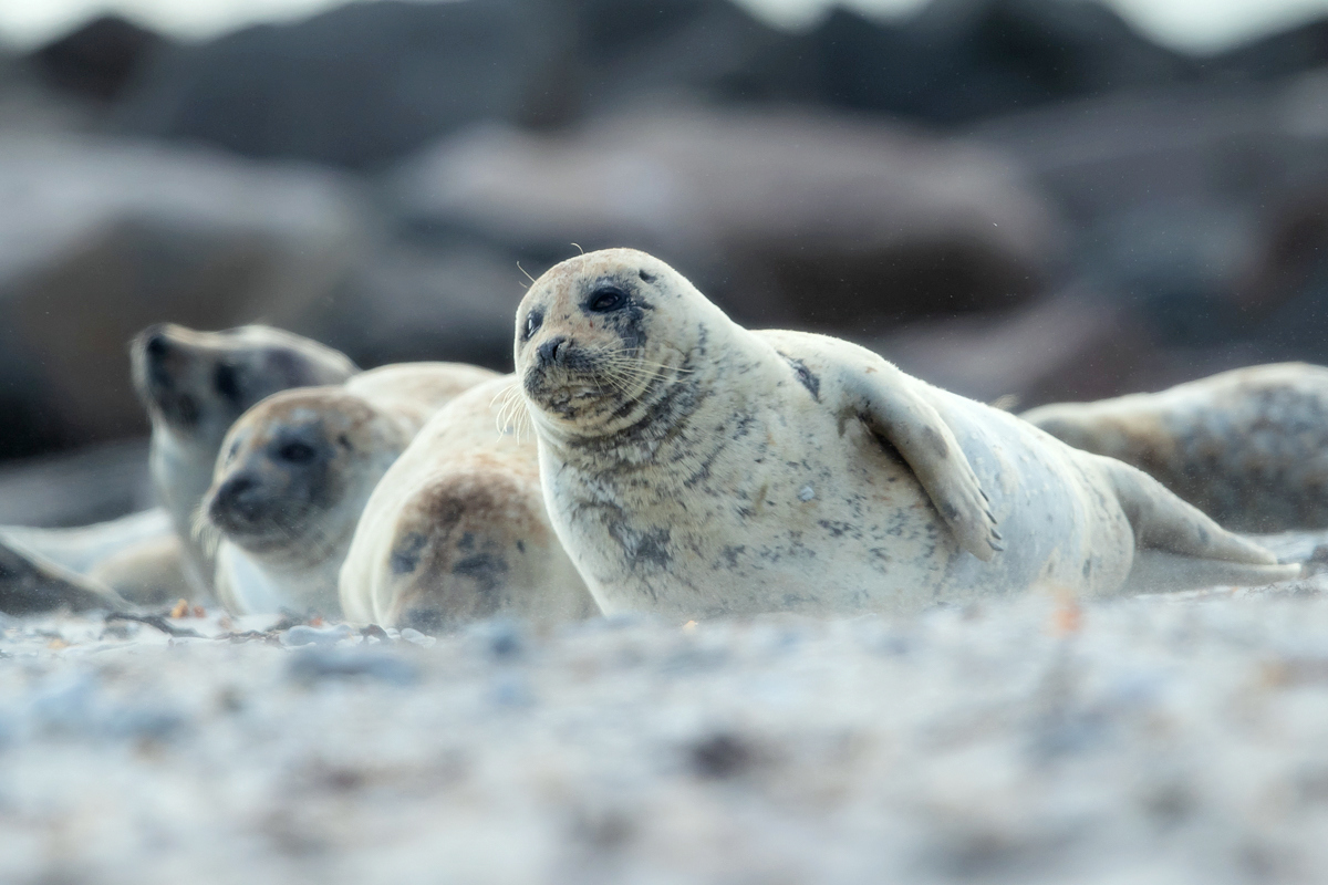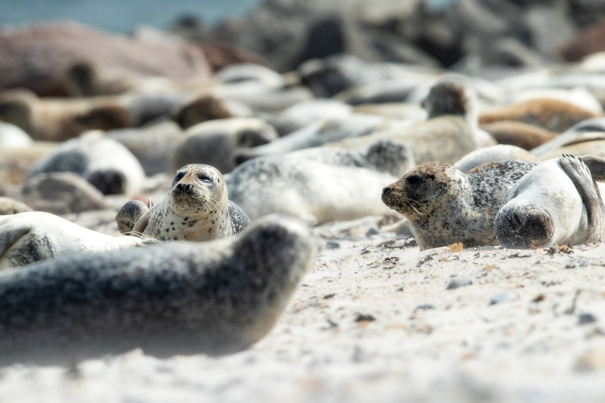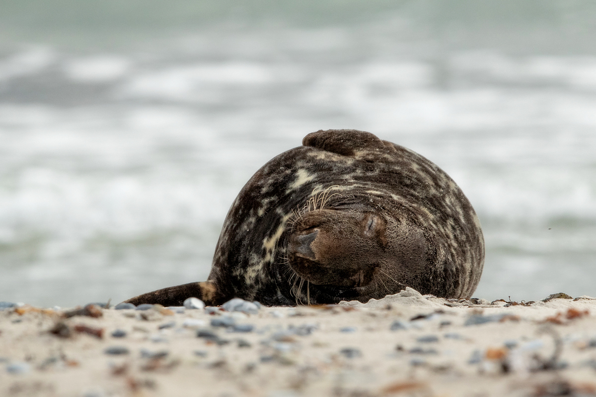Wreszcie kilka przypadkowych zdjęć w galerii foki szarej powstałej ze zdjęć wystających z wody głów foki szarej zostaje zastąpione galerią z prawdziwego zdarzenia, może nawet nieco przeładowaną. Stada foki szarej, po kilkadziesiąt osobników, miały na plażach Dune na Hellgolandzie swoje ulubione miejsca. Na wyspach obowiązuje zakaz zbliżania się do fok na odległość mniejszą niż 30 metrów. Z teleobiektywem nie było problemów ze zrobieniem prezentowanych zdjęć.