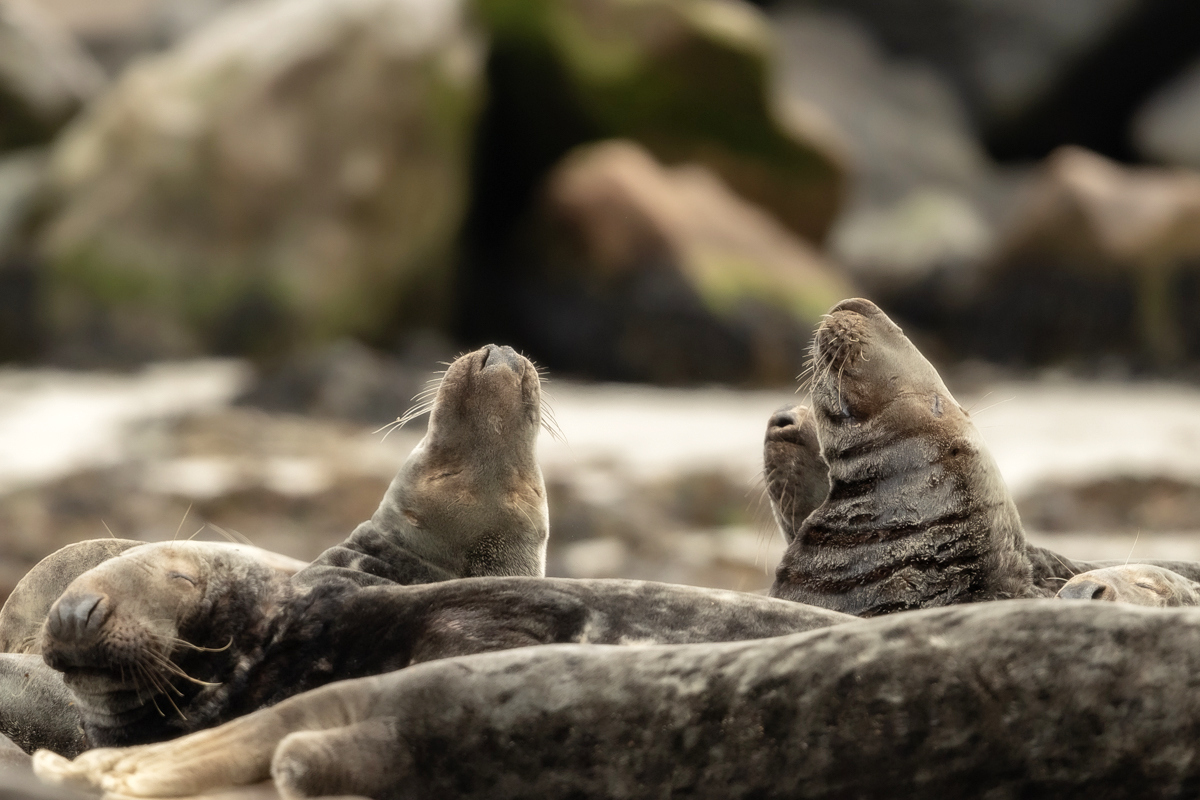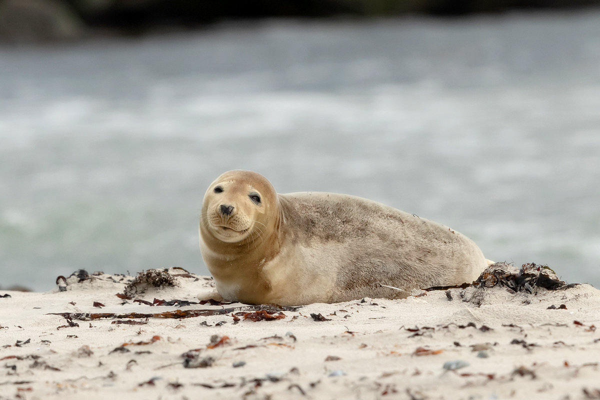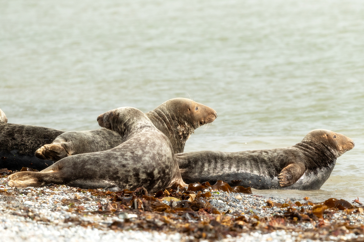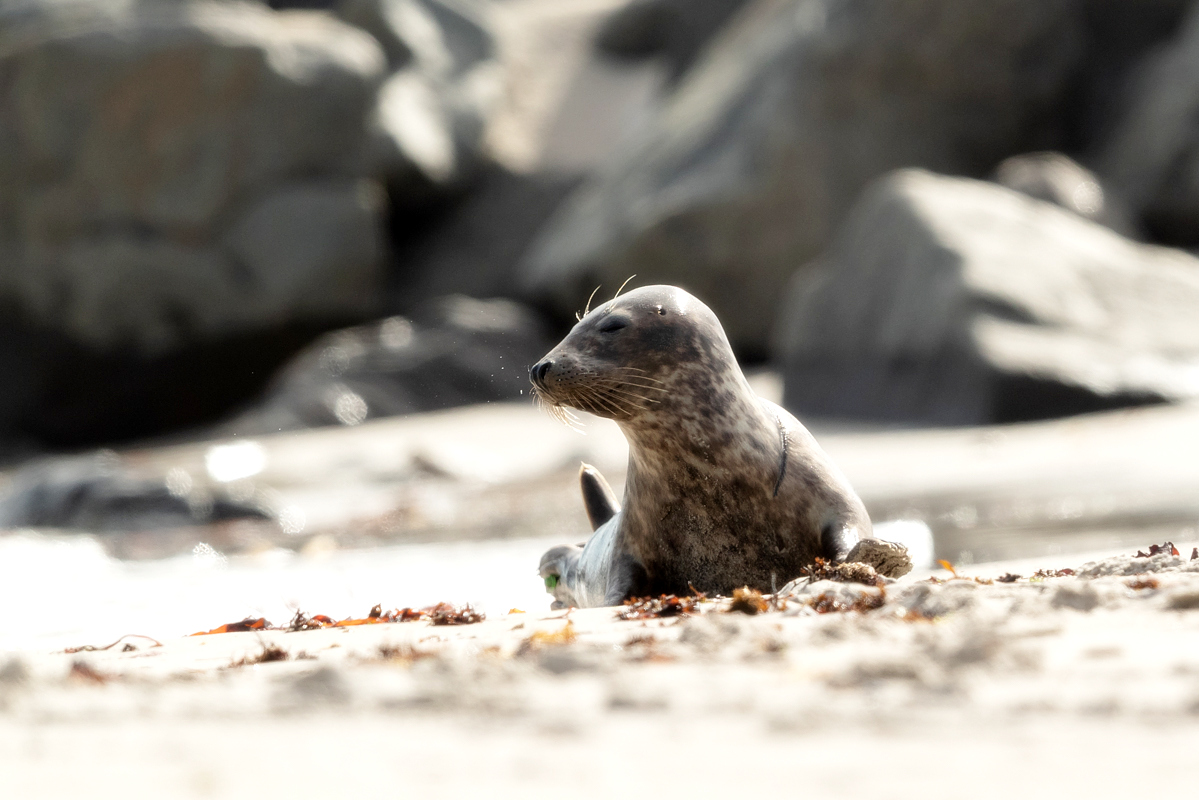 Wreszcie kilka przypadkowych zdjęć w galerii foki szarej powstałej ze zdjęć wystających z wody głów foki szarej zostaje zastąpione galerią z prawdziwego zdarzenia, może nawet nieco przeładowaną. Stada foki szarej, po kilkadziesiąt osobników, miały na plażach Dune na Hellgolandzie swoje ulubione miejsca. Na wyspach obowiązuje zakaz zbliżania się do fok na odległość mniejszą niż 30 metrów. Z teleobiektywem nie było problemów ze zrobieniem prezentowanych zdjęć.
