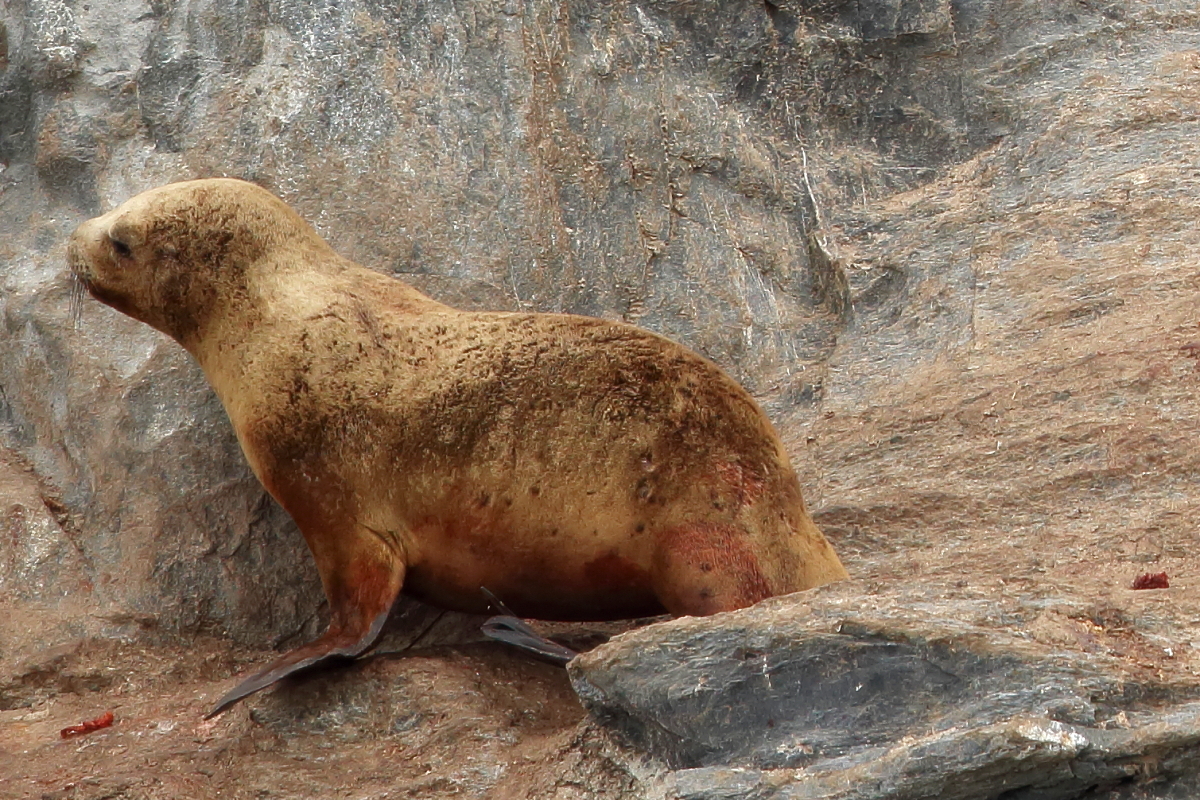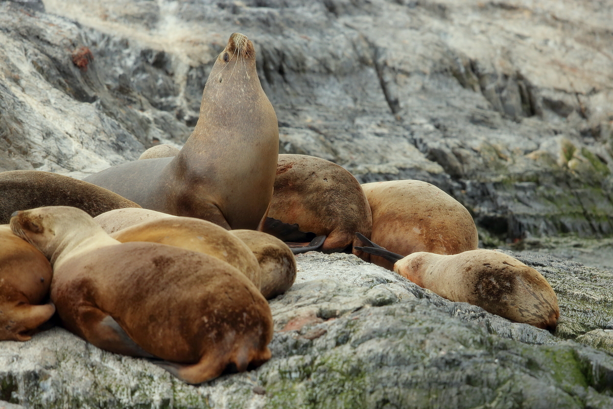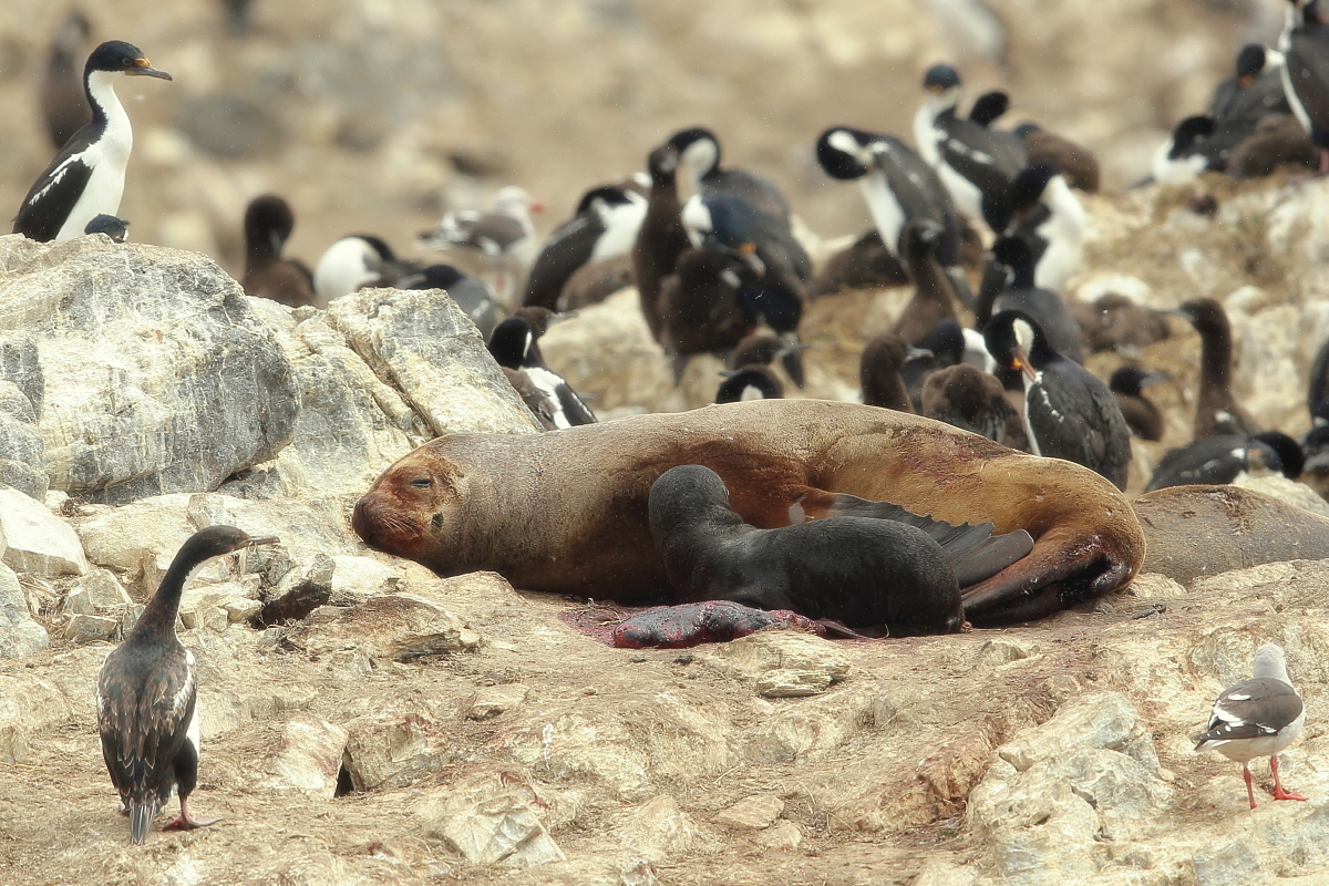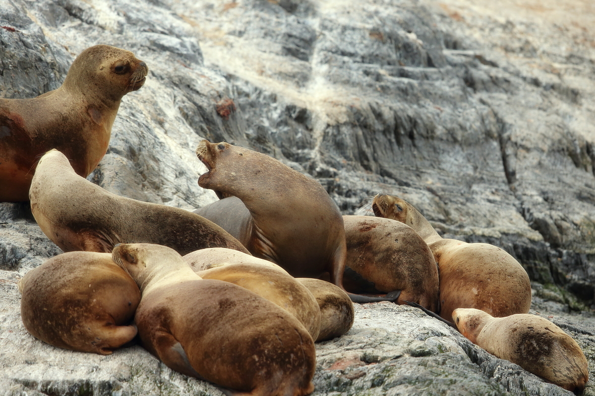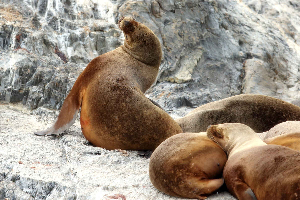 Uchatki patagońskie fotografowałem podczas krótkiego rejsu wokół wysp leżących niedaleko Ushuaia. Chyba się trochę spóźniliśmy by być światkiem narodzin młodej uchatki. W każdym bądź razie "resztki" poporodowe były przedmiotem zainteresowania mewy magellańskiej i mewy południowej, które ostrożnie podchodziły do uchatki i jej dopiero co narodzonej pociechy. Samiec jest znacznie większy od samic i wyróżniał spośród dziesiątek uchatek wygrzewających się na skałach. Waga samców może osiągnąć 350 kilogramów i długości ciała 2,7 metra. Samice są znacznie mniejsze, bo osiągają wagę do 150 kilogramów i długości ciała do 2 metrów. Występują wzdłuż wybrzeży Argentyny, Urugwaju, południowej Brazylii, Chile, Peru i Ekwadoru.