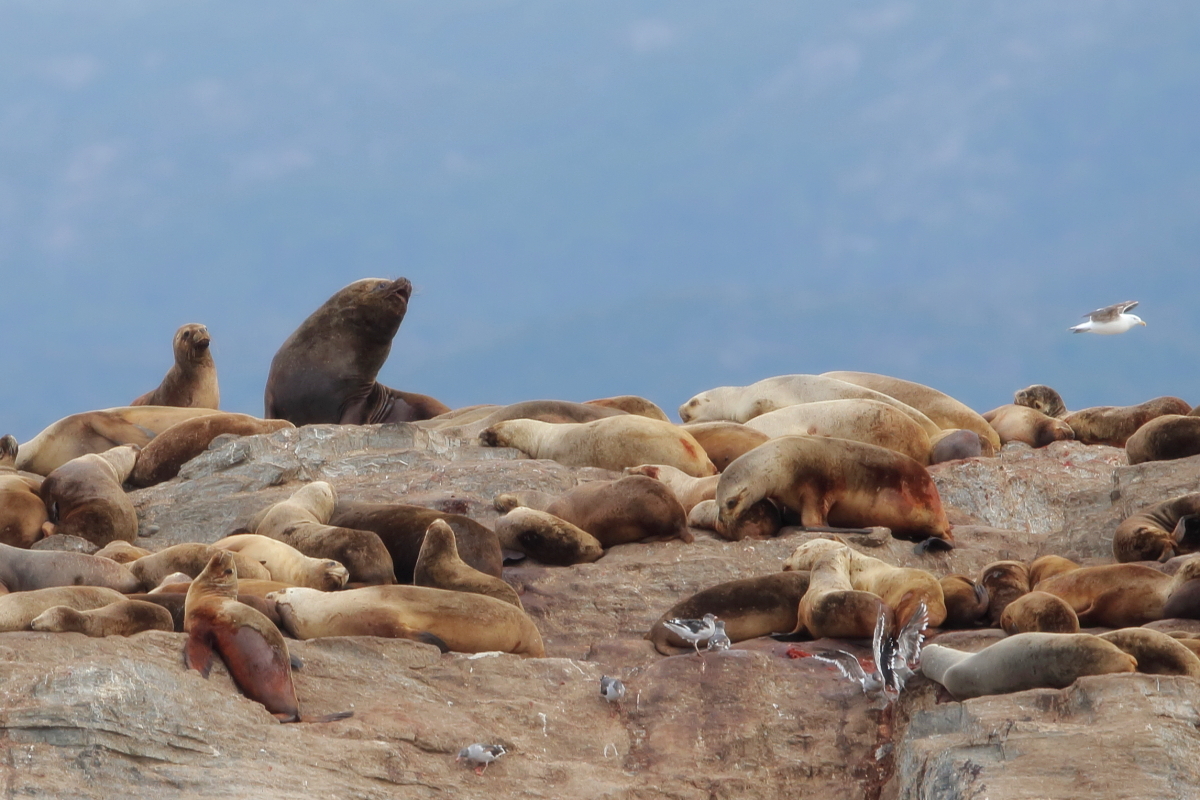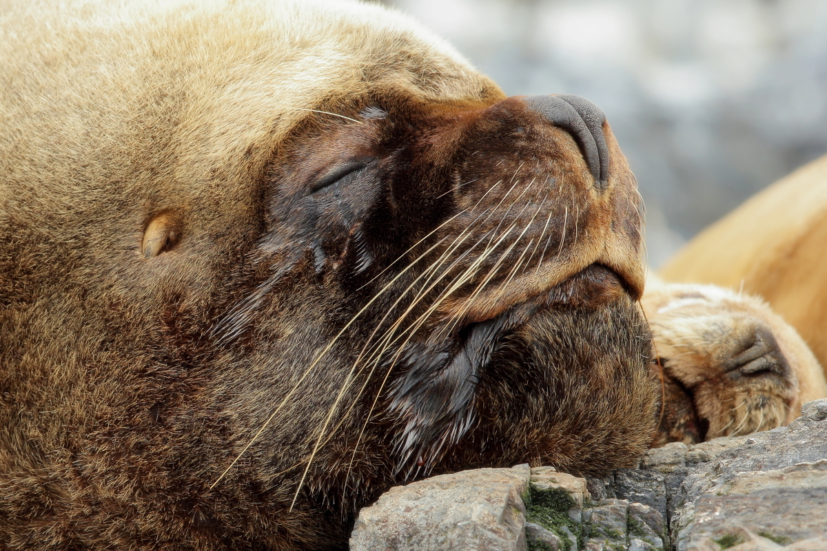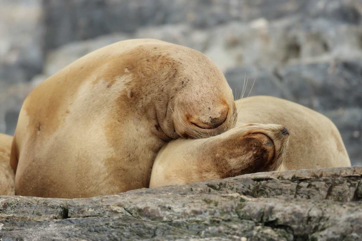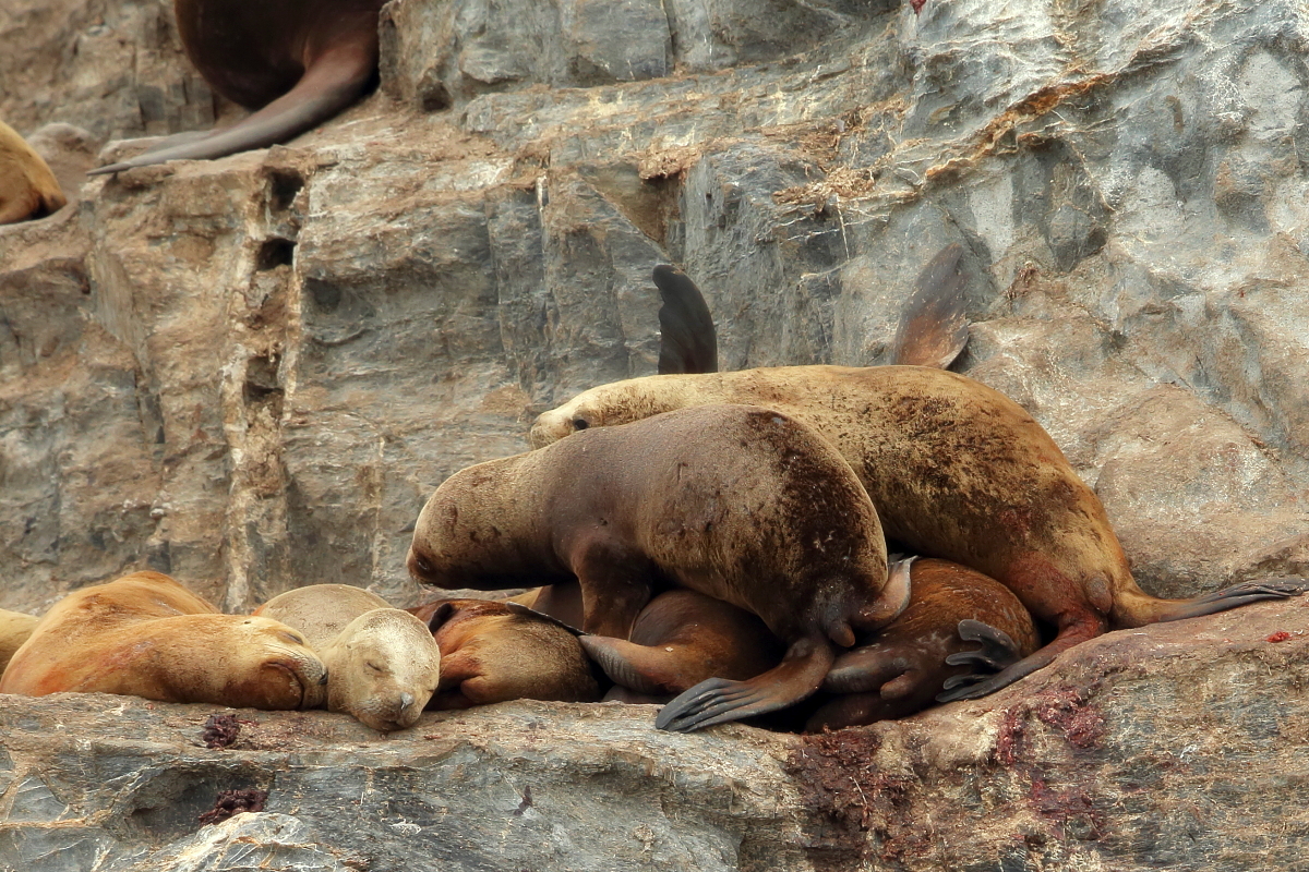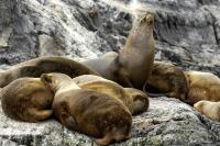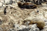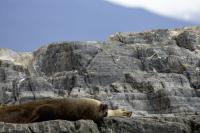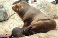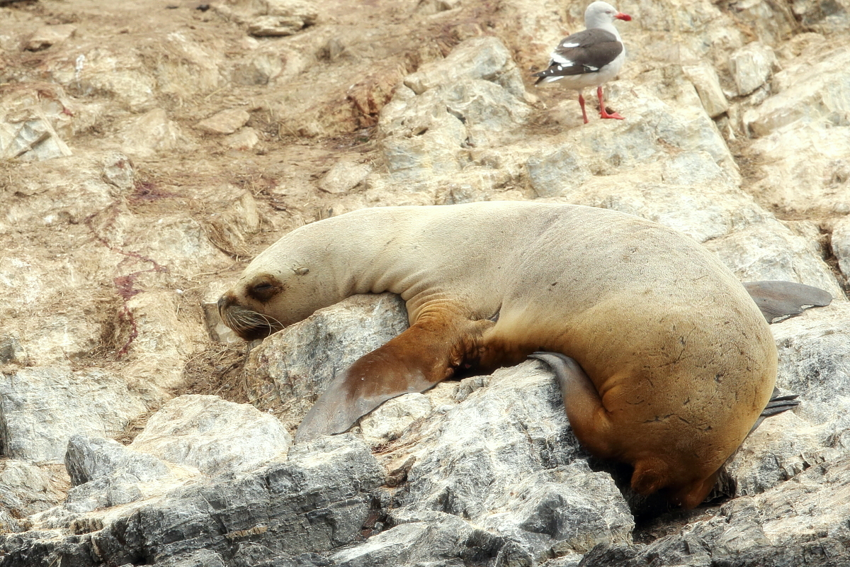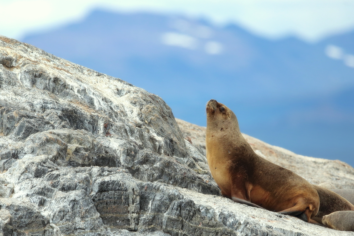 Uchatki patagońskie fotografowałem podczas krótkiego rejsu wokół wysp leżących niedaleko Ushuaia. Chyba się trochę spóźniliśmy by być światkiem narodzin młodej uchatki. W każdym bądź razie "resztki" poporodowe były przedmiotem zainteresowania mewy magellańskiej i mewy południowej, które ostrożnie podchodziły do uchatki i jej dopiero co narodzonej pociechy. Samiec jest znacznie większy od samic i wyróżniał spośród dziesiątek uchatek wygrzewających się na skałach. Waga samców może osiągnąć 350 kilogramów i długości ciała 2,7 metra. Samice są znacznie mniejsze, bo osiągają wagę do 150 kilogramów i długości ciała do 2 metrów. Występują wzdłuż wybrzeży Argentyny, Urugwaju, południowej Brazylii, Chile, Peru i Ekwadoru.