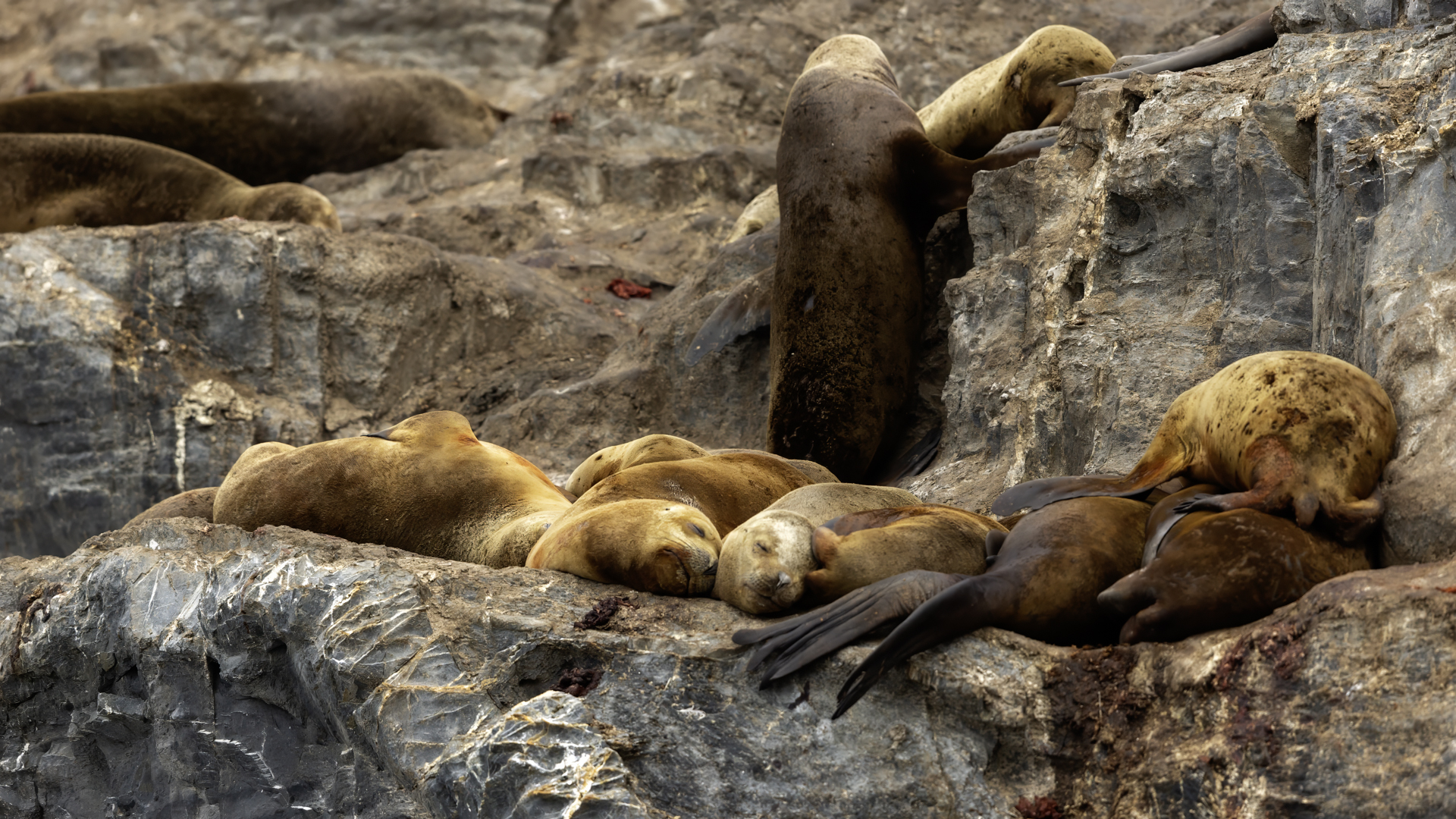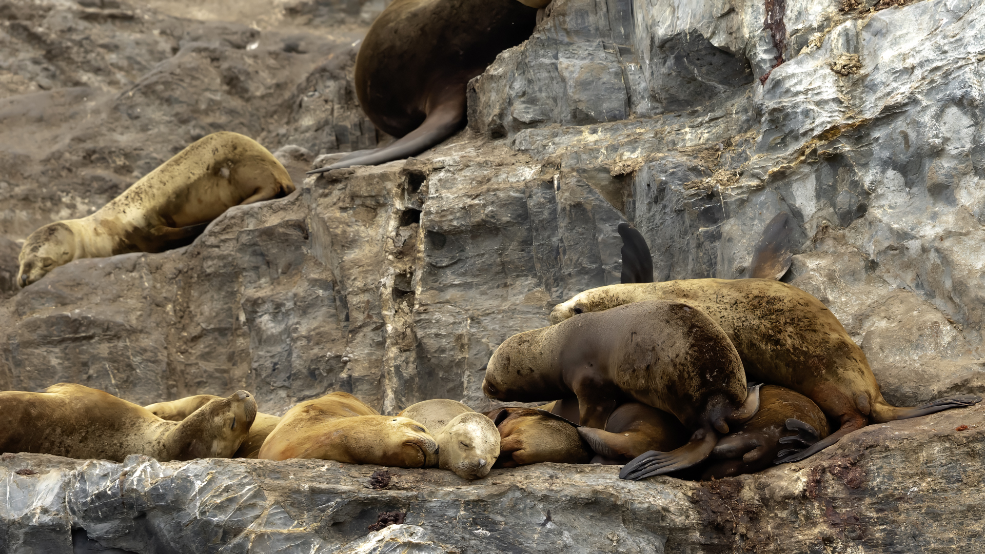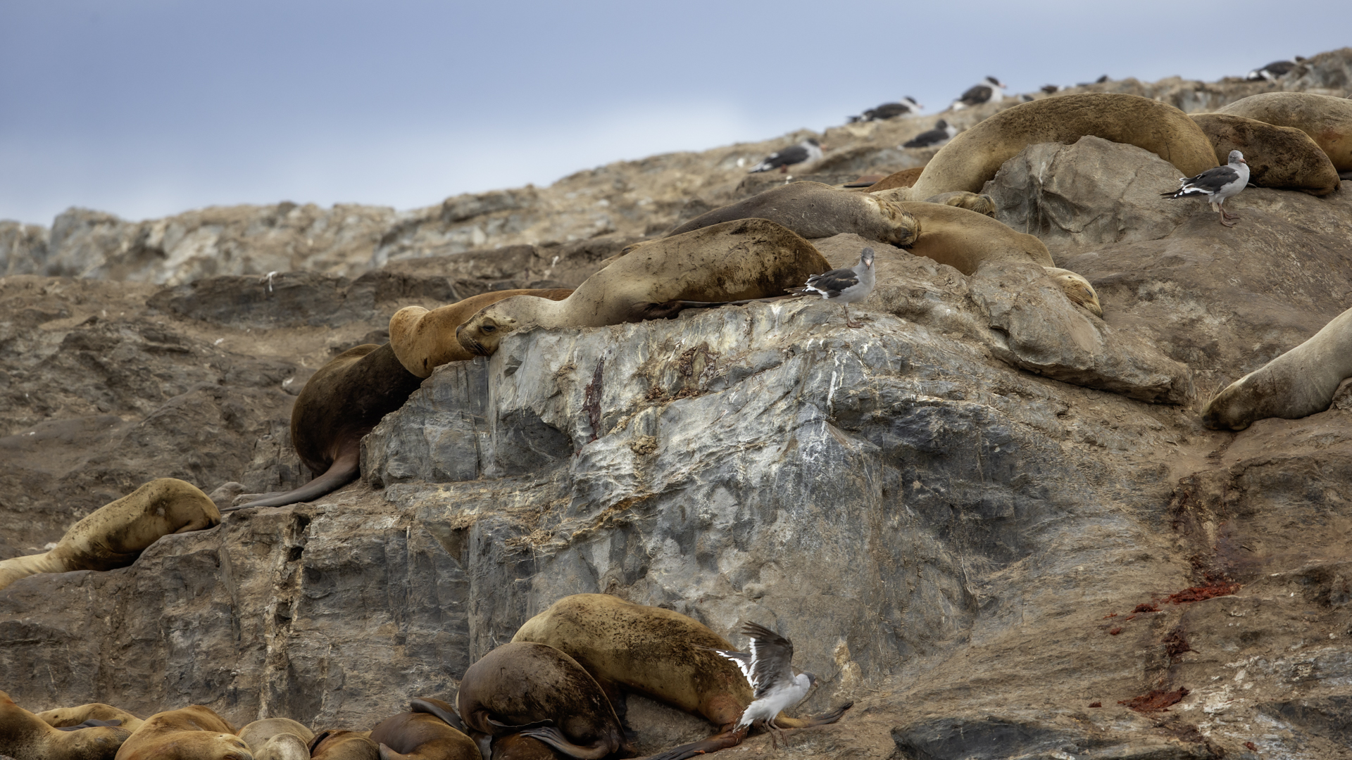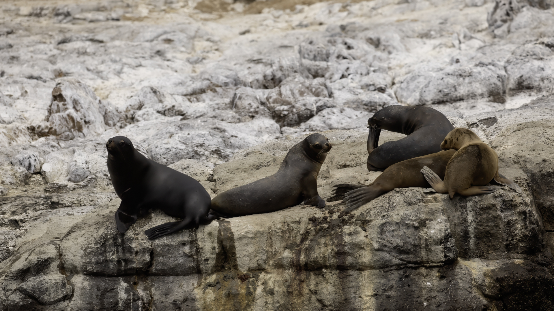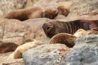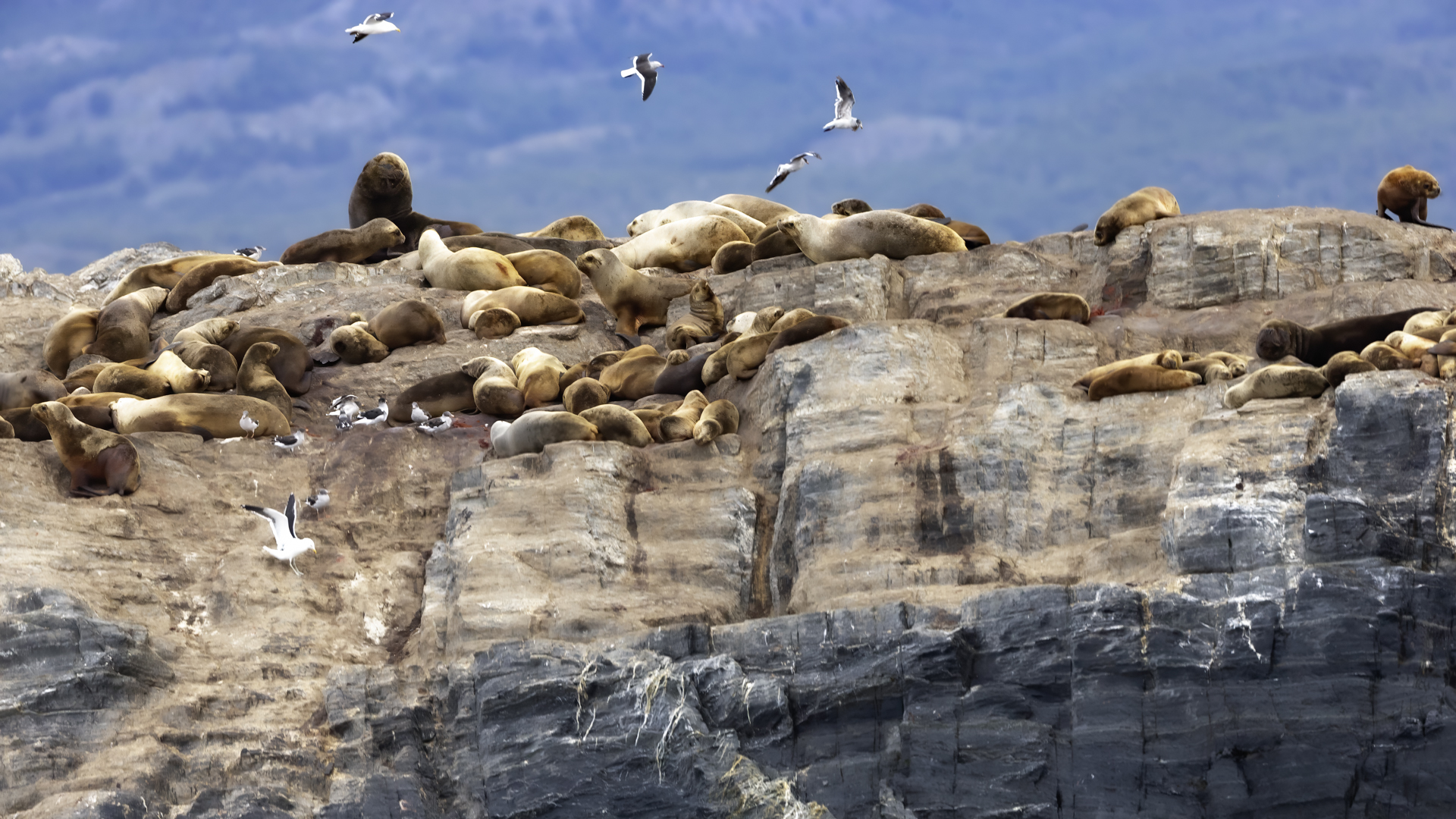 Uchatki patagońskie fotografowałem podczas krótkiego rejsu wokół wysp leżących niedaleko Ushuaia. Chyba się trochę spóźniliśmy by być światkiem narodzin młodej uchatki. W każdym bądź razie "resztki" poporodowe były przedmiotem zainteresowania mewy magellańskiej i mewy południowej, które ostrożnie podchodziły do uchatki i jej dopiero co narodzonej pociechy. Samiec jest znacznie większy od samic i wyróżniał spośród dziesiątek uchatek wygrzewających się na skałach. Waga samców może osiągnąć 350 kilogramów i długości ciała 2,7 metra. Samice są znacznie mniejsze, bo osiągają wagę do 150 kilogramów i długości ciała do 2 metrów. Występują wzdłuż wybrzeży Argentyny, Urugwaju, południowej Brazylii, Chile, Peru i Ekwadoru.