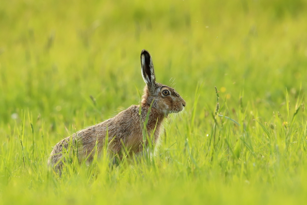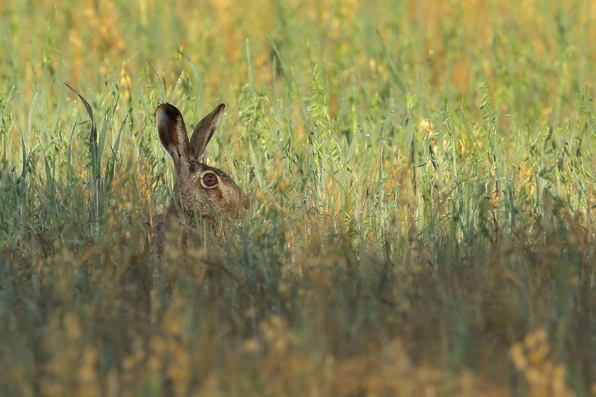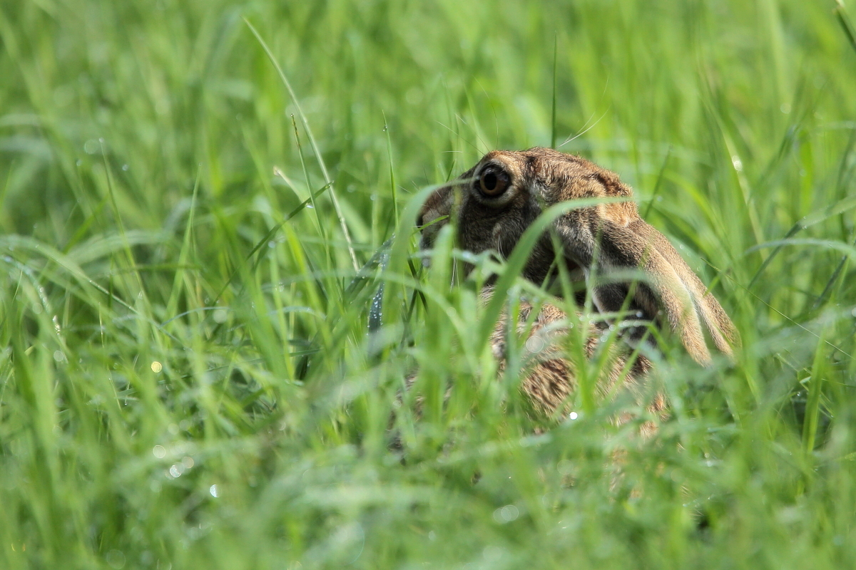 Wyczekując w czatowni na orliki pojawiali sie różni goście przed obiektywem. Jednym z nich był zając. Pojawił się nagle, ale spędził ze mną ponad godzinę. Współpraca ze strony zająca była doskonała. To trochę podgryzł trawę, to się leniwie przeciągnął, jednym słowem wprowadził duże urozmaicenie dotychczasowej galerii.