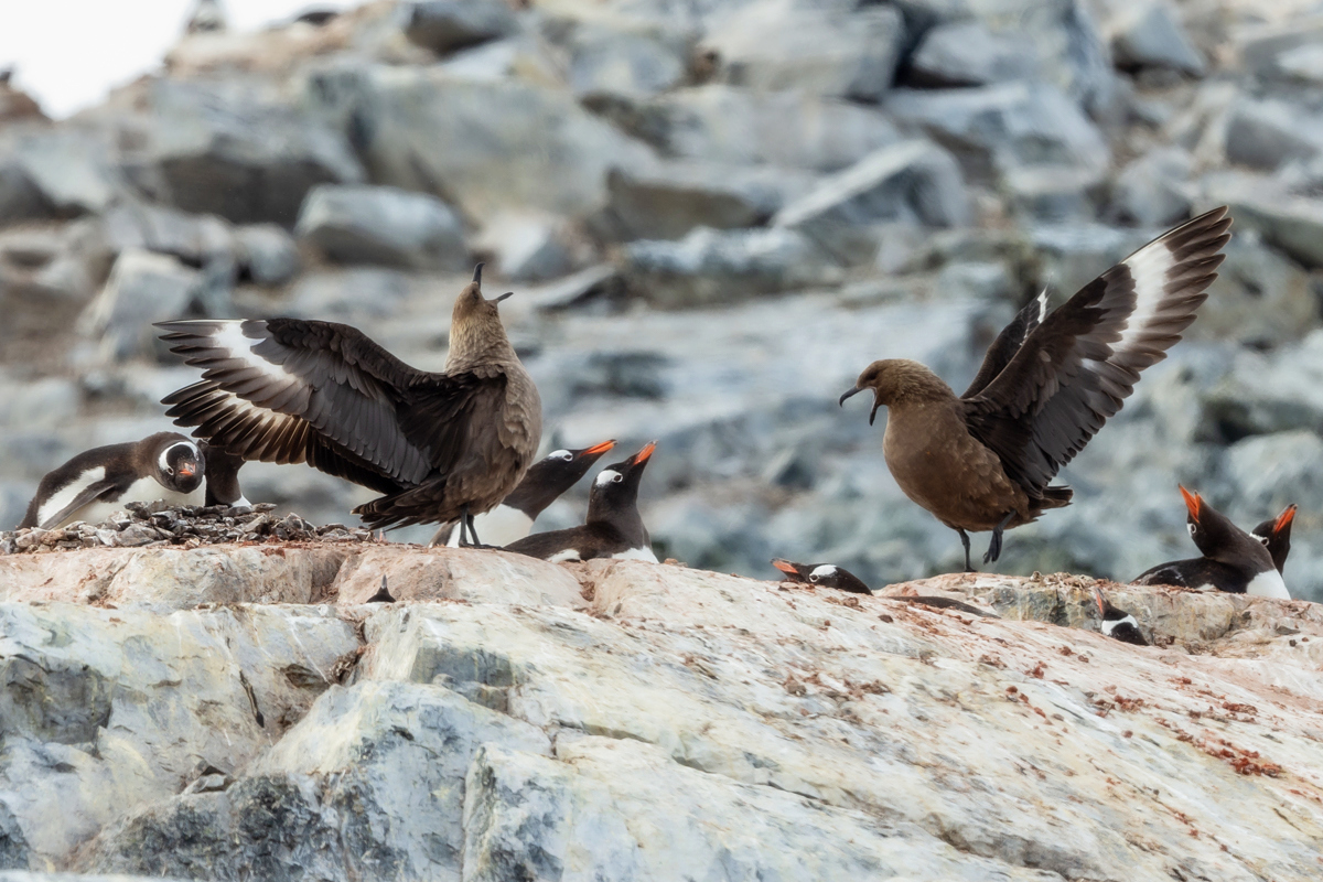 1.Pingwin białobrewy. 2.Pingwin białooki. 3.Pingwin maskowy. 4.Albatros ciemnogłowy. 5.Albatros wędrowny. 6.Albatros czarnobrewy. 7.Petrelec wielki. 8.Burzyk białobrody. 9.Pertelek cienkodzioby. 10.Nawałnik żółtopłetwy.11.Petrelek antarktyczny. 12.Warcabnik.13.Fulmar południowy.14.Pochwodziób żółtodzioby15.Rybitwa antarktyczna.16.Wydrzyk antarktyczny. 17.Petrelec olbrzymi. 18.Kormoran antarktyczny. 19.Oceannik bialobrzuchy.