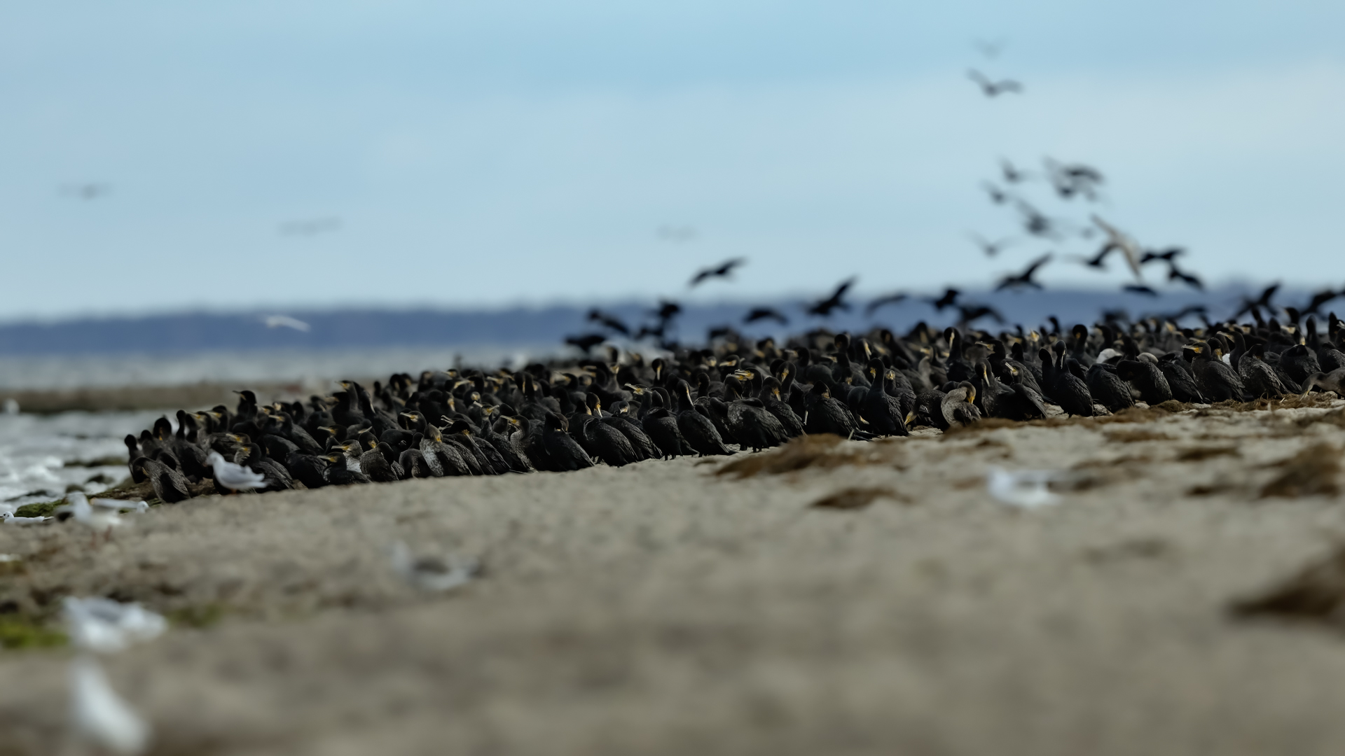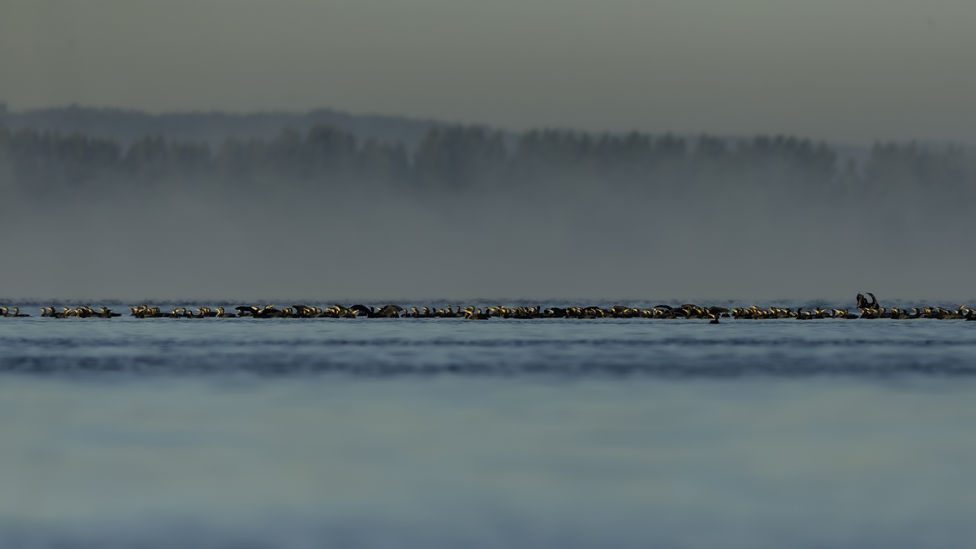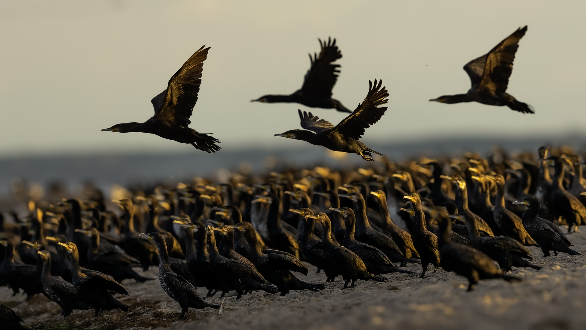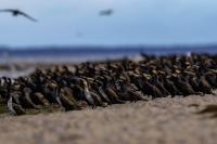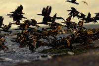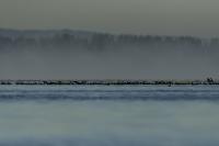 Było dla mnie dużym zaskoczeniem, kiedy to leżąc na plaży o poranku zobaczyłem po lewej stronie gromadzące się stado kormoranów. Początkowo wyglądało to niegroźnie, ale w ciągu pół godziny przyleciało setki, a może ponad tysiąc kormoranów. Mimo dużej odległości stado nie mieściło się w 4 kadrach z 600-tką przykręconą do korpusu! Ciągle nadlatywały tworząc szpaler, który początkowo był skierowany do brzegu, później zaś w kierunku morza. Obserwując płynące w takim szyku setki ptaków, dało się zaobserwować, że niektóre z nich co chwila nurkują, by po chwili wynurzać się z wody z rybą w dziobie. Może to taka technika stadnego połowu. A może po prostu dojrzały ławicę ryb, którą skutecznie przetrzebiły. Zapewniam, że wschód słońca, opary mgły w tle z tysiącem kormoranów tego się nie da zapomnieć. Niestety widok trudny w fotografowaniu. Z jednej strony chciało by się pokazać wszystkie ptaki i z 600 milimetrów przejść na 200, a może 50. Z drugiej zaś strony zbliżenie z wskakującymi do i z wody kormoranami, pełne dynamiki byłoby też ciekawe. Do tego drugiego ujęcia trzeba byłoby jeszcze zmniejszyć odległość lub nałożyć konwerter.
