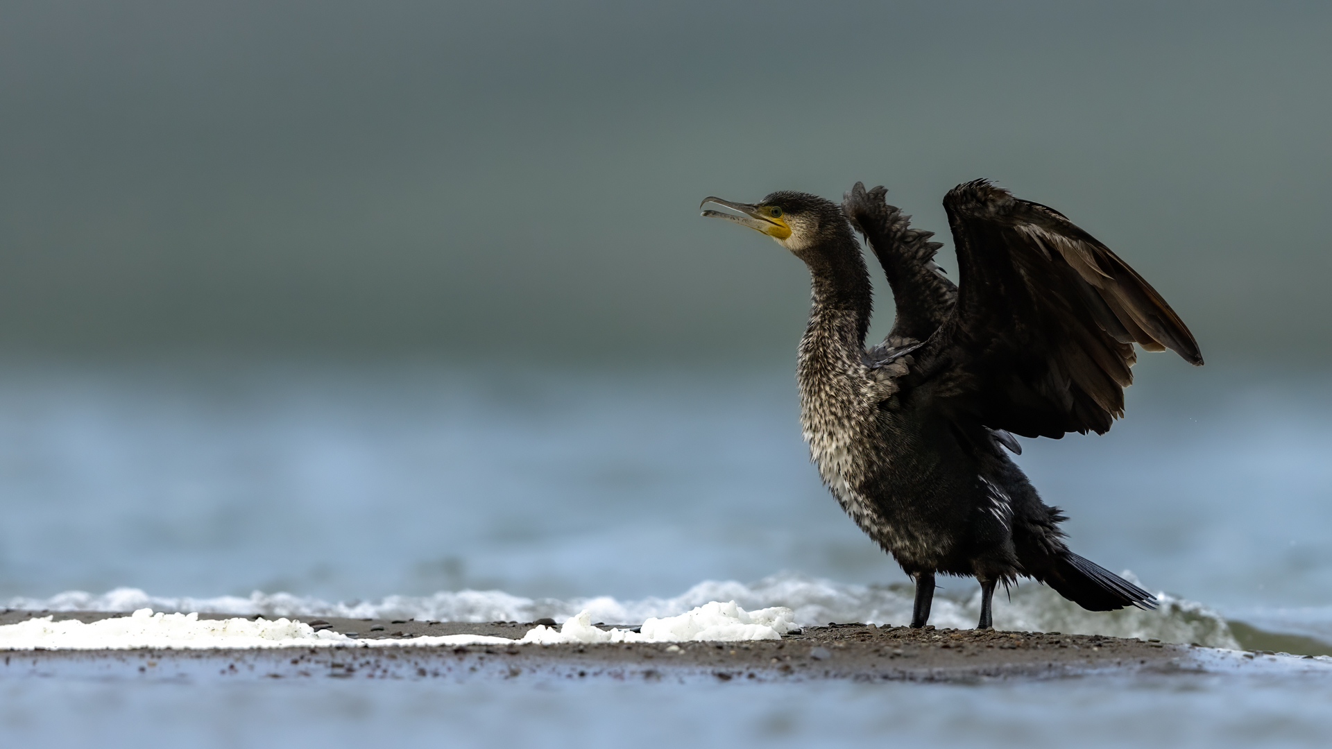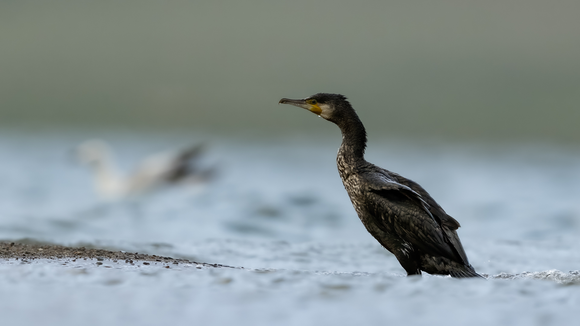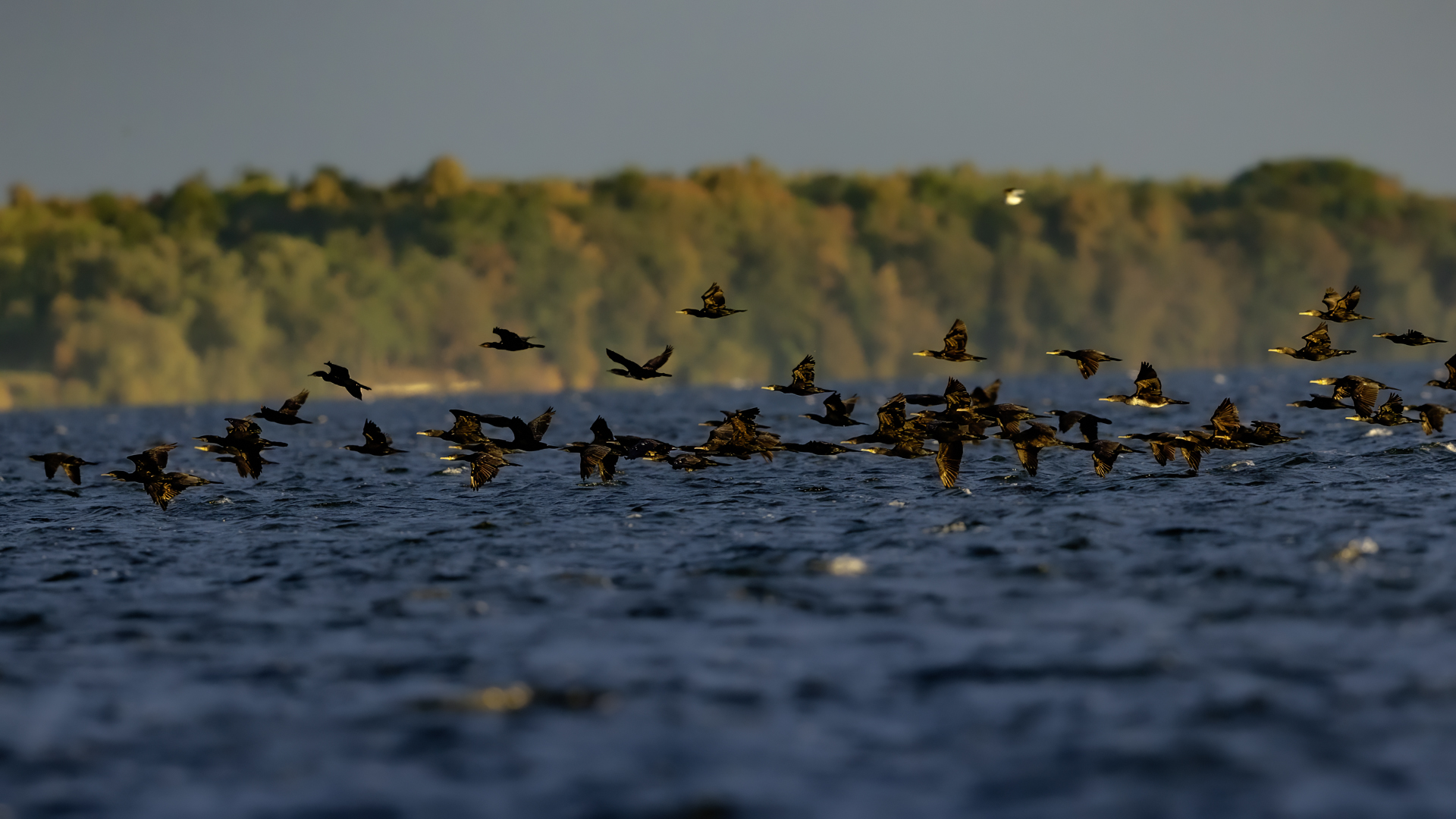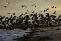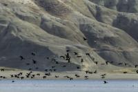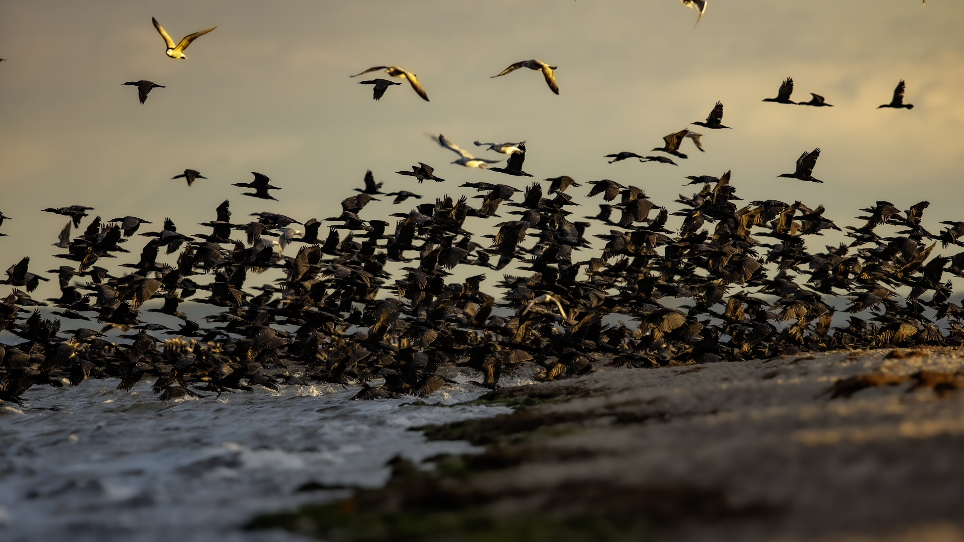 Było dla mnie dużym zaskoczeniem, kiedy to leżąc na plaży o poranku zobaczyłem po lewej stronie gromadzące się stado kormoranów. Początkowo wyglądało to niegroźnie, ale w ciągu pół godziny przyleciało setki, a może ponad tysiąc kormoranów. Mimo dużej odległości stado nie mieściło się w 4 kadrach z 600-tką przykręconą do korpusu! Ciągle nadlatywały tworząc szpaler, który początkowo był skierowany do brzegu, później zaś w kierunku morza. Obserwując płynące w takim szyku setki ptaków, dało się zaobserwować, że niektóre z nich co chwila nurkują, by po chwili wynurzać się z wody z rybą w dziobie. Może to taka technika stadnego połowu. A może po prostu dojrzały ławicę ryb, którą skutecznie przetrzebiły. Zapewniam, że wschód słońca, opary mgły w tle z tysiącem kormoranów tego się nie da zapomnieć. Niestety widok trudny w fotografowaniu. Z jednej strony chciało by się pokazać wszystkie ptaki i z 600 milimetrów przejść na 200, a może 50. Z drugiej zaś strony zbliżenie z wskakującymi do i z wody kormoranami, pełne dynamiki byłoby też ciekawe. Do tego drugiego ujęcia trzeba byłoby jeszcze zmniejszyć odległość lub nałożyć konwerter.