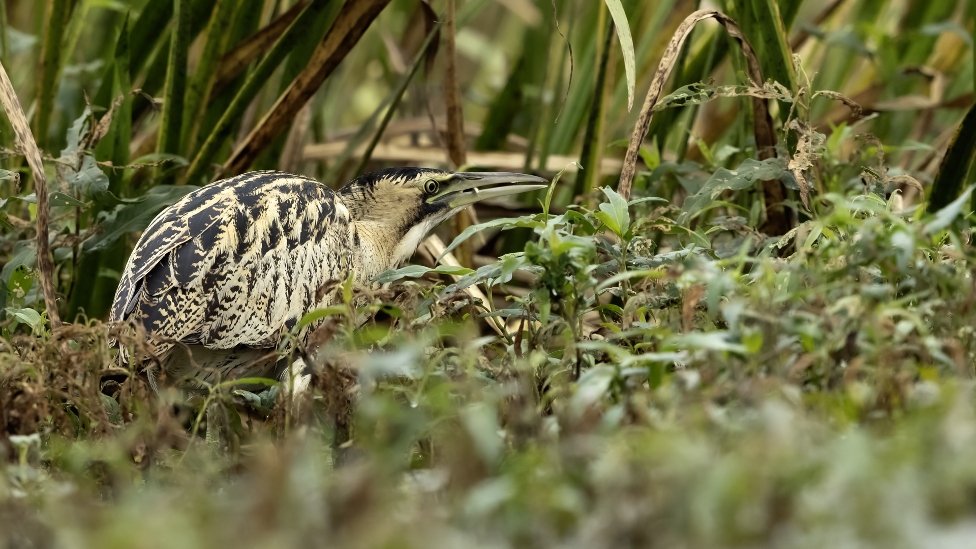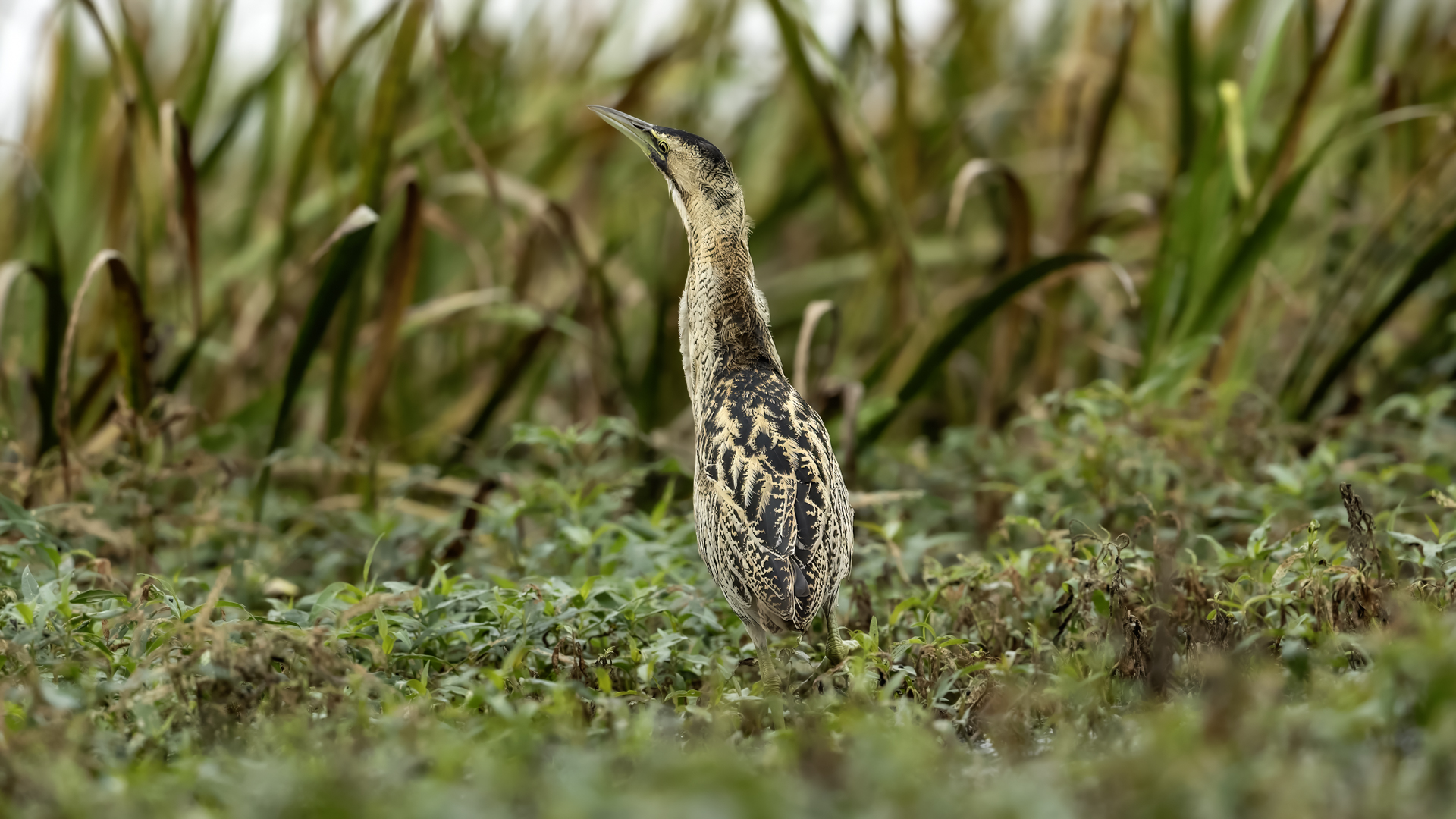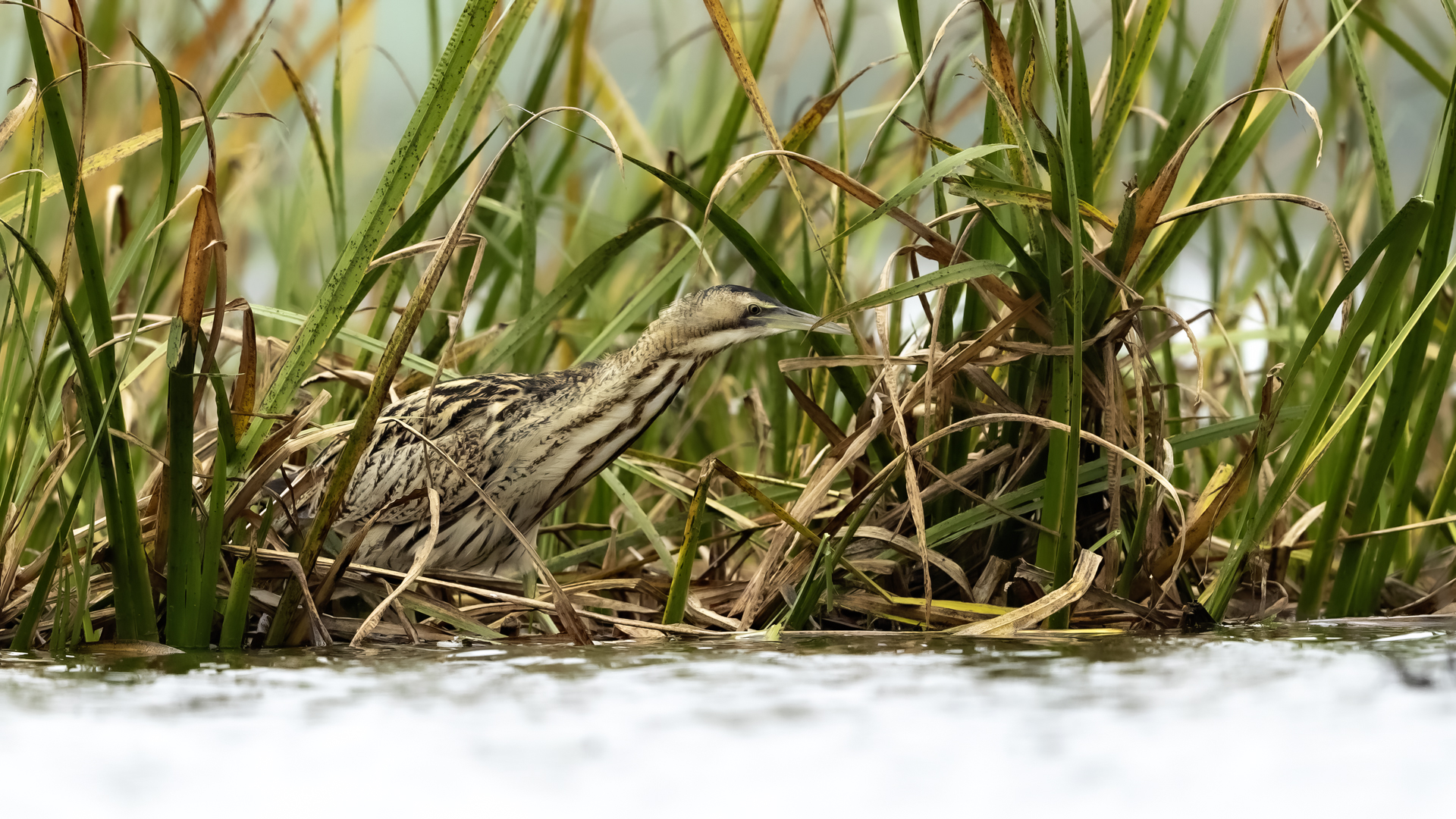 Tym razem wybraliśmy się z Haliną do czatowni właśnie na bąka. Był widziany w tej okolicy, co zwiększało prawdopodobieństwo do 2 %, że się uda :-)) . Ale jak się nie próbuje, to na pewno się nie sfotografuje. Kilka godzin wyczekiwania od świtu i nagle jest w pełnym kadrze przed naszymi obiektywami. Trudno pohamować emocje tak długo wyczekiwanego spotkania, ale Haliny ciśnienie osiągnęło swoje maksimum. Obserwowała go wcześniej ode mnie kilka minut, bo bąk usiadł pół metra od jej ściany czatowni i sprawdzał teren. Jakikolwiek ruch, odgłos wówczas i powiedziałbym, że znów było blisko. Tym razem się udało, choć majestatyczne przejście przed obiektywami trwało niespełna dwie minuty. Tylko i aż dwie minuty. Dwie minuty które pamiętać się będzie do końca życia, zmieniają dotychczasowy dokumentacyjną zawartość galerii no i taaaaaakie spotkanie musi być odnotowane w nowościach…