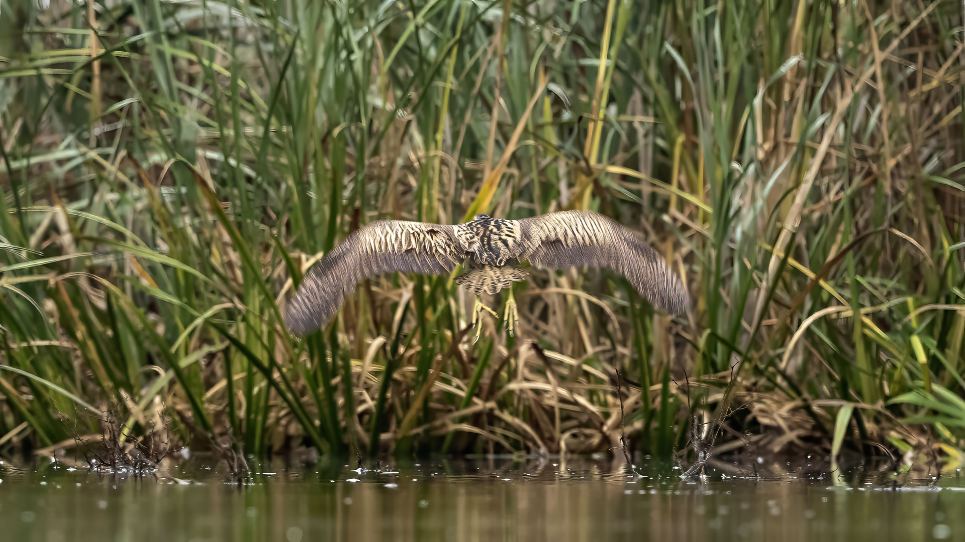 Na kolejny dzień postanowiliśmy spróbować raz jeszcze sfotografować bąka. W dwa poprzednie dni pojawił się o tej samej godzinie. Czyżby był systematyczny w penetrowaniu swojego rewiru? Niestety nie. Tym razem bąki trzymały się zdecydowanie dalej na małej wysepce. Wysepka była na tyle mała, że pojawienie się na niej drugiego bąka doprowadziło do bąkowej potyczki i przegonieniu słabszego osobnika. Niestety odleciał w kierunku przeciwnym, i z dość daleka powstało zdjęcie bąka w locie. Kolejne zdjęcia przedstawiają żerującego, skupionego ptaka. Jakościowo zdjęcia pozostawiają wiele do życzenia, ale warto je dodać do galerii, która staje się nieco bardziej urozmaicona i pokazuje lepiej środowisko w jakim żyje ptak.