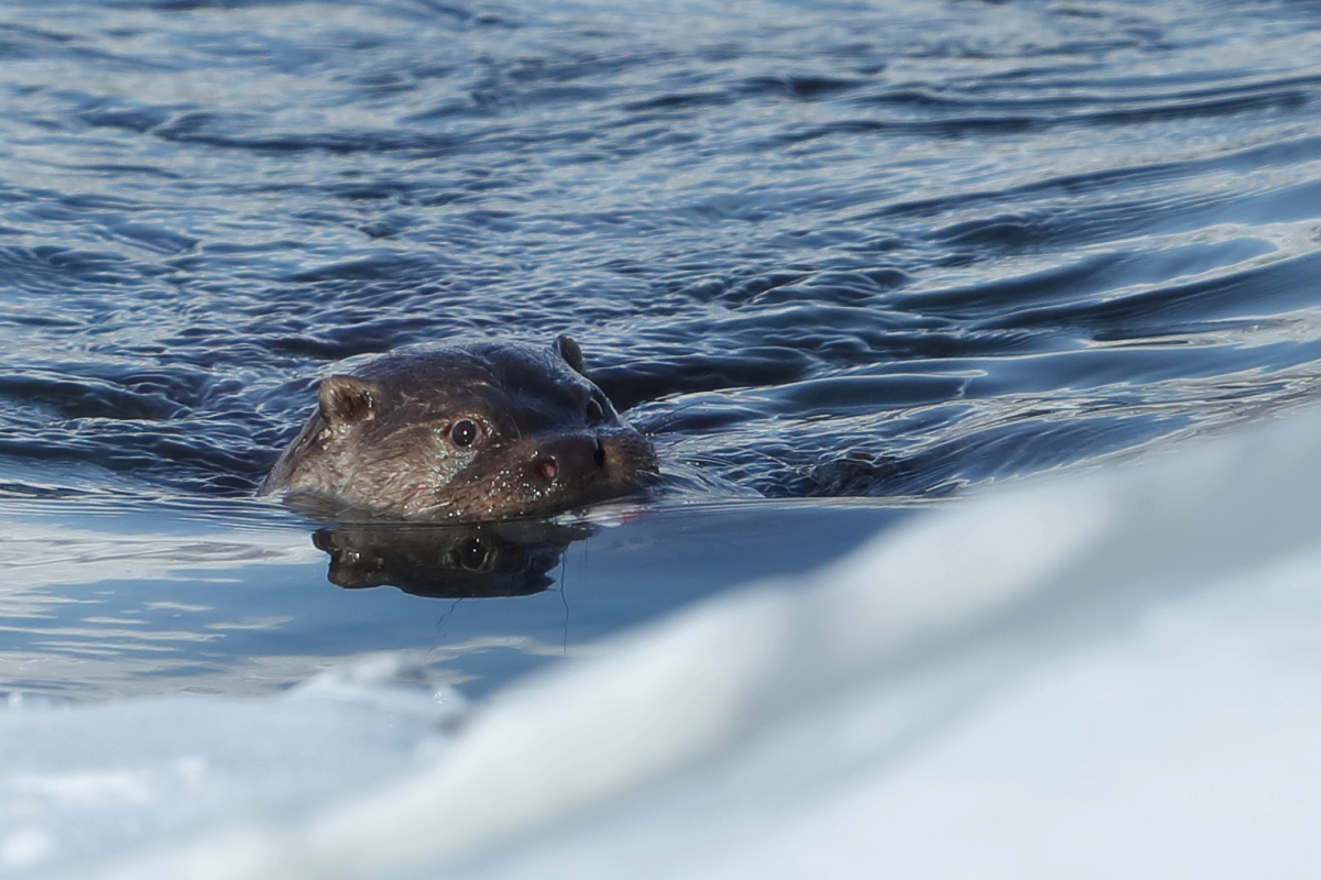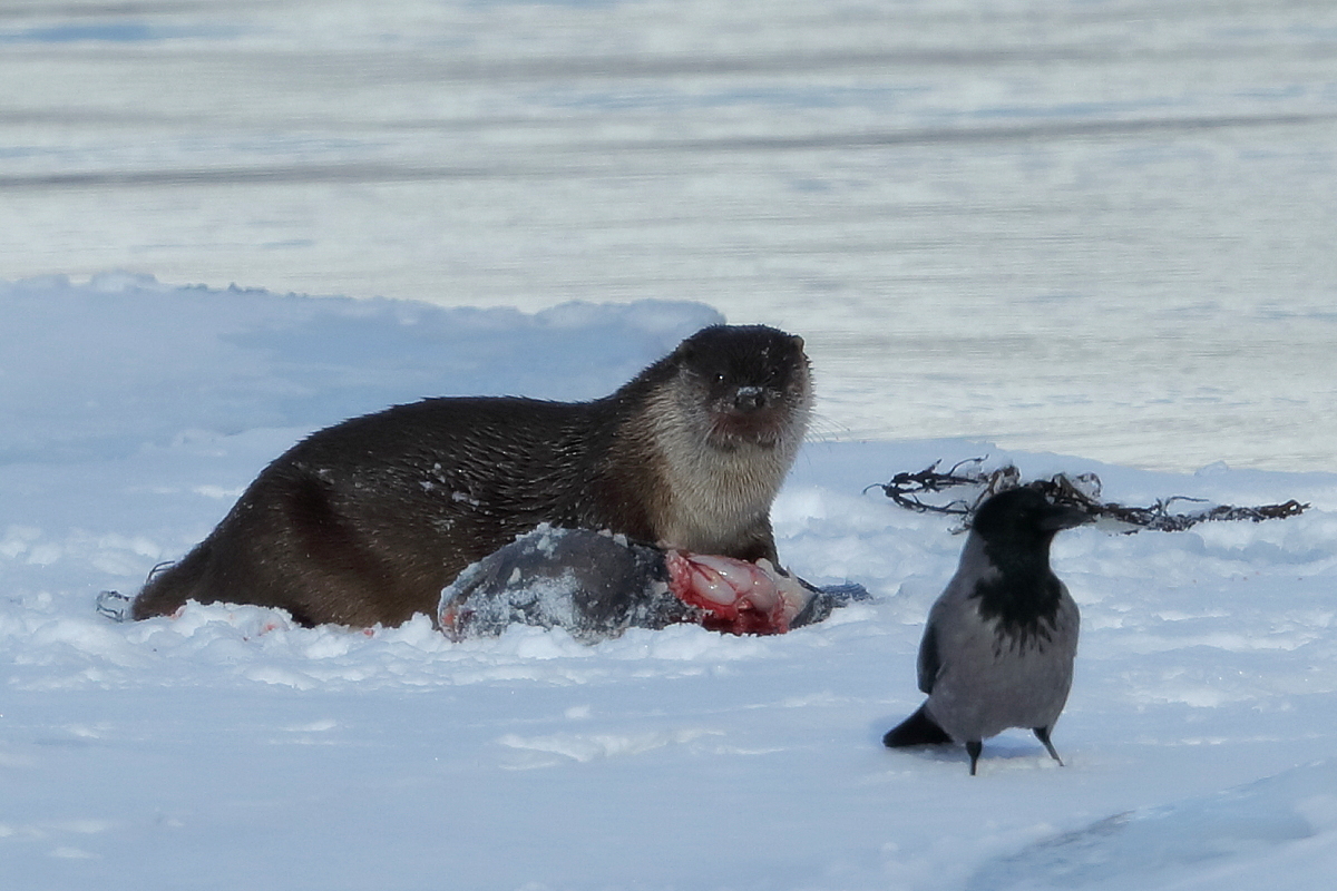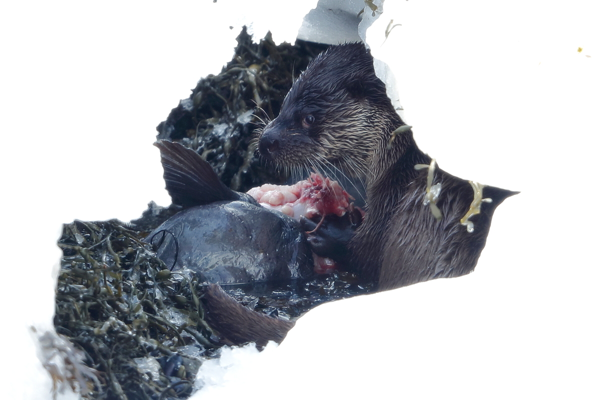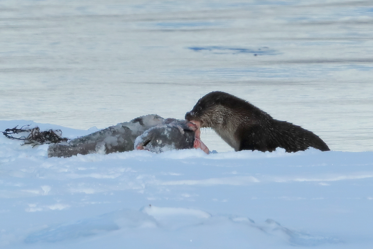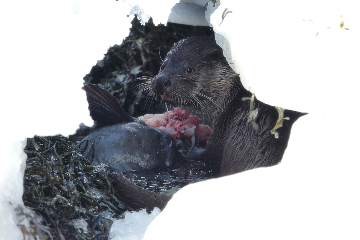 Było to moje pierwsze spotkanie z wydrą, dość niespodziewane i nieplanowane. Miało miejsce w drodze na lotnisko, po fotografowaniu zorzy polarnej. Ze względu na trudne warunki na drodze jechaliśmy dość wolno, na tyle, aby zobaczyć wydrę posilającą się na brzegu fiordu na lodzie. Udało się wykonać kilka zdjęć, choć wydra zaraz zabrała rybę i przeniosła swój posiłek pod lód. Na skutek odpływu pomiędzy lodem a brzegiem powstała zadaszona lodem nisza, do której wydra zaciągnęła swą zdobycz i kontynuowała posiłek. Powstało dość ciekawe ujęcie wydry otoczonej bielą lodu.