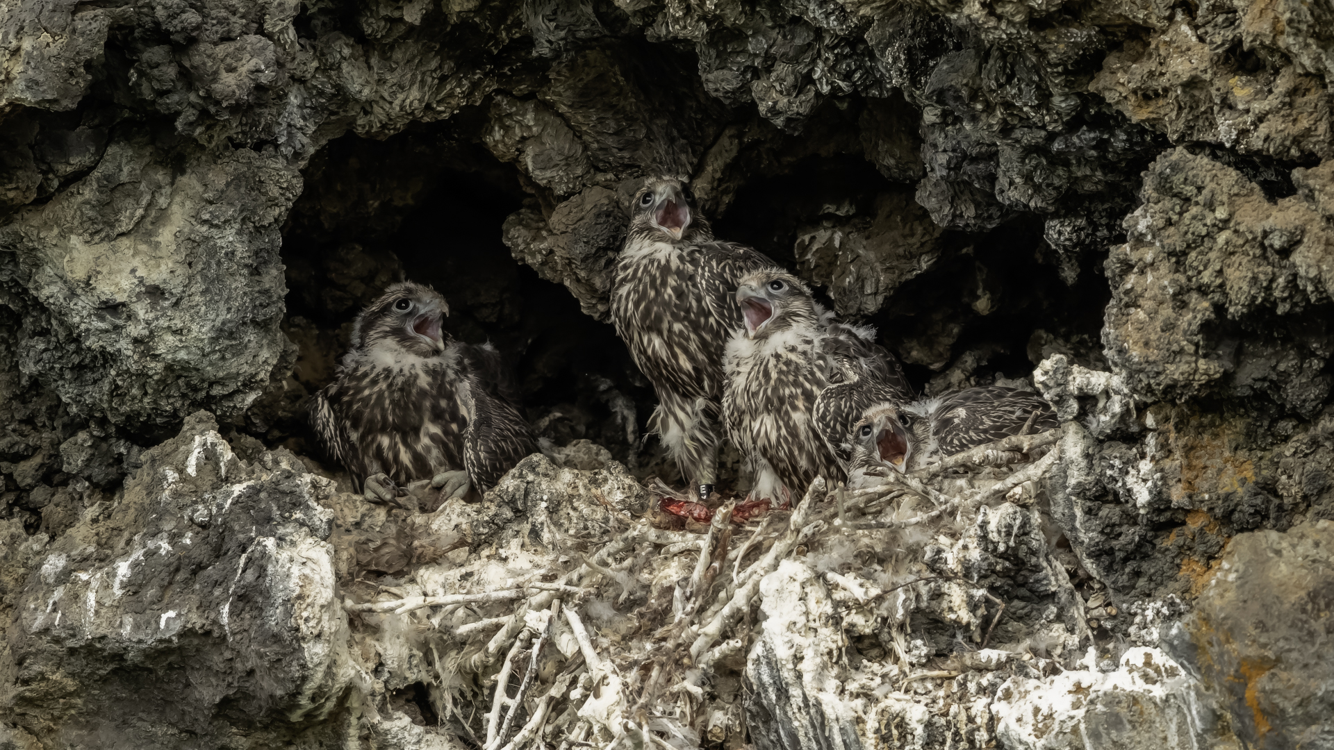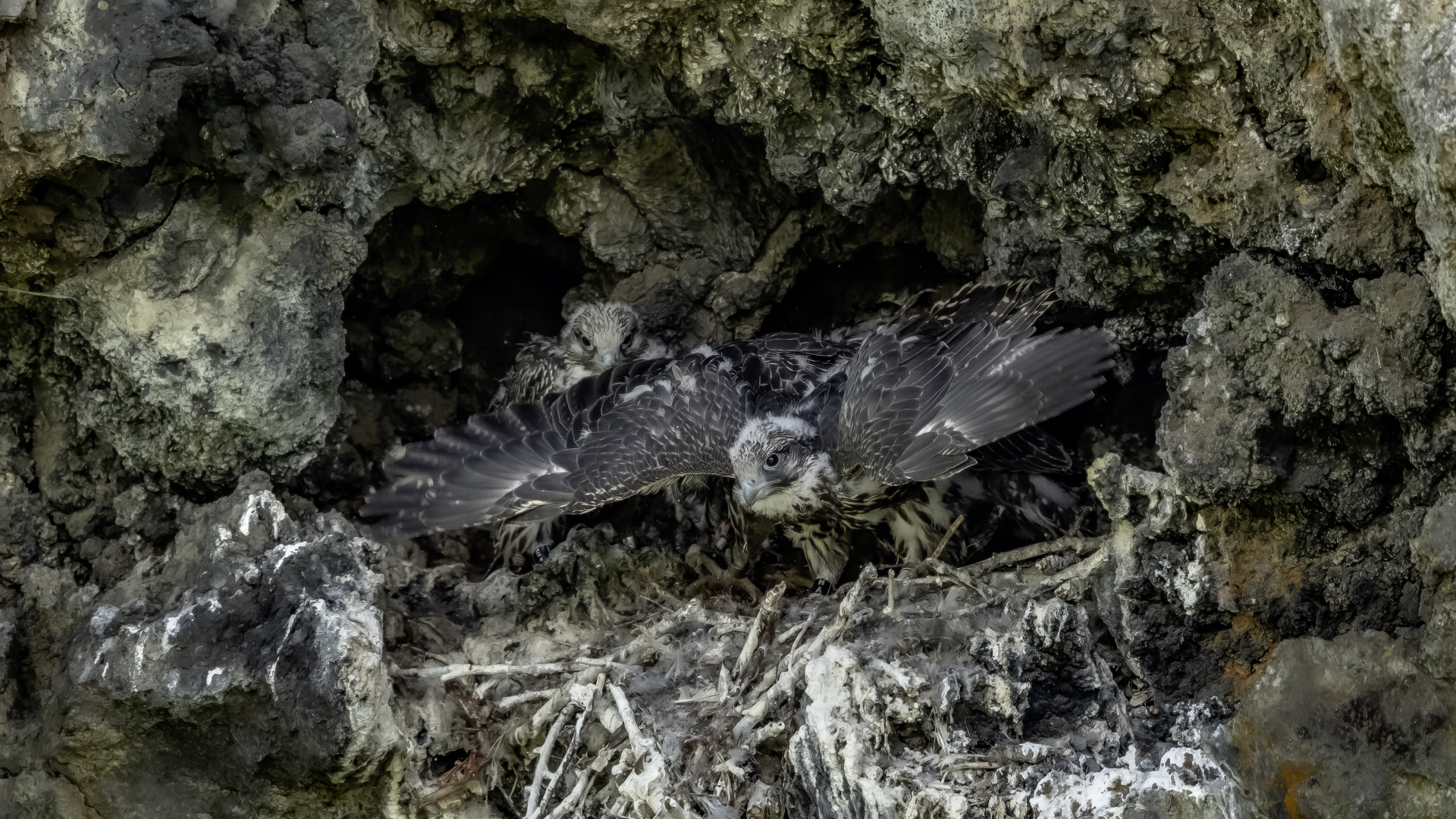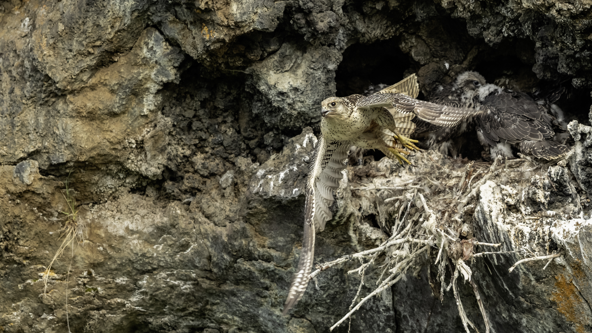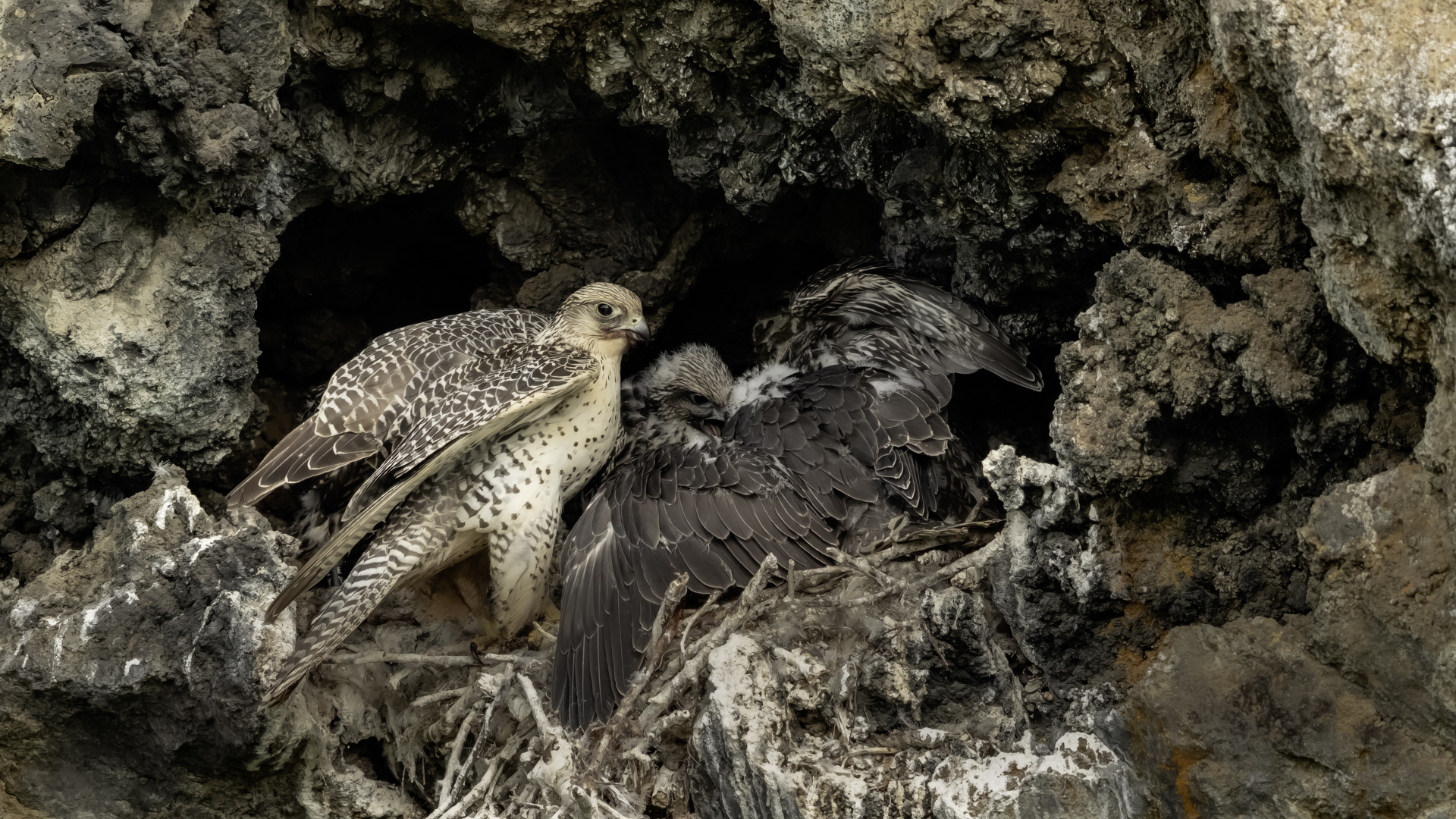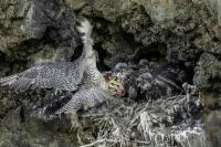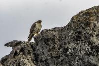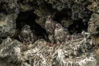 Mój pierwszy pobyt na Islandii cztery lata temu to istna fascynacja tym pięknym krajem, krajobrazami, wodospadami, bliskim kontaktem z przyrodą. I do tego Johann, który spokojnie, metodycznie odkrywał przede mną coraz to nowe ciekawe miejsca, gdzie można było fotografować ptaki. Jego wiedza o ptakach, nie tylko Islandii, jest wręcz przytłaczająca. Był to okres mojego “zaliczania” gatunków (to podejście z czasem zmieniło się w jakościowe). Wszystko to i fakt, że jedynie kilka dni mogłem poświęcić wówczas na wspólnie fotografowanie z Johannem, odbiło się niestety na jakości zdjęć. Moje podejście do fotografowania ewoluuje cały czas, a takie nastawienie na ilość w fotografowaniu to już przeszłość i teraz najważniejsza jest jakość, i to wybranych, interesujących mnie gatunków. I tak wreszcie po czterech latach nadszedł ten czas, aby znów się spotkać z Johannem i wspólnie fotografować. Tym razem scenariusz tego fotografowania był już starannie opracowany, a to z powodu naszych ambitnych planów sfotografowania białozora - największego sokoła świata. Jest kilka trudności do pokonania na Islandii, aby doprowadzić do spotkania z tym ptakiem i oczywiście - zrobić zdjęcia. Aby sfotografować sokoła, trzeba ulokować się przy gnieździe. Białozory są na Islandii pod ścisłą ochroną, a na świecie ten gatunek uznawany jest za zagrożony wyginięciem. Na takie fotografowanie białozora na Islandii trzeba uzyskać oficjalną zgodę, podobnie jak w Polsce w przypadku niektórych gatunków. Taką zgodę otrzymałem na 3 tygodnie przed wylotem na Islandię. Ale sam dokument nie zawierał załącznika z informacją, gdzie można sfotografować ptaki. A znalezienie ich na ponad 100 tysiącach kilometrów kwadratowych Islandii do łatwych zadań nie należy. Samo fotografowanie było tak zaplanowane, aby w okolicach gniazd pojawić się pod koniec okresu karmienia piskląt, które lada dzień mogły opuścić gniazdo. W pełni upierzonym pisklętom, samodzielnie pobierającym pokarm nie powinna stać się wówczas żadna krzywda. Jedynie kontakt z dorosłymi osobnikami jest wówczas znacznie ograniczony, bo rodzice pojawiają się co jakiś czas ze świeżą zdobyczą, podrzucając ją do gniazda, po czym wracają do polowania. Były trzy spotkania z białozorami. Pierwsze – w publicznym miejscu – w punkcie widokowym na wzgórzu. Dookoła urwiska skalne i dość niesprzyjająca pogoda, bo siąpił deszcz. Lornetki w ręce i wypatrujemy, czy na półkach skalnych nie pojawi się on - białozór. Kilkadziesiąt minut lustrowania okolicy nie przynosi efektu, a że byliśmy coraz bardziej przemoczeni - zrezygnowaliśmy i wracamy do samochodu. W tym czasie na niebie pojawia się sylwetka ptaka, który leci w naszym kierunku. Przeleciał w odległości kilkunastu metrów nad naszymi głowami. Sprawdzane przez nas miejsce nie było przypadkowe. Kiedyś białozory miały gniazdo w niedalekiej odległości od punktu widokowego licznie odwiedzanego teraz przez turystów. Tych zaś jest coraz więcej na Islandii, bo rocznie liczba turystów przekracza już dwa miliony. Może z tych powodów ptaki przenoszą się w bardziej odludne miejsca. Ptak, który nagle się pojawił, zanurkował w wąwozie nieopodal i zniknął. Obeszliśmy urwisko skalne, aby sprawdzić, czy nie usiadł gdzieś poniżej. Chwila wypatrywania i jest! Przysiadł w zadaszonym zagłębieniu skalnym, od deszczu przemoczony czyści swoje upierzenie. Powstają pierwsze moje zdjęcia białozora. Radość i emocje nie do opisania. Nikt bowiem, mimo dopełnienia wszelkich formalności prawnych i dotarcia do miejsc prawdopodobnego występowania tych ptaków, gwarancji nie może dać, że dojdzie do spotkania z białozorem. Następnego dnia wyprawa do gniazda białozora. Ponad półtora kilometra marszu ze sprzętem, namiotem maskującym i statywem, daje w kość, zwłaszcza że towarzyszyły nam tysiące muszek. Marsz po nierównym terenie z takim obciążeniem, to znaczny wysiłek. Ostatnie kilkaset metrów okazało się skrajnie wycieńczające. Białozory wykorzystały półkę skalną nad dużym potokiem. My podchodziliśmy jego drugim, urwistym brzegiem. Kolejna trudność, to ustawienie namiotu. Brak równej powierzchni sprawia, że ustawienie statywu i krzesła tak, aby nie zsunąć się w dół do potoku, a właściwie niewielkiej rzeki, i spędzenie w takich warunkach kilku godzin w oczekiwaniu na przylot dorosłego osobnika, to duże wyzwanie. Sprawdzamy w gnieździe – są cztery podrośnięte młode, które gdzieniegdzie mają jeszcze pióra puchowe. Niesamowity widok – kawałek dzikiej Islandii. Siadamy i czekamy. Już wiadomo, że nie będzie dynamicznych zdjęć białozorów. Namiot mocno zawęża pole widzenia i trzeba mieć niebywałe szczęście, aby zobaczyć nadlatującego ptaka. Tu z pomocą przyszły nam młode białozory. Normalnie siedziały spokojnie w gnieździe pożywiając się od czasu do czasu. Jedzenia miały pod dostatkiem, bo nie rywalizowały o nie. Po krótkim posiłku obowiązkowa drzemka. Gdy zamykają oczy, pojawiają się ich białe powieki i wyglądają, jakby zamiast oczu miały bielma. Po drzemce znów mały posiłek, ale też próby swych w pełni upierzonych skrzydeł, no i wypatrywanie na niebie sylwetek rodziców. Pojawienie się rodzica sygnalizuje charakterystyczny pisk młodych, niestety zagłuszony odgłosem rwącego potoku. Powstaje nagranie tego dźwięku. Mimo że nie widzieliśmy szybujących dorosłych ptaków, wiedzieliśmy, gdzie są. Cztery młode synchronicznie podążały za nim wzrokiem, a gdy zauważyły, że zbliża się i będzie lądować, intensywność ich głosu przybierała na sile. Wówczas pełna koncentracja, bo tylko w tych kilku sekundach można zrobić ciekawe ujęcia. Dorosły osobnik wrzucał nadjedzone resztki zdobyczy i odlatywał. Z relacji osób zajmujących się białozorami wynika, że rok 2018 jes