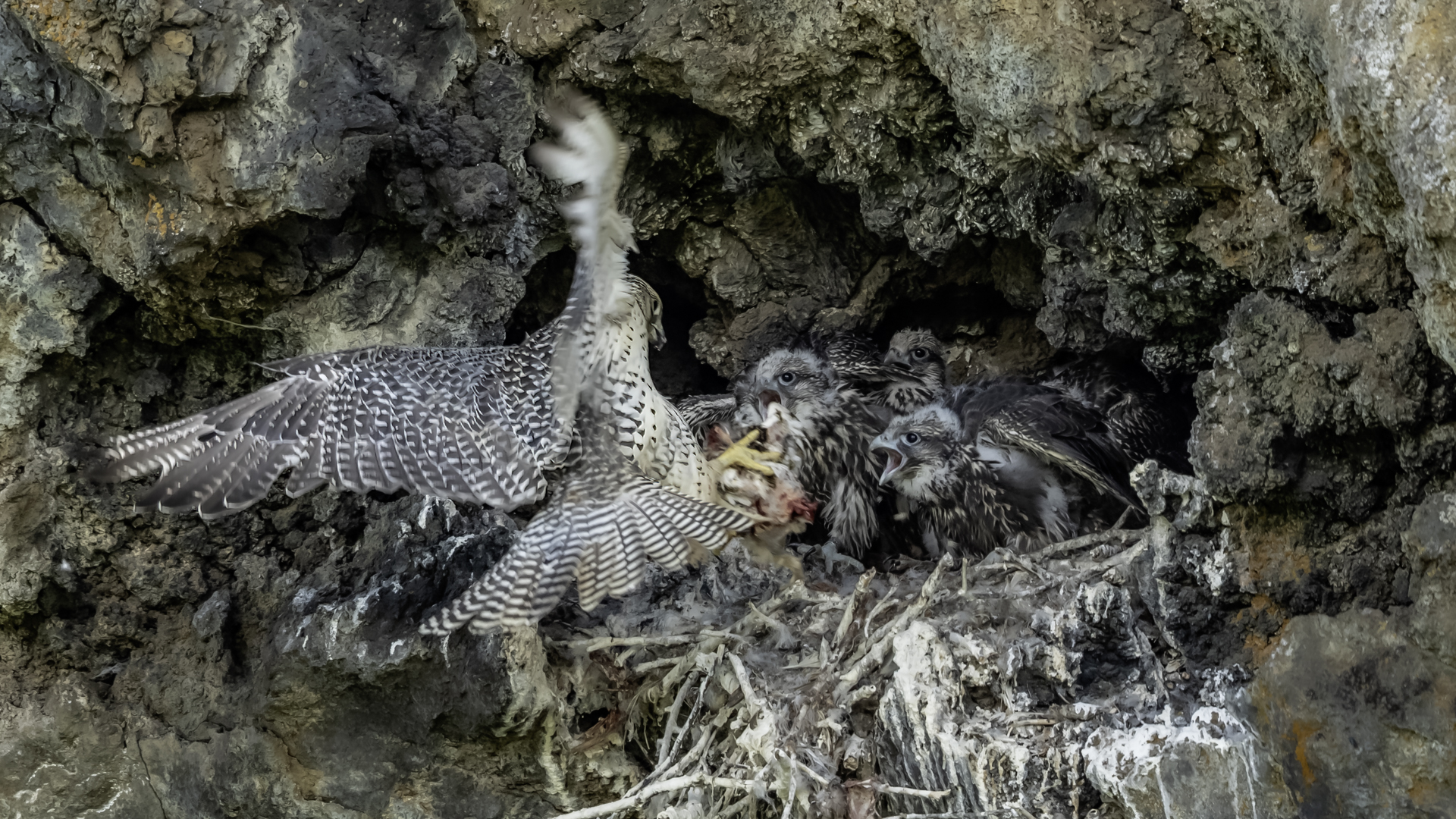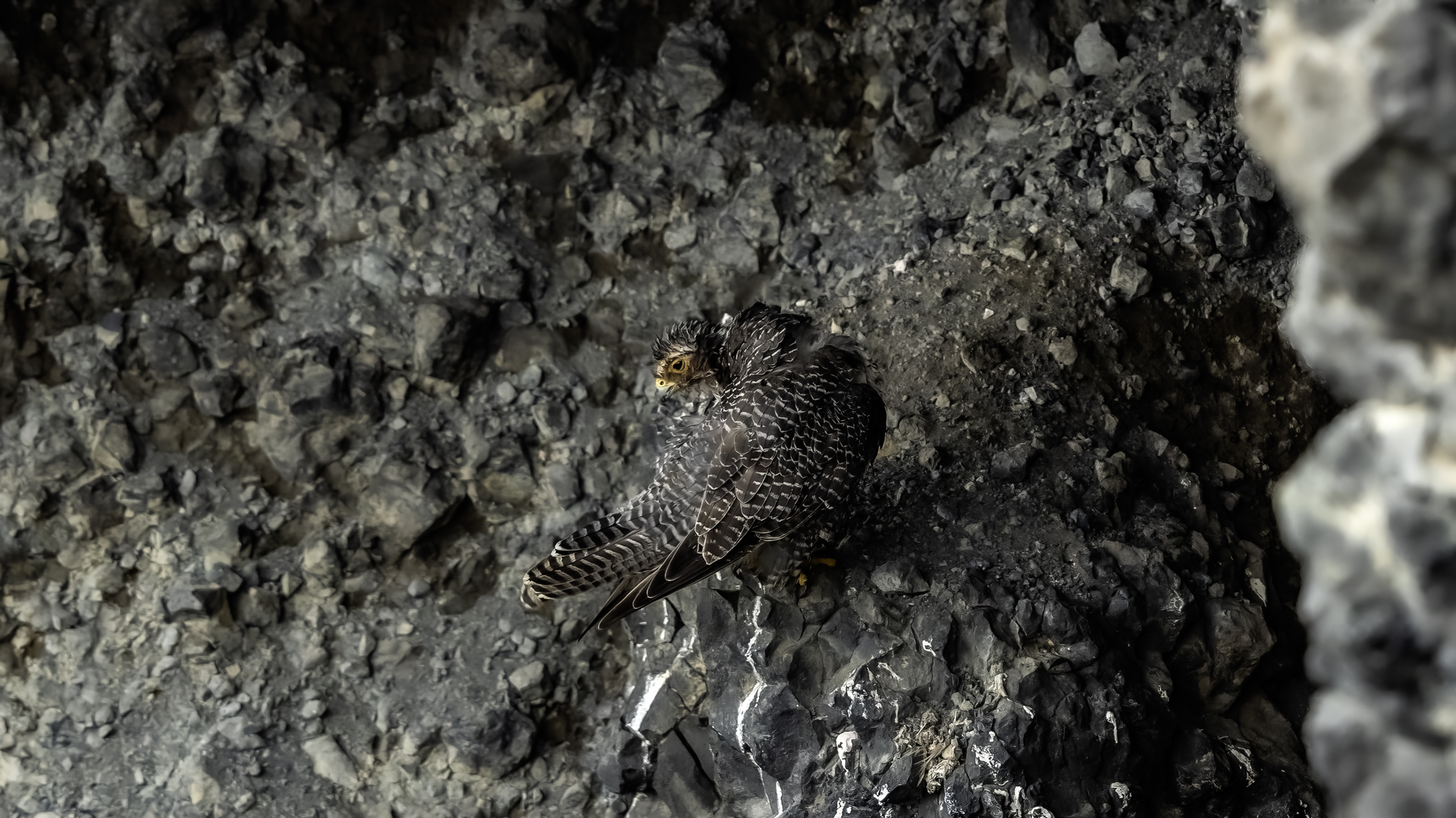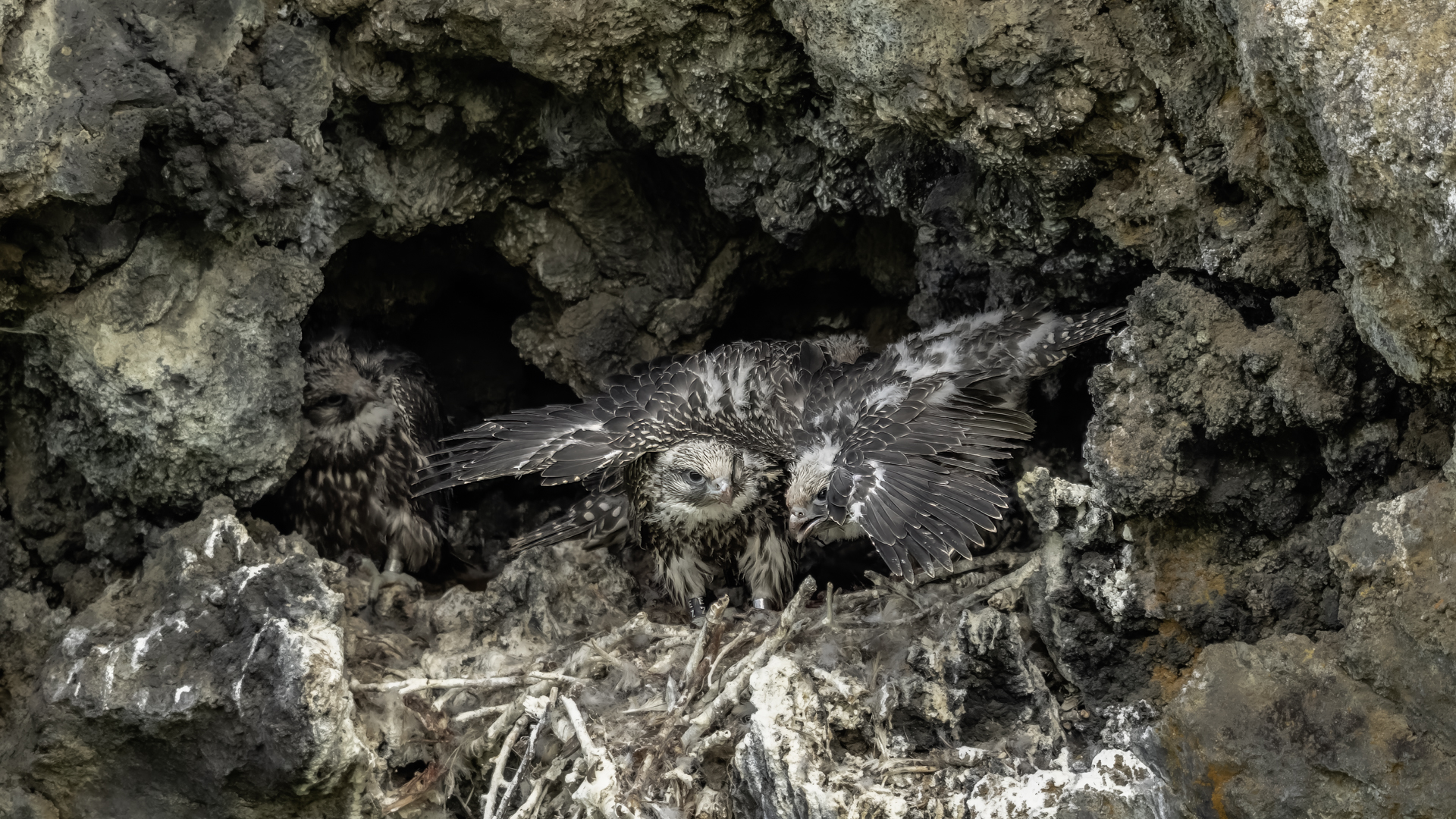 Mój pierwszy pobyt na Islandii cztery lata temu to istna fascynacja tym pięknym krajem, krajobrazami, wodospadami, bliskim kontaktem z przyrodą. I do tego Johann, który spokojnie, metodycznie odkrywał przede mną coraz to nowe ciekawe miejsca, gdzie można było fotografować ptaki. Jego wiedza o ptakach, nie tylko Islandii, jest wręcz przytłaczająca. Był to okres mojego “zaliczania” gatunków (to podejście z czasem zmieniło się w jakościowe). Wszystko to i fakt, że jedynie kilka dni mogłem poświęcić wówczas na wspólnie fotografowanie z Johannem, odbiło się niestety na jakości zdjęć. Moje podejście do fotografowania ewoluuje cały czas, a takie nastawienie na ilość w fotografowaniu to już przeszłość i teraz najważniejsza jest jakość, i to wybranych, interesujących mnie gatunków. I tak wreszcie po czterech latach nadszedł ten czas, aby znów się spotkać z Johannem i wspólnie fotografować. Tym razem scenariusz tego fotografowania był już starannie opracowany, a to z powodu naszych ambitnych planów sfotografowania białozora - największego sokoła świata. Jest kilka trudności do pokonania na Islandii, aby doprowadzić do spotkania z tym ptakiem i oczywiście - zrobić zdjęcia. Aby sfotografować sokoła, trzeba ulokować się przy gnieździe. Białozory są na Islandii pod ścisłą ochroną, a na świecie ten gatunek uznawany jest za zagrożony wyginięciem. Na takie fotografowanie białozora na Islandii trzeba uzyskać oficjalną zgodę, podobnie jak w Polsce w przypadku niektórych gatunków. Taką zgodę otrzymałem na 3 tygodnie przed wylotem na Islandię. Ale sam dokument nie zawierał załącznika z informacją, gdzie można sfotografować ptaki. A znalezienie ich na ponad 100 tysiącach kilometrów kwadratowych Islandii do łatwych zadań nie należy. Samo fotografowanie było tak zaplanowane, aby w okolicach gniazd pojawić się pod koniec okresu karmienia piskląt, które lada dzień mogły opuścić gniazdo. W pełni upierzonym pisklętom, samodzielnie pobierającym pokarm nie powinna stać się wówczas żadna krzywda. Jedynie kontakt z dorosłymi osobnikami jest wówczas znacznie ograniczony, bo rodzice pojawiają się co jakiś czas ze świeżą zdobyczą, podrzucając ją do gniazda, po czym wracają do polowania. Były trzy spotkania z białozorami. Pierwsze – w publicznym miejscu – w punkcie widokowym na wzgórzu. Dookoła urwiska skalne i dość niesprzyjająca pogoda, bo siąpił deszcz. Lornetki w ręce i wypatrujemy, czy na półkach skalnych nie pojawi się on - białozór. Kilkadziesiąt minut lustrowania okolicy nie przynosi efektu, a że byliśmy coraz bardziej przemoczeni - zrezygnowaliśmy i wracamy do samochodu. W tym czasie na niebie pojawia się sylwetka ptaka, który leci w naszym kierunku. Przeleciał w odległości kilkunastu metrów nad naszymi głowami. Sprawdzane przez nas miejsce nie było przypadkowe. Kiedyś białozory miały gniazdo w niedalekiej odległości od punktu widokowego licznie odwiedzanego teraz przez turystów. Tych zaś jest coraz więcej na Islandii, bo rocznie liczba turystów przekracza już dwa miliony. Może z tych powodów ptaki przenoszą się w bardziej odludne miejsca. Ptak, który nagle się pojawił, zanurkował w wąwozie nieopodal i zniknął. Obeszliśmy urwisko skalne, aby sprawdzić, czy nie usiadł gdzieś poniżej. Chwila wypatrywania i jest! Przysiadł w zadaszonym zagłębieniu skalnym, od deszczu przemoczony czyści swoje upierzenie. Powstają pierwsze moje zdjęcia białozora. Radość i emocje nie do opisania. Nikt bowiem, mimo dopełnienia wszelkich formalności prawnych i dotarcia do miejsc prawdopodobnego występowania tych ptaków, gwarancji nie może dać, że dojdzie do spotkania z białozorem. Następnego dnia wyprawa do gniazda białozora. Ponad półtora kilometra marszu ze sprzętem, namiotem maskującym i statywem, daje w kość, zwłaszcza że towarzyszyły nam tysiące muszek. Marsz po nierównym terenie z takim obciążeniem, to znaczny wysiłek. Ostatnie kilkaset metrów okazało się skrajnie wycieńczające. Białozory wykorzystały półkę skalną nad dużym potokiem. My podchodziliśmy jego drugim, urwistym brzegiem. Kolejna trudność, to ustawienie namiotu. Brak równej powierzchni sprawia, że ustawienie statywu i krzesła tak, aby nie zsunąć się w dół do potoku, a właściwie niewielkiej rzeki, i spędzenie w takich warunkach kilku godzin w oczekiwaniu na przylot dorosłego osobnika, to duże wyzwanie. Sprawdzamy w gnieździe – są cztery podrośnięte młode, które gdzieniegdzie mają jeszcze pióra puchowe. Niesamowity widok – kawałek dzikiej Islandii. Siadamy i czekamy. Już wiadomo, że nie będzie dynamicznych zdjęć białozorów. Namiot mocno zawęża pole widzenia i trzeba mieć niebywałe szczęście, aby zobaczyć nadlatującego ptaka. Tu z pomocą przyszły nam młode białozory. Normalnie siedziały spokojnie w gnieździe pożywiając się od czasu do czasu. Jedzenia miały pod dostatkiem, bo nie rywalizowały o nie. Po krótkim posiłku obowiązkowa drzemka. Gdy zamykają oczy, pojawiają się ich białe powieki i wyglądają, jakby zamiast oczu miały bielma. Po drzemce znów mały posiłek, ale też próby swych w pełni upierzonych skrzydeł, no i wypatrywanie na niebie sylwetek rodziców. Pojawienie się rodzica sygnalizuje charakterystyczny pisk młodych, niestety zagłuszony odgłosem rwącego potoku. Powstaje nagranie tego dźwięku. Mimo że nie widzieliśmy szybujących dorosłych ptaków, wiedzieliśmy, gdzie są. Cztery młode synchronicznie podążały za nim wzrokiem, a gdy zauważyły, że zbliża się i będzie lądować, intensywność ich głosu przybierała na sile. Wówczas pełna koncentracja, bo tylko w tych kilku sekundach można zrobić ciekawe ujęcia. Dorosły osobnik wrzucał nadjedzone resztki zdobyczy i odlatywał. Z relacji osób zajmujących się białozorami wynika, że rok 2018 jes