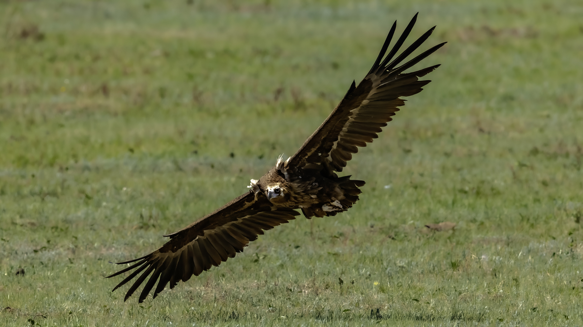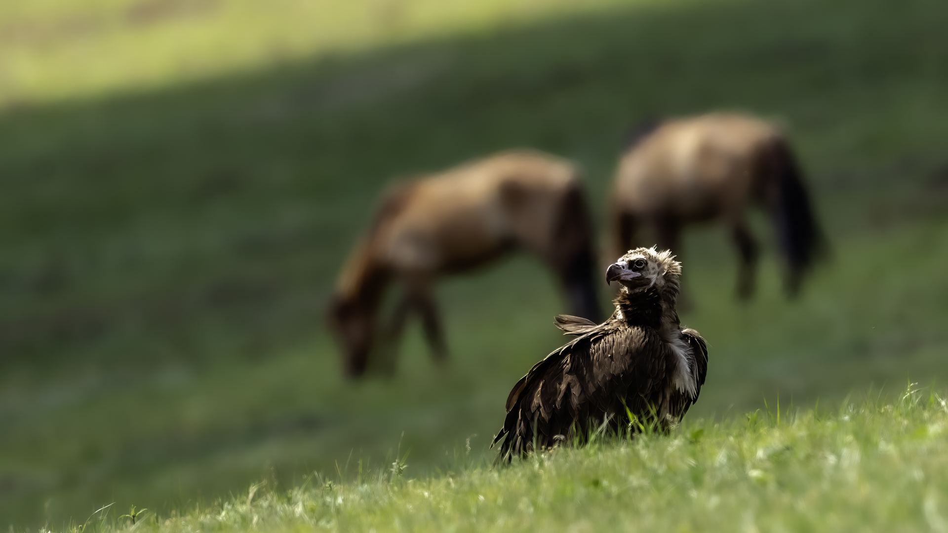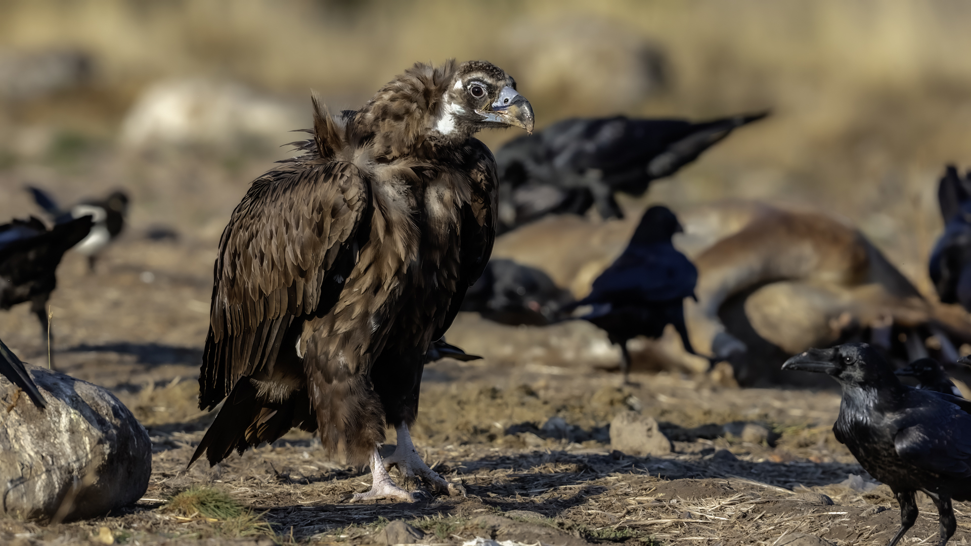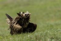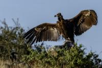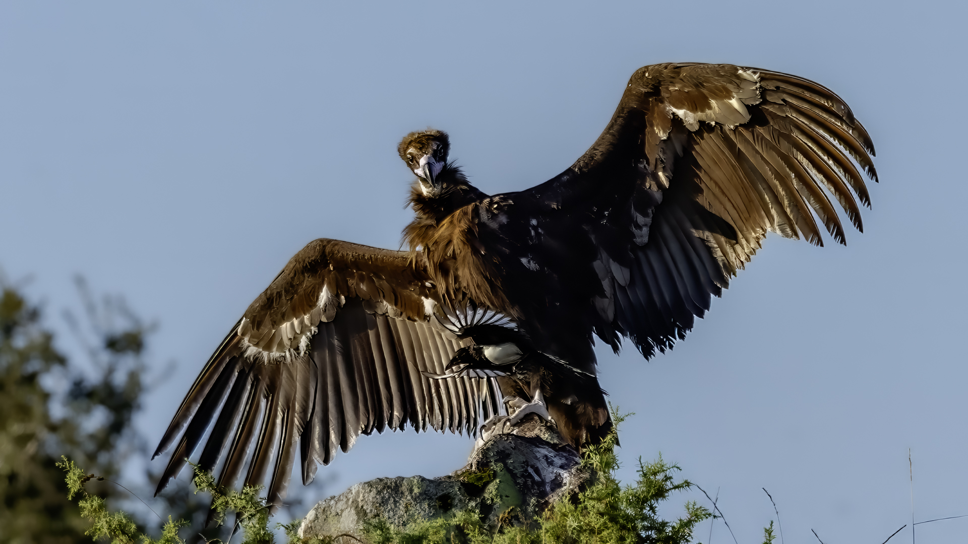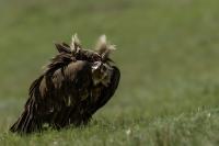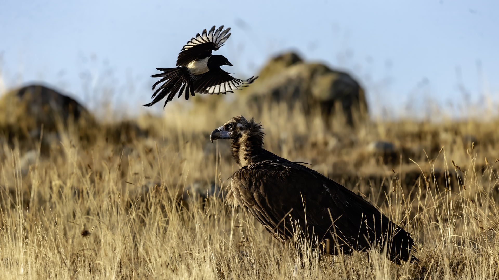 Niespełna 3 metry rozpiętości skrzydeł, waga może przekraczać 12 kilogramów. Potężny, piękny ptak. Sępy kasztanowate były bardzo bojaźliwe i siadały po lewej stronie czatowni, w znacznej odległości godzinami obserwując czatownię i okolicę. Każdego dnia były śmielsze i zmniejszały odległość , a tym samym powstawały coraz lepsze zdjęcia. Oczywiście, sępy, jak to sępy żerują na padlinie. Pozostawiona padlina początkowo była wykorzystywana też przez inne zwierzęta, ale na noc miała być chowana. Jej przeznaczenie to jednak nęcisko dla ptaków i tylko ptaków żerujących za dnia. Niestety organizator warsztatów, próbując wieczorem zabrać padlinę sprzed czatowni, musiał zmienić plany w tym zakresie, gdyż właśnie do kolacji zasiadły przy niej dwa niedźwiedzie, które nie zamierzały rezygnować ze swoich planów wobec pozostawionego mięsa. Sami tego nie widzieliśmy, ale rano następnego dnia świt ukazał, pozostałości po uczcie niedźwiedzi. Tak, więc nasze nęcisko, mocno uszczuplone, ale nadal spełniające swoją funkcję, bo sępy przyleciały. Na szczęście, sępy nabierające zaufania, kilka razy, podeszły tak blisko, że 600 mm obiektyw pokazywał już tylko samą sylwetkę ptaka, a podczas jego odlotu w kadr, nie mieściły się jego skrzydła. Tu powstawała duża trudność w fotografowaniu, bo raz ptak miał metr wysokości, raz 3 metry rozpiętości skrzydeł. Jeżeli siedział i obserwował z oddali, to brakowało ogniskowej, aby wykonać zdjęcia. Jeżeli przyleciał przed czatownię, warto mieć już obiektyw 300 milimetrowy. Nie radzę niczego zmieniać podczas fotografowania, bo może być to tożsame z zakończeniem fotografowania, przynajmniej w tym dniu. Wszystkie ptaki były bardzo bojaźliwe i ostrożne, a jakakolwiek zmiana, ruch powodował, że niebo było czarne od kruków i srok, a przerwa w fotografowaniu mogła trwać kilka godzin. Sępy wielokrotnie przelatywały nad czatownią zaabsorbowane obserwowaniem tego co działo się przy padlinie, z głową skierowaną w dół. Ich lot był na bardzo niskiej wysokości, tak że nie było problemów z wykonaniem zdjęć. Oczywiście niebieskie tło nieba to nie moja ulubiona kompozycja, ale zamieściłem też kilka takich zdjęć, dla ukazania piękna szybującego ptasiego giganta. Dodałem też kilka zdjęć sępa ze sroką, czy krukiem dla zbudowania skali porównawczej i oddania wielkości tego ptaka. Sroki i kruki zawsze były w okolicy tych ptaków, bez względu, czy siedziały na ziemi, czy szybowały w powietrzu. Niestety sępy kasztanowate należą do rzadkich gatunków i ich liczebność na świecie to około 1000 par.