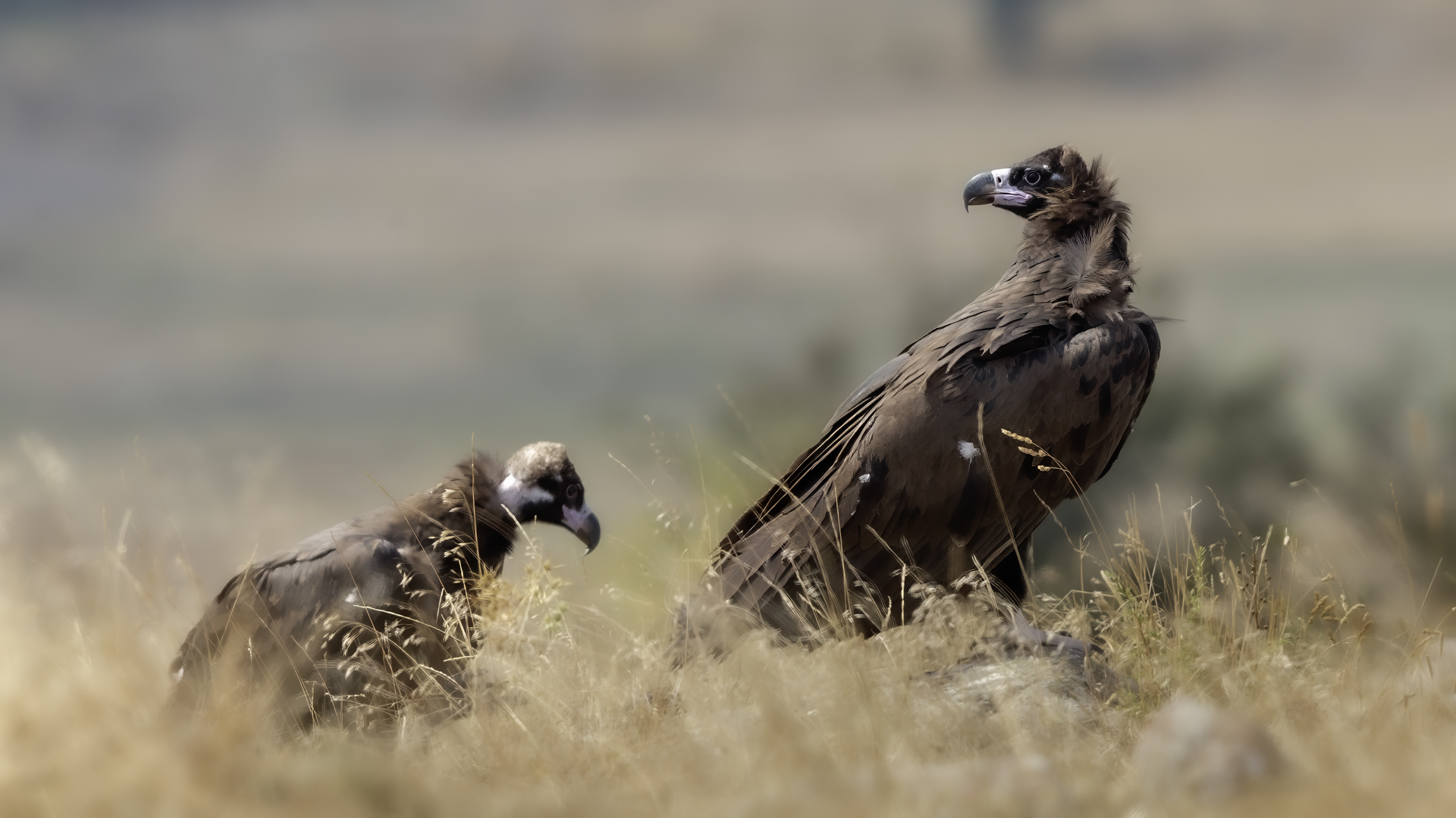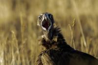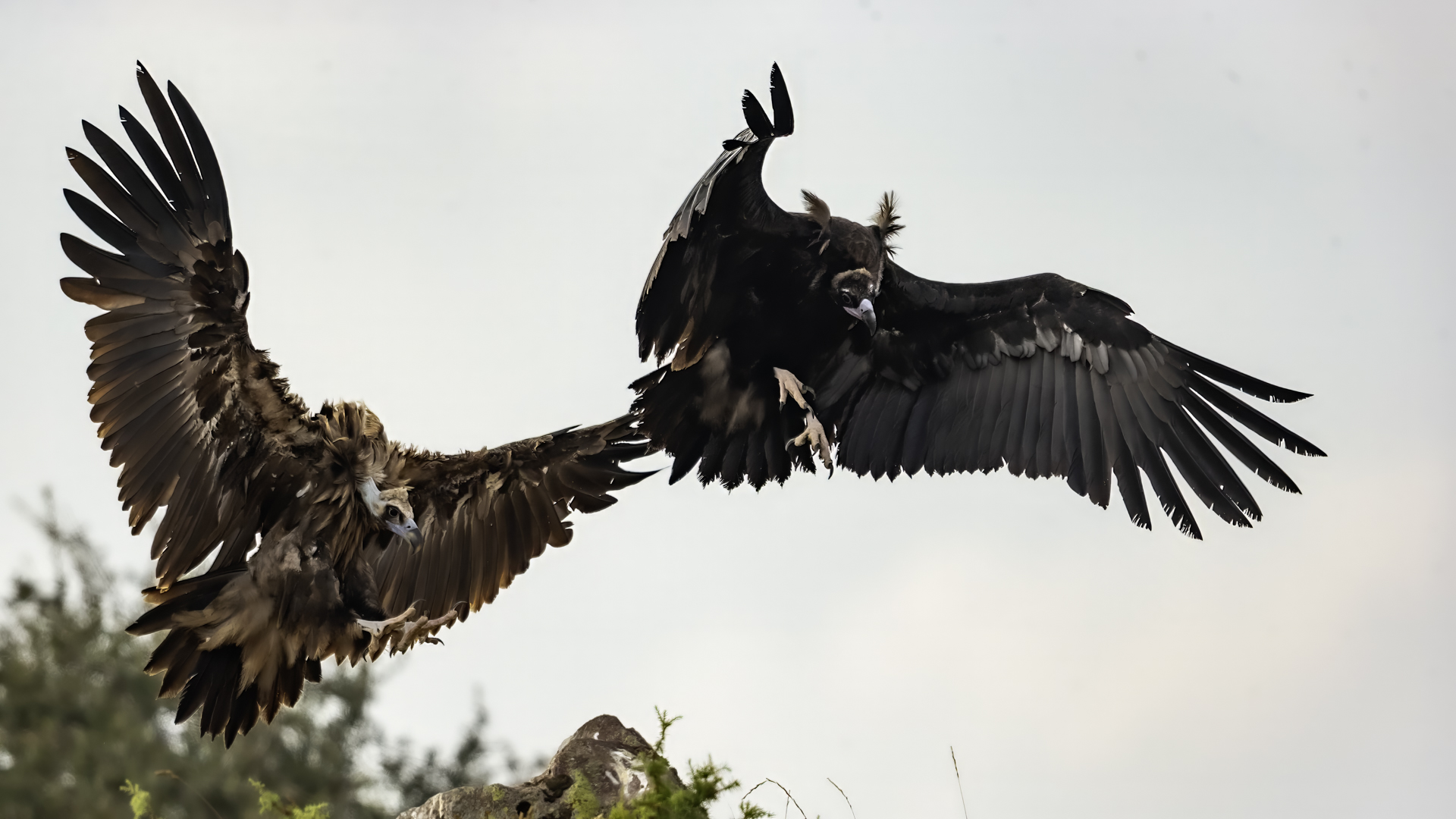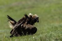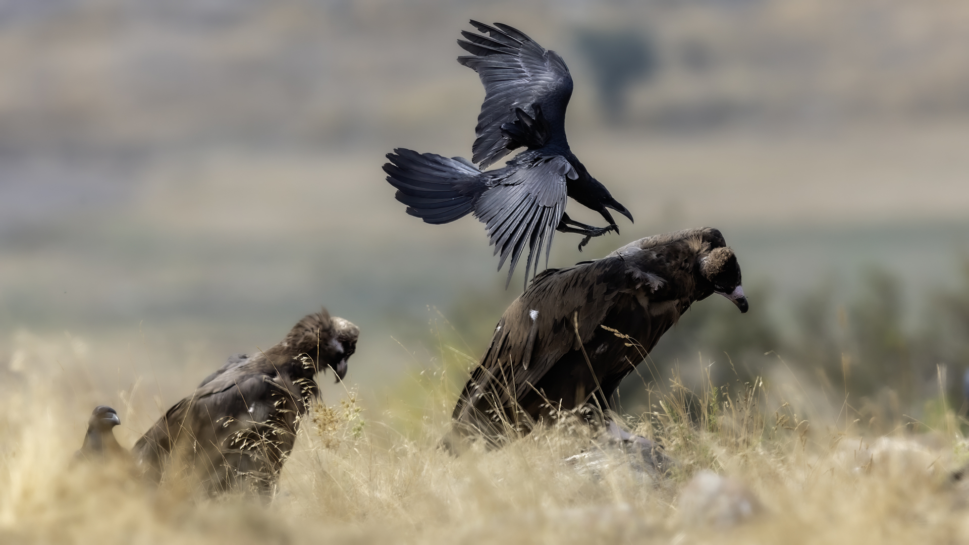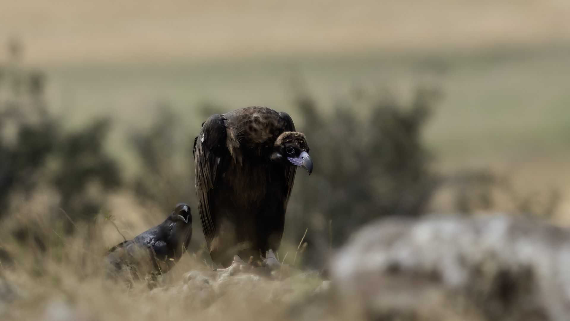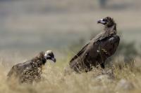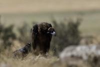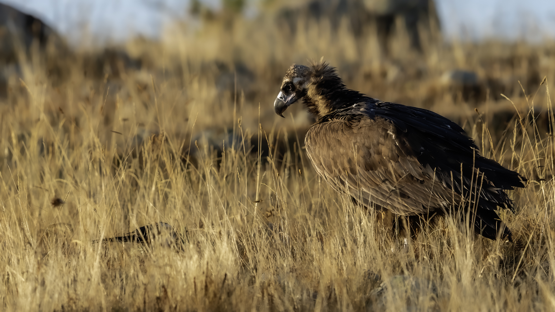 Niespełna 3 metry rozpiętości skrzydeł, waga może przekraczać 12 kilogramów. Potężny, piękny ptak. Sępy kasztanowate były bardzo bojaźliwe i siadały po lewej stronie czatowni, w znacznej odległości godzinami obserwując czatownię i okolicę. Każdego dnia były śmielsze i zmniejszały odległość , a tym samym powstawały coraz lepsze zdjęcia. Oczywiście, sępy, jak to sępy żerują na padlinie. Pozostawiona padlina początkowo była wykorzystywana też przez inne zwierzęta, ale na noc miała być chowana. Jej przeznaczenie to jednak nęcisko dla ptaków i tylko ptaków żerujących za dnia. Niestety organizator warsztatów, próbując wieczorem zabrać padlinę sprzed czatowni, musiał zmienić plany w tym zakresie, gdyż właśnie do kolacji zasiadły przy niej dwa niedźwiedzie, które nie zamierzały rezygnować ze swoich planów wobec pozostawionego mięsa. Sami tego nie widzieliśmy, ale rano następnego dnia świt ukazał, pozostałości po uczcie niedźwiedzi. Tak, więc nasze nęcisko, mocno uszczuplone, ale nadal spełniające swoją funkcję, bo sępy przyleciały. Na szczęście, sępy nabierające zaufania, kilka razy, podeszły tak blisko, że 600 mm obiektyw pokazywał już tylko samą sylwetkę ptaka, a podczas jego odlotu w kadr, nie mieściły się jego skrzydła. Tu powstawała duża trudność w fotografowaniu, bo raz ptak miał metr wysokości, raz 3 metry rozpiętości skrzydeł. Jeżeli siedział i obserwował z oddali, to brakowało ogniskowej, aby wykonać zdjęcia. Jeżeli przyleciał przed czatownię, warto mieć już obiektyw 300 milimetrowy. Nie radzę niczego zmieniać podczas fotografowania, bo może być to tożsame z zakończeniem fotografowania, przynajmniej w tym dniu. Wszystkie ptaki były bardzo bojaźliwe i ostrożne, a jakakolwiek zmiana, ruch powodował, że niebo było czarne od kruków i srok, a przerwa w fotografowaniu mogła trwać kilka godzin. Sępy wielokrotnie przelatywały nad czatownią zaabsorbowane obserwowaniem tego co działo się przy padlinie, z głową skierowaną w dół. Ich lot był na bardzo niskiej wysokości, tak że nie było problemów z wykonaniem zdjęć. Oczywiście niebieskie tło nieba to nie moja ulubiona kompozycja, ale zamieściłem też kilka takich zdjęć, dla ukazania piękna szybującego ptasiego giganta. Dodałem też kilka zdjęć sępa ze sroką, czy krukiem dla zbudowania skali porównawczej i oddania wielkości tego ptaka. Sroki i kruki zawsze były w okolicy tych ptaków, bez względu, czy siedziały na ziemi, czy szybowały w powietrzu. Niestety sępy kasztanowate należą do rzadkich gatunków i ich liczebność na świecie to około 1000 par.