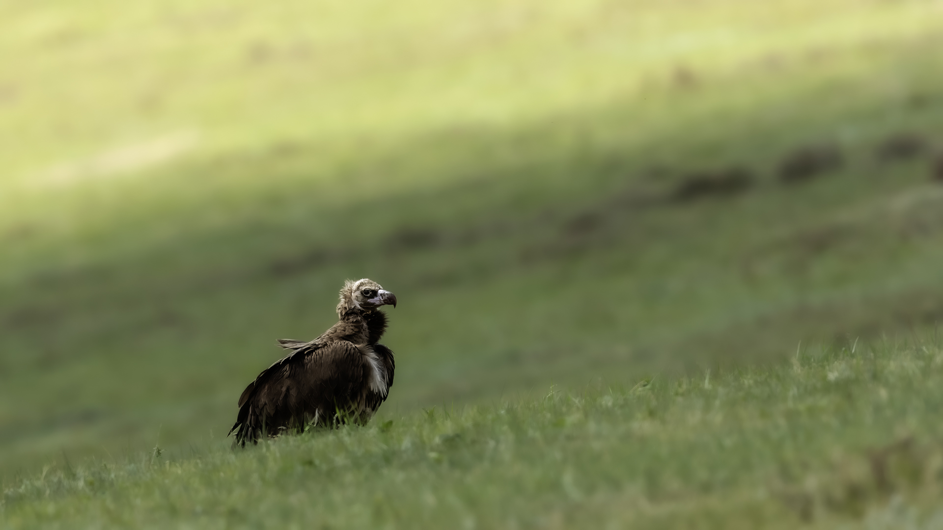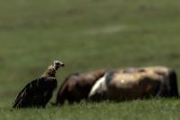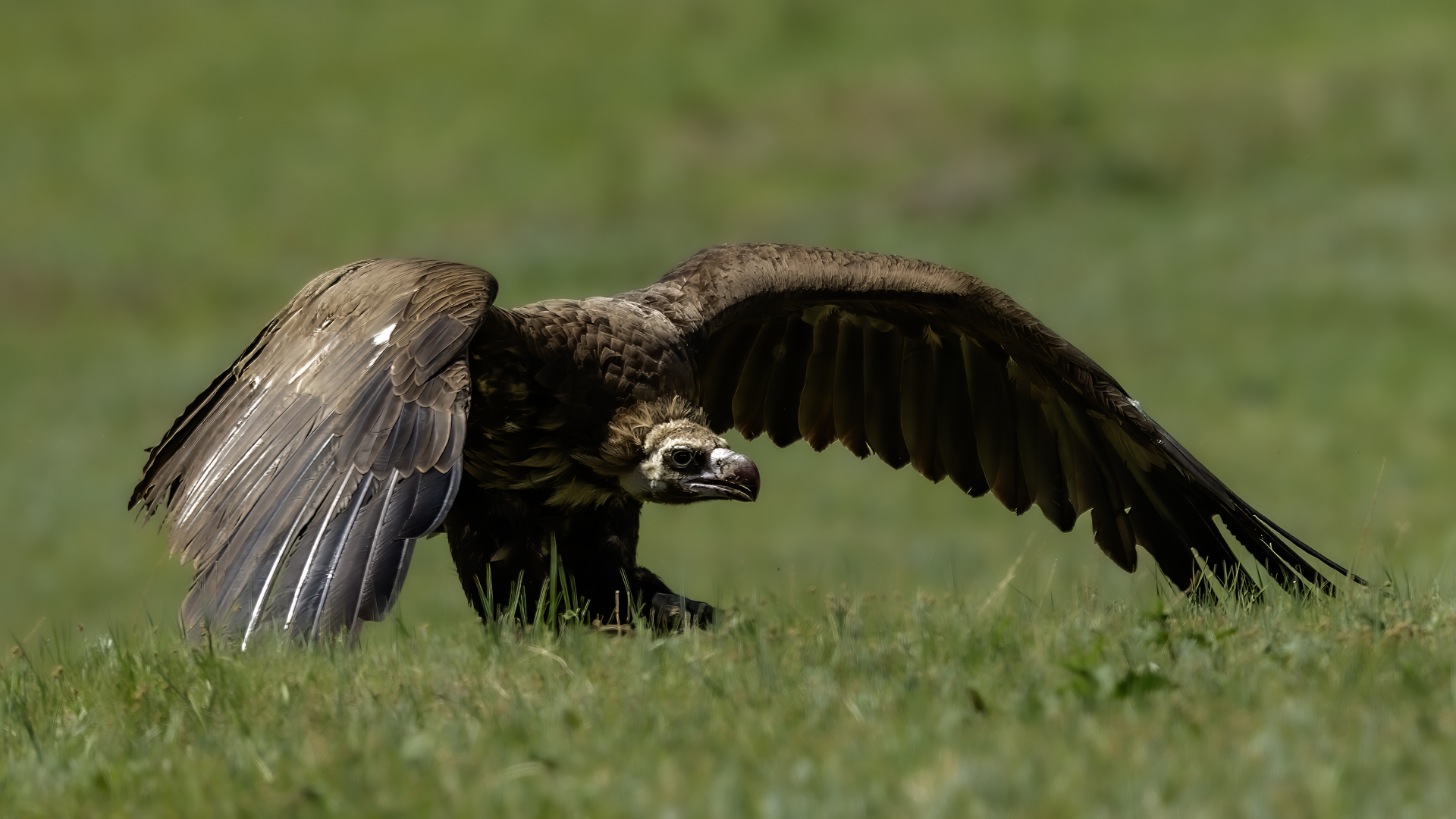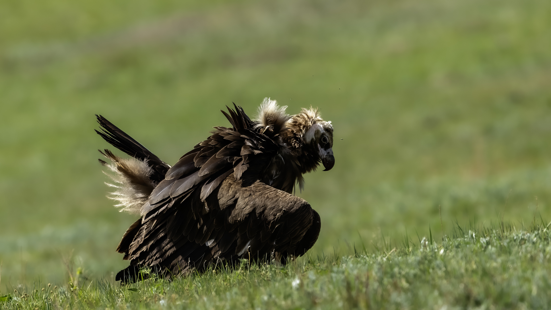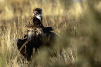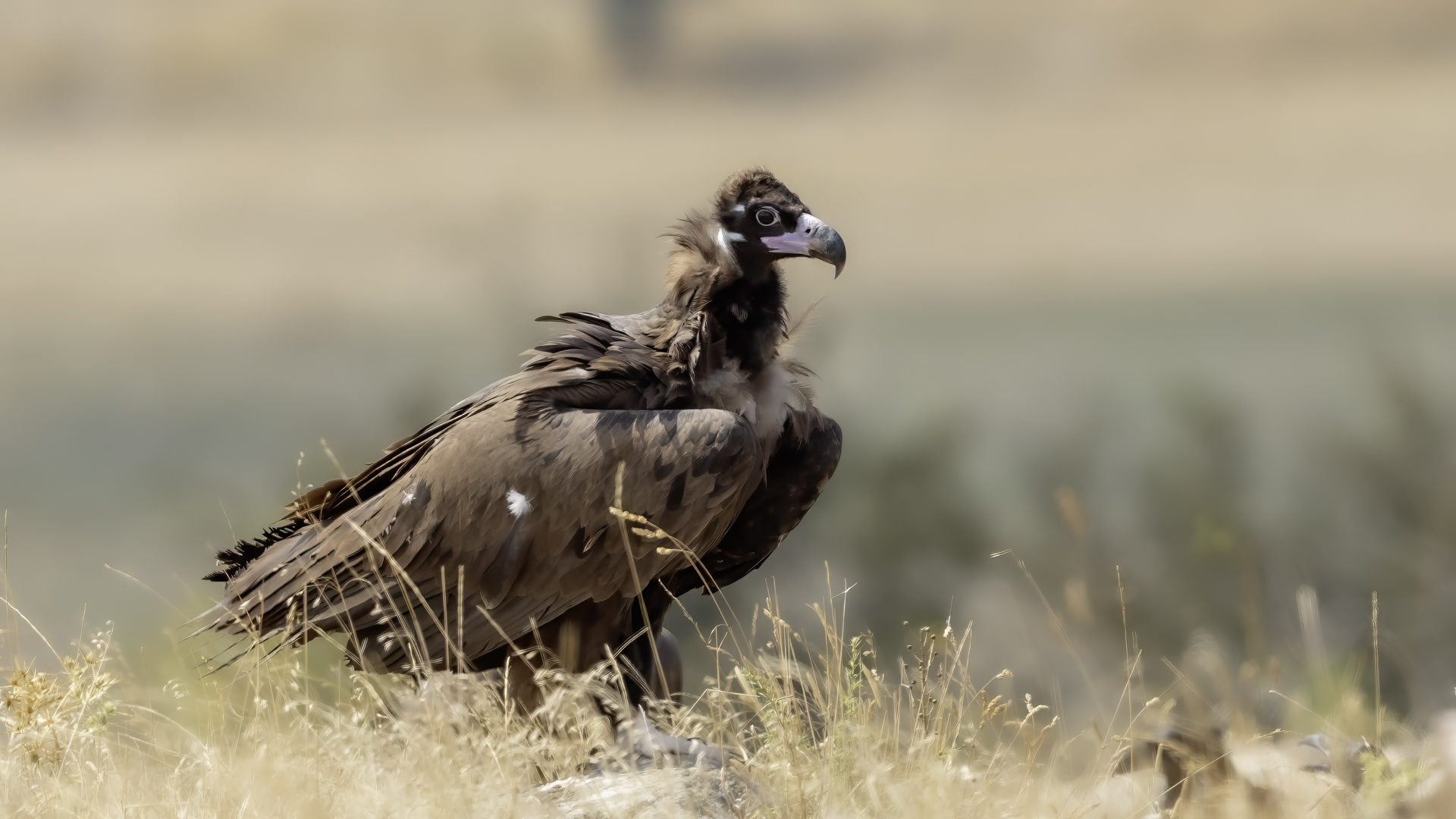 Niespełna 3 metry rozpiętości skrzydeł, waga może przekraczać 12 kilogramów. Potężny, piękny ptak. Sępy kasztanowate były bardzo bojaźliwe i siadały po lewej stronie czatowni, w znacznej odległości godzinami obserwując czatownię i okolicę. Każdego dnia były śmielsze i zmniejszały odległość , a tym samym powstawały coraz lepsze zdjęcia. Oczywiście, sępy, jak to sępy żerują na padlinie. Pozostawiona padlina początkowo była wykorzystywana też przez inne zwierzęta, ale na noc miała być chowana. Jej przeznaczenie to jednak nęcisko dla ptaków i tylko ptaków żerujących za dnia. Niestety organizator warsztatów, próbując wieczorem zabrać padlinę sprzed czatowni, musiał zmienić plany w tym zakresie, gdyż właśnie do kolacji zasiadły przy niej dwa niedźwiedzie, które nie zamierzały rezygnować ze swoich planów wobec pozostawionego mięsa. Sami tego nie widzieliśmy, ale rano następnego dnia świt ukazał, pozostałości po uczcie niedźwiedzi. Tak, więc nasze nęcisko, mocno uszczuplone, ale nadal spełniające swoją funkcję, bo sępy przyleciały. Na szczęście, sępy nabierające zaufania, kilka razy, podeszły tak blisko, że 600 mm obiektyw pokazywał już tylko samą sylwetkę ptaka, a podczas jego odlotu w kadr, nie mieściły się jego skrzydła. Tu powstawała duża trudność w fotografowaniu, bo raz ptak miał metr wysokości, raz 3 metry rozpiętości skrzydeł. Jeżeli siedział i obserwował z oddali, to brakowało ogniskowej, aby wykonać zdjęcia. Jeżeli przyleciał przed czatownię, warto mieć już obiektyw 300 milimetrowy. Nie radzę niczego zmieniać podczas fotografowania, bo może być to tożsame z zakończeniem fotografowania, przynajmniej w tym dniu. Wszystkie ptaki były bardzo bojaźliwe i ostrożne, a jakakolwiek zmiana, ruch powodował, że niebo było czarne od kruków i srok, a przerwa w fotografowaniu mogła trwać kilka godzin. Sępy wielokrotnie przelatywały nad czatownią zaabsorbowane obserwowaniem tego co działo się przy padlinie, z głową skierowaną w dół. Ich lot był na bardzo niskiej wysokości, tak że nie było problemów z wykonaniem zdjęć. Oczywiście niebieskie tło nieba to nie moja ulubiona kompozycja, ale zamieściłem też kilka takich zdjęć, dla ukazania piękna szybującego ptasiego giganta. Dodałem też kilka zdjęć sępa ze sroką, czy krukiem dla zbudowania skali porównawczej i oddania wielkości tego ptaka. Sroki i kruki zawsze były w okolicy tych ptaków, bez względu, czy siedziały na ziemi, czy szybowały w powietrzu. Niestety sępy kasztanowate należą do rzadkich gatunków i ich liczebność na świecie to około 1000 par.