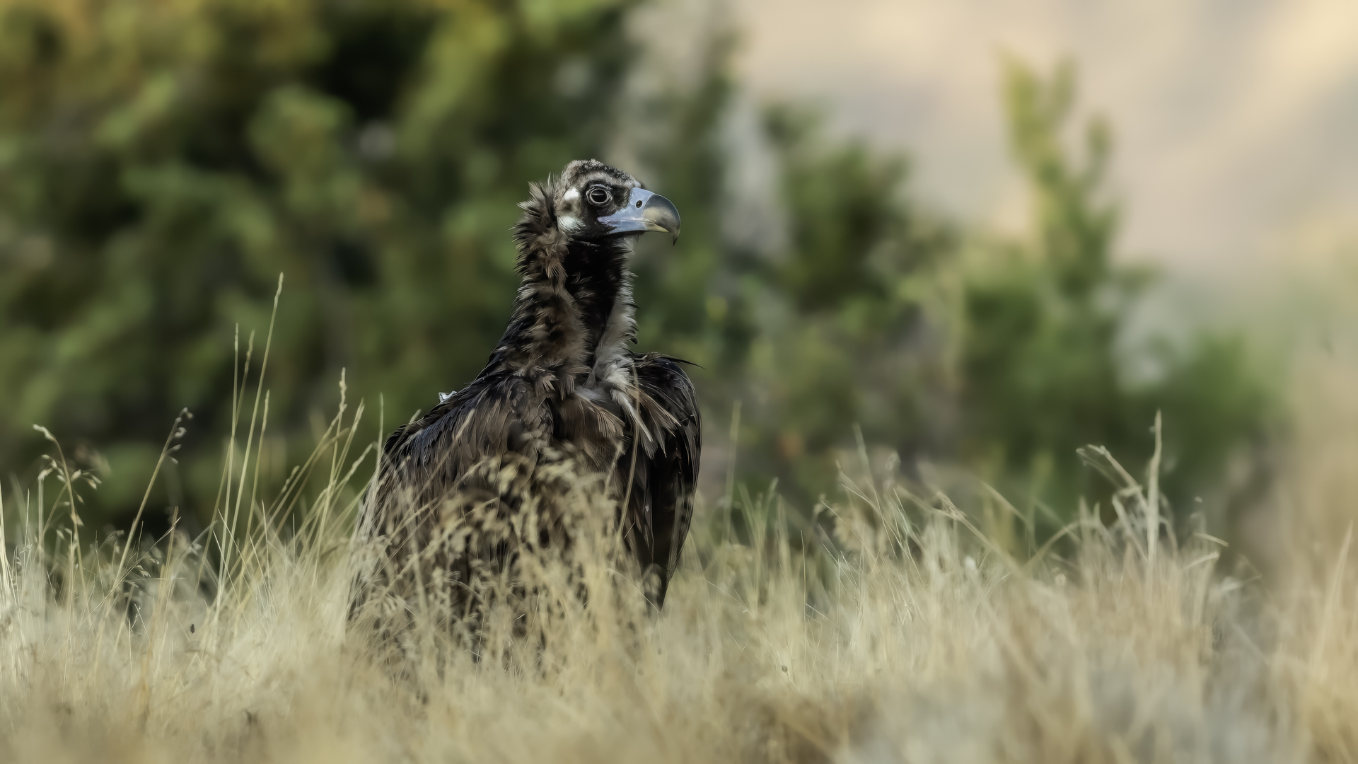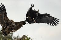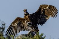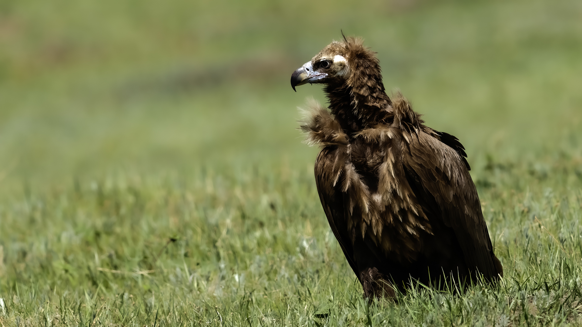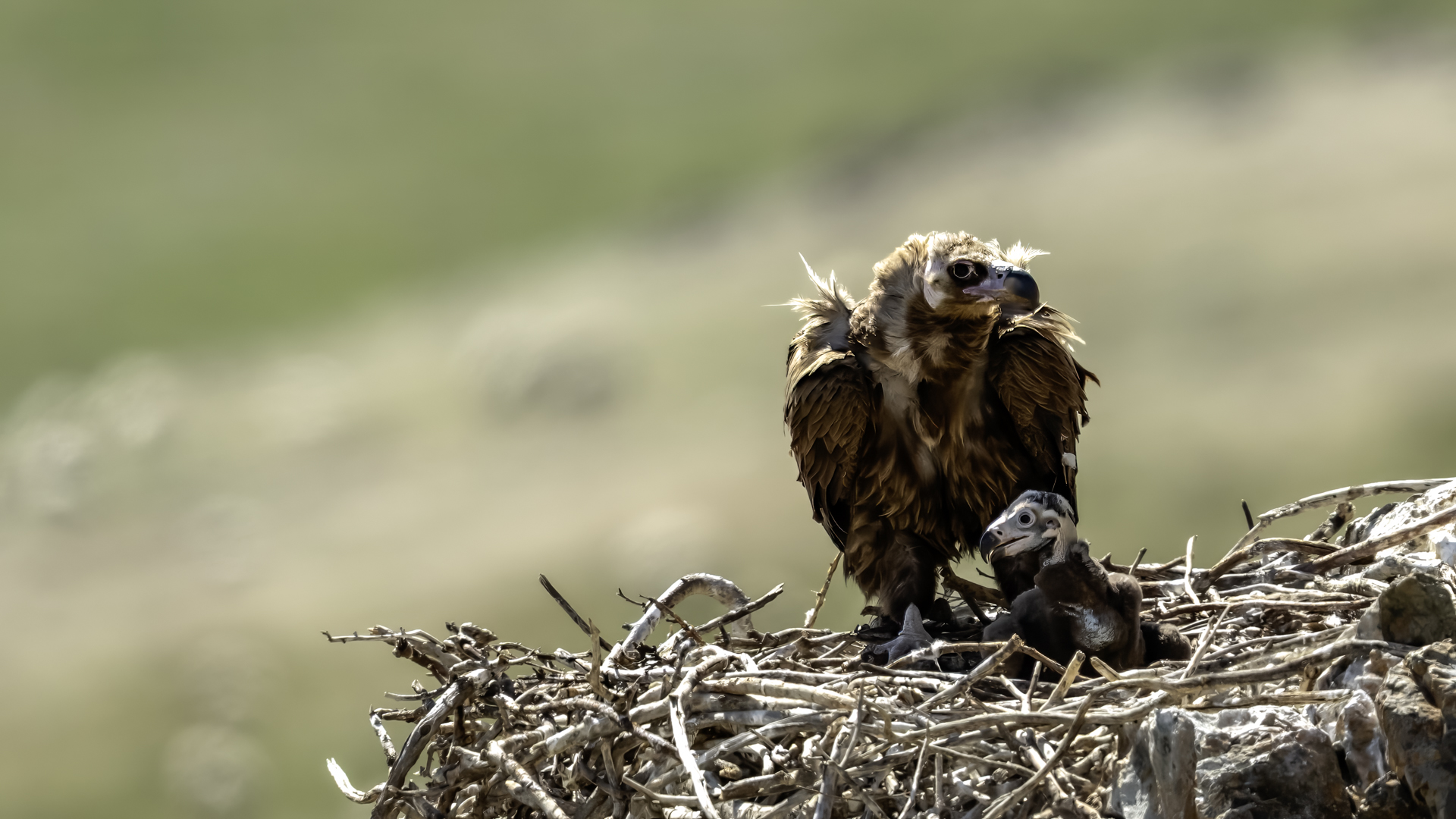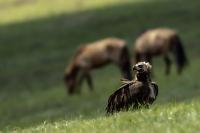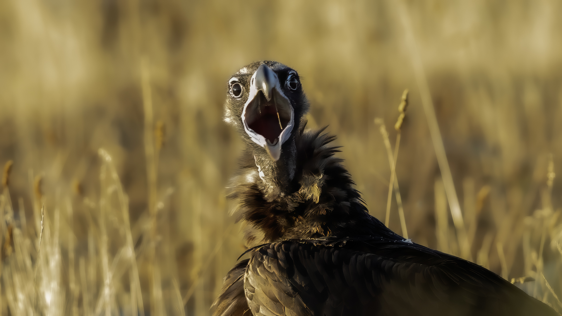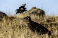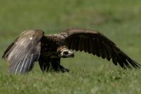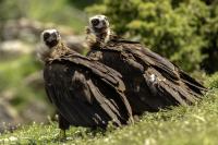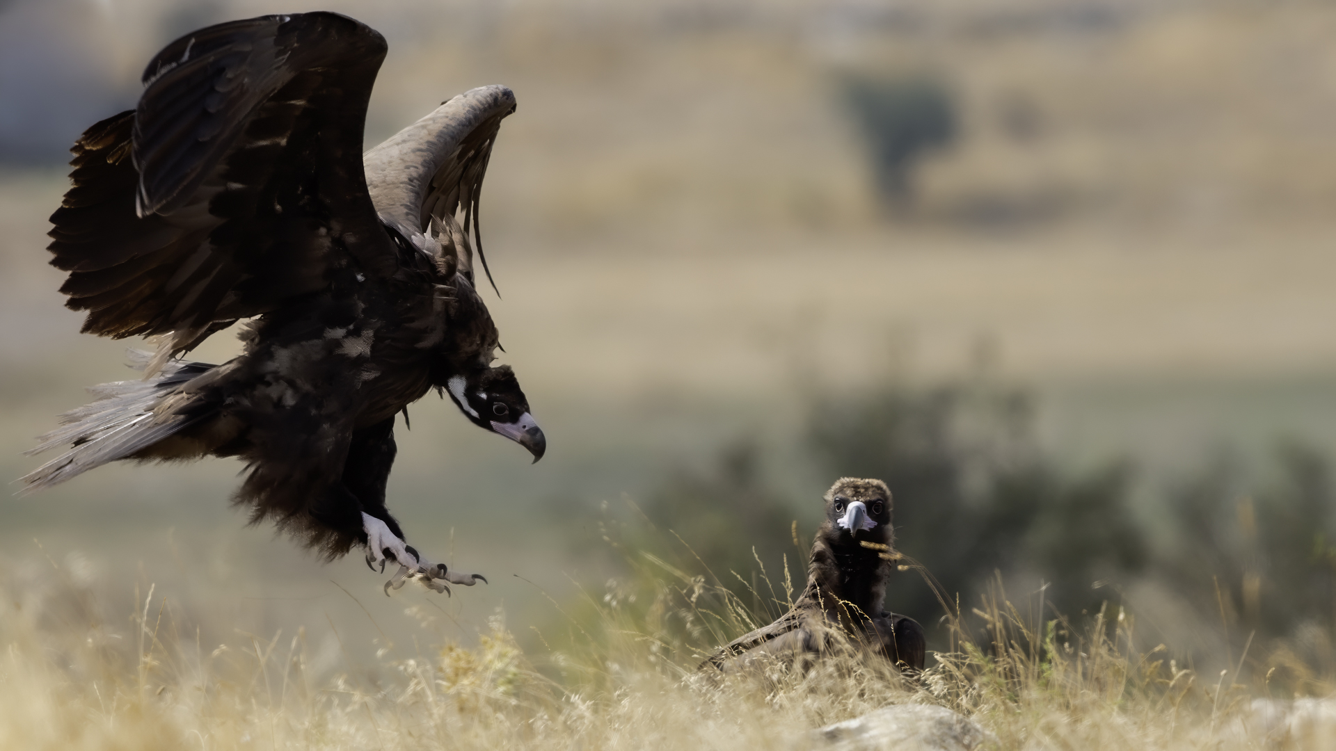 Niespełna 3 metry rozpiętości skrzydeł, waga może przekraczać 12 kilogramów. Potężny, piękny ptak. Sępy kasztanowate były bardzo bojaźliwe i siadały po lewej stronie czatowni, w znacznej odległości godzinami obserwując czatownię i okolicę. Każdego dnia były śmielsze i zmniejszały odległość , a tym samym powstawały coraz lepsze zdjęcia. Oczywiście, sępy, jak to sępy żerują na padlinie. Pozostawiona padlina początkowo była wykorzystywana też przez inne zwierzęta, ale na noc miała być chowana. Jej przeznaczenie to jednak nęcisko dla ptaków i tylko ptaków żerujących za dnia. Niestety organizator warsztatów, próbując wieczorem zabrać padlinę sprzed czatowni, musiał zmienić plany w tym zakresie, gdyż właśnie do kolacji zasiadły przy niej dwa niedźwiedzie, które nie zamierzały rezygnować ze swoich planów wobec pozostawionego mięsa. Sami tego nie widzieliśmy, ale rano następnego dnia świt ukazał, pozostałości po uczcie niedźwiedzi. Tak, więc nasze nęcisko, mocno uszczuplone, ale nadal spełniające swoją funkcję, bo sępy przyleciały. Na szczęście, sępy nabierające zaufania, kilka razy, podeszły tak blisko, że 600 mm obiektyw pokazywał już tylko samą sylwetkę ptaka, a podczas jego odlotu w kadr, nie mieściły się jego skrzydła. Tu powstawała duża trudność w fotografowaniu, bo raz ptak miał metr wysokości, raz 3 metry rozpiętości skrzydeł. Jeżeli siedział i obserwował z oddali, to brakowało ogniskowej, aby wykonać zdjęcia. Jeżeli przyleciał przed czatownię, warto mieć już obiektyw 300 milimetrowy. Nie radzę niczego zmieniać podczas fotografowania, bo może być to tożsame z zakończeniem fotografowania, przynajmniej w tym dniu. Wszystkie ptaki były bardzo bojaźliwe i ostrożne, a jakakolwiek zmiana, ruch powodował, że niebo było czarne od kruków i srok, a przerwa w fotografowaniu mogła trwać kilka godzin. Sępy wielokrotnie przelatywały nad czatownią zaabsorbowane obserwowaniem tego co działo się przy padlinie, z głową skierowaną w dół. Ich lot był na bardzo niskiej wysokości, tak że nie było problemów z wykonaniem zdjęć. Oczywiście niebieskie tło nieba to nie moja ulubiona kompozycja, ale zamieściłem też kilka takich zdjęć, dla ukazania piękna szybującego ptasiego giganta. Dodałem też kilka zdjęć sępa ze sroką, czy krukiem dla zbudowania skali porównawczej i oddania wielkości tego ptaka. Sroki i kruki zawsze były w okolicy tych ptaków, bez względu, czy siedziały na ziemi, czy szybowały w powietrzu. Niestety sępy kasztanowate należą do rzadkich gatunków i ich liczebność na świecie to około 1000 par.