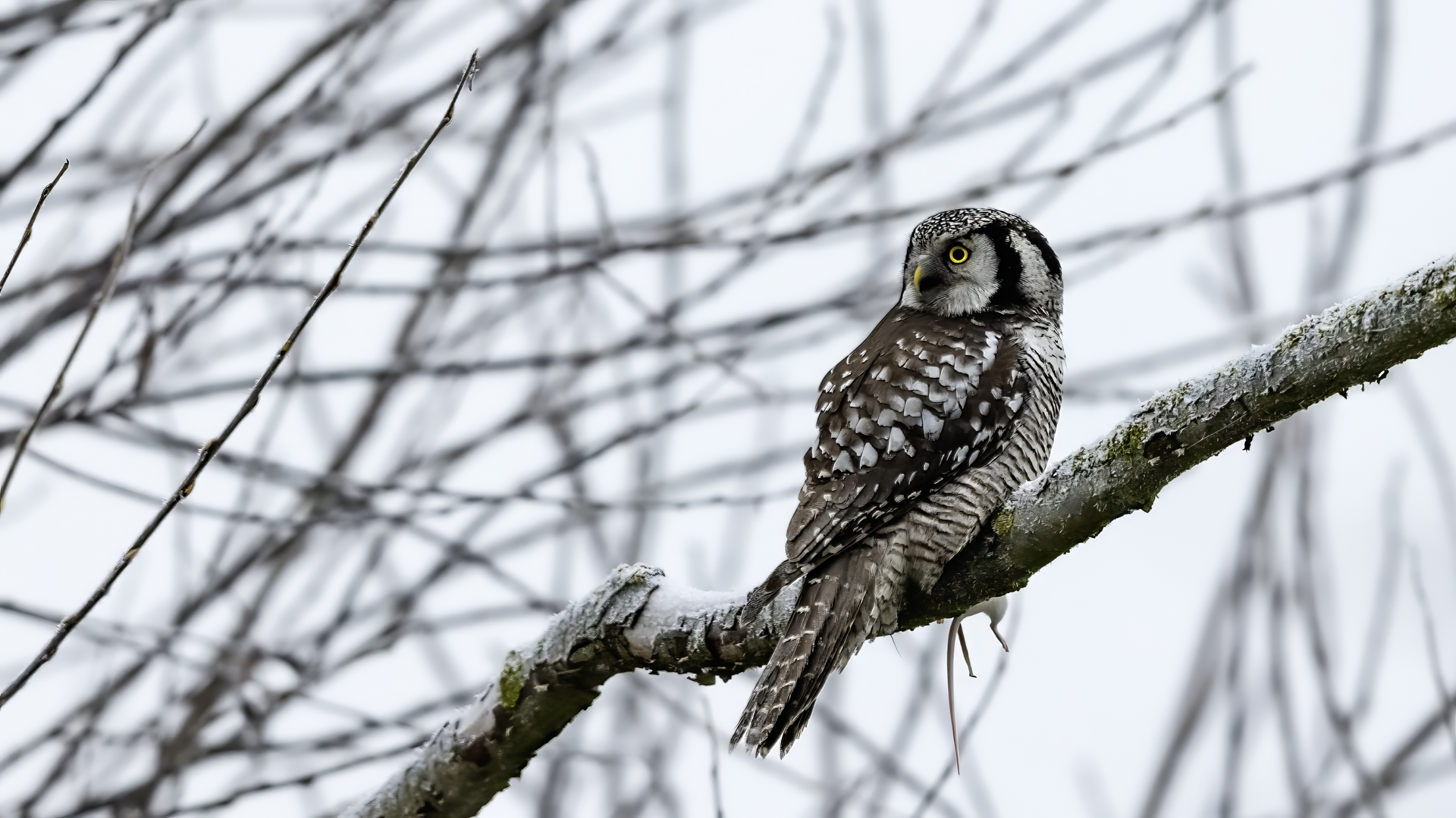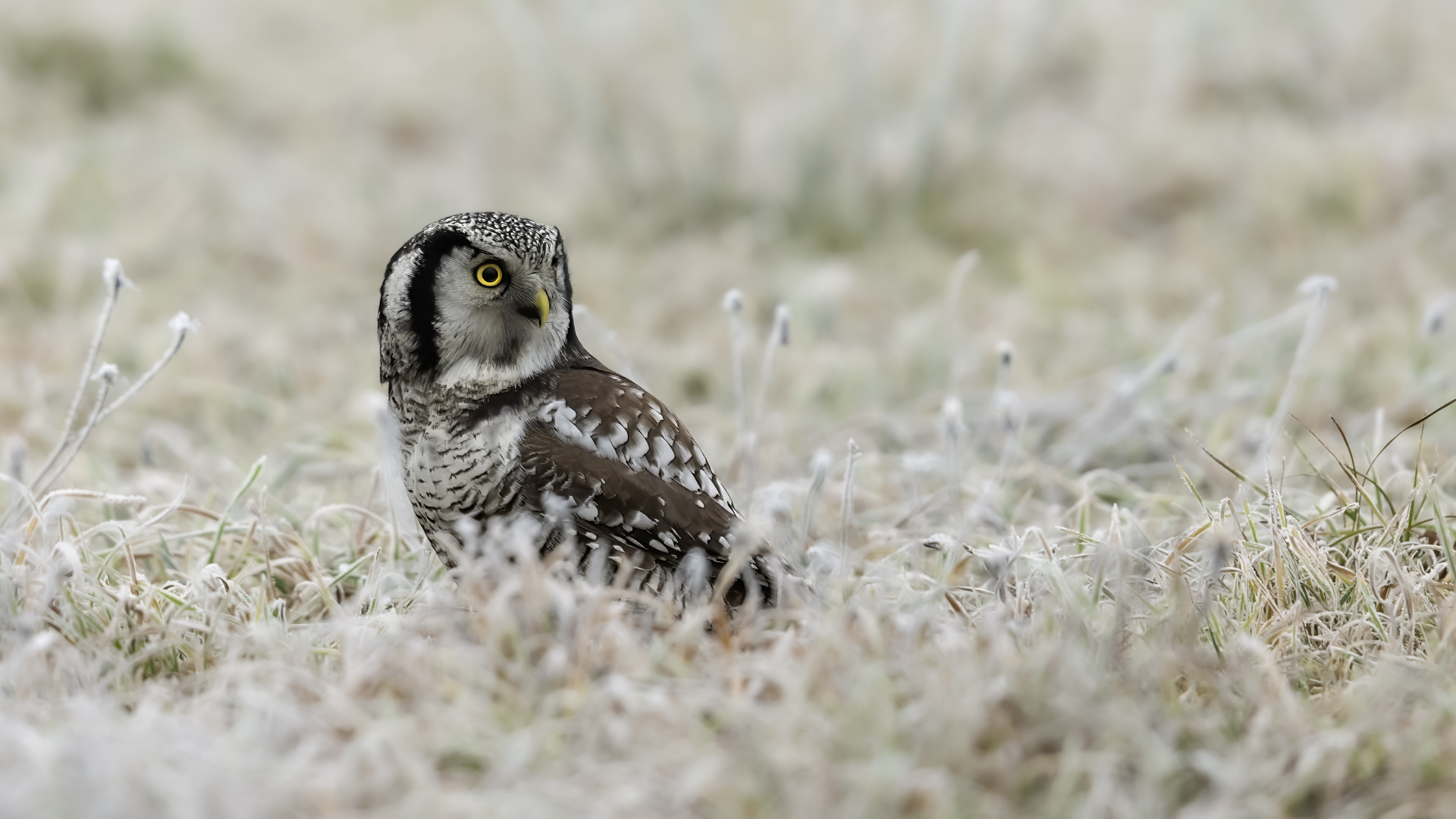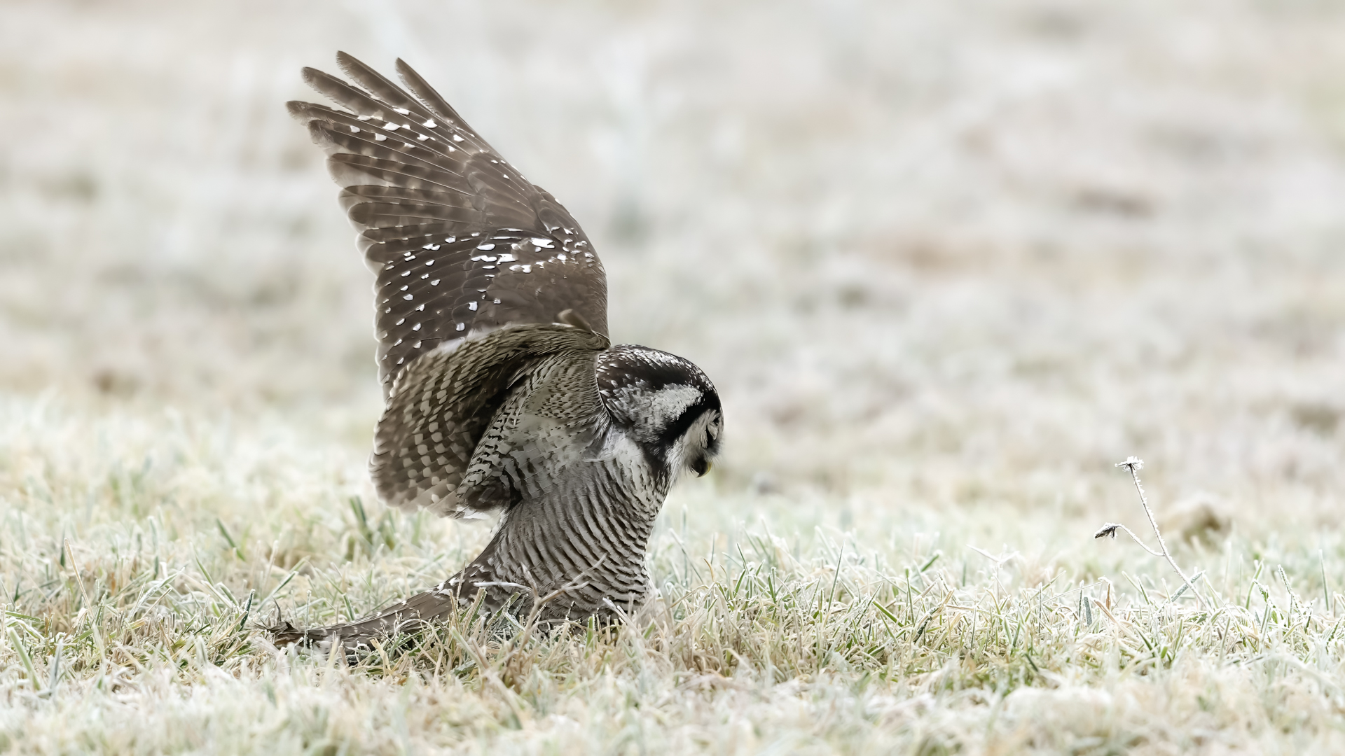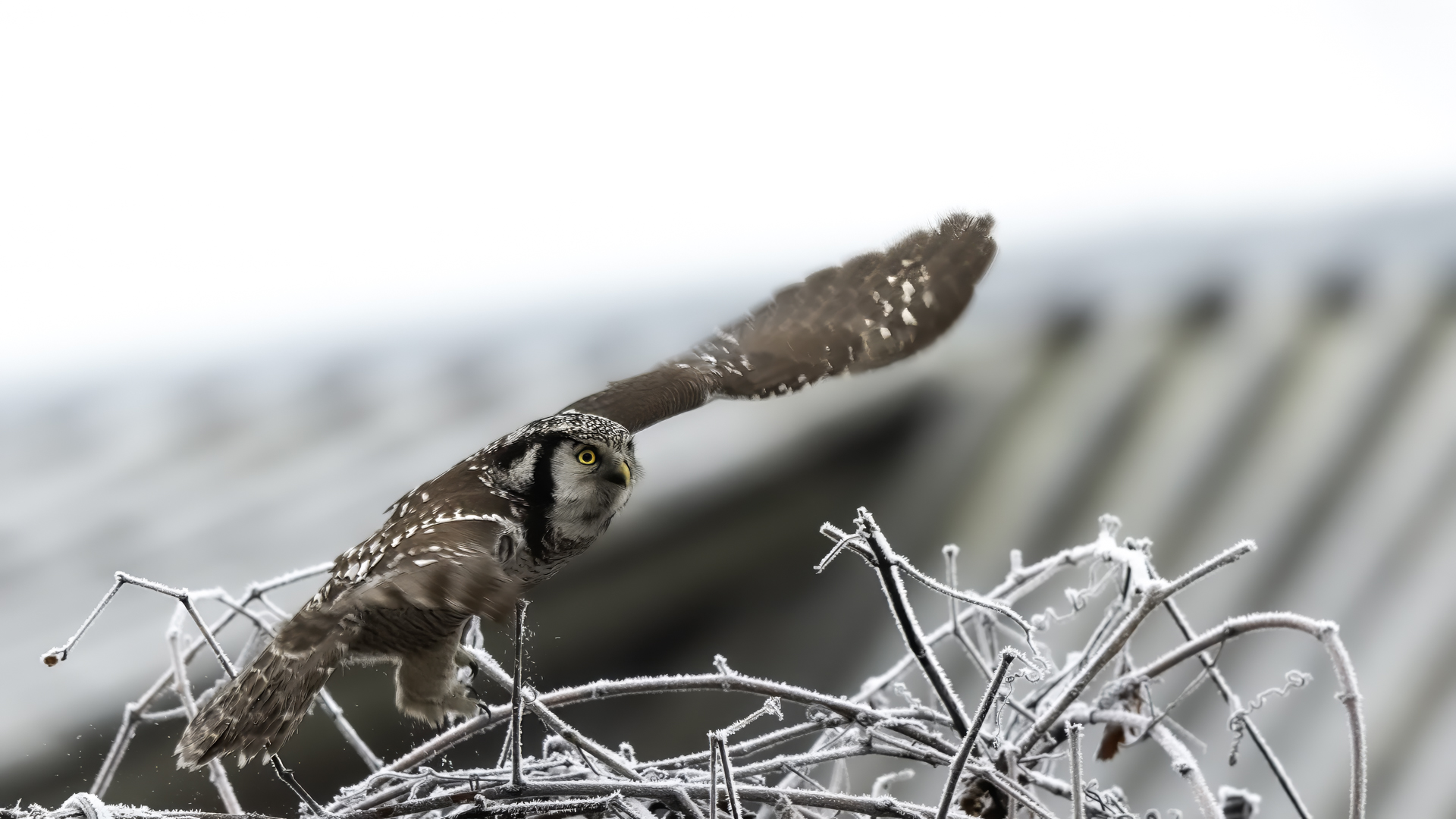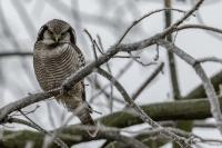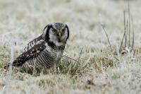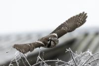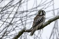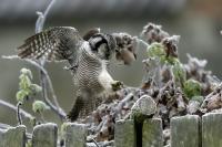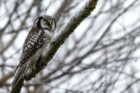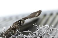 Przedstawiam Wam chyba najbardziej obfotografowanego ptaka w Polsce w ostatnim czasie (11/2013). I wcale mnie nie dziwi jego popularność i zainteresowanie związane z jego przybyciem. Zwłaszcza, że to wielka rzadkość obserwowanie przedstawiciela tego gatunku w Polsce i to jeszcze w tak łatwy sposób. Sowa ma wręcz swoje miejsce „dyżurne” w miejscowości Lutobork, gdzie zawsze można ją spotkać i bez trudu sfotografować. Oczywiście fotografia fotografii nierówna, ale na mojej sesji, a właściwie naszej, zabrakło światła (pozdrawiam Pawła i Łukasza, z którymi w miłej atmosferze, mimo mrozu, miałem przyjemność fotografować tego wspaniałego ptaka). Zdjęcia w mroźny poranek mają swój klimat, ale prognozy w tym dniu zupełnie się nie sprawdziły. Miał być piękny wschód słońca, a okazało się, że słońce nie wyjrzało nawet na chwilę. Przynajmniej w godzinach rannych. Wiele zdjęć nieostrych i brakowało im tej ciepłej barwy, nie mówiąc już o możliwości zastosowania krótszych czasów naświetlania i zrobienia jeszcze lepszych, dynamicznych ujęć. Zdumiewającym jest, że sowa zachowywała się wręcz jak oswojona, zupełnie lekceważąc przejeżdżające samochody, czy przechodzących ludzi. Raz nawet przeleciała około metra ode mnie. Niesamowite wrażenie, kiedy tak piękny i rzadki ptak jest na wyciągnięcie ręki i czuć na twarzy wir powietrza spowodowany jej lotem. Wróble zachowują większy dystans do nas. Ale nie sowy. Tu analogia do fotografowanej niedawno sóweczki i jej zachowań. Na niektórych zdjęciach sowa jest w zurbanizowanym otoczeniu, ale właśnie w takim ją sfotografowałem. W swoich galeriach zawsze staram się oddać naturalne środowisko fotografowanego zwierzęcia zamieszczając w tym celu nieraz duże ilości zdjęć (drop, bielik, myszołów). Wracając jednak do sesji i warunków oświetleniowych. Szkoda, że tak wypadło bo kwintesencją fotografii tak szybkiego ptaka drapieżnego jest dynamiczne jego ujęcie w locie. Zamieszczam kilka zdjęć, ale zdecydowana większość powędrowała do kosza. Szybkość jej lotu, brak światła i panujący mróz obniżający refleks, nie sprzyjał wykonaniu oddających w pełni urok tego ptaka. Niemniej jednak powstało kilka zdjęć takich, które dokumentują moje pierwsze spotkanie z tym gatunkiem. Sowa jarzębata zamieszkuje północną część Euroazji i Ameryki Północnej. Jej waga to koło 300-350 gramów, przy rozpiętości skrzydeł około 80 cm. Pozuje już ponad miesiąc i widać, że jest w dobrej kondycji. Kto wie, może zostanie już na stałe? Byłaby pięknym i ciekawym uzupełnieniem rodzimych naszych gatunków. Tak więc galeria powstała niestety bez własnego nagrania dźwięku sowy jarzębatej. Cały, krótki czas poświęcony był na sesję fotograficzną sowy, która pod względem akustycznym nie współpracowała. Była praktycznie niema. Kilka cichych dźwięków i tak nie utworzyłoby ciekawego nagrania. Zapraszam jednak do mojej galerii fotograficznej sowy jarzębatej . . .