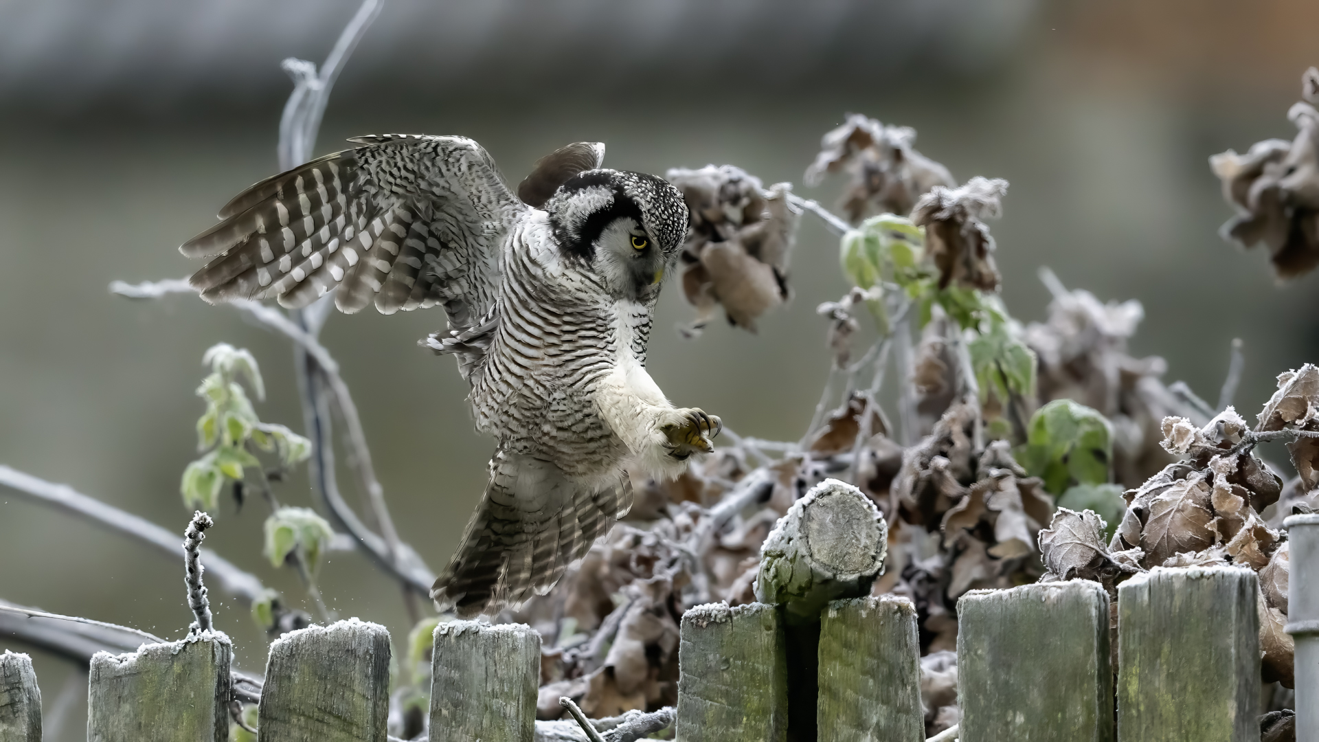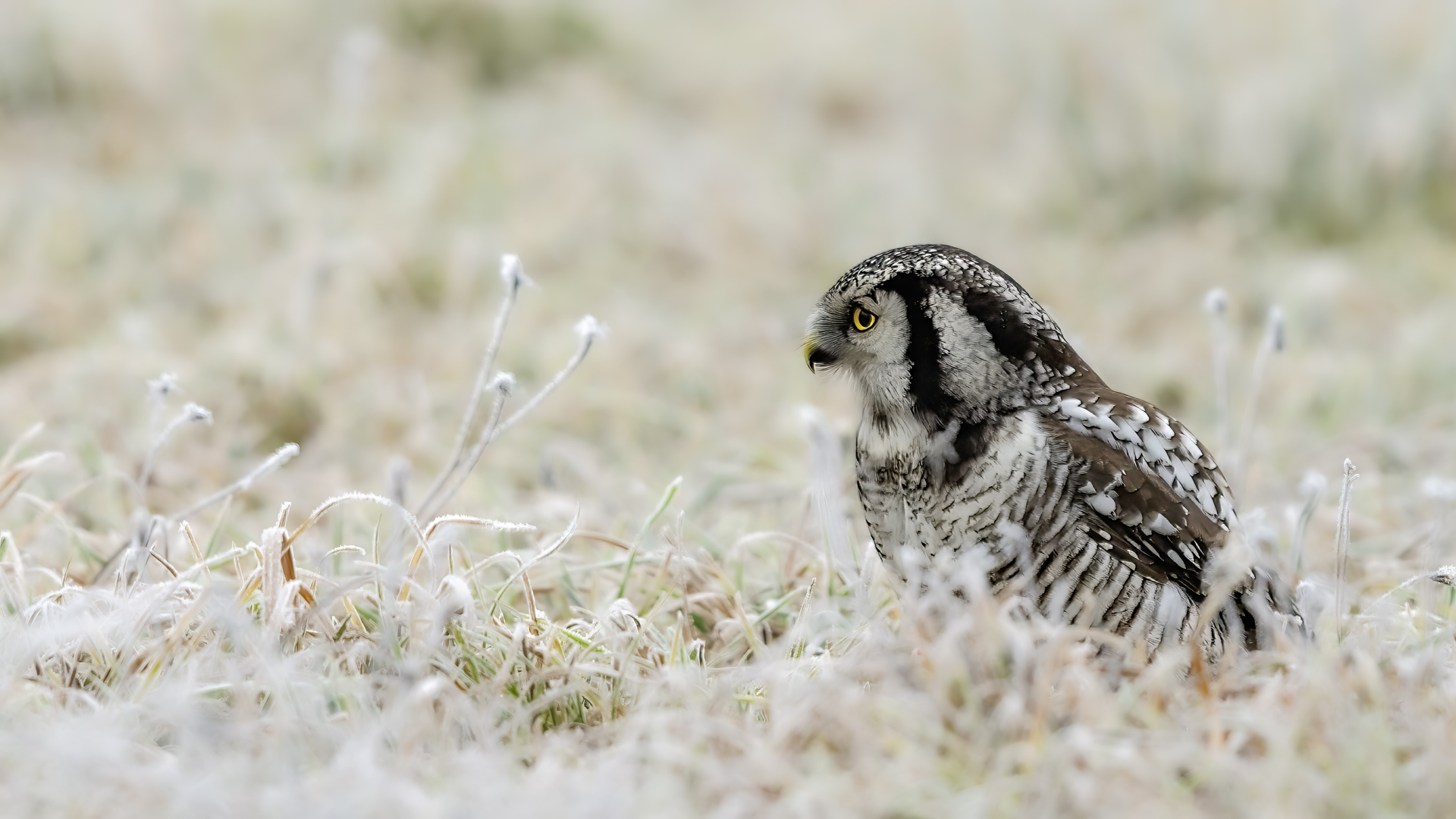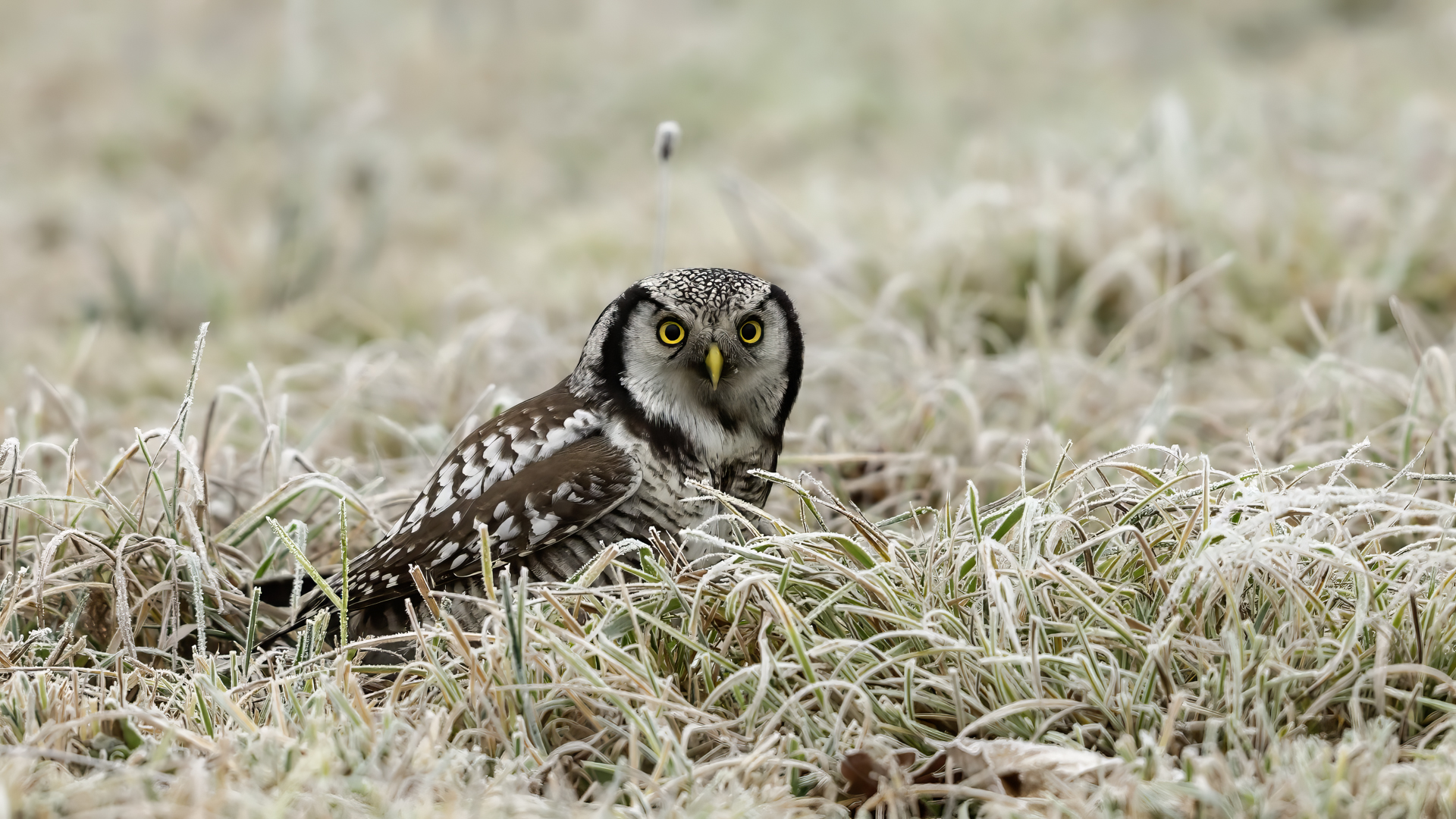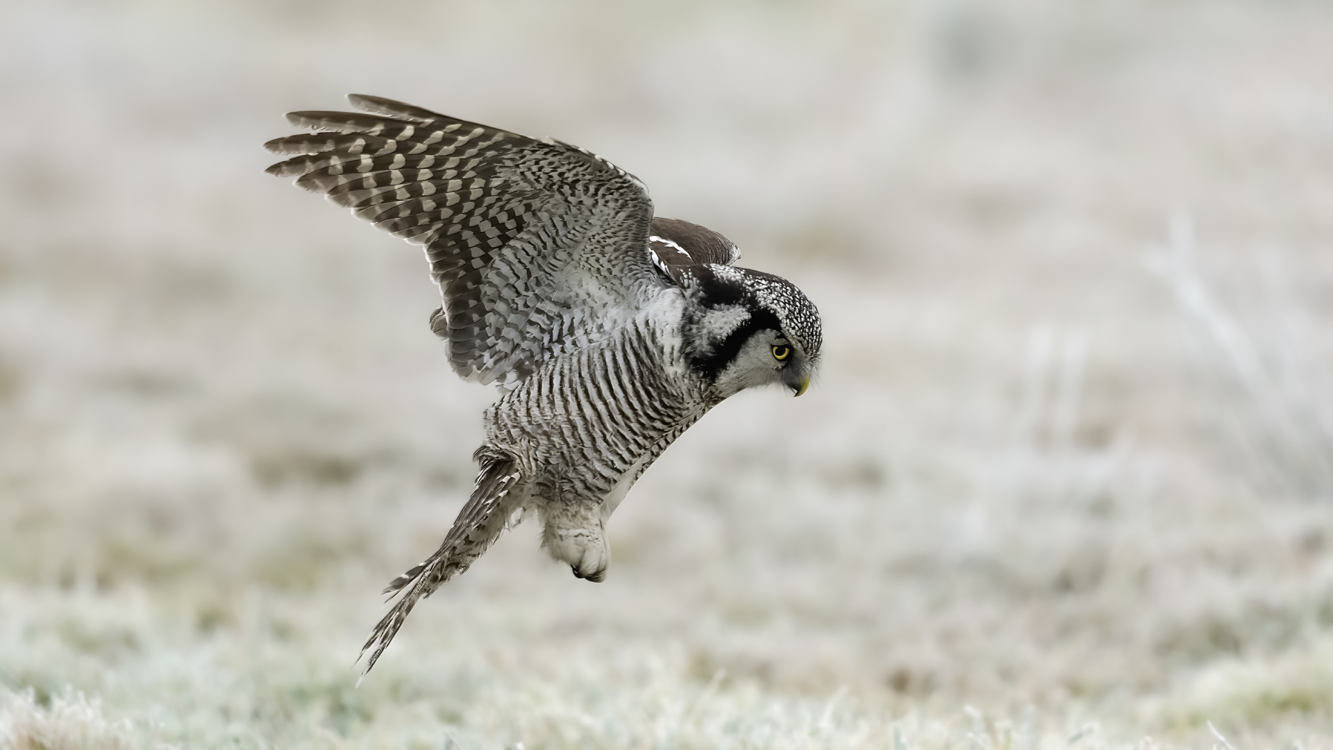 Przedstawiam Wam chyba najbardziej obfotografowanego ptaka w Polsce w ostatnim czasie (11/2013). I wcale mnie nie dziwi jego popularność i zainteresowanie związane z jego przybyciem. Zwłaszcza, że to wielka rzadkość obserwowanie przedstawiciela tego gatunku w Polsce i to jeszcze w tak łatwy sposób. Sowa ma wręcz swoje miejsce „dyżurne” w miejscowości Lutobork, gdzie zawsze można ją spotkać i bez trudu sfotografować. Oczywiście fotografia fotografii nierówna, ale na mojej sesji, a właściwie naszej, zabrakło światła (pozdrawiam Pawła i Łukasza, z którymi w miłej atmosferze, mimo mrozu, miałem przyjemność fotografować tego wspaniałego ptaka). Zdjęcia w mroźny poranek mają swój klimat, ale prognozy w tym dniu zupełnie się nie sprawdziły. Miał być piękny wschód słońca, a okazało się, że słońce nie wyjrzało nawet na chwilę. Przynajmniej w godzinach rannych. Wiele zdjęć nieostrych i brakowało im tej ciepłej barwy, nie mówiąc już o możliwości zastosowania krótszych czasów naświetlania i zrobienia jeszcze lepszych, dynamicznych ujęć. Zdumiewającym jest, że sowa zachowywała się wręcz jak oswojona, zupełnie lekceważąc przejeżdżające samochody, czy przechodzących ludzi. Raz nawet przeleciała około metra ode mnie. Niesamowite wrażenie, kiedy tak piękny i rzadki ptak jest na wyciągnięcie ręki i czuć na twarzy wir powietrza spowodowany jej lotem. Wróble zachowują większy dystans do nas. Ale nie sowy. Tu analogia do fotografowanej niedawno sóweczki i jej zachowań. Na niektórych zdjęciach sowa jest w zurbanizowanym otoczeniu, ale właśnie w takim ją sfotografowałem. W swoich galeriach zawsze staram się oddać naturalne środowisko fotografowanego zwierzęcia zamieszczając w tym celu nieraz duże ilości zdjęć (drop, bielik, myszołów). Wracając jednak do sesji i warunków oświetleniowych. Szkoda, że tak wypadło bo kwintesencją fotografii tak szybkiego ptaka drapieżnego jest dynamiczne jego ujęcie w locie. Zamieszczam kilka zdjęć, ale zdecydowana większość powędrowała do kosza. Szybkość jej lotu, brak światła i panujący mróz obniżający refleks, nie sprzyjał wykonaniu oddających w pełni urok tego ptaka. Niemniej jednak powstało kilka zdjęć takich, które dokumentują moje pierwsze spotkanie z tym gatunkiem. Sowa jarzębata zamieszkuje północną część Euroazji i Ameryki Północnej. Jej waga to koło 300-350 gramów, przy rozpiętości skrzydeł około 80 cm. Pozuje już ponad miesiąc i widać, że jest w dobrej kondycji. Kto wie, może zostanie już na stałe? Byłaby pięknym i ciekawym uzupełnieniem rodzimych naszych gatunków. Tak więc galeria powstała niestety bez własnego nagrania dźwięku sowy jarzębatej. Cały, krótki czas poświęcony był na sesję fotograficzną sowy, która pod względem akustycznym nie współpracowała. Była praktycznie niema. Kilka cichych dźwięków i tak nie utworzyłoby ciekawego nagrania. Zapraszam jednak do mojej galerii fotograficznej sowy jarzębatej . . .