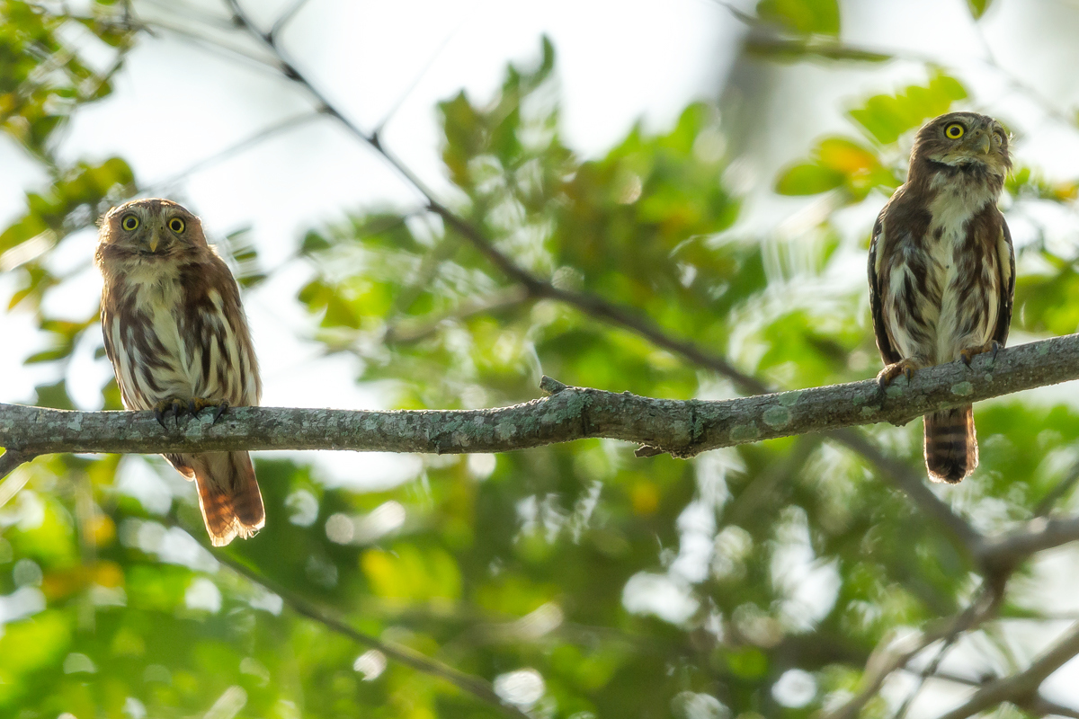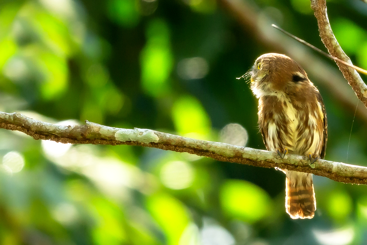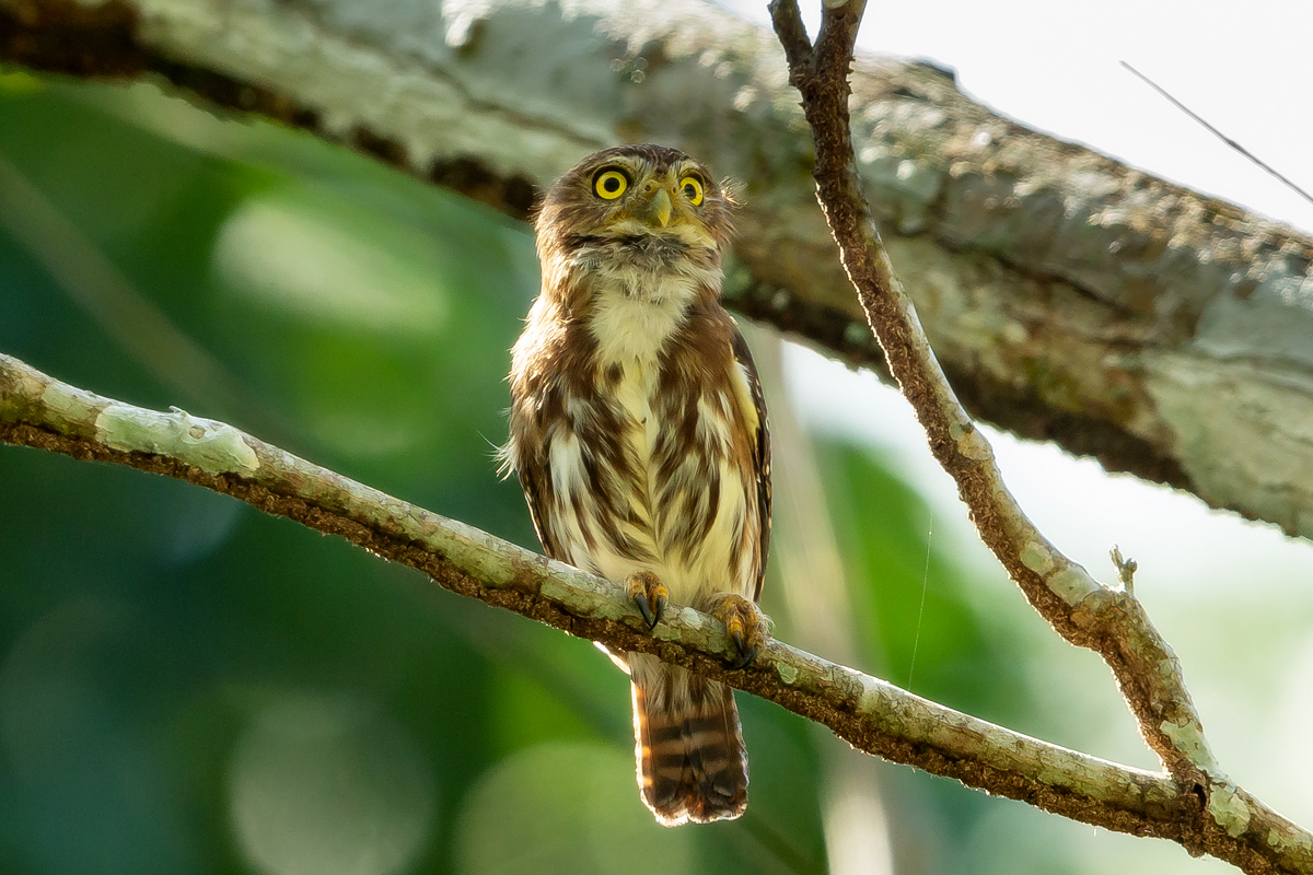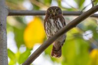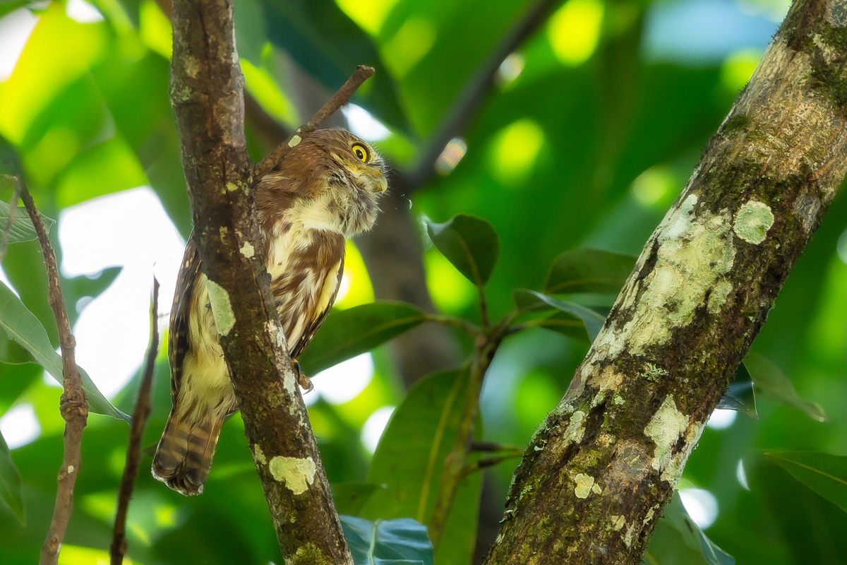Sóweczka kreskowana mieszka na Kostaryce w zgoła odmiennym otoczeniu niż nasza sóweczka europejska. Zatrzymujemy samochód około południa na nieutwardzonej drodze pomiędzy luźną zabudową mieszkaniową. Dookoła pojedyncze domy i sporej wielkości drzewa. Temperatura blisko 30 stopni, duża wilgotność. Przewodnik chodzi wypatrując sów w koronach drzew. Nagle pokazuje miejsce w którym przebywa sowa. Powstają pierwsze zdjęcia. Po chwili przyleciała druga. Na szczęście zmieniały miejsce przesiadywania i powstają różne ujęcia, nie tylko takie z niebem w tle, co się często tym razem przytrafiało. Na pierwszy rzut oka jest bardzo podobna pod względem wielkości i zachowania do naszej, polskiej sóweczki. Spośród kilkudziesięciu gatunków sóweczki, trzecia trafia na moja stronę.