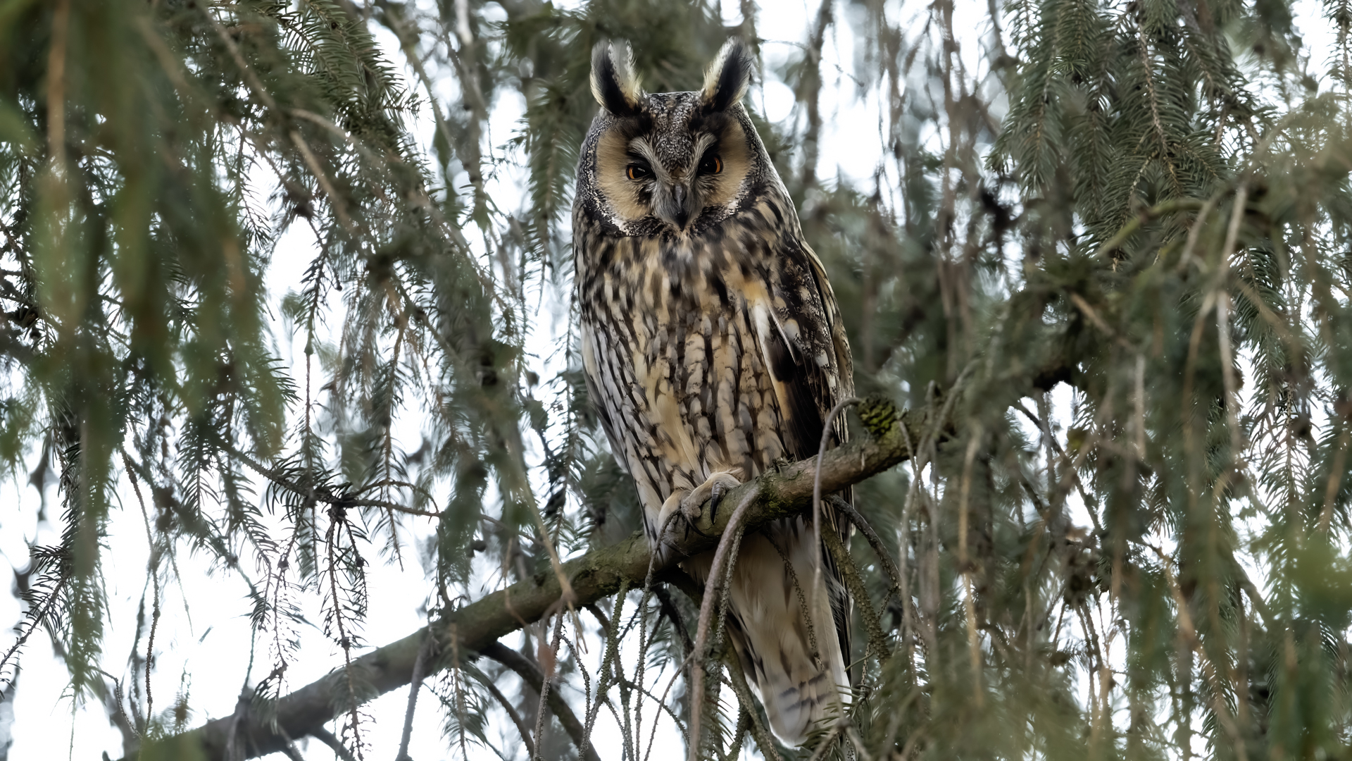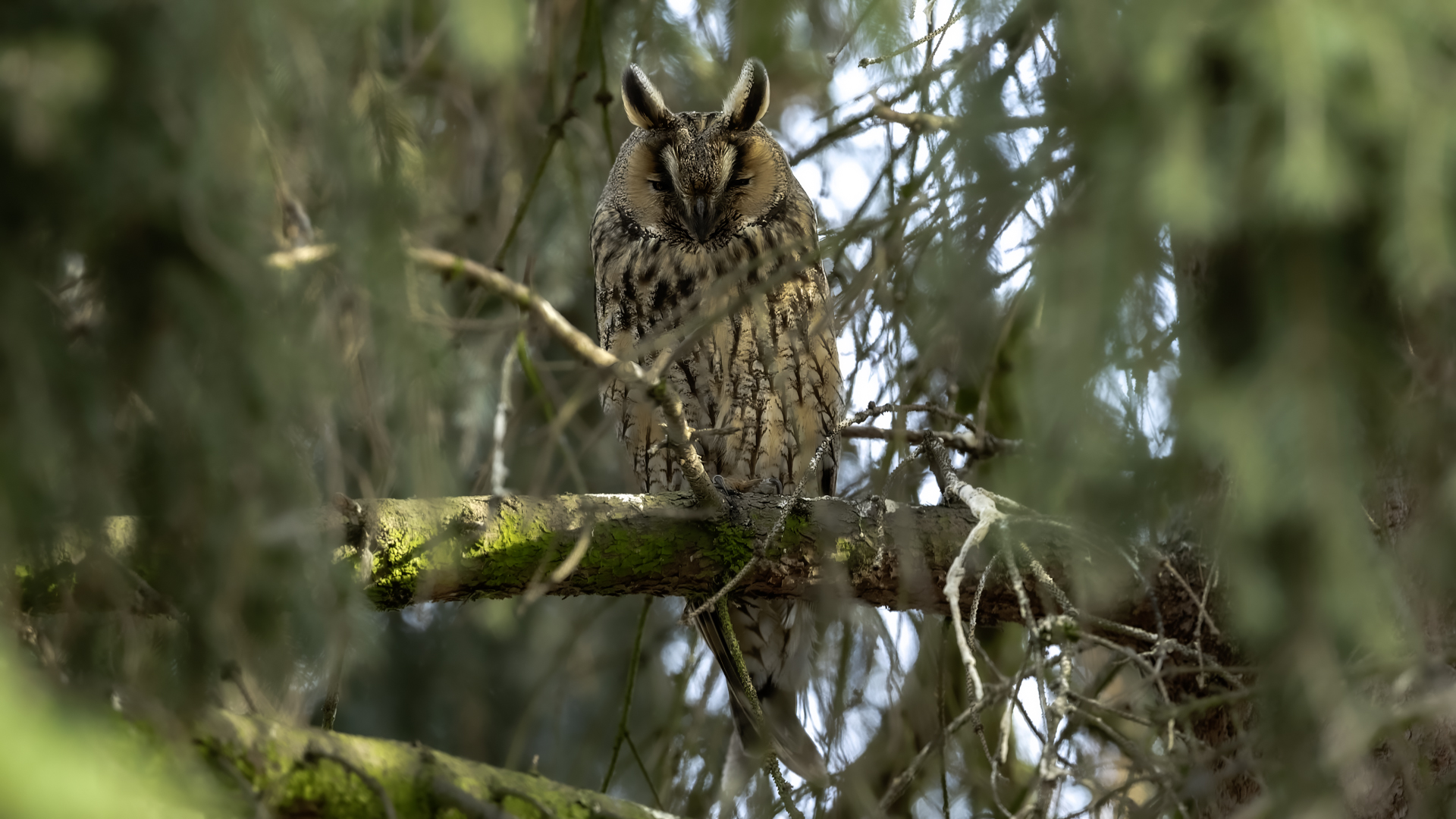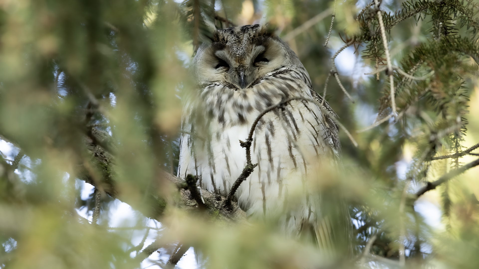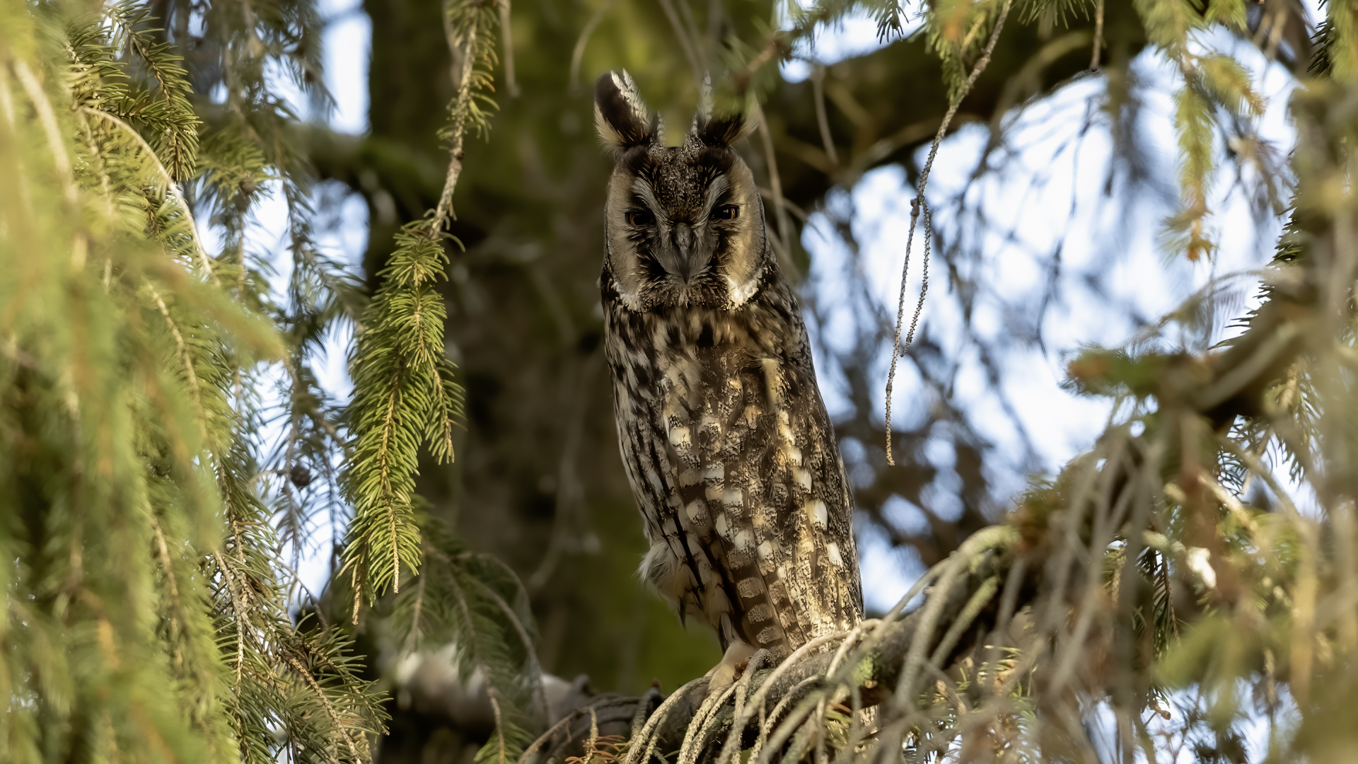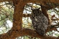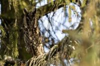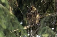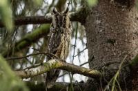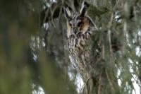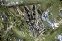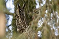 Kolejny gatunek sowy trafia do mojej galerii, a to za sprawą zwyczajnej ludzkiej życzliwości i spontaniczności (Sławek dziękuję za podpowiedź i pozdrawiam, bo w naszych czasach o życzliwość i wspólne podziwianie naszej ptasiej fauny wśród fotografów przyrody coraz trudniej, zastępuje ją często źle pojmowana rywalizacja i współzawodnictwo. Niestety, takie czasy). A miejsce w którym sfotografowałem uszatki wręcz szokuje. Dość ruchliwa ulica przy której na sosnach nie zwracające na ruch kołowy, przechodzących ludzi siedzą uszatki w koronach drzew. Niesamowite wrażenie patrząc na dotychczasowe moje doświadczenia w fotografowaniu ptaków w Polsce. Sowy, a było ich sześć, spały i cała trudność w ich fotografowaniu polegała na wyczekaniu momentu w którym sowa obróci głowę, aby móc sfotografować jej piękne rubinowe oczy, no i uwiecznić uszatkowe uszy. Miejsce także jest niesamowite pod względem życzliwości mieszkańców. Widząc statyw, obiektyw podchodzili i wypatrywali sowy w koronach drzew, aby pomóc w fotografowaniu. Kto wie, może obecność sów pozytywnie wpływa na ludzi? Podobno w okresie zimowym może być ich tam nawet kilkanaście. Sowy uszate osiągają wagę nieco większą od 0,25 kilograma, a rozpiętość skrzydeł nie przekracza metra. Pewnie trzeba będzie w okresie zimowym wrócić to niesamowite miejsce i dodać do galerii zdjęcia w zimowej scenerii, no i z lepszym światłem, bo tym razem nie dopisało.