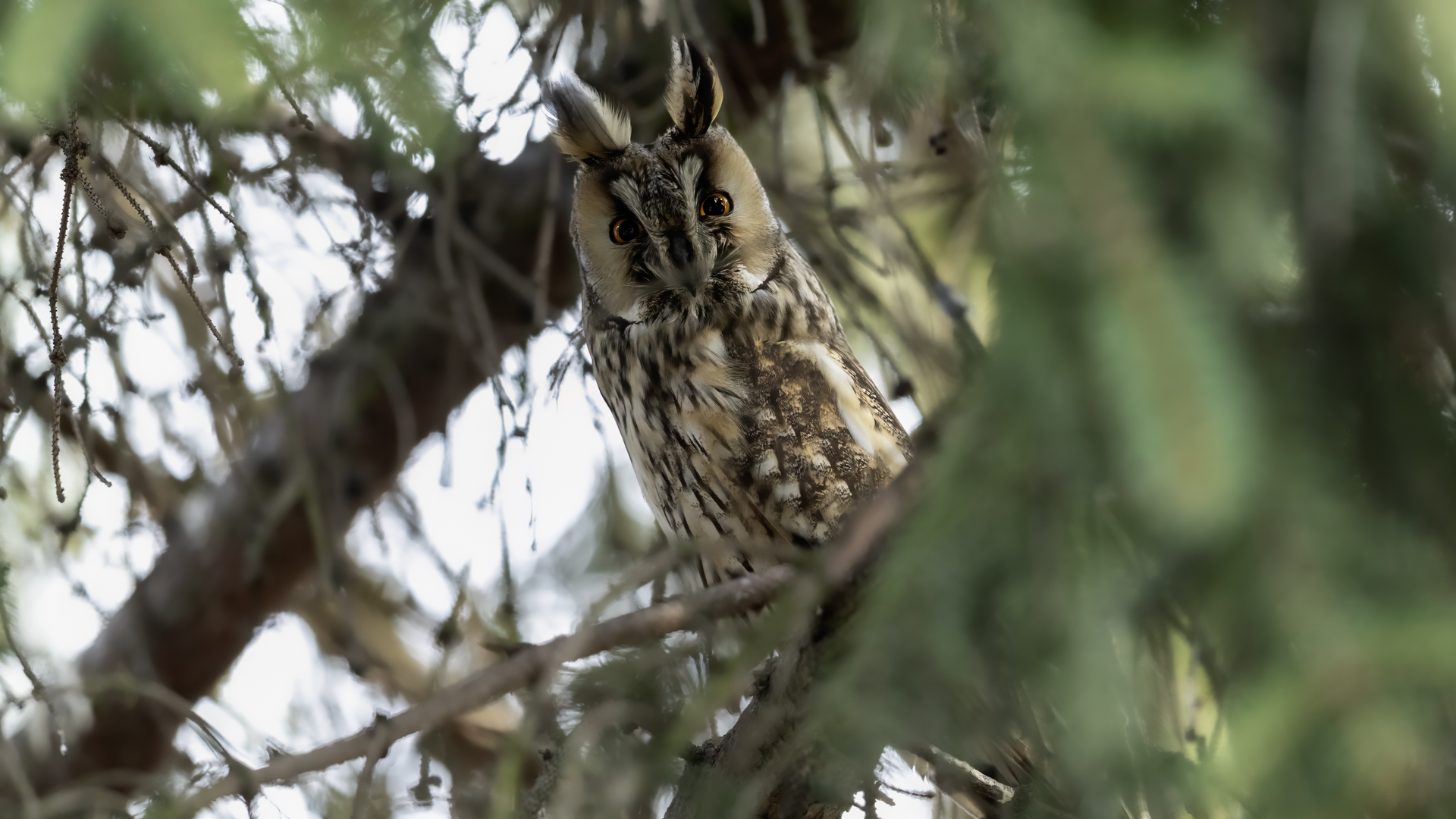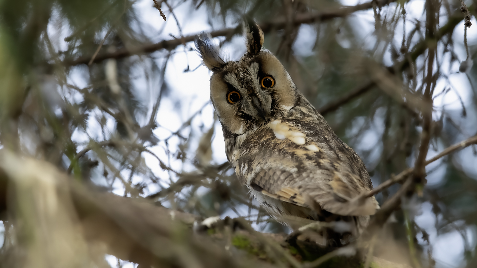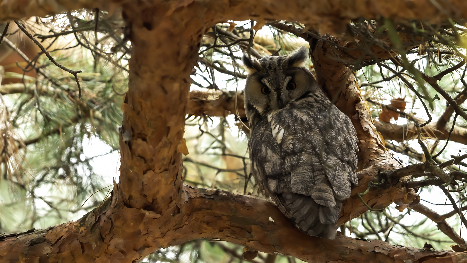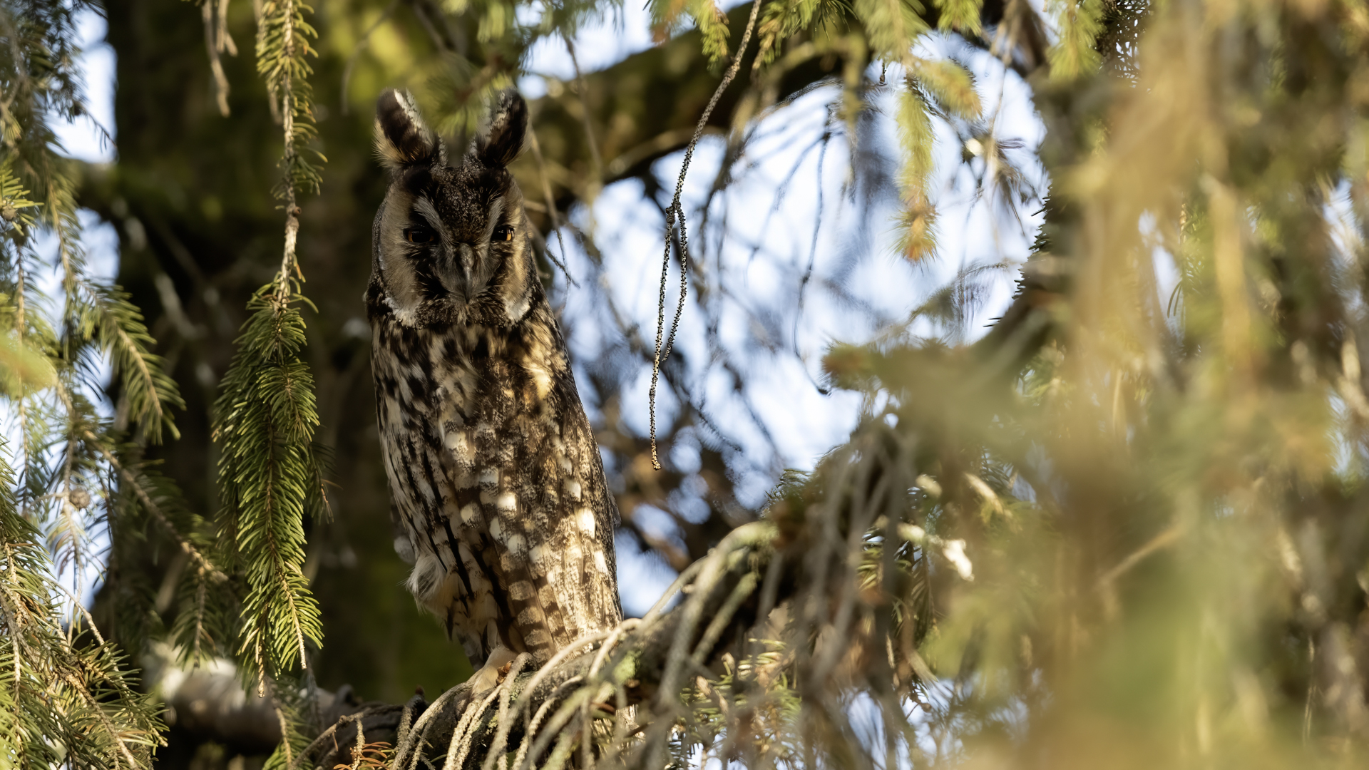 Kolejny gatunek sowy trafia do mojej galerii, a to za sprawą zwyczajnej ludzkiej życzliwości i spontaniczności (Sławek dziękuję za podpowiedź i pozdrawiam, bo w naszych czasach o życzliwość i wspólne podziwianie naszej ptasiej fauny wśród fotografów przyrody coraz trudniej, zastępuje ją często źle pojmowana rywalizacja i współzawodnictwo. Niestety, takie czasy). A miejsce w którym sfotografowałem uszatki wręcz szokuje. Dość ruchliwa ulica przy której na sosnach nie zwracające na ruch kołowy, przechodzących ludzi siedzą uszatki w koronach drzew. Niesamowite wrażenie patrząc na dotychczasowe moje doświadczenia w fotografowaniu ptaków w Polsce. Sowy, a było ich sześć, spały i cała trudność w ich fotografowaniu polegała na wyczekaniu momentu w którym sowa obróci głowę, aby móc sfotografować jej piękne rubinowe oczy, no i uwiecznić uszatkowe uszy. Miejsce także jest niesamowite pod względem życzliwości mieszkańców. Widząc statyw, obiektyw podchodzili i wypatrywali sowy w koronach drzew, aby pomóc w fotografowaniu. Kto wie, może obecność sów pozytywnie wpływa na ludzi? Podobno w okresie zimowym może być ich tam nawet kilkanaście. Sowy uszate osiągają wagę nieco większą od 0,25 kilograma, a rozpiętość skrzydeł nie przekracza metra. Pewnie trzeba będzie w okresie zimowym wrócić to niesamowite miejsce i dodać do galerii zdjęcia w zimowej scenerii, no i z lepszym światłem, bo tym razem nie dopisało.