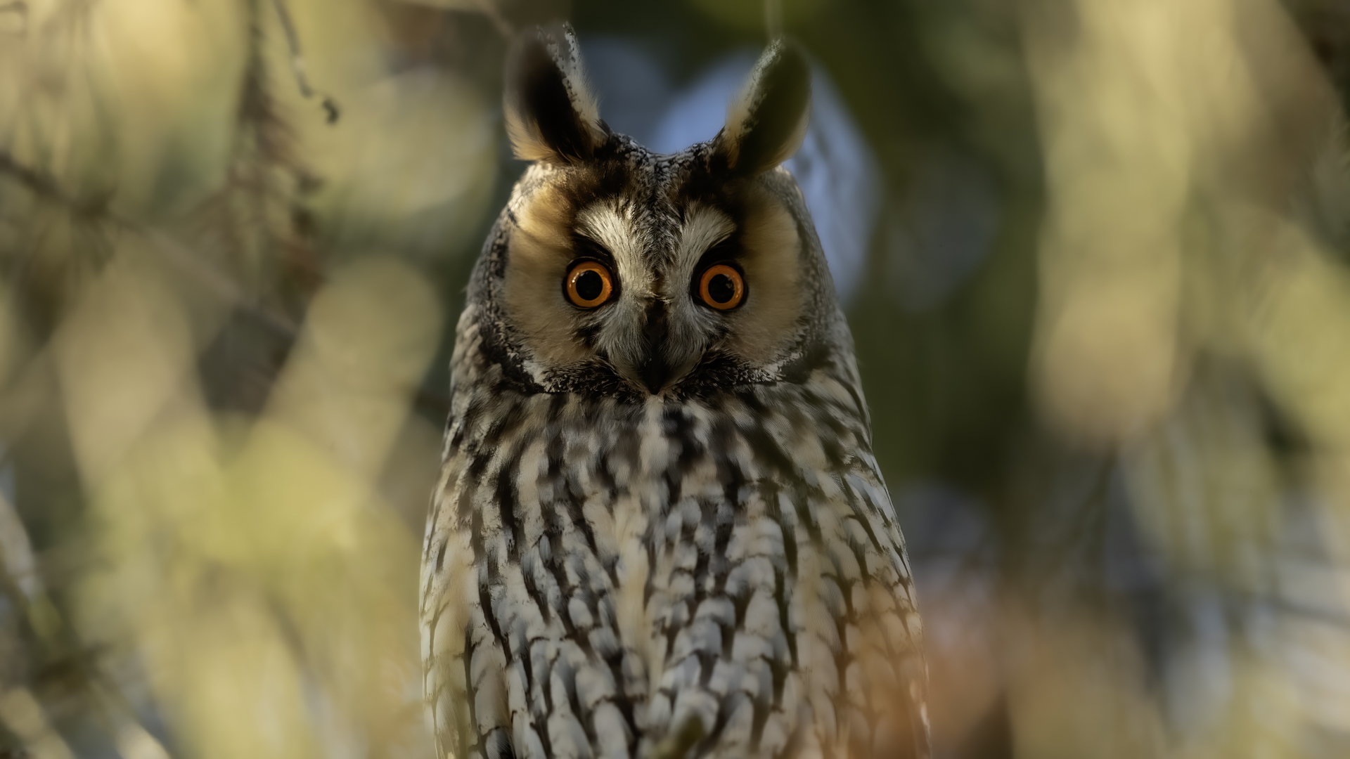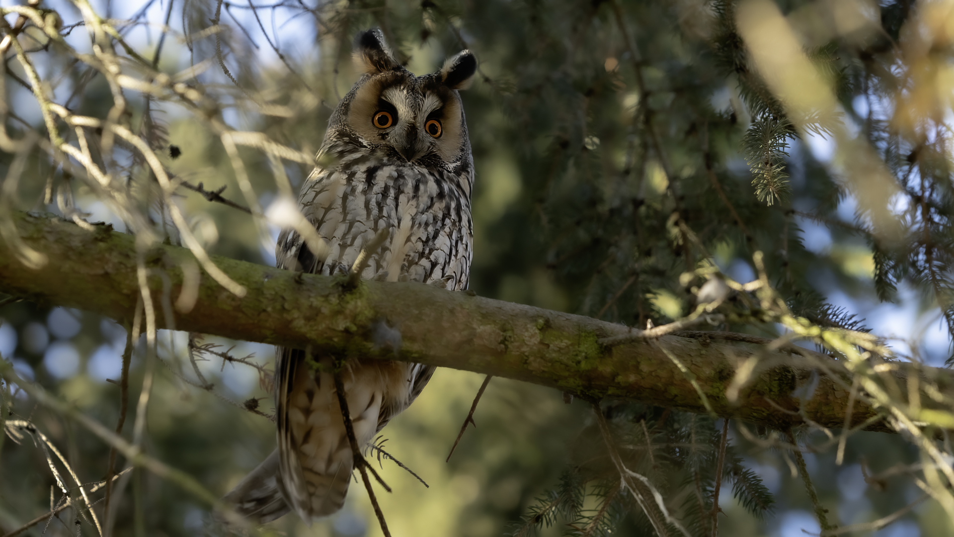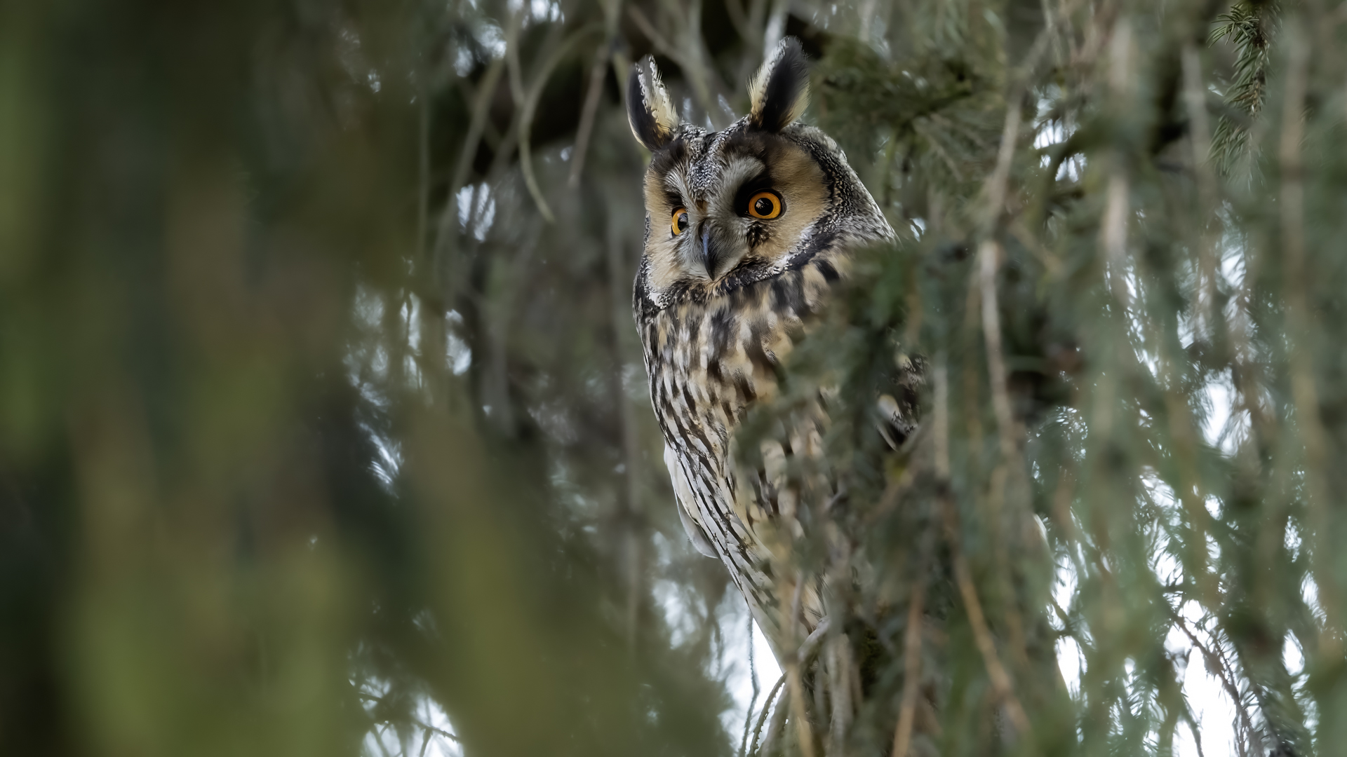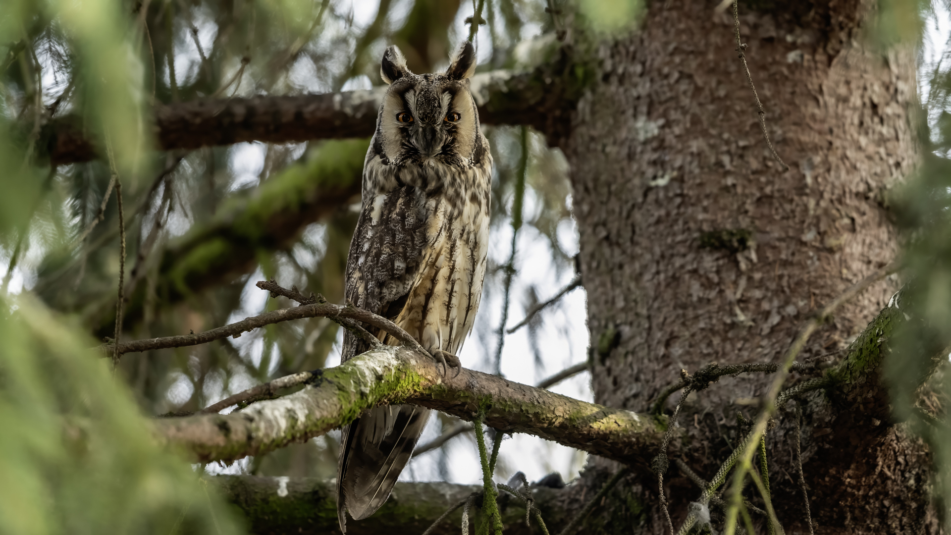 Kolejny gatunek sowy trafia do mojej galerii, a to za sprawą zwyczajnej ludzkiej życzliwości i spontaniczności (Sławek dziękuję za podpowiedź i pozdrawiam, bo w naszych czasach o życzliwość i wspólne podziwianie naszej ptasiej fauny wśród fotografów przyrody coraz trudniej, zastępuje ją często źle pojmowana rywalizacja i współzawodnictwo. Niestety, takie czasy). A miejsce w którym sfotografowałem uszatki wręcz szokuje. Dość ruchliwa ulica przy której na sosnach nie zwracające na ruch kołowy, przechodzących ludzi siedzą uszatki w koronach drzew. Niesamowite wrażenie patrząc na dotychczasowe moje doświadczenia w fotografowaniu ptaków w Polsce. Sowy, a było ich sześć, spały i cała trudność w ich fotografowaniu polegała na wyczekaniu momentu w którym sowa obróci głowę, aby móc sfotografować jej piękne rubinowe oczy, no i uwiecznić uszatkowe uszy. Miejsce także jest niesamowite pod względem życzliwości mieszkańców. Widząc statyw, obiektyw podchodzili i wypatrywali sowy w koronach drzew, aby pomóc w fotografowaniu. Kto wie, może obecność sów pozytywnie wpływa na ludzi? Podobno w okresie zimowym może być ich tam nawet kilkanaście. Sowy uszate osiągają wagę nieco większą od 0,25 kilograma, a rozpiętość skrzydeł nie przekracza metra. Pewnie trzeba będzie w okresie zimowym wrócić to niesamowite miejsce i dodać do galerii zdjęcia w zimowej scenerii, no i z lepszym światłem, bo tym razem nie dopisało.