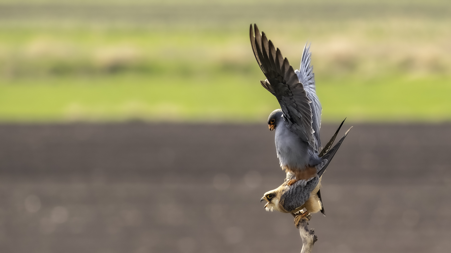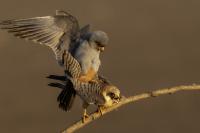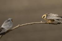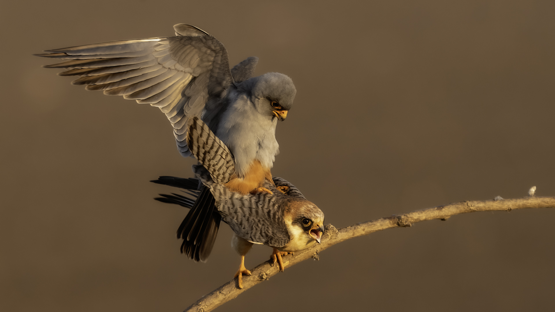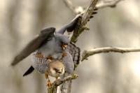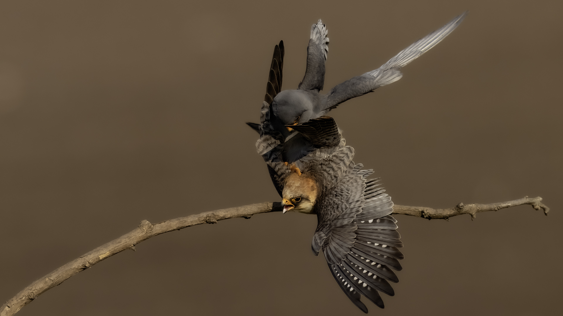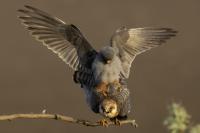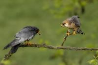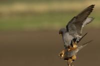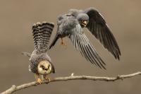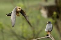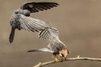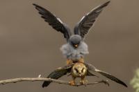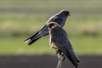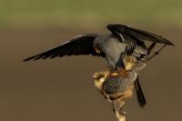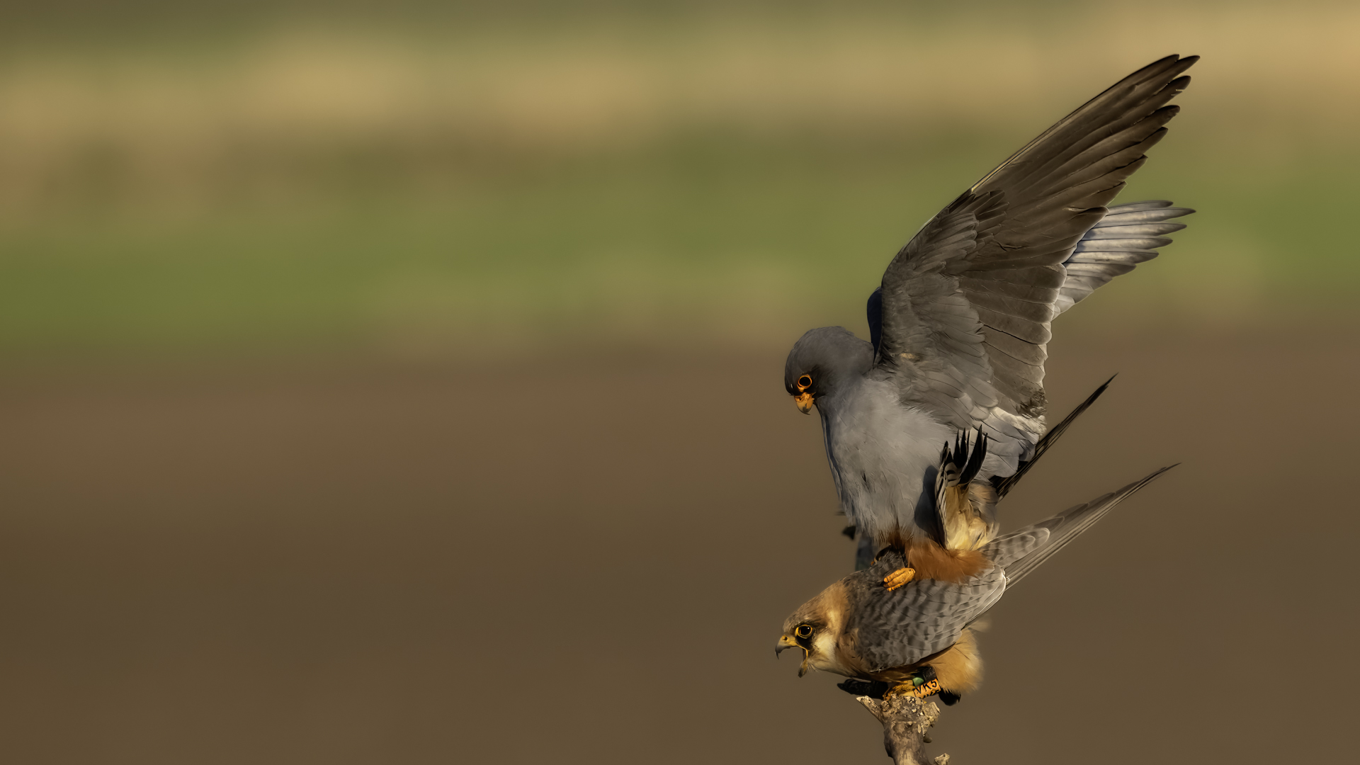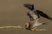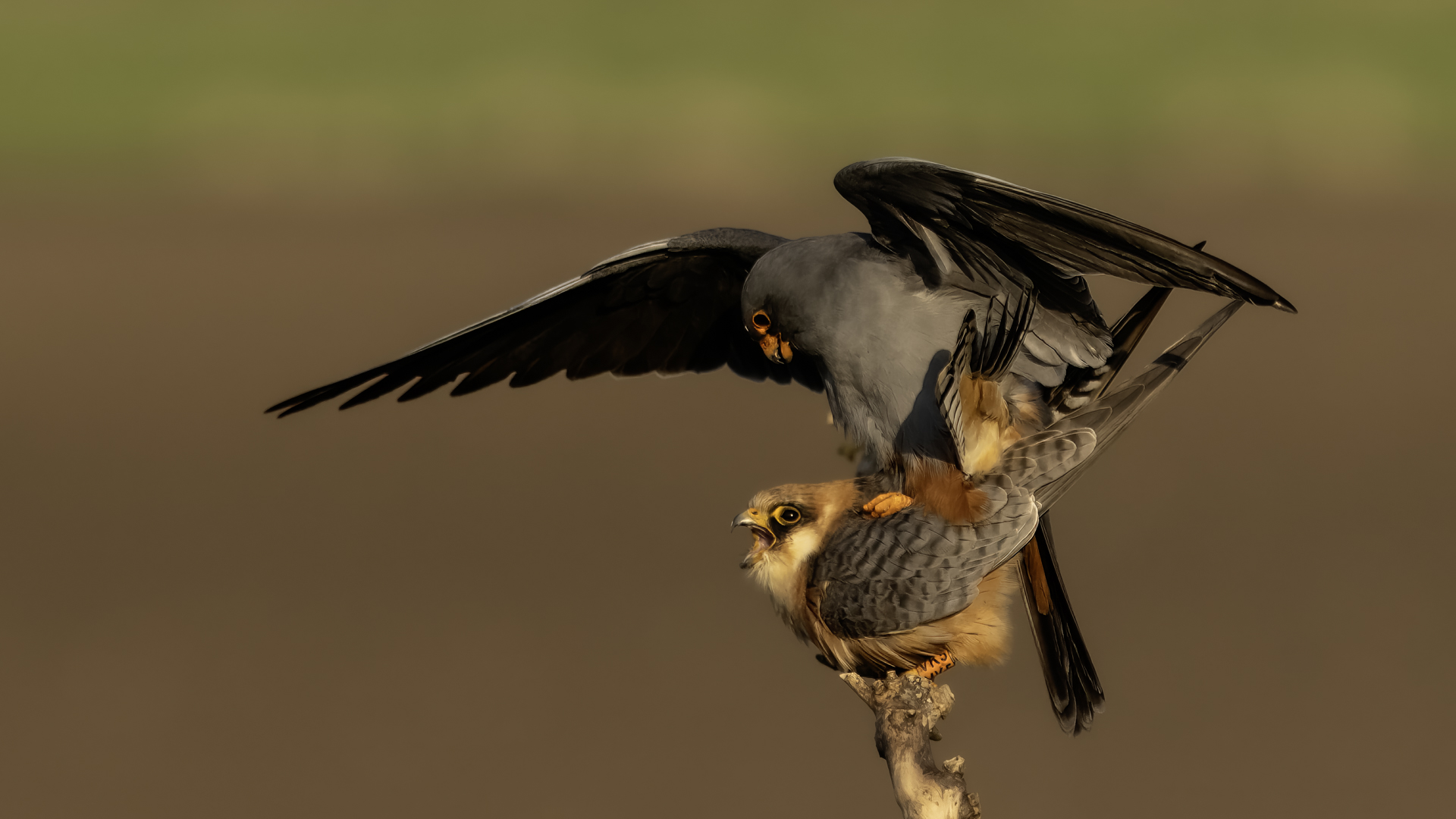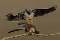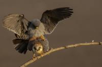 Kobczyk wreszcie trafia do mojej galerii!  Wreszcie, bo od lat był w moich fotograficznych planach, ale w Polsce trudno o dobre zdjęcia tego przepięknego sokoła. W naszym kraju nie gniazduje, a mamy jedynie przyjemność go obserwować podczas przelotów. Prezentowane zdjęcia zostały wykonane na Węgrzech. Trzeba oddać naszym węgierskim organizatorom, że stworzyli warunki do obserwacji i fotografowania kobczyków. Czatownie kobczykowe to usytuowane na wysokości kilku metrów pomieszczenia, gdzie w odległości kilku metrów od fotografujących znajdują się budki lęgowe kobczyków, pustułek i kawek. W odległości około 10-ciu metrów od jednej z czatowni jest też budka lęgowa pójdźki. To dość  niesamowite taka mała kolonia kobczyków, pustułek, kawek i pójdźki, a w środku nich zakamuflowani fotografowie. Spędziłem około 30 -stu godzin wśród kobczyków i można było obserwować ich zaloty, zachowania godowe no i bójki o budkę lęgową, pomiędzy nimi, a kawkami czy pustułkami. Kobczyki z nich są najmniejsze, ale bez walk się nie obyło. Próbowały swoich sił i możliwości na tyle determinująco, że po jednej z bójek z kawkami, myślałem, że samiec kobczyka nie wyjdzie z tego cało. Początek maja był okresem zalotów i kopulacji kobczyków. O zdjęcia tych ptasich zbliżeń nie było trudno, pod warunkiem, że ptaki nie były odwrócone tyłem do nas. Dodałem też nagranie ścieżki dźwiękowej kobczyków o które nie było trudno. Samice niemal ciągle wydają głosy, takie piszczące, powtarzające się. Samce podobnie, ale czasami wydają też głos przypominający głos kretogłowa. Samice cały czas organizowały samcom czas. Siedzący na patyku samiec, często był przeganiany przez samicę, aby zajął się polowaniem. Po zrzuceniu z gałązki udawał się na polowanie. Po jakimś czasie wracał z drobnym gryzoniem lub większym owadem. Samica natychmiast odbierała upolowaną zdobycz i rozpoczęła konsumpcję. Tu następowała chwila ciszy, samiec mógł odpocząć podczas jej posiłku no i ona sama nie wydawała dźwięków. Po zjedzeniu natychmiast siadała na ulubionej gałązce w dość charakterystyczny sposób pokazujący samcowi, że jest gotowa do kopulacji. Do tego oczywiście charakterystyczny piskliwy dźwięk no i samiec nie ma wyjścia, podlatuje do samicy i rozpoczyna się kopulacja. I tak można rzec przez większość dnia. O te statyczne zdjęcia ptaków siedzących na gałązkach, czy kopulujących nie było problemu. Te dynamiczne w locie to już było wyzwanie. Sokoły, jak to sokoły, potrafią bardzo dynamicznie się przemieszczać. To stanowiło pierwszą trudność zrobienia zdjęć ptaków w locie. Druga to szyba, a właściwie lustro dzielące nas od ptaków. Wprawdzie jakość szyby nie była najgorsza, ale spowalniała autofocusa no i zdjęcia wykonywane pod znacznym katem z reguły były do wyrzucenia. Z setek prób udało się jednak kilka zdjęć pokazujące piękną sylwetkę sokoła w locie. Takie musiały powstać-przecież za to je podziwiamy!