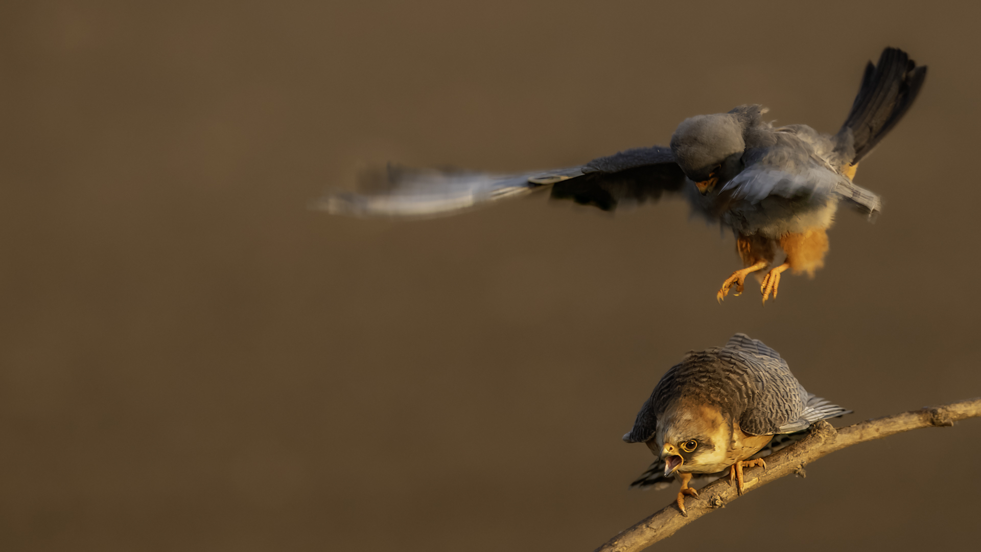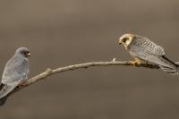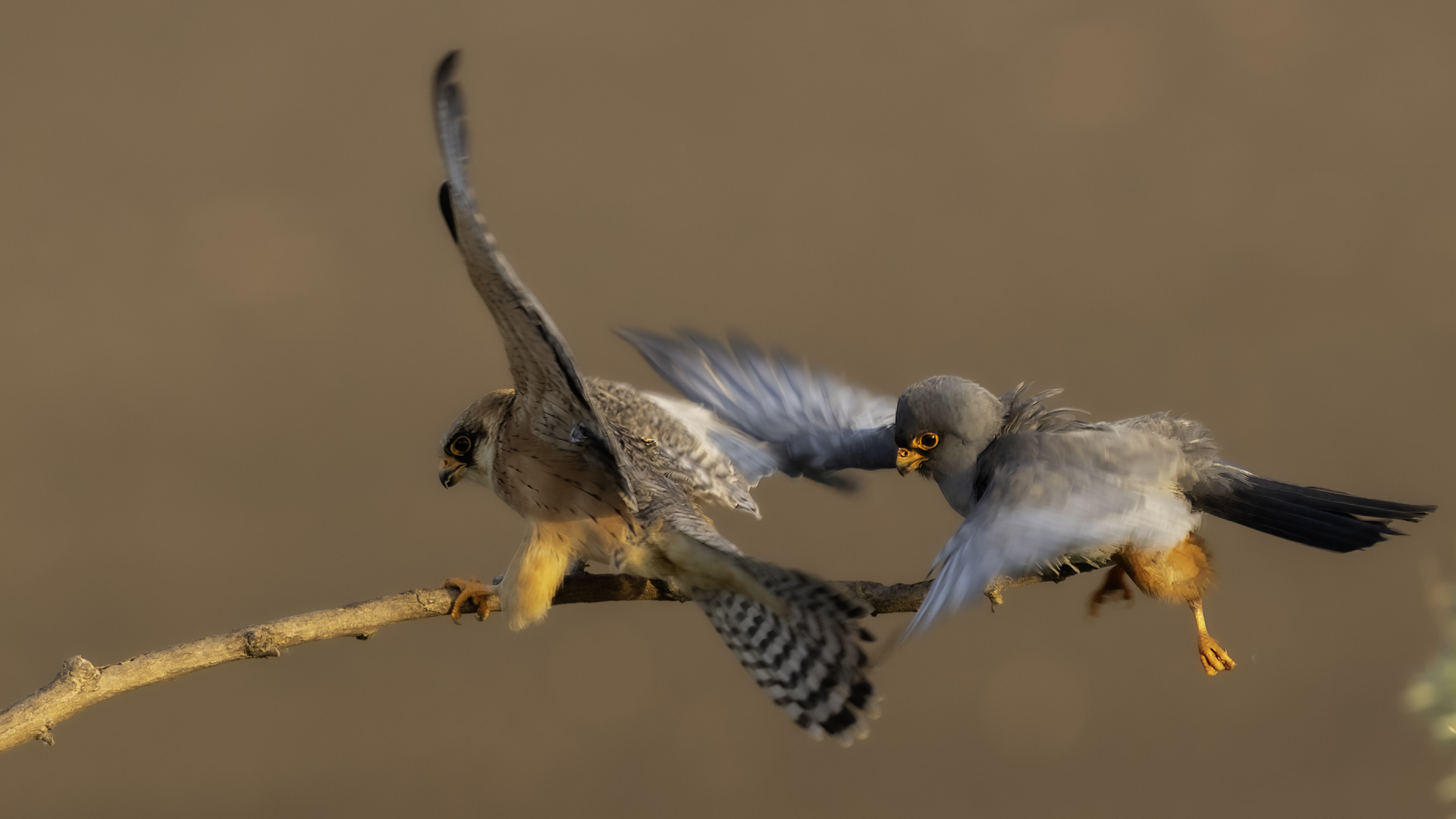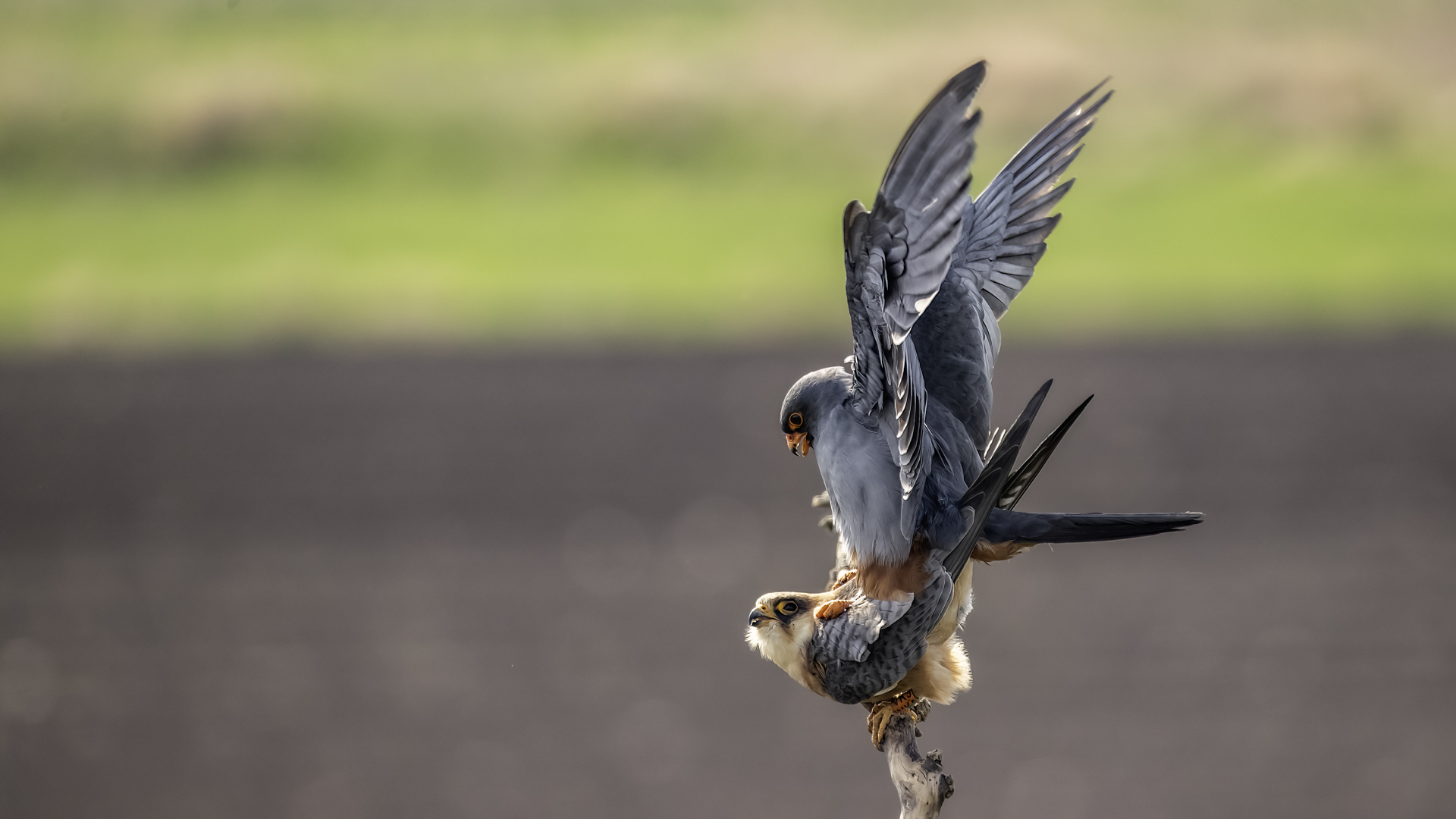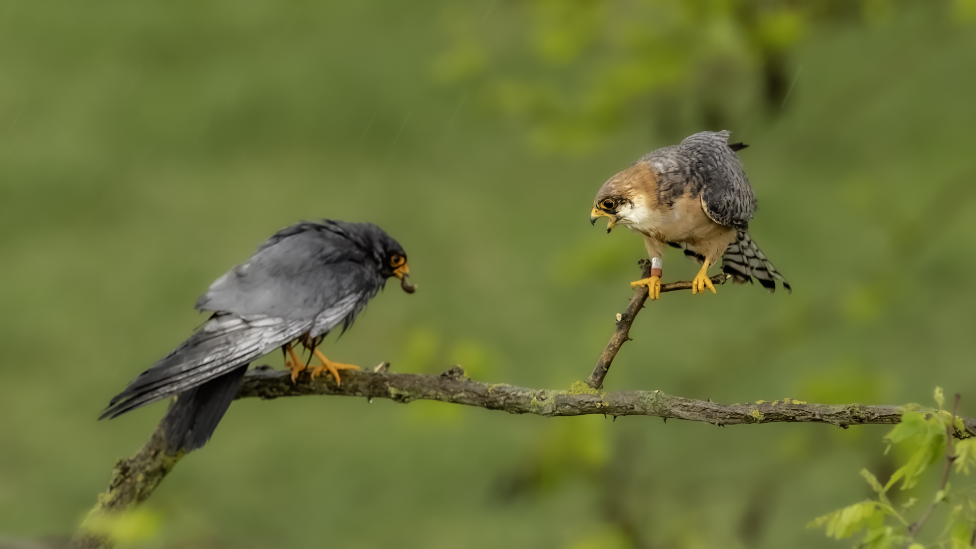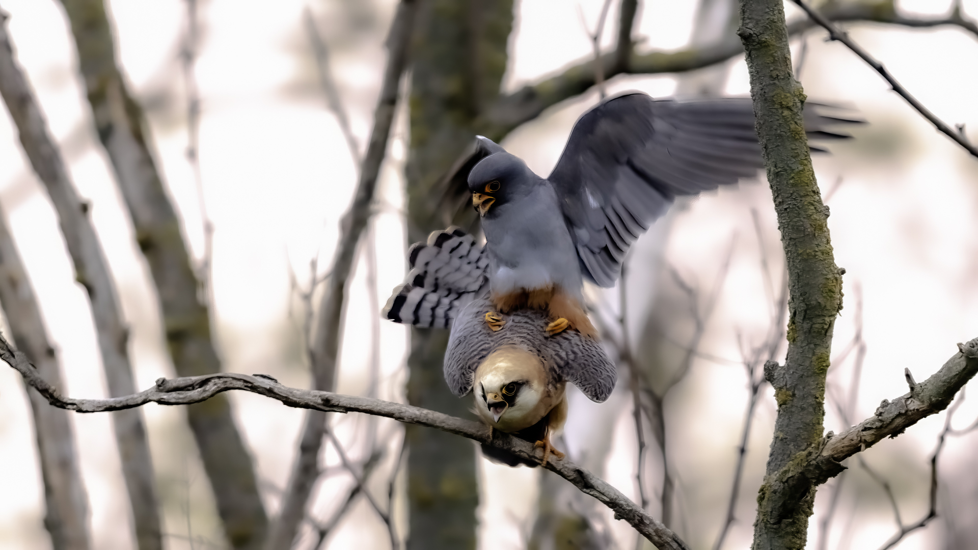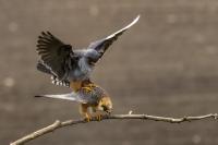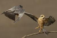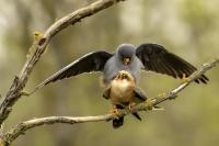Kobczyk wreszcie trafia do mojej galerii!  Wreszcie, bo od lat był w moich fotograficznych planach, ale w Polsce trudno o dobre zdjęcia tego przepięknego sokoła. W naszym kraju nie gniazduje, a mamy jedynie przyjemność go obserwować podczas przelotów. Prezentowane zdjęcia zostały wykonane na Węgrzech. Trzeba oddać naszym węgierskim organizatorom, że stworzyli warunki do obserwacji i fotografowania kobczyków. Czatownie kobczykowe to usytuowane na wysokości kilku metrów pomieszczenia, gdzie w odległości kilku metrów od fotografujących znajdują się budki lęgowe kobczyków, pustułek i kawek. W odległości około 10-ciu metrów od jednej z czatowni jest też budka lęgowa pójdźki. To dość  niesamowite taka mała kolonia kobczyków, pustułek, kawek i pójdźki, a w środku nich zakamuflowani fotografowie. Spędziłem około 30 -stu godzin wśród kobczyków i można było obserwować ich zaloty, zachowania godowe no i bójki o budkę lęgową, pomiędzy nimi, a kawkami czy pustułkami. Kobczyki z nich są najmniejsze, ale bez walk się nie obyło. Próbowały swoich sił i możliwości na tyle determinująco, że po jednej z bójek z kawkami, myślałem, że samiec kobczyka nie wyjdzie z tego cało. Początek maja był okresem zalotów i kopulacji kobczyków. O zdjęcia tych ptasich zbliżeń nie było trudno, pod warunkiem, że ptaki nie były odwrócone tyłem do nas. Dodałem też nagranie ścieżki dźwiękowej kobczyków o które nie było trudno. Samice niemal ciągle wydają głosy, takie piszczące, powtarzające się. Samce podobnie, ale czasami wydają też głos przypominający głos kretogłowa. Samice cały czas organizowały samcom czas. Siedzący na patyku samiec, często był przeganiany przez samicę, aby zajął się polowaniem. Po zrzuceniu z gałązki udawał się na polowanie. Po jakimś czasie wracał z drobnym gryzoniem lub większym owadem. Samica natychmiast odbierała upolowaną zdobycz i rozpoczęła konsumpcję. Tu następowała chwila ciszy, samiec mógł odpocząć podczas jej posiłku no i ona sama nie wydawała dźwięków. Po zjedzeniu natychmiast siadała na ulubionej gałązce w dość charakterystyczny sposób pokazujący samcowi, że jest gotowa do kopulacji. Do tego oczywiście charakterystyczny piskliwy dźwięk no i samiec nie ma wyjścia, podlatuje do samicy i rozpoczyna się kopulacja. I tak można rzec przez większość dnia. O te statyczne zdjęcia ptaków siedzących na gałązkach, czy kopulujących nie było problemu. Te dynamiczne w locie to już było wyzwanie. Sokoły, jak to sokoły, potrafią bardzo dynamicznie się przemieszczać. To stanowiło pierwszą trudność zrobienia zdjęć ptaków w locie. Druga to szyba, a właściwie lustro dzielące nas od ptaków. Wprawdzie jakość szyby nie była najgorsza, ale spowalniała autofocusa no i zdjęcia wykonywane pod znacznym katem z reguły były do wyrzucenia. Z setek prób udało się jednak kilka zdjęć pokazujące piękną sylwetkę sokoła w locie. Takie musiały powstać-przecież za to je podziwiamy!