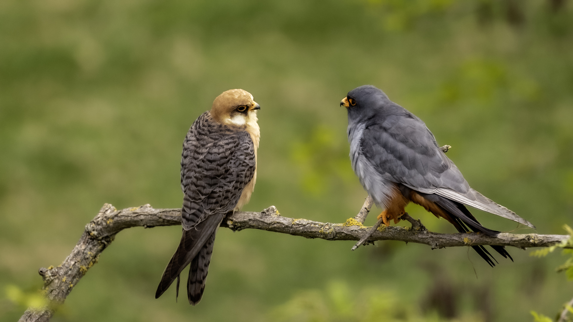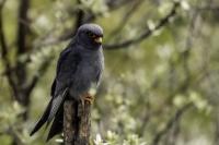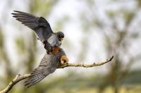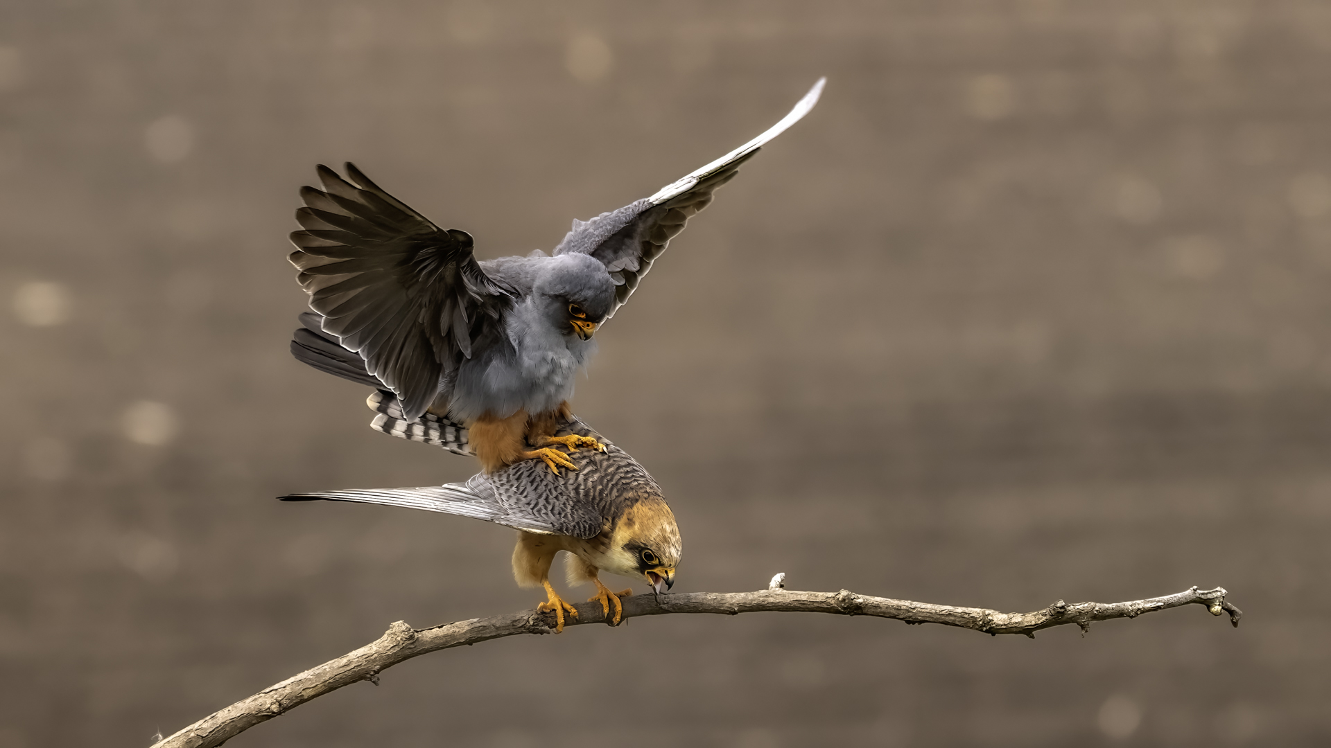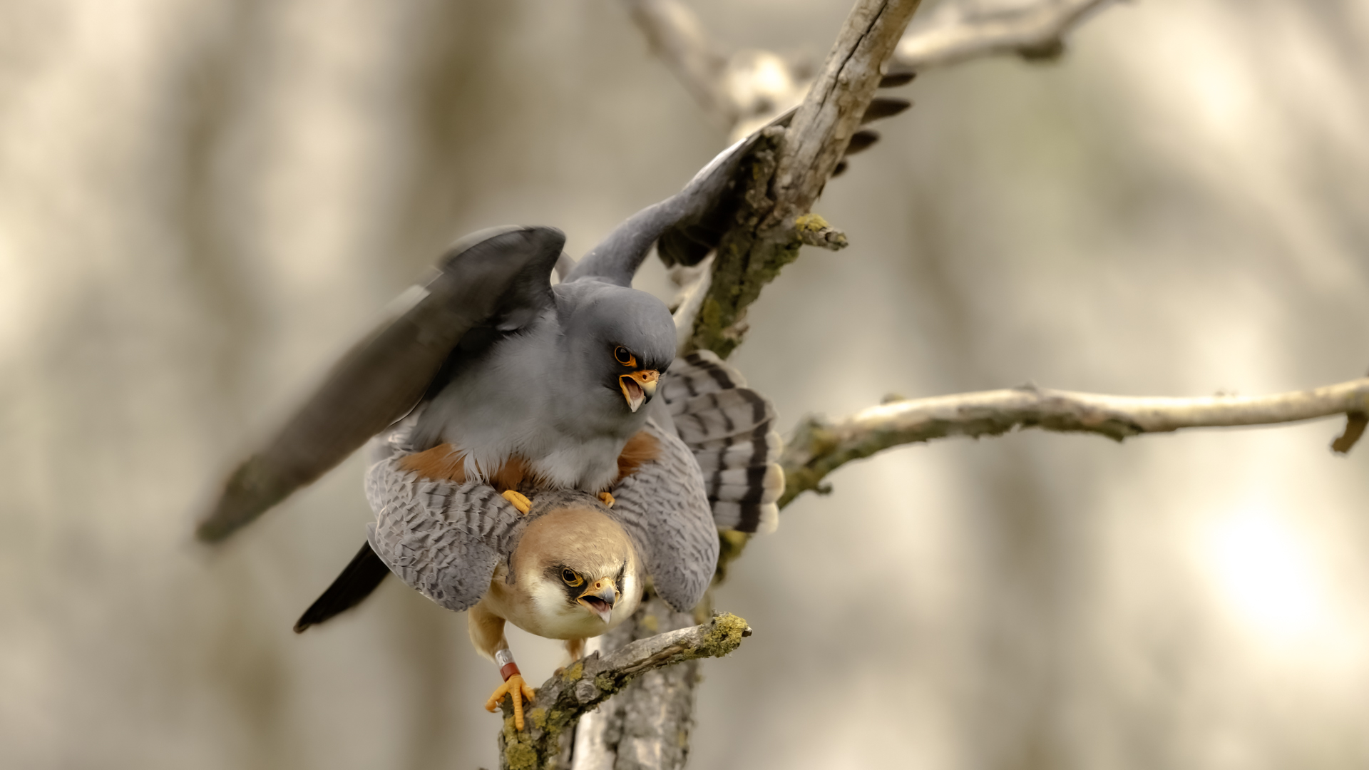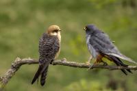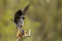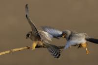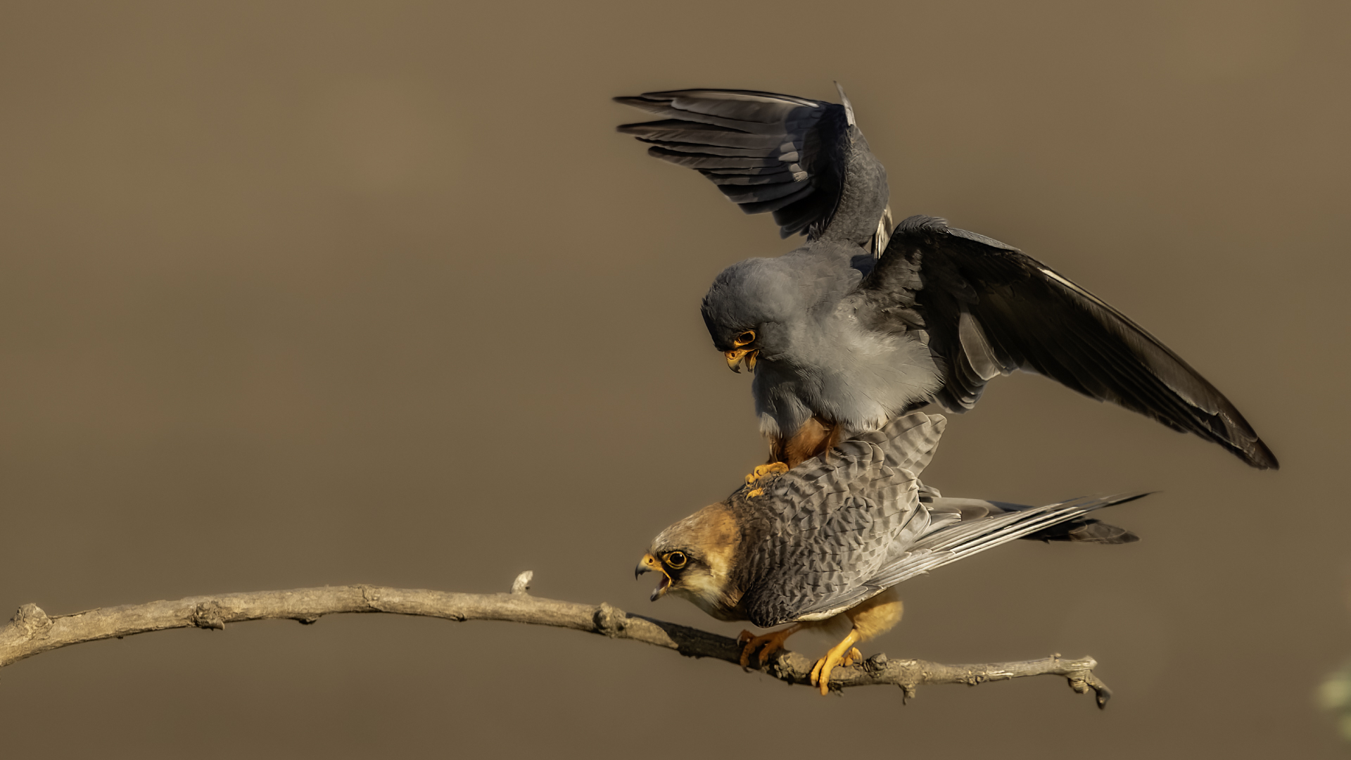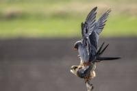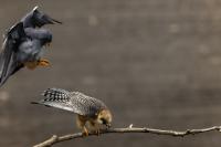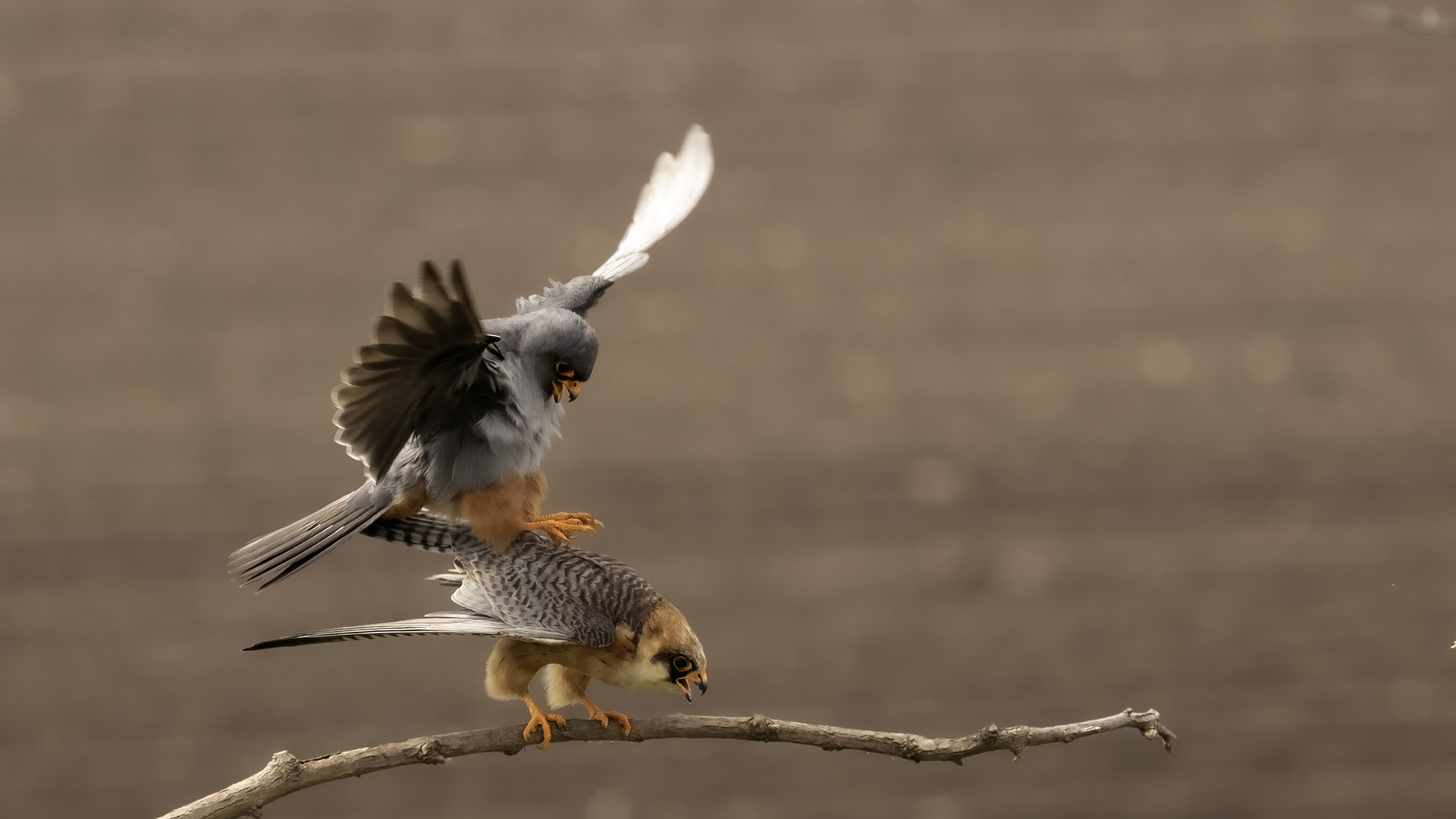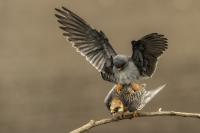 Kobczyk wreszcie trafia do mojej galerii!  Wreszcie, bo od lat był w moich fotograficznych planach, ale w Polsce trudno o dobre zdjęcia tego przepięknego sokoła. W naszym kraju nie gniazduje, a mamy jedynie przyjemność go obserwować podczas przelotów. Prezentowane zdjęcia zostały wykonane na Węgrzech. Trzeba oddać naszym węgierskim organizatorom, że stworzyli warunki do obserwacji i fotografowania kobczyków. Czatownie kobczykowe to usytuowane na wysokości kilku metrów pomieszczenia, gdzie w odległości kilku metrów od fotografujących znajdują się budki lęgowe kobczyków, pustułek i kawek. W odległości około 10-ciu metrów od jednej z czatowni jest też budka lęgowa pójdźki. To dość  niesamowite taka mała kolonia kobczyków, pustułek, kawek i pójdźki, a w środku nich zakamuflowani fotografowie. Spędziłem około 30 -stu godzin wśród kobczyków i można było obserwować ich zaloty, zachowania godowe no i bójki o budkę lęgową, pomiędzy nimi, a kawkami czy pustułkami. Kobczyki z nich są najmniejsze, ale bez walk się nie obyło. Próbowały swoich sił i możliwości na tyle determinująco, że po jednej z bójek z kawkami, myślałem, że samiec kobczyka nie wyjdzie z tego cało. Początek maja był okresem zalotów i kopulacji kobczyków. O zdjęcia tych ptasich zbliżeń nie było trudno, pod warunkiem, że ptaki nie były odwrócone tyłem do nas. Dodałem też nagranie ścieżki dźwiękowej kobczyków o które nie było trudno. Samice niemal ciągle wydają głosy, takie piszczące, powtarzające się. Samce podobnie, ale czasami wydają też głos przypominający głos kretogłowa. Samice cały czas organizowały samcom czas. Siedzący na patyku samiec, często był przeganiany przez samicę, aby zajął się polowaniem. Po zrzuceniu z gałązki udawał się na polowanie. Po jakimś czasie wracał z drobnym gryzoniem lub większym owadem. Samica natychmiast odbierała upolowaną zdobycz i rozpoczęła konsumpcję. Tu następowała chwila ciszy, samiec mógł odpocząć podczas jej posiłku no i ona sama nie wydawała dźwięków. Po zjedzeniu natychmiast siadała na ulubionej gałązce w dość charakterystyczny sposób pokazujący samcowi, że jest gotowa do kopulacji. Do tego oczywiście charakterystyczny piskliwy dźwięk no i samiec nie ma wyjścia, podlatuje do samicy i rozpoczyna się kopulacja. I tak można rzec przez większość dnia. O te statyczne zdjęcia ptaków siedzących na gałązkach, czy kopulujących nie było problemu. Te dynamiczne w locie to już było wyzwanie. Sokoły, jak to sokoły, potrafią bardzo dynamicznie się przemieszczać. To stanowiło pierwszą trudność zrobienia zdjęć ptaków w locie. Druga to szyba, a właściwie lustro dzielące nas od ptaków. Wprawdzie jakość szyby nie była najgorsza, ale spowalniała autofocusa no i zdjęcia wykonywane pod znacznym katem z reguły były do wyrzucenia. Z setek prób udało się jednak kilka zdjęć pokazujące piękną sylwetkę sokoła w locie. Takie musiały powstać-przecież za to je podziwiamy!