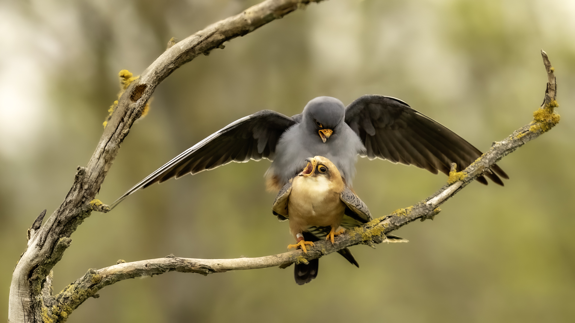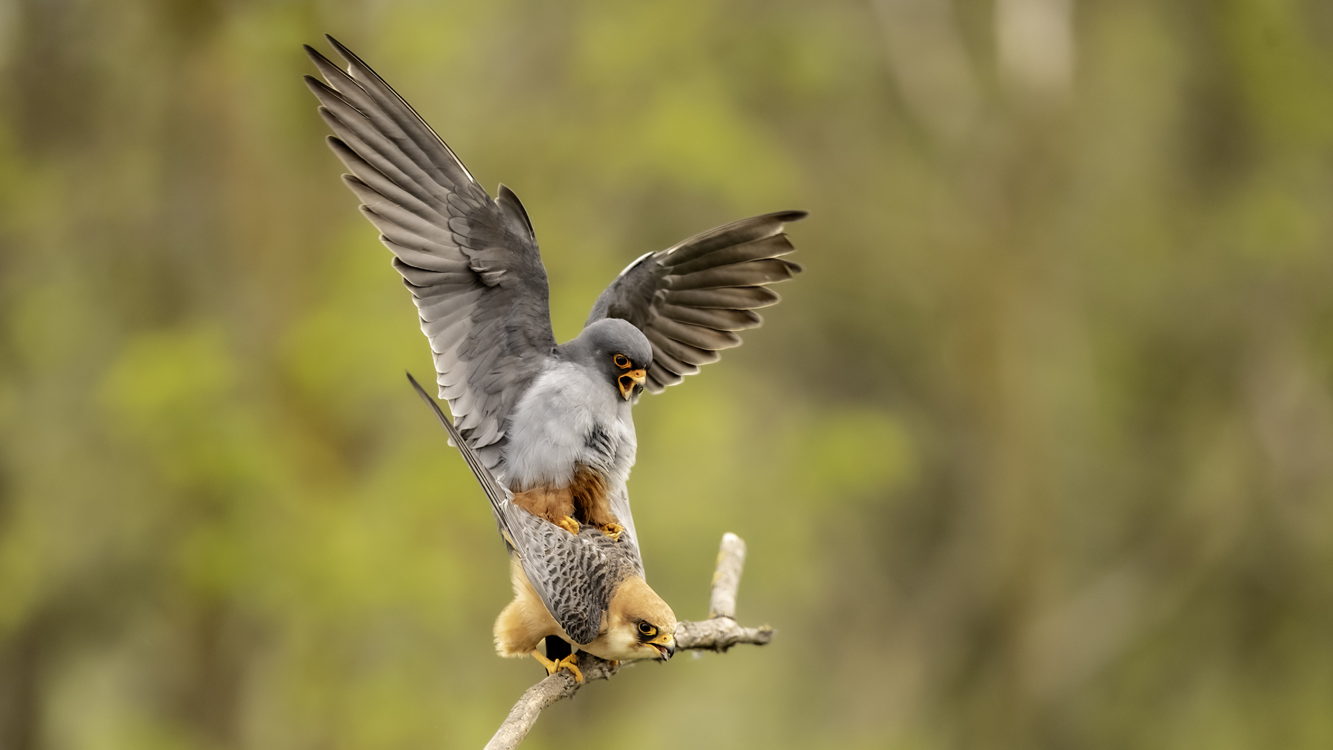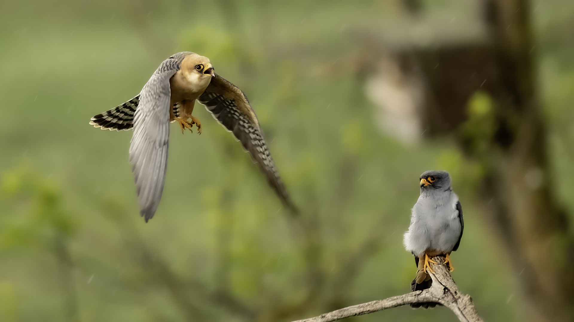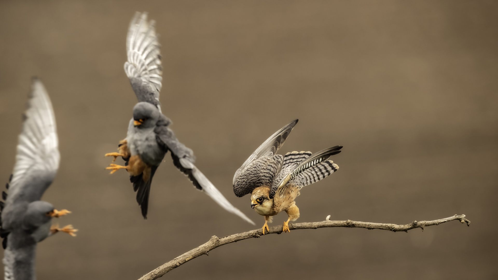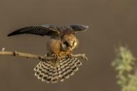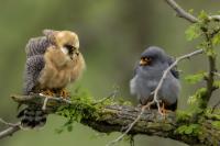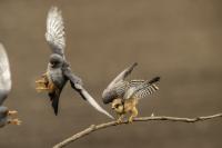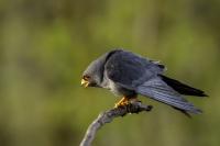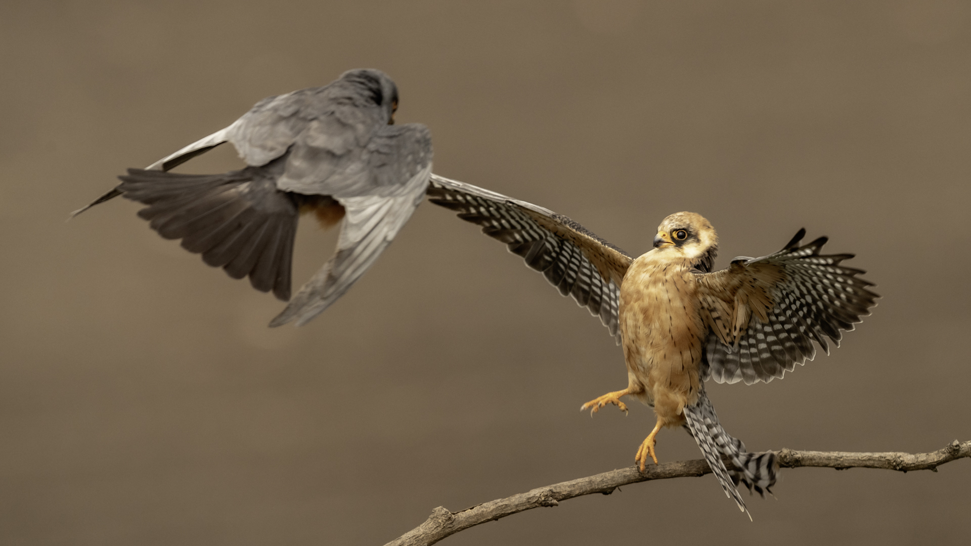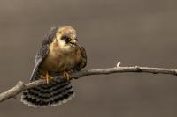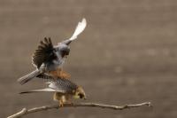 Kobczyk wreszcie trafia do mojej galerii!  Wreszcie, bo od lat był w moich fotograficznych planach, ale w Polsce trudno o dobre zdjęcia tego przepięknego sokoła. W naszym kraju nie gniazduje, a mamy jedynie przyjemność go obserwować podczas przelotów. Prezentowane zdjęcia zostały wykonane na Węgrzech. Trzeba oddać naszym węgierskim organizatorom, że stworzyli warunki do obserwacji i fotografowania kobczyków. Czatownie kobczykowe to usytuowane na wysokości kilku metrów pomieszczenia, gdzie w odległości kilku metrów od fotografujących znajdują się budki lęgowe kobczyków, pustułek i kawek. W odległości około 10-ciu metrów od jednej z czatowni jest też budka lęgowa pójdźki. To dość  niesamowite taka mała kolonia kobczyków, pustułek, kawek i pójdźki, a w środku nich zakamuflowani fotografowie. Spędziłem około 30 -stu godzin wśród kobczyków i można było obserwować ich zaloty, zachowania godowe no i bójki o budkę lęgową, pomiędzy nimi, a kawkami czy pustułkami. Kobczyki z nich są najmniejsze, ale bez walk się nie obyło. Próbowały swoich sił i możliwości na tyle determinująco, że po jednej z bójek z kawkami, myślałem, że samiec kobczyka nie wyjdzie z tego cało. Początek maja był okresem zalotów i kopulacji kobczyków. O zdjęcia tych ptasich zbliżeń nie było trudno, pod warunkiem, że ptaki nie były odwrócone tyłem do nas. Dodałem też nagranie ścieżki dźwiękowej kobczyków o które nie było trudno. Samice niemal ciągle wydają głosy, takie piszczące, powtarzające się. Samce podobnie, ale czasami wydają też głos przypominający głos kretogłowa. Samice cały czas organizowały samcom czas. Siedzący na patyku samiec, często był przeganiany przez samicę, aby zajął się polowaniem. Po zrzuceniu z gałązki udawał się na polowanie. Po jakimś czasie wracał z drobnym gryzoniem lub większym owadem. Samica natychmiast odbierała upolowaną zdobycz i rozpoczęła konsumpcję. Tu następowała chwila ciszy, samiec mógł odpocząć podczas jej posiłku no i ona sama nie wydawała dźwięków. Po zjedzeniu natychmiast siadała na ulubionej gałązce w dość charakterystyczny sposób pokazujący samcowi, że jest gotowa do kopulacji. Do tego oczywiście charakterystyczny piskliwy dźwięk no i samiec nie ma wyjścia, podlatuje do samicy i rozpoczyna się kopulacja. I tak można rzec przez większość dnia. O te statyczne zdjęcia ptaków siedzących na gałązkach, czy kopulujących nie było problemu. Te dynamiczne w locie to już było wyzwanie. Sokoły, jak to sokoły, potrafią bardzo dynamicznie się przemieszczać. To stanowiło pierwszą trudność zrobienia zdjęć ptaków w locie. Druga to szyba, a właściwie lustro dzielące nas od ptaków. Wprawdzie jakość szyby nie była najgorsza, ale spowalniała autofocusa no i zdjęcia wykonywane pod znacznym katem z reguły były do wyrzucenia. Z setek prób udało się jednak kilka zdjęć pokazujące piękną sylwetkę sokoła w locie. Takie musiały powstać-przecież za to je podziwiamy!