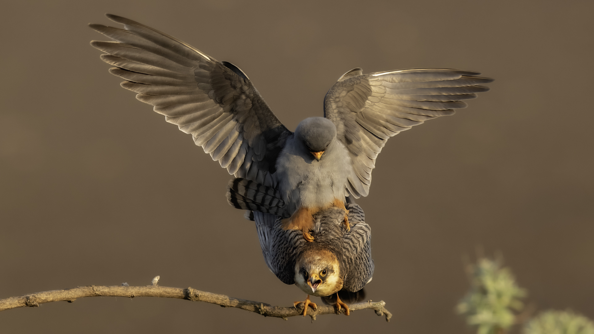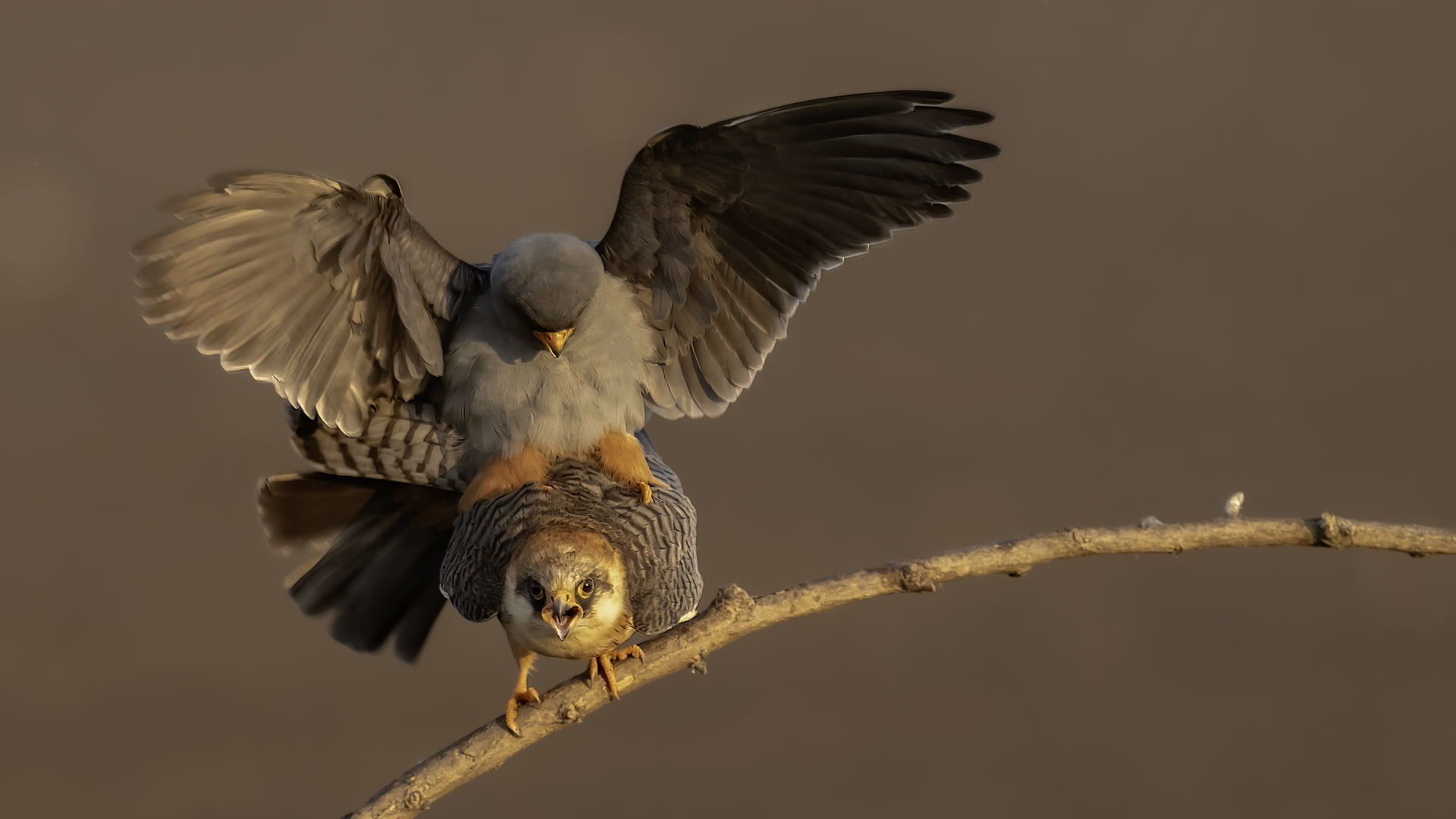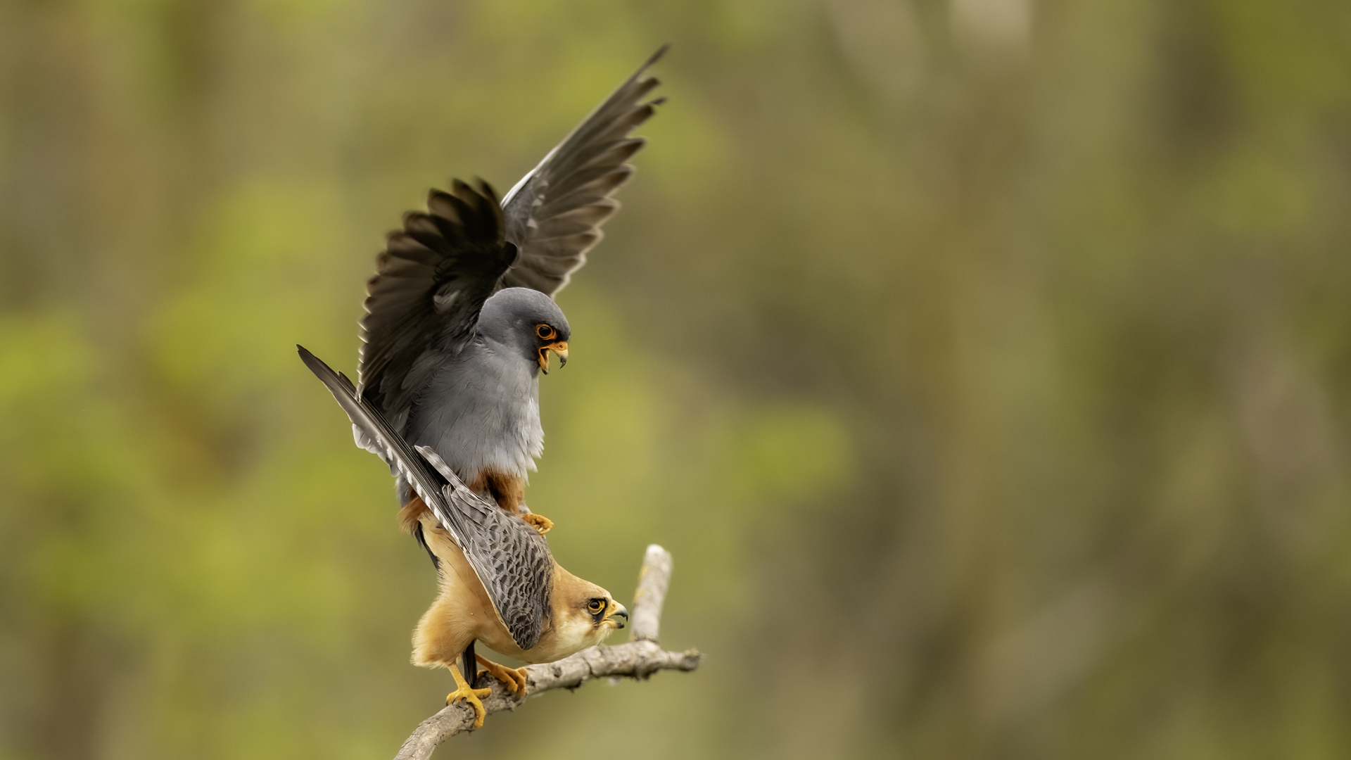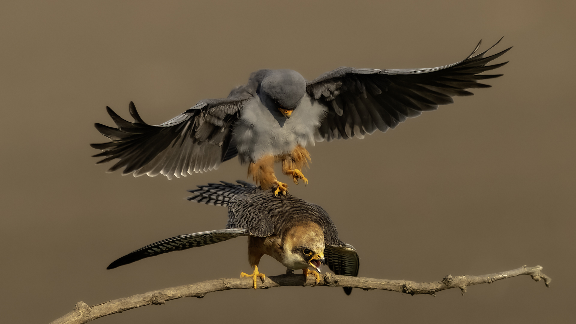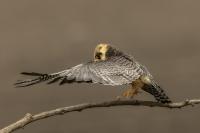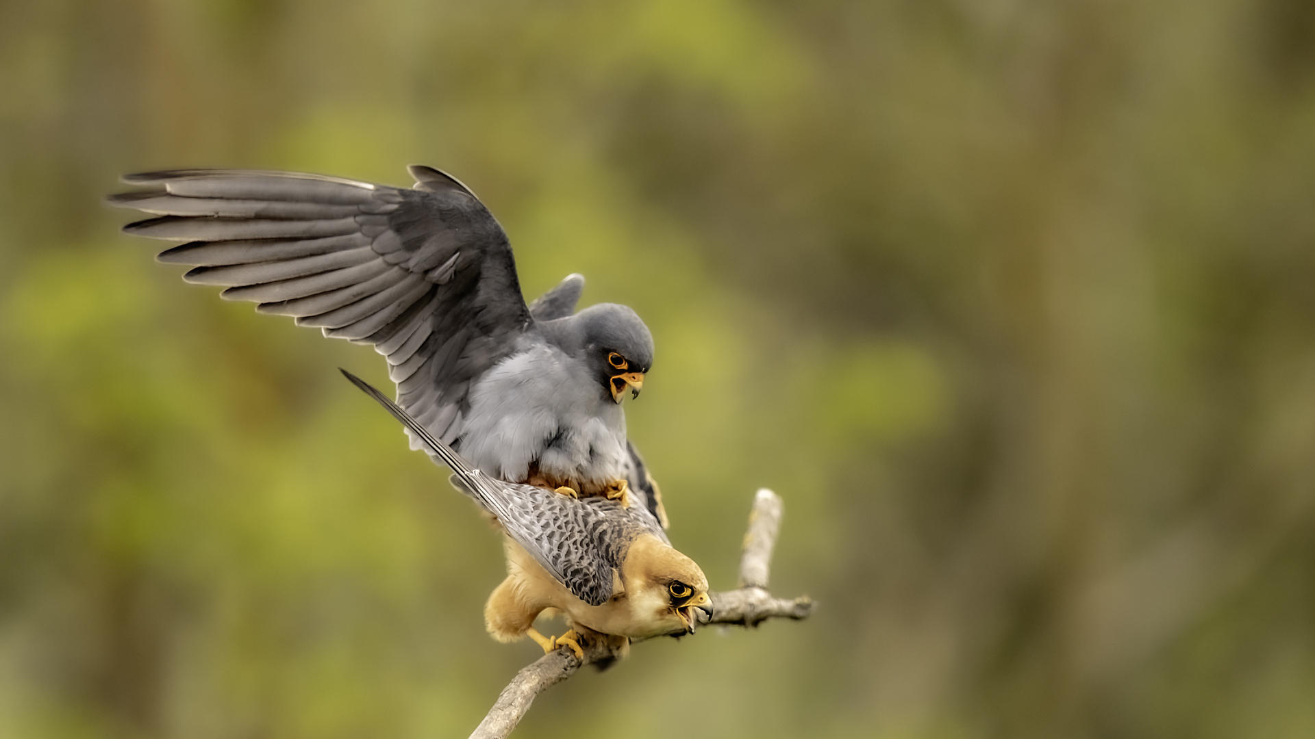 Kobczyk wreszcie trafia do mojej galerii!  Wreszcie, bo od lat był w moich fotograficznych planach, ale w Polsce trudno o dobre zdjęcia tego przepięknego sokoła. W naszym kraju nie gniazduje, a mamy jedynie przyjemność go obserwować podczas przelotów. Prezentowane zdjęcia zostały wykonane na Węgrzech. Trzeba oddać naszym węgierskim organizatorom, że stworzyli warunki do obserwacji i fotografowania kobczyków. Czatownie kobczykowe to usytuowane na wysokości kilku metrów pomieszczenia, gdzie w odległości kilku metrów od fotografujących znajdują się budki lęgowe kobczyków, pustułek i kawek. W odległości około 10-ciu metrów od jednej z czatowni jest też budka lęgowa pójdźki. To dość  niesamowite taka mała kolonia kobczyków, pustułek, kawek i pójdźki, a w środku nich zakamuflowani fotografowie. Spędziłem około 30 -stu godzin wśród kobczyków i można było obserwować ich zaloty, zachowania godowe no i bójki o budkę lęgową, pomiędzy nimi, a kawkami czy pustułkami. Kobczyki z nich są najmniejsze, ale bez walk się nie obyło. Próbowały swoich sił i możliwości na tyle determinująco, że po jednej z bójek z kawkami, myślałem, że samiec kobczyka nie wyjdzie z tego cało. Początek maja był okresem zalotów i kopulacji kobczyków. O zdjęcia tych ptasich zbliżeń nie było trudno, pod warunkiem, że ptaki nie były odwrócone tyłem do nas. Dodałem też nagranie ścieżki dźwiękowej kobczyków o które nie było trudno. Samice niemal ciągle wydają głosy, takie piszczące, powtarzające się. Samce podobnie, ale czasami wydają też głos przypominający głos kretogłowa. Samice cały czas organizowały samcom czas. Siedzący na patyku samiec, często był przeganiany przez samicę, aby zajął się polowaniem. Po zrzuceniu z gałązki udawał się na polowanie. Po jakimś czasie wracał z drobnym gryzoniem lub większym owadem. Samica natychmiast odbierała upolowaną zdobycz i rozpoczęła konsumpcję. Tu następowała chwila ciszy, samiec mógł odpocząć podczas jej posiłku no i ona sama nie wydawała dźwięków. Po zjedzeniu natychmiast siadała na ulubionej gałązce w dość charakterystyczny sposób pokazujący samcowi, że jest gotowa do kopulacji. Do tego oczywiście charakterystyczny piskliwy dźwięk no i samiec nie ma wyjścia, podlatuje do samicy i rozpoczyna się kopulacja. I tak można rzec przez większość dnia. O te statyczne zdjęcia ptaków siedzących na gałązkach, czy kopulujących nie było problemu. Te dynamiczne w locie to już było wyzwanie. Sokoły, jak to sokoły, potrafią bardzo dynamicznie się przemieszczać. To stanowiło pierwszą trudność zrobienia zdjęć ptaków w locie. Druga to szyba, a właściwie lustro dzielące nas od ptaków. Wprawdzie jakość szyby nie była najgorsza, ale spowalniała autofocusa no i zdjęcia wykonywane pod znacznym katem z reguły były do wyrzucenia. Z setek prób udało się jednak kilka zdjęć pokazujące piękną sylwetkę sokoła w locie. Takie musiały powstać-przecież za to je podziwiamy!