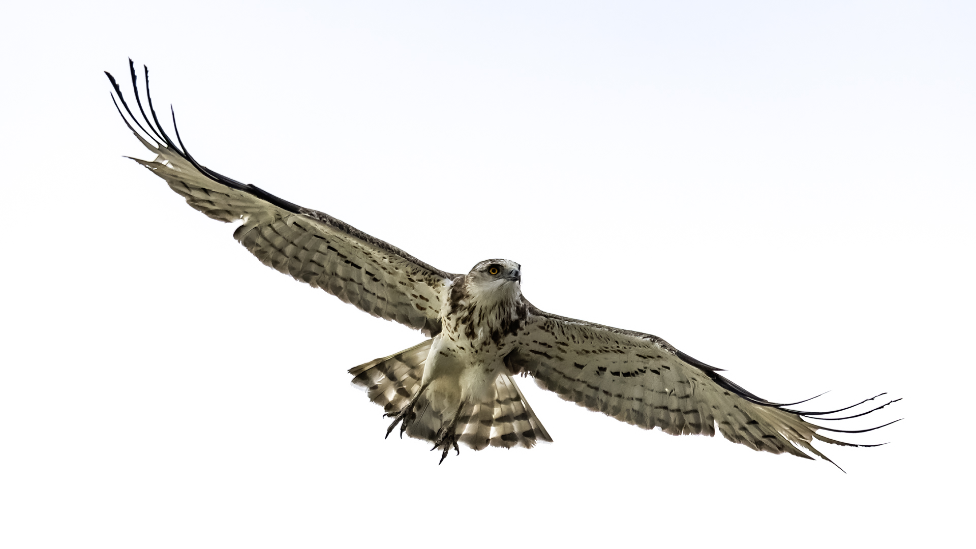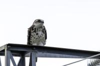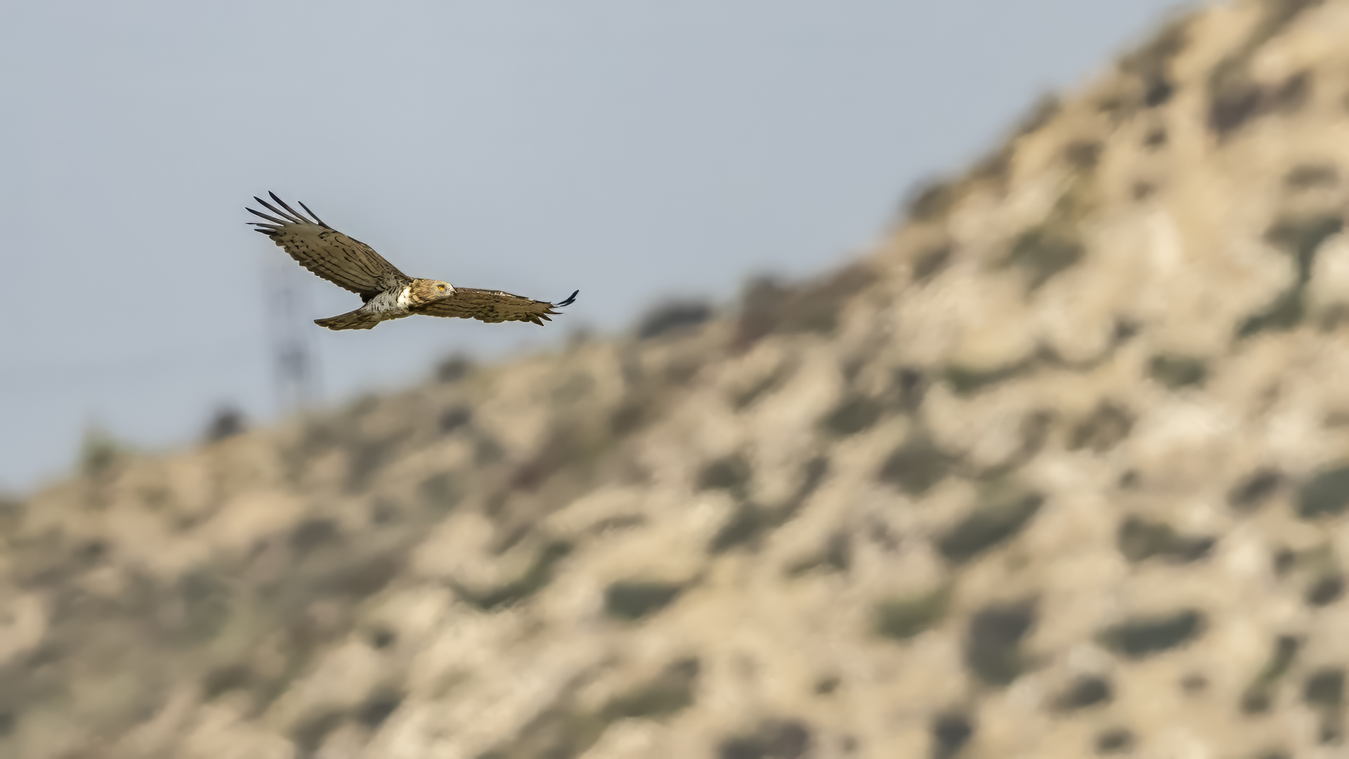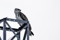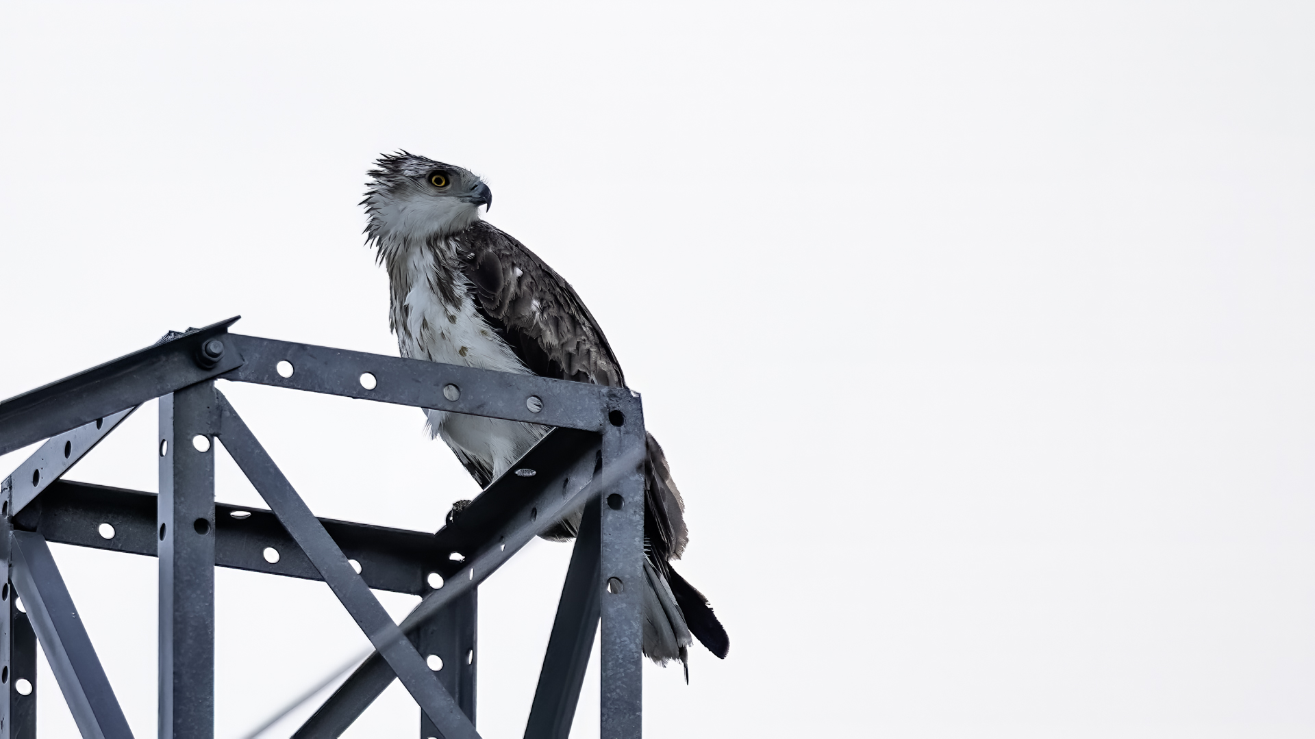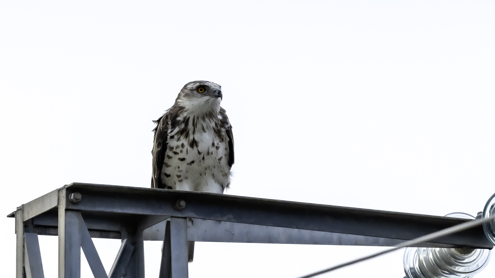 No nie tak sobie wyobrażałem moje pierwsze spotkanie z gadożerem. Odległość była tak znaczna, że 600 milimetrowy obiektyw z konwerterem 2x nie wystarczył i zdjęcia są mocno kadrowane. Na domiar złego ta stalowa konstrukcja sieci wysokiego napięcia to też nie wymarzone tło dla przedstawienia tego pięknego ptaka. Próba zmniejszenia odległości o chociaż kilkadziesiąt metrów zakończyła sie odlotem ptaka. No cóż takie zdjęcia "startowe" muszą na razie wystarczyć  i chyba niestety na długo, bo to w Polsce skrajnie nieliczny ptak (kilkanaście par) i trudno będzie o nowe, lepsze ujęcia, przynajmniej u nas w kraju. Jest nieco większy od naszego myszołowa, bo masa jego ciała może osiągnąć do 2 kilogramów, a rozpiętość skrzydeł to około 1,8 metra.