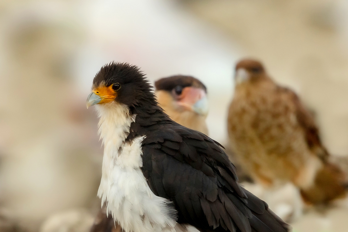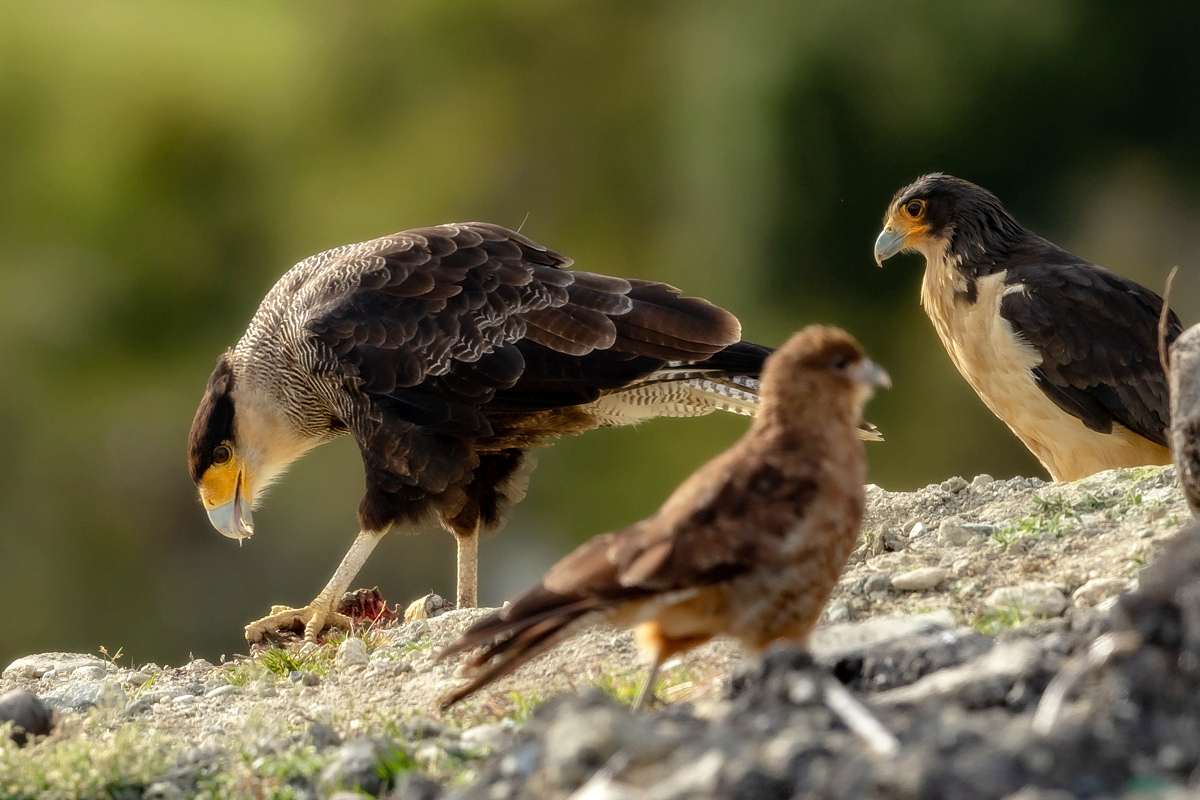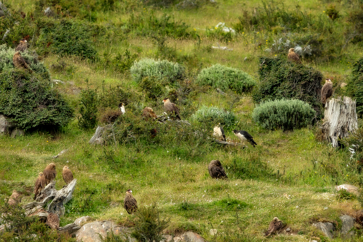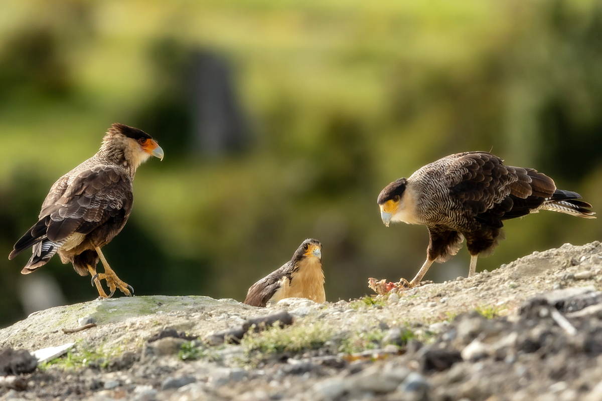 Dość niespotykany plener, jak na dotychczasowe fotografowanie. Kilkanaście minut jazdy taksówką za Ushuaia, by na obrzeżach składowiska śmieci zobaczyć, już nie dziesiątki, ale setki karakar w trzech gatunkach. Najbardziej popularna była karakara czarnobrzucha. Największa i najsilniejsza. Drugi co do liczebności gatunek, to trębacz brązowy. Najmniej liczna była karakara patagońska. Było jej najmniej i była najmniej aktywna. Z trzech wymienionych gatunków, tylko, jej głosu nie udało się mi nagrać. Karakary czarnobrzucheche, często wydawały z siebie odgłos, wychylając do tyłu głowę i szyję. Z nagraniem dźwięku nie było problemów. Na przepięknym, graniczącym ze składowiskiem wzgórzu, nie raz w kadrze było widać kilka ptaków na raz. Czekaliśmy za ich przelotem na i z składowiska. Tak powstały prezentowane zdjęcia w dwóch próbach. Druga próba fotografowania wspomagana była kupionymi kurzymi udkami, jak się okazało niepotrzebnie. Karakary nie czekały nawet minuty na nasze odejście na kilkanaście metrów, zaraz zaczęły rywalizacje o pożywienie. Było ich tak wiele, że trzeba było po prostu trochę czasu, cierpliwości do wykonania zdjęć. Takie skupisko karakar to niesamowity widok. W tle widać dość spore skupisko mewy południowej i co jakiś czas pojawia się wydrzyk wielki. Obecność pracujących w maszynach ludzi, nie specjalnie im przeszkadzała. Poniżej przedstawiam cechy charakterystyczne dla wymienionych gatunków: