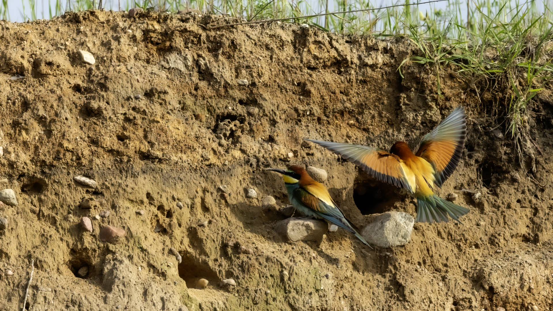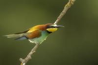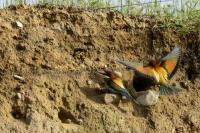 Dodałem kilka zdjęć żołny wykonanych tym razem w naszym kraju. Zdjęcia wykonane znów dzięki życzliwości ludzkiej ( Piotr dziękuję i pozdrawiam). Niestety kolonia składała się tylko z dwóch par i zachowywała się zgoła odmiennie od licznej koloni hiszpańskiej. Tam ptaki lekceważyły ludzką obecność. Tu trzeba było zachować dość znaczną odległość, aby móc wykonać zdjęcia. Dość osobliwe miejsce, bo usytuowane w pobliżu drogi. Zdjęć może powstało niewiele, ale obserwacje tego charakterystycznego lotu żołny, przepięknego barwnego szybownika zapada w pamięci i już tylko dlatego warto było...