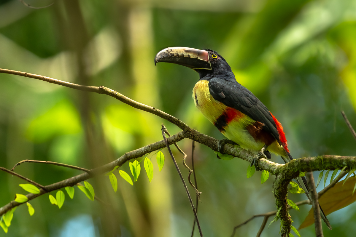 Podobnie jak w przypadku kolibrów, także dla tukanów tekst będzie wspólny dla wyjazdu na Kostarykę. Także i w przypadku tej grupy ptaków los okazał się łaskawy pod względem wykonanych zdjęć, bo udało się sfotografować 4 z 7 gatunków tukanów występujących na Kostaryce. Jak zwykle z różnym skutkiem. Arasari obrożny i tukan czarnodzioby dwa razy podeszły tak blisko miejsca wykładania pożywienia, że aby objąć w kadrze całego ptaka, trzeba było odsunąć się o kilka metrów. Obserwacja tukanów z tak bliska to coś niesamowitego. W swym kolorowym upierzeniu, aksamitnie gładkim, z potężnym dziobem, wyglądają jak dziecięce maskotki, rajskie ptaki. Siadają na gałęzi i bardzo powoli przekręcają głowę z lewa do prawa, w górę i w dół, jakby obserwując teren dokładnie go skanowały. Chyba nie są tylko owocożerne, bo po ich przylocie odlatywały wszystkie ptaki drobnej postury. Tak jak w przypadku tukana czarnodziobego i arasari obrożnego spotkań było kilka, tak w przypadku tukana tęczodziobego i pieprzojada szmaragdowego - tylko jedno. Tukan tęczodzioby  pojawił się w koronie drzewa, powstało więc kilka dokumentacyjnych zdjęć z naszego spotkania. Pieprzojad podczas jednej sesji zdjęciowej pojawił się kilkakrotnie i było już z czego wybierać zdjęcia do galerii. Fotografując kolibry w pewnym momencie po lewej stronie dało się usłyszeć wyraźne odgłosy. Nie wiedziałem oczywiście czyje są to głosy, więc zabrałem sprzęt do nagrywania i udałem się w ich kierunku. Były to dwa tukany czarnodziobe, które bez problemu udało się nagrać. Po raz pierwszy więc w mojej galerii pojawia się ścieżka dźwiękowa z nagraniem tukana, a do dwóch galerii tukanów dodane są zdjęcia kolejnych 4 gatunków, a co ważne znacznie lepszej jakości niż dotychczasowe.