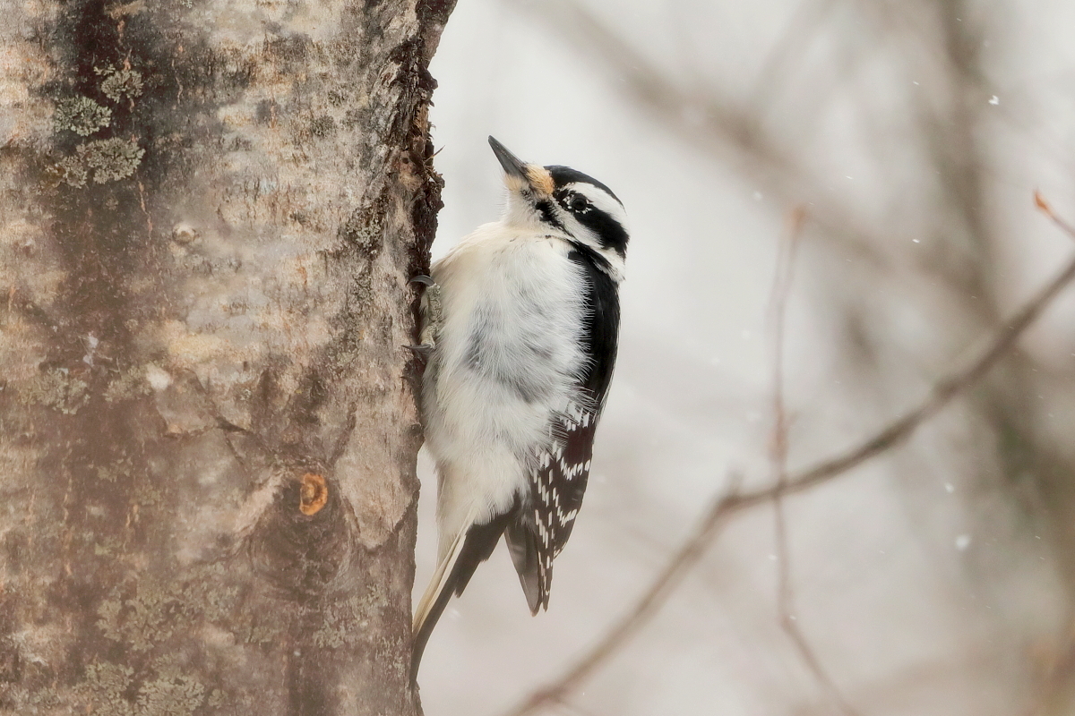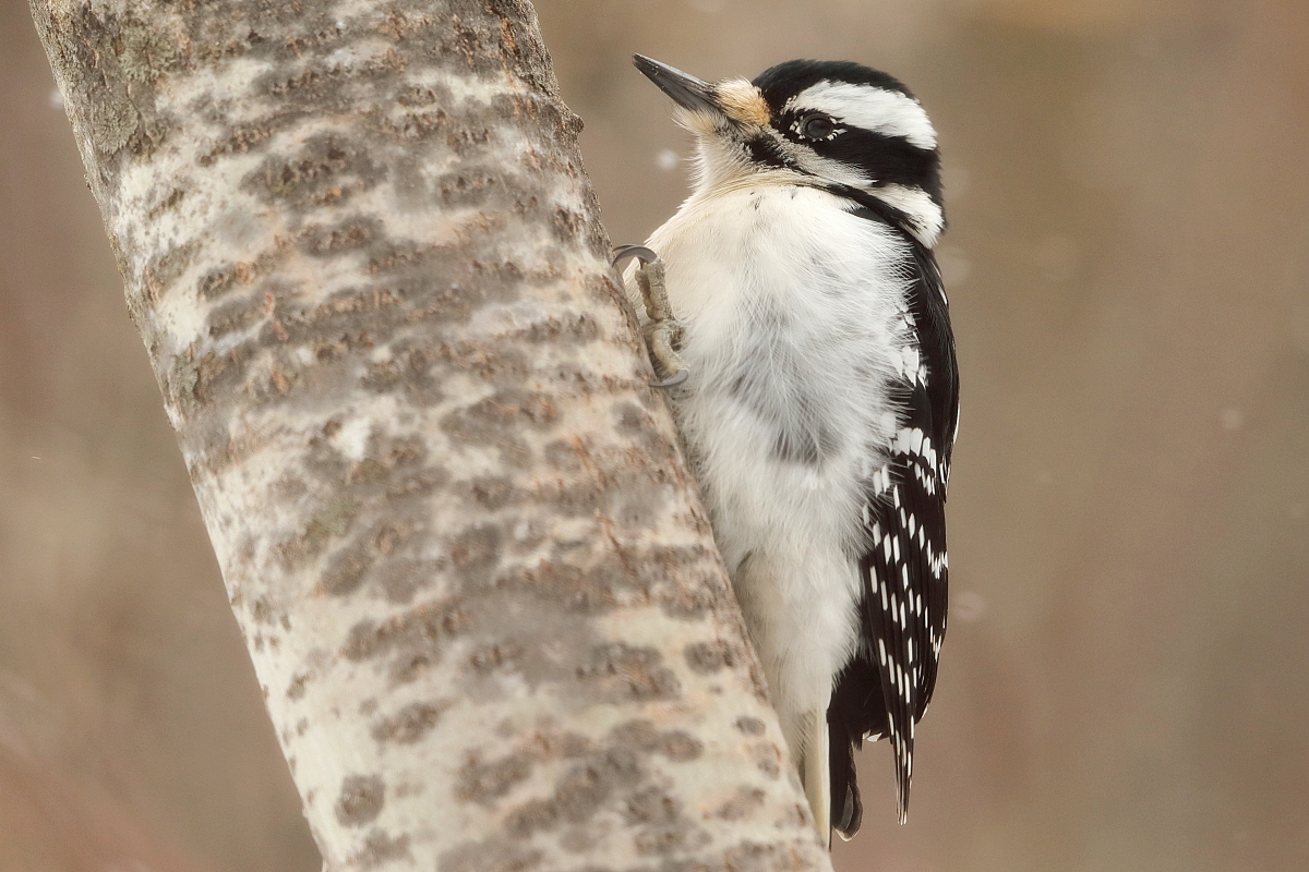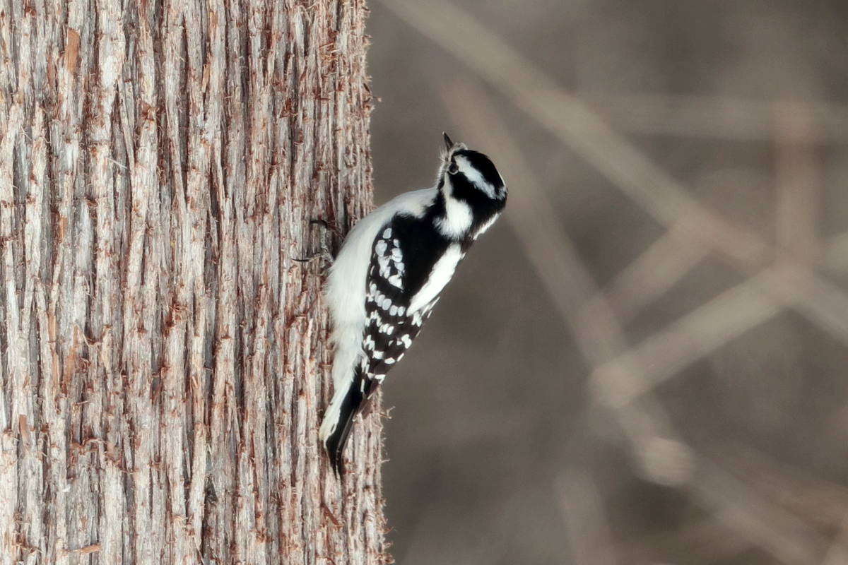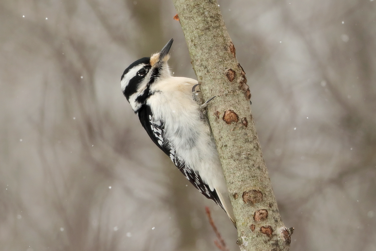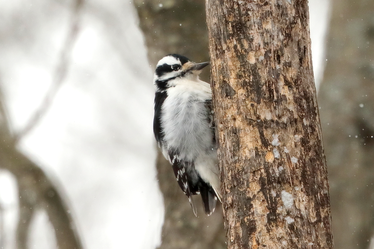 Ten gatunek tego dzięcioła występuje wyłącznie w Ameryce Północnej. Tam, jak na moje obserwacje jest chyba najpopularniejszym gatunkiem. Fotografowałem go w miejscach dokarmiania ptaków, zimą i praktycznie zawsze był obecny w każdym miejscu jakie odwiedziłem. Jak na dzięcioła to chyba najmniejszy dzięcioł Ameryki Północnej. Waga jego ciała to 20-30 gramów, przy rozpiętości skrzydeł do 30 cm (wróbel !). Fotografując dzięcioły w Polsce, nawet zimą nie ma gatunku, który akceptowałby taki bliski kontakt, nie mówiąc już o tak licznym występowaniu w osiedlach ludzkich, czy obrzeżach miast. Najczęściej w Polsce da się obserwować dzięcioła dużego (80g, rozpiętość skrzydeł 40 cm), ale odległość do 10 metrów jest nieosiągalna do uzyskania bez maskowania. Fotografowane dzięcioły kosmate, zdarzało się, że podlatywały na kilka metrów, niestety na krótko aby zdążyć przekierować obiektyw, wyostrzyć i wykonać zdjęcie. Za to podczas wydłubywania nasion z koszyczków, były tam na tyle długo zabsorbowane posilaniem się, że pozwalały na wykonanie zdjęć z kilku metrów (6-8). Głód, czy mniejszy lęk przed człowiekiem spowodowały takie zachowanie?