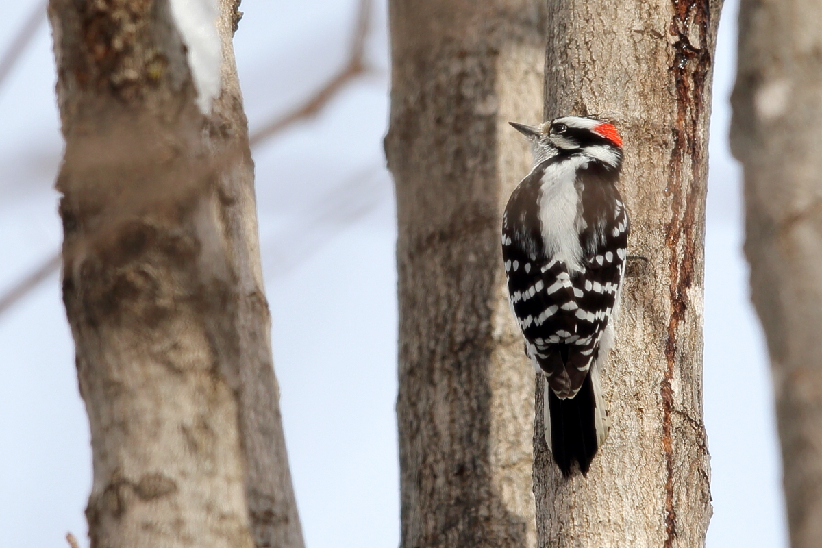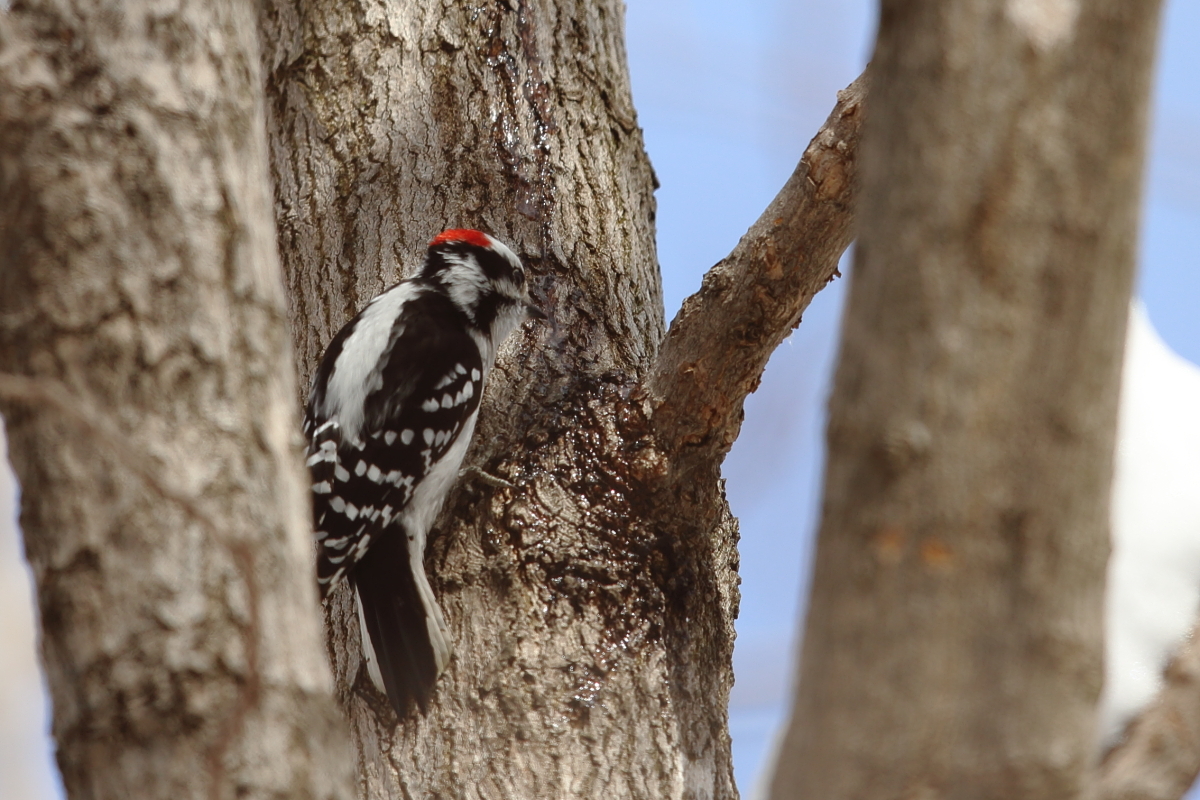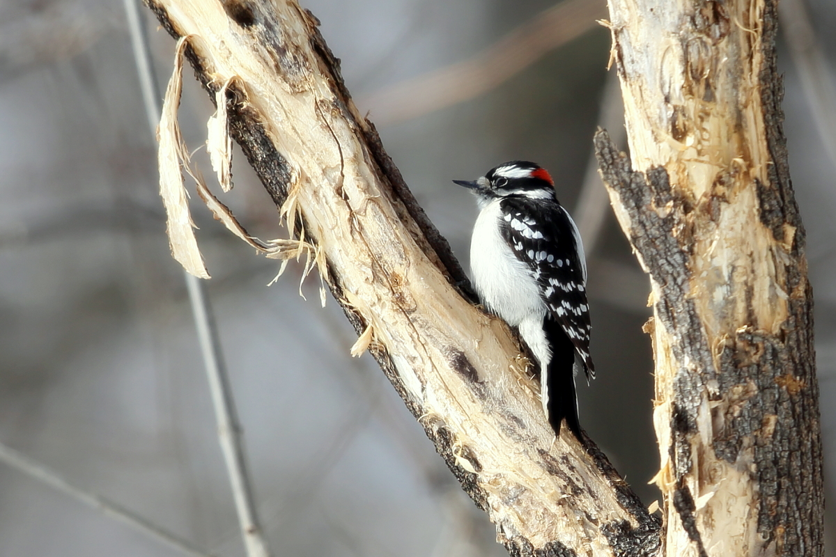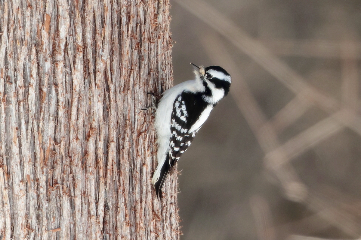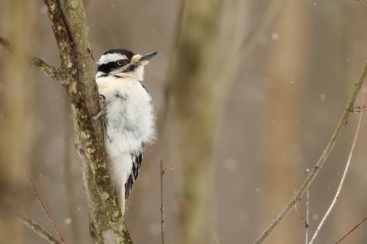 Ten gatunek tego dzięcioła występuje wyłącznie w Ameryce Północnej. Tam, jak na moje obserwacje jest chyba najpopularniejszym gatunkiem. Fotografowałem go w miejscach dokarmiania ptaków, zimą i praktycznie zawsze był obecny w każdym miejscu jakie odwiedziłem. Jak na dzięcioła to chyba najmniejszy dzięcioł Ameryki Północnej. Waga jego ciała to 20-30 gramów, przy rozpiętości skrzydeł do 30 cm (wróbel !). Fotografując dzięcioły w Polsce, nawet zimą nie ma gatunku, który akceptowałby taki bliski kontakt, nie mówiąc już o tak licznym występowaniu w osiedlach ludzkich, czy obrzeżach miast. Najczęściej w Polsce da się obserwować dzięcioła dużego (80g, rozpiętość skrzydeł 40 cm), ale odległość do 10 metrów jest nieosiągalna do uzyskania bez maskowania. Fotografowane dzięcioły kosmate, zdarzało się, że podlatywały na kilka metrów, niestety na krótko aby zdążyć przekierować obiektyw, wyostrzyć i wykonać zdjęcie. Za to podczas wydłubywania nasion z koszyczków, były tam na tyle długo zabsorbowane posilaniem się, że pozwalały na wykonanie zdjęć z kilku metrów (6-8). Głód, czy mniejszy lęk przed człowiekiem spowodowały takie zachowanie?