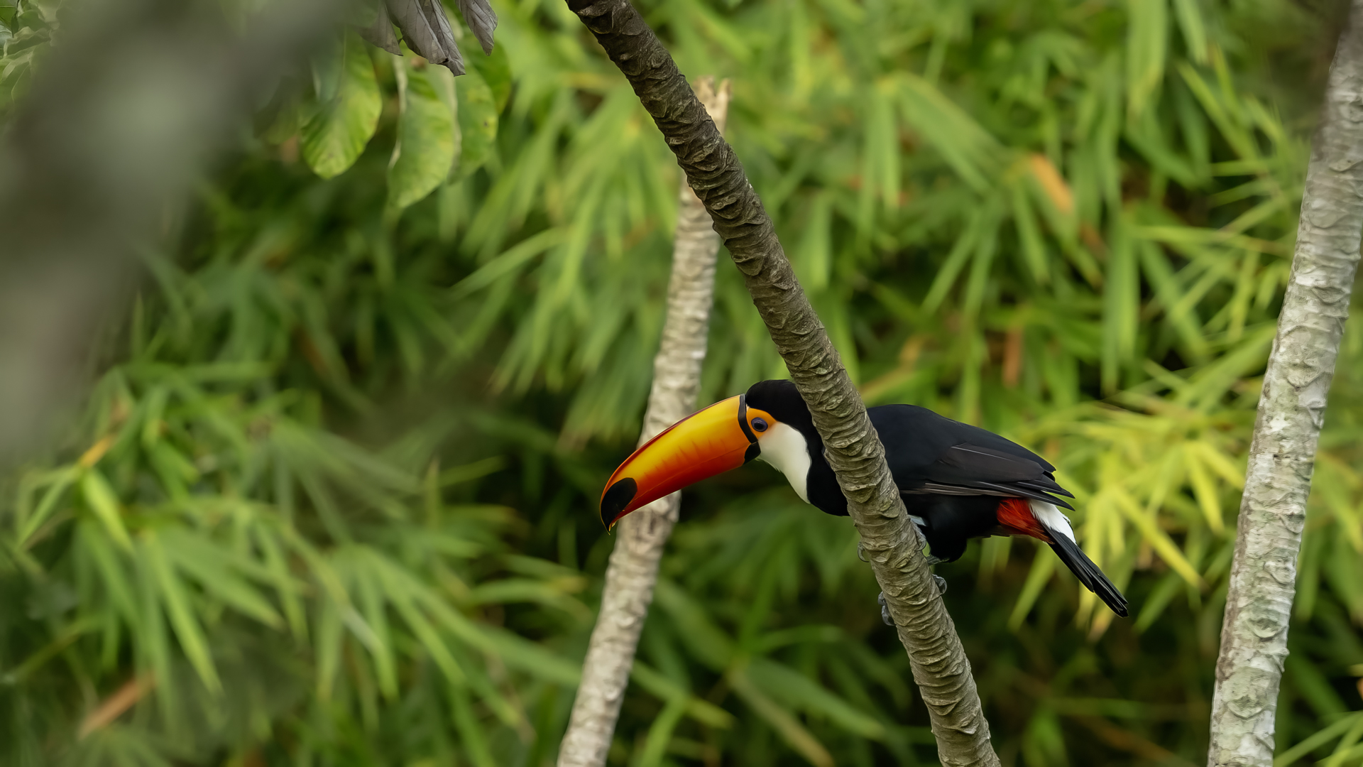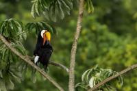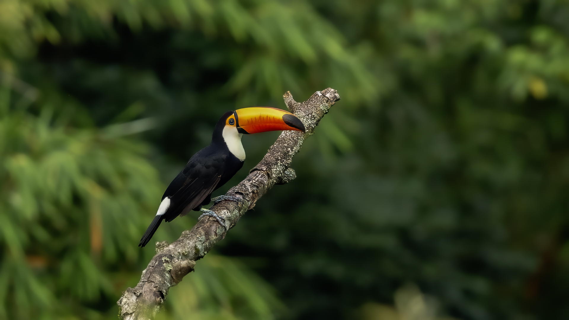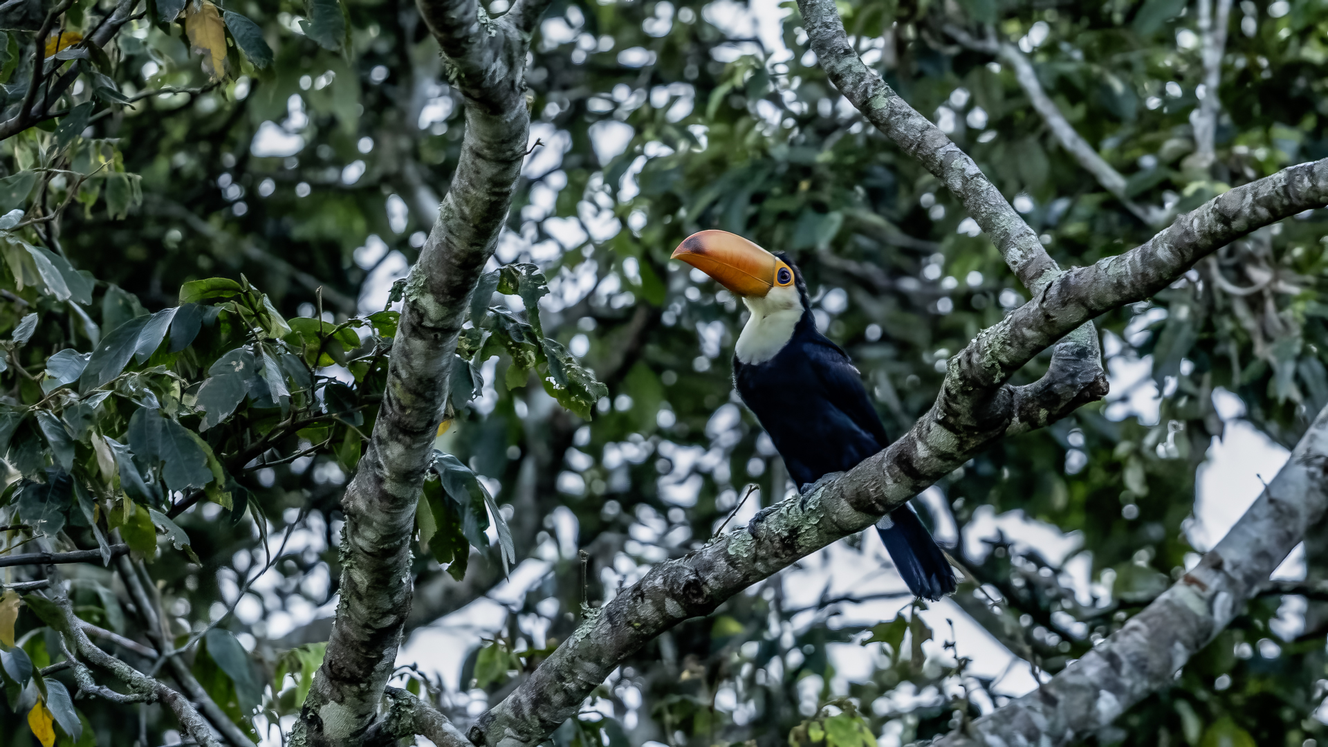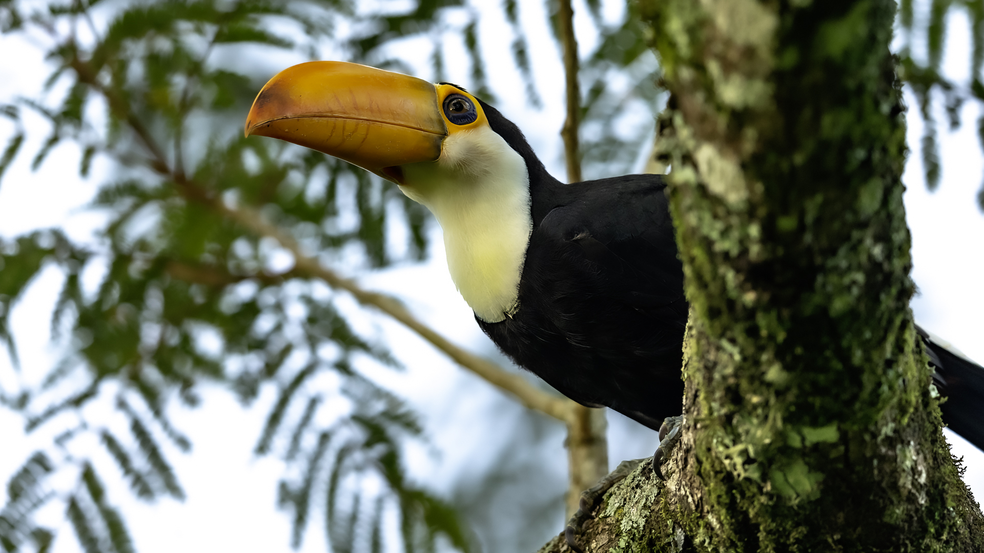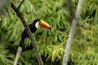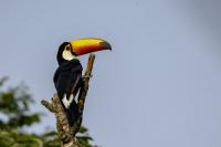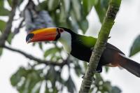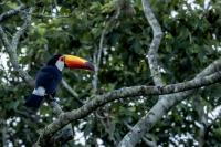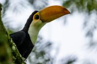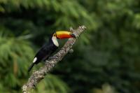Niesamowity piękny ptak, niesamowite spojrzenie i wyróżniający go z grona innych ptaków potężny dziób. Tukany fotografowałem o wschodzie słońca niedaleko wodospadu Iguazú. Huk spadającej wody był wszechobecny. Tukany pojawiły się dosłownie na kilkadziesiąt minut. Było ich około 10-ciu. Powoli się do nas przybliżały, by po chwili odlecieć na żerowiska położone w lesie deszczowym. Musiały spać w lasach niedaleko wodospadu, a my stanęliśmy im w przelocie, a właściwie przemieszczaniu się na drodze na śniadanie. Tukany powoli penetrowały korony drzew w poszukiwaniu pożywienia. Przeskakiwały z gałęzi na gałąź lub przelatywały niewielkie odległości pomiędzy drzewami. Dzięki tylko takiemu spokojnemu zachowaniu, mogło powstać tyle prezentowanych zdjęć. Będąc popołudniu w lesie deszczowym widziałem tukany wielkie oraz drugi gatunek tukana, jaki udało mi się sfotografować – arasari brązowouchego. Ten drugi gatunek, prawie zawsze jednak na tle nieba i ze znacznie większej odległości. No cóż, te kilkadziesiąt minut obcowania z tukanami wielkimi zaowocowało powstaniem prezentowanej galerii, a wrażenie i emocje tak duże, że tekst związany z tym ptakiem, staje się tekstem wprowadzającym do argentyńskich galerii na mojej stronie. Tukan wielki, jest największym spośród żyjących tukanów w Ameryce Południowej. Waga jego ciała to niespełna kilogram (około 800-900 gramów). Samice znacznie mniejsze, ważą około 0,5 kilograma. Wyróżniający go potężny dziób mierzy około 20 centymetrów. Tukany należą do rodziny dzięciołowatych i żywią się głównie owocami.
