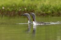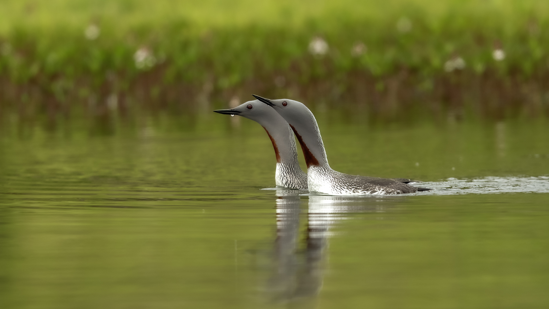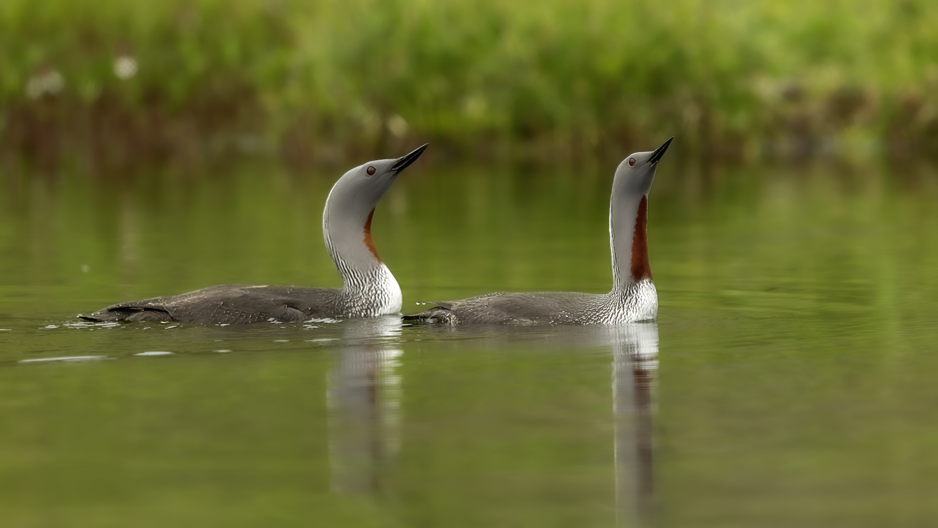 Przejechaliśmy niewielki most, z którego widać było siedzące po lewej stronie kamieniuszki, a po prawej nury rdzawoszyje. A że kamieniuszki dla mnie to nowy gatunek zaczynam fotografowanie od nich, powoli się zbliżając. Po krótkiej sesji z kamieniuszkami przechodzę drogę i próbuję tego samego z nurami. Mocno zgarbiony, bardzo nieśmiało i powoli zbliżam się do nurów. Są nieco zaniepokojone, ale nie uciekają. Miejsce malownicze, bo zakręt średniej wielkości rzeczki, odbicia na wodzie raz nadają wodzie niebieską barwę, raz zieloną. Kilkadziesiąt minut zabrało mi podejście do nurów. Usiadłem naprzeciwko i fotografowałem je jak przepływały kilkadziesiąt metrów to w lewo, to w prawo. Podczas ich nurkowania przechodziłem szybkim krokiem za nimi, tak aby podczas ich wynurzenia siedzieć znów nieruchomo blisko nich. Były zdziwione, ale nie uciekały, mało tego, kilka razy podpłynęły tak blisko, że nie mieściły się w kadrze. Niesamowite wrażenia z takiego obcowania z takimi ptakami. Wykonałem wiele zdjęć i pomyślałem, że czas nagrać ich głos. Tu duże zaskoczenie, bo zapomniałem zabrać mikrofon z samochodu. Bardzo powoli, aby ich nie denerwować i nie spłoszyć oddalałem się w kierunku samochodu. Zmontowałem zestaw do nagrywania i powoli zbliżam się do nurów ponownie. Niesamowite, obydwa bacznie mnie obserwowały i nie uciekały, pływały w pobliżu. Zaczynam nagrywać. Niestety nie są tak dynamiczne pod kątem wydawania dźwięków, jak lodowce. Siedzę na brzegu rzeki, na wprost dwa nury rdzawoszyje w odległości kilkunastu metrów, i obserwujemy się wzajemnie. Myślałem przez chwilę, że to nie może się dziać naprawdę. W Polsce, bez czatowni, maskowania nie da się wykonać taaaaaaakich zdjęć i być tak blisko fotografowanego dzikiego ptaka. Ale to przecież mało zaludniona Islandia, gdzie jest większa tolerancja dla człowieka ze strony dzikiej przyrody. Siedzimy na wprost siebie, z tą różnicą, że ja chcę nagrać ich odgłosy. Mija kilkadziesiąt minut i wreszcie kilka „westchnień” nura udaje się nagrać. Dobrze, bo w tak skulonej pozycji, w bezruchu trudno by było wytrzymać dłużej. Ale to nie wszystko z niesamowitych spotkań na Islandii i w dodatku z tym niesamowitym gatunkiem ptaka. Drugie spotkanie, chyba było jeszcze bardziej ekscytujące. Mały staw, 10 metrów od niego droga asfaltowa, zatrzymujemy samochód i widzimy parę nurów. Jeden siedzi na gnieździe, drugi pływa w pobliżu. Bardzo powoli podchodzę nad brzeg, kładę się na wprost gniazda i fotografuję nura na tafli wody czyszczącego swoje upierzenie. Mija jakieś pół godziny i byłem świadkiem zmiany w opiece nad gniazdem ptaków. Ptak po zejściu z wysiadywania zanurkował i wypłynął w pobliżu partnera. Wykonali przepiękne synchroniczne pływanie po torze w kształcie litery S po czym oddalili się od siebie o około metr i także synchronicznie rozpostarły skrzydła. Niestety ptaki były tak blisko mnie, że tylko jednego dało się uwiecznić w kadrze i połowę drugiego. Było to coś niesamowitego, przepięknego, powstawały dziesiątki zdjęć i pomyślałem, że trudno czegokolwiek więcej oczekiwać. A tu proszę, ptak początkowo czyścił swoje upierzenie, po kilkunastu minutach wzbił się w powietrze na moich oczach. Startował z odległości kilkunastu metrów ode mnie, a więc nie było problemów z wykonaniem całej sekwencji ze startu ptaka. Z opisywanych spotkań powstało tak wiele zdjęć, że trudno było się zdecydować na ostateczną wersję galerii. Zobaczcie sami moje bliskie spotkania z nurami rdzawoszyimi na Islandii….