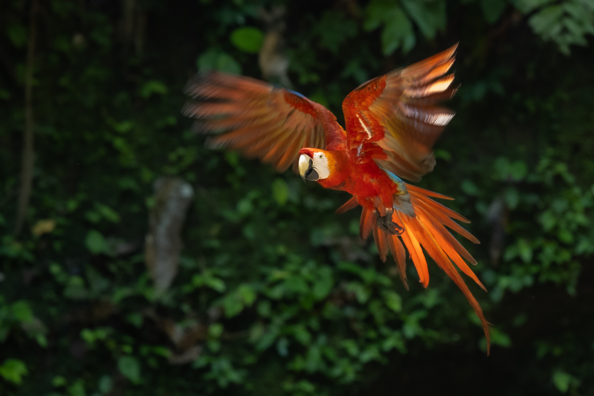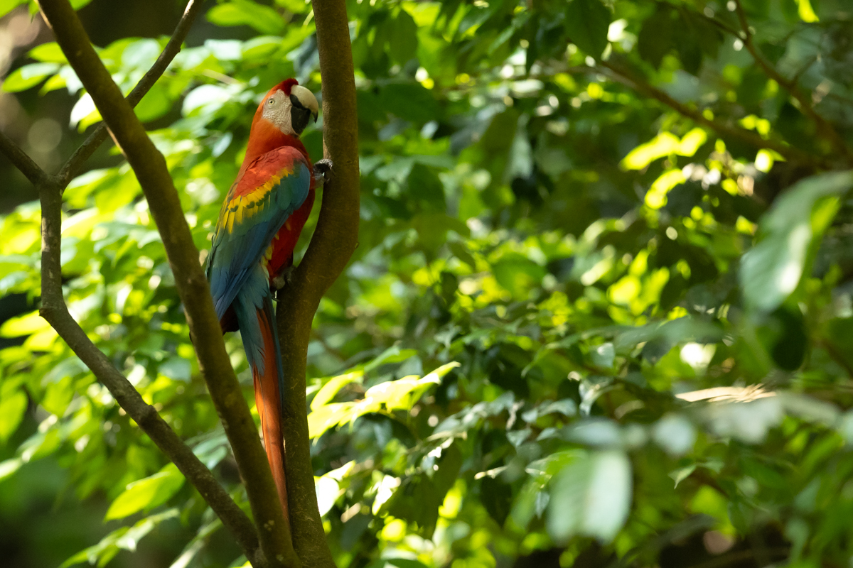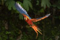 Z fotografowaniem papug na Kostaryce nie było łatwo. Widać było często przelatujące stada tych ptaków, którym towarzyszył skrzeczący ich odgłos. Przesiadywały zawsze wysoko w koronach drzew. Nie wiem dlaczego tylko ta grupa ptaków trzymała się z daleka od ludzi i od miejsc dokarmiania ptaków. No cóż tak to bywa w fotografii przyrodniczej. Na szczęście udało się wykonać kilka zdjęć ary żółtoskrzydłej, która jest największym przedstawicielem papugowatych na świecie. Waga ary żółtoskrzydłej dochodzi do 2 kg, a rozpiętość skrzydeł do jednego metra. Oczywiście bez lokalnego przewodnika nie powstały by prezentowane zdjęcia. Co potwierdza trudność w spotkaniu z tymi ptakami. Pierwsze spotkanie miało miejsce na wybrzeżu Oceanu Spokojnego. Nad morzem fotografowaliśmy kormorany i pelikany. Na drzewie nad samym brzegiem, przy plaży siedziała samotnie pierwsza ara, jaką spotkaliśmy na Kostaryce. Odległość była niewielka i z 600-tką, trzeba było się nieco odsunąć, aby móc wykonać zdjęcia. Powstaje kilka zdjęć, po których ptak odleciał. Drugie spotkanie, było znacznie ciekawsze, choć powstały specyficzne zdjęcia. Trochę przed zachodem słońca pojechaliśmy na miejsce do którego na noc przylatują ary. Na skraju deszczowego lasu były sporej wielkości pola ryżowe. Pośród nich stały samotnie dwa ogromne drzewa. Jedno, niższe, zielone. Drugie wyższe, wyschnięte. Właśnie na to drzewo miały przylecieć ptaki. Z drogi trzeba było przejść kilkaset metrów przez pola, przeprawić się przez rwący, kilkunastometrowej szerokości potok by zobaczyć ten ciekawy zlot. I rzeczywiście, ptaki przybywały parami, robiąc przy tym straszny hałas. Powstaje nagranie ich głosu, który do pięknych nie należy. Nie obyło się bez przepychanek pomiędzy ptakami w ustaleniu, który ptak zajmie najwygodniejsze na nocleg miejsce. Niestety odległość była nadal spora, no i w tle niebo. Wielkiego powodu do zadowolenie nie ma, a szkoda, bo ptaków przyleciało ostatecznie kilkadziesiąt i chciałoby się mieć lepsze zdjęcia tej papugi.