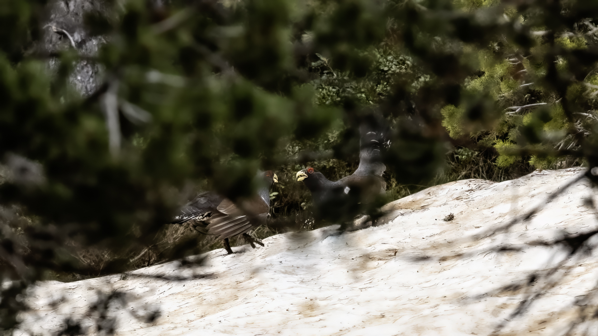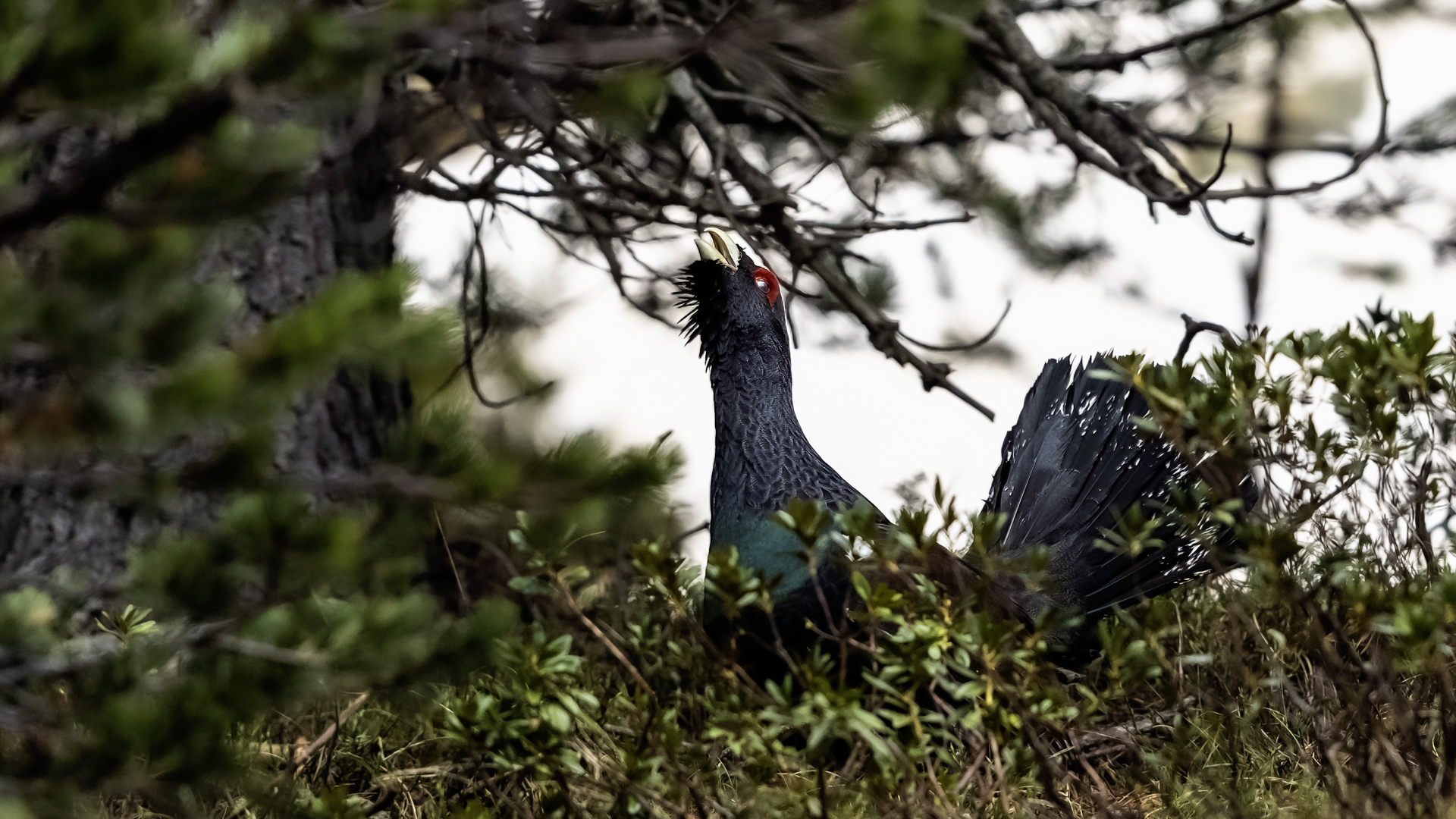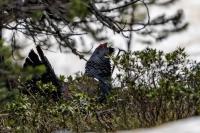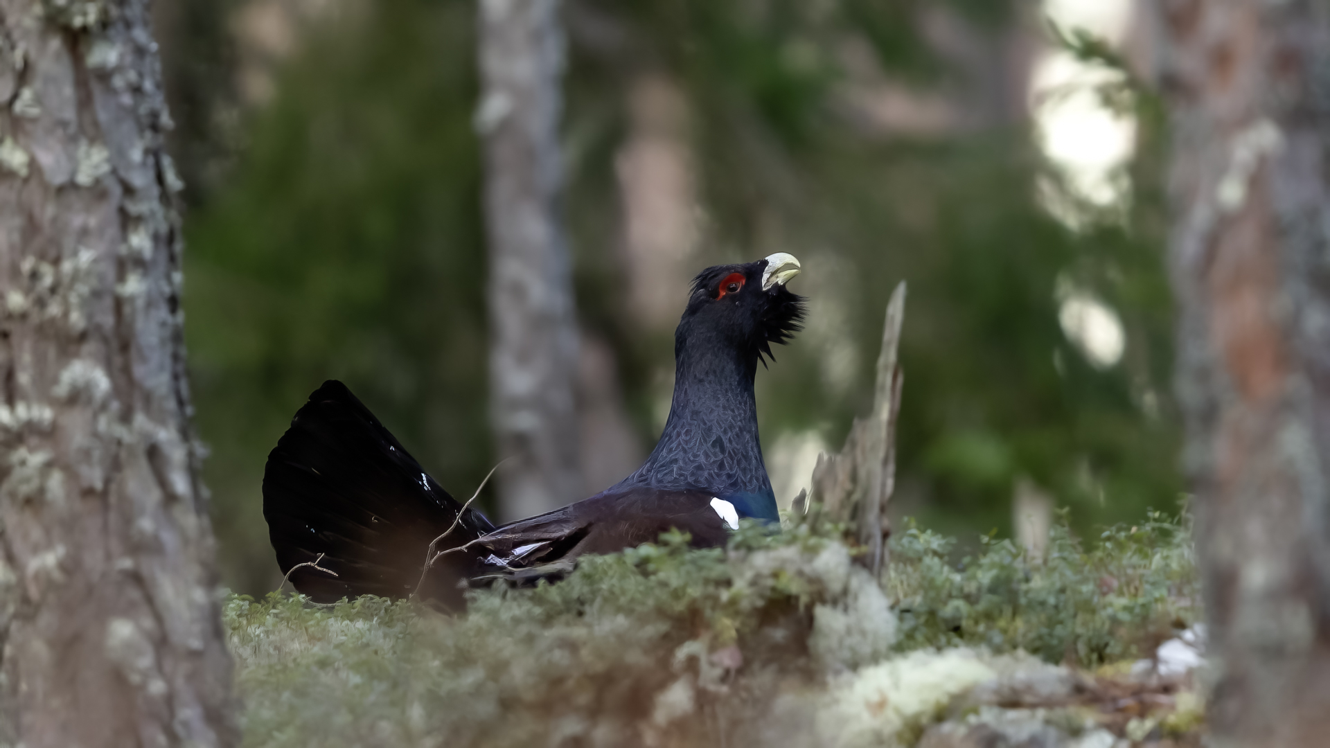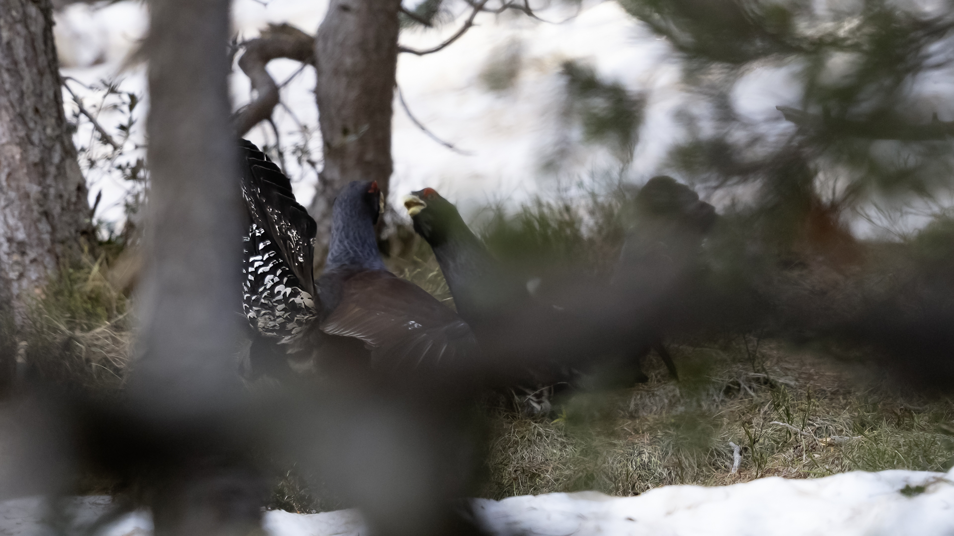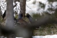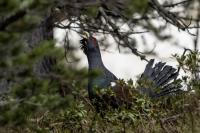 Miejmy nadzieję, że tak właśnie się stało i przeczytaliście tekst o cietrzewiach i rozumiecie dlaczego wróciliśmy w wyśmienitych nastrojach do tych samych namiotów, które wydały się nam teraz jak zupełnie komfortowe, bezpieczne miejsca noclegowe. Scenariusz zdarzeń się powtarza. Zasypiamy po 20-tej wraz z lasem w którym zapanowała cisza. Nie na długo, bo po 5 rano słychać budzący się do życia las. Są głuszce! Tym razem jeden samiec przeszedł dość blisko, a drugi w oddali na dłuższą chwilę zamarł w bezruchu, tak że zastosowane długie czasy ekspozycji, mimo wysokiej czułości pozwoliły wykonać ostre zdjęcie. No cóż bardziej dokumentacyjne, ale tych kilka zdjęć będzie pamiątką dość specyficznych warsztatów fotograficznych, podczas których można powiedzieć, że mieszkaliśmy dosłownie tych kilka dni w lesie, z głuszcami, cietrzewiami. Tak, właśnie powstały prezentowane zdjęcia. Południowe, krótkie przerwy zaowocowały zdjęciami innych gatunków, ale o tym już w innych galeriach, związanych z wyjazdem do Szwecji.