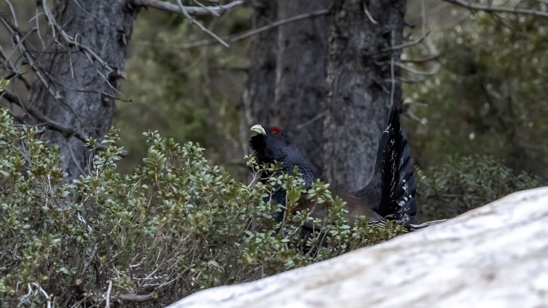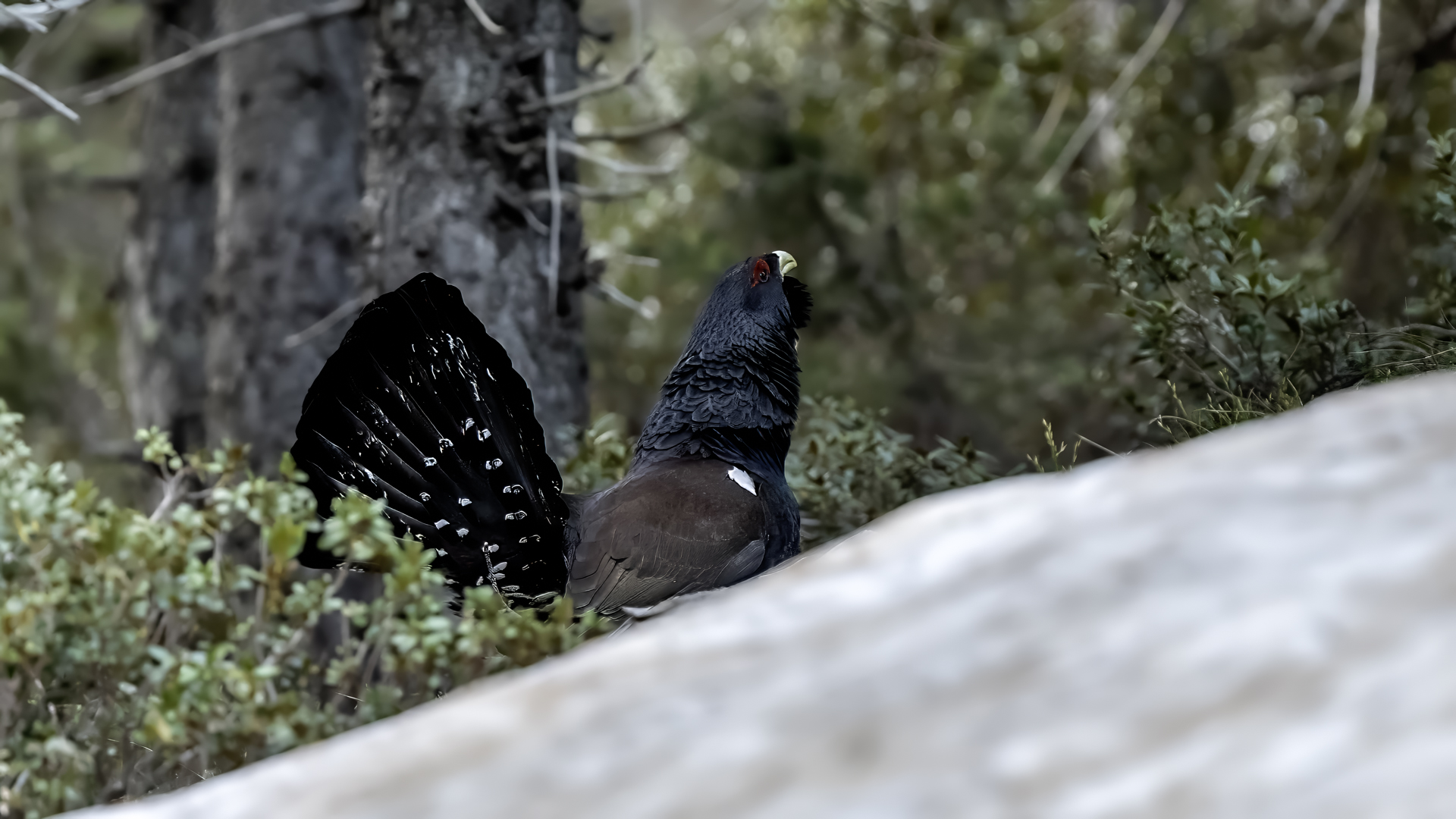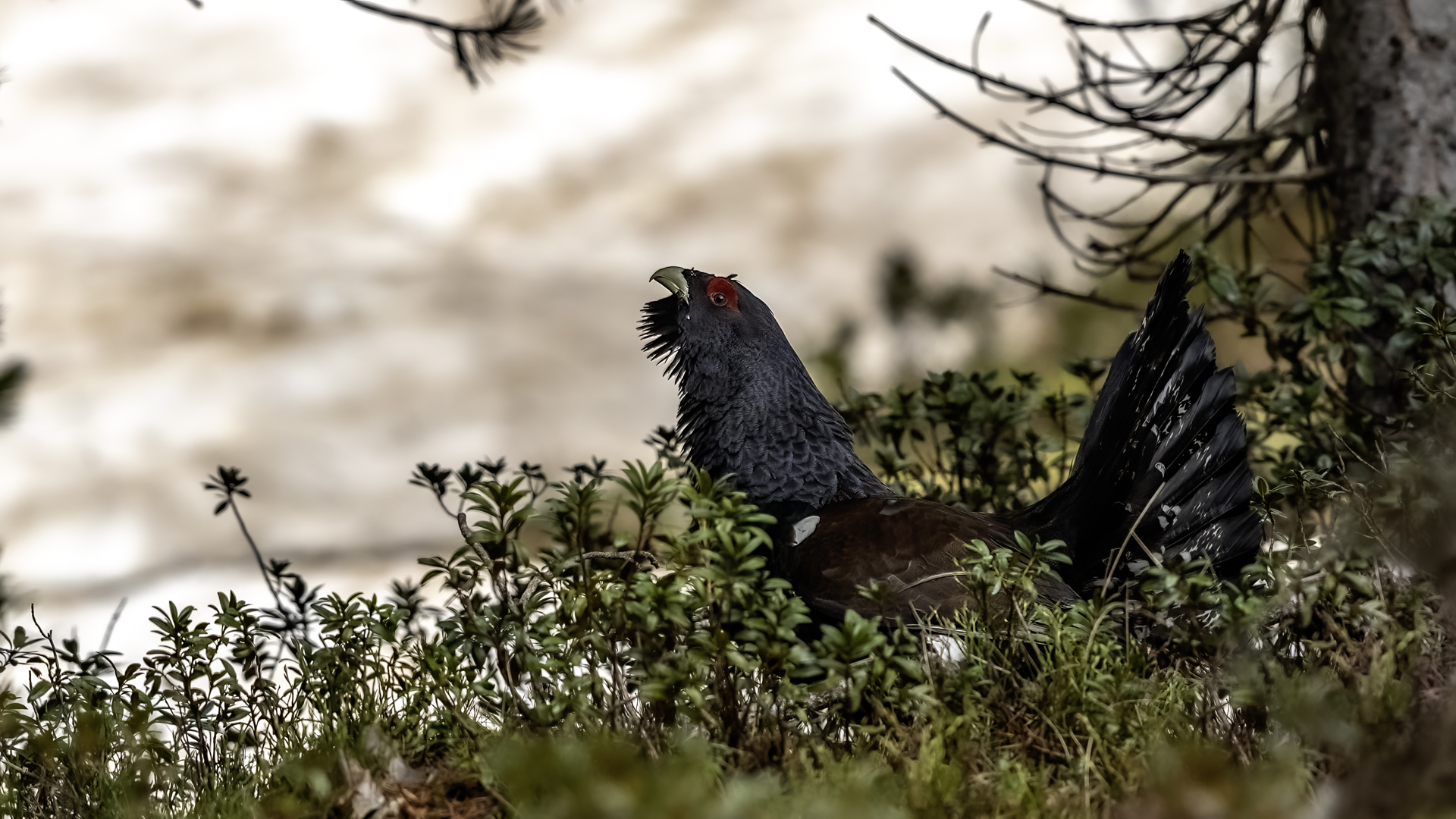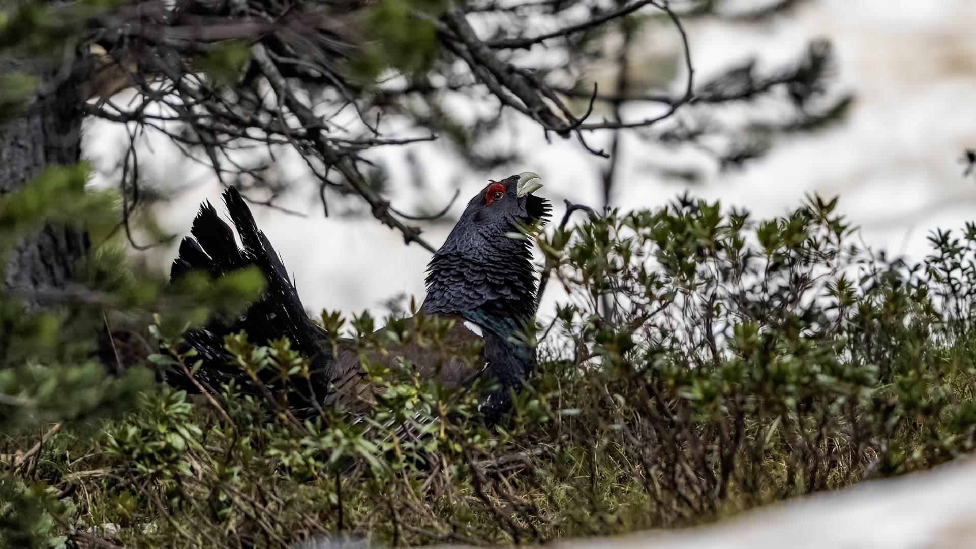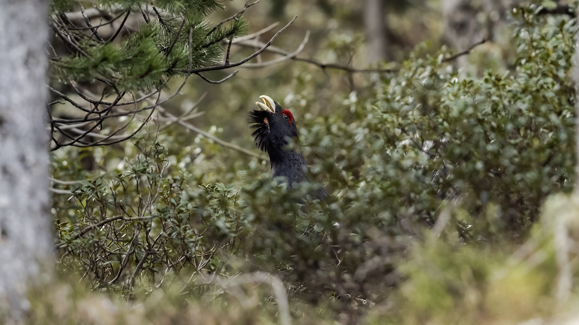 Miejmy nadzieję, że tak właśnie się stało i przeczytaliście tekst o cietrzewiach i rozumiecie dlaczego wróciliśmy w wyśmienitych nastrojach do tych samych namiotów, które wydały się nam teraz jak zupełnie komfortowe, bezpieczne miejsca noclegowe. Scenariusz zdarzeń się powtarza. Zasypiamy po 20-tej wraz z lasem w którym zapanowała cisza. Nie na długo, bo po 5 rano słychać budzący się do życia las. Są głuszce! Tym razem jeden samiec przeszedł dość blisko, a drugi w oddali na dłuższą chwilę zamarł w bezruchu, tak że zastosowane długie czasy ekspozycji, mimo wysokiej czułości pozwoliły wykonać ostre zdjęcie. No cóż bardziej dokumentacyjne, ale tych kilka zdjęć będzie pamiątką dość specyficznych warsztatów fotograficznych, podczas których można powiedzieć, że mieszkaliśmy dosłownie tych kilka dni w lesie, z głuszcami, cietrzewiami. Tak, właśnie powstały prezentowane zdjęcia. Południowe, krótkie przerwy zaowocowały zdjęciami innych gatunków, ale o tym już w innych galeriach, związanych z wyjazdem do Szwecji.
